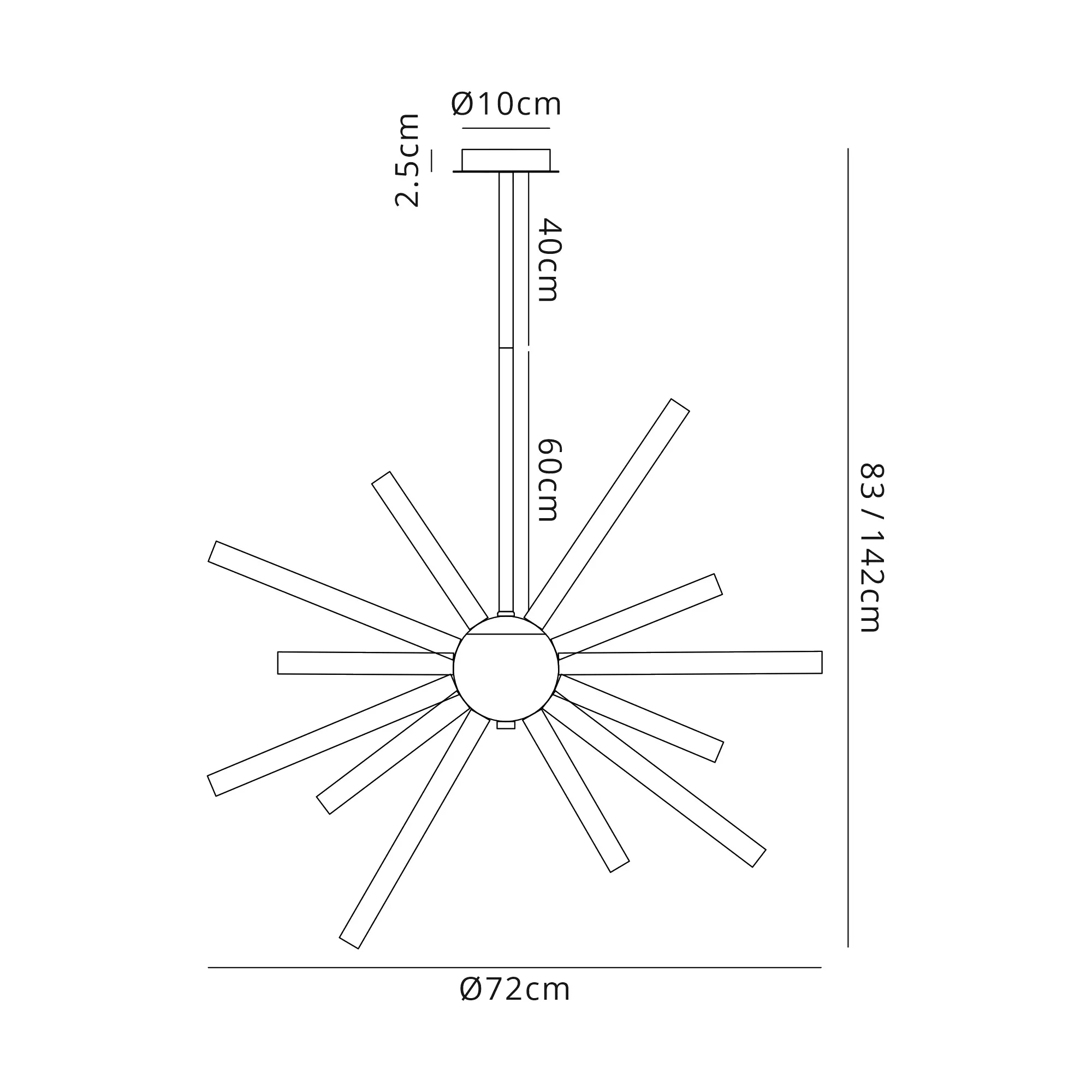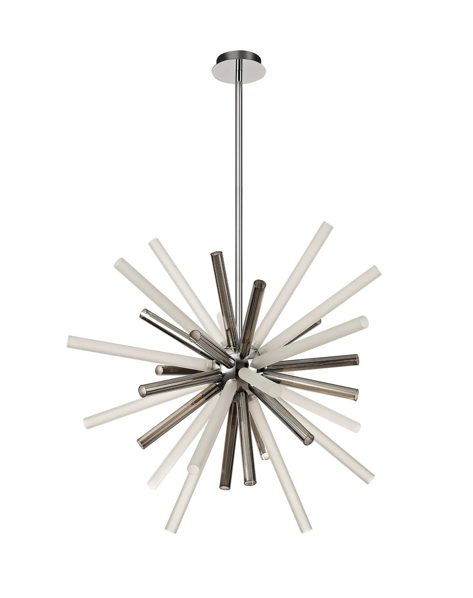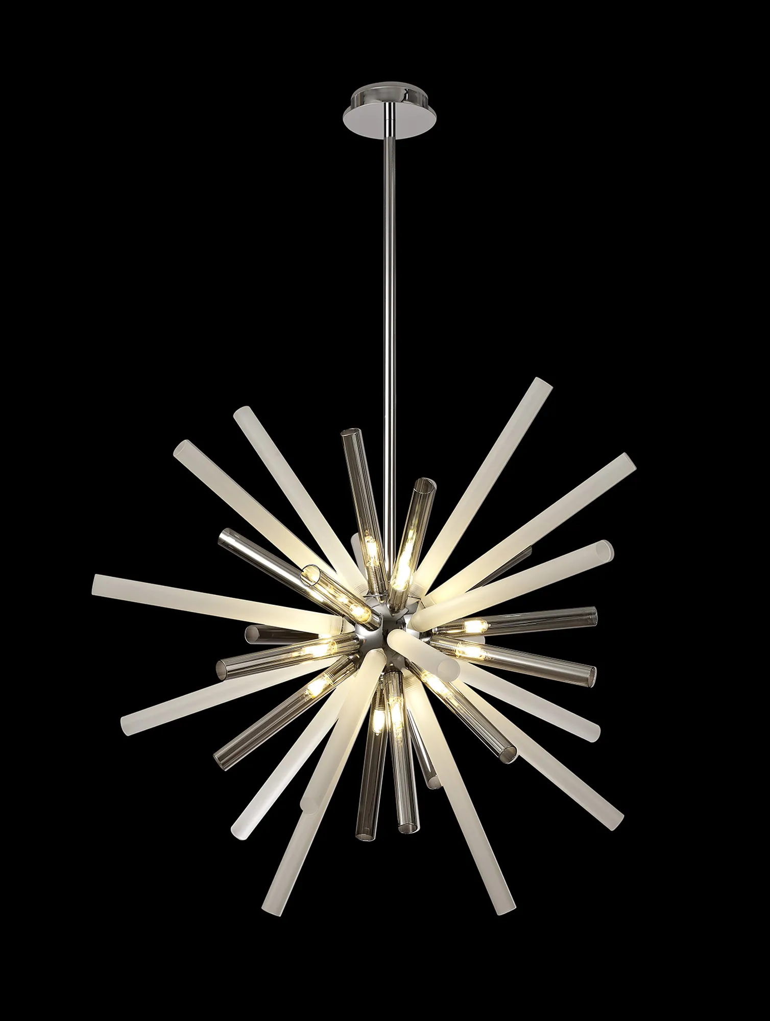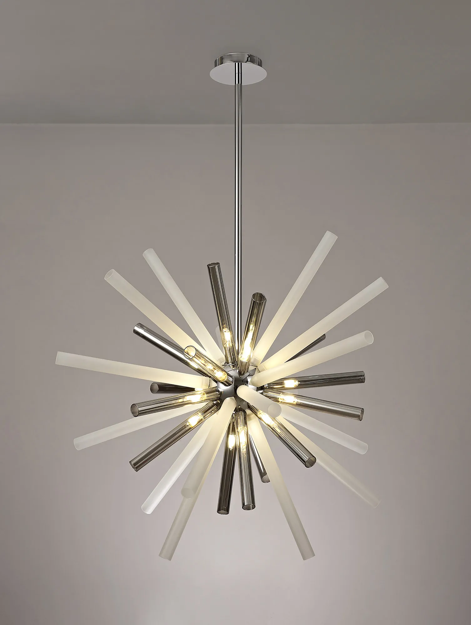 Parakai has an abundance of narrow glass tubes in various sizes which are cleverly arranged into a sputnik composition, devising a larger three dimensional effect around the polished chrome central orb frame. This statement design is applied to both a sixteen light pendant and an eight light semi-flush ceiling fixture, with each G9 lamp holder situated within the glass tubes. In order to supply an option for multiple colour schemes each polished chrome item is available with either amber/champagne, chrome/clear or smoked frosted glass pieces.