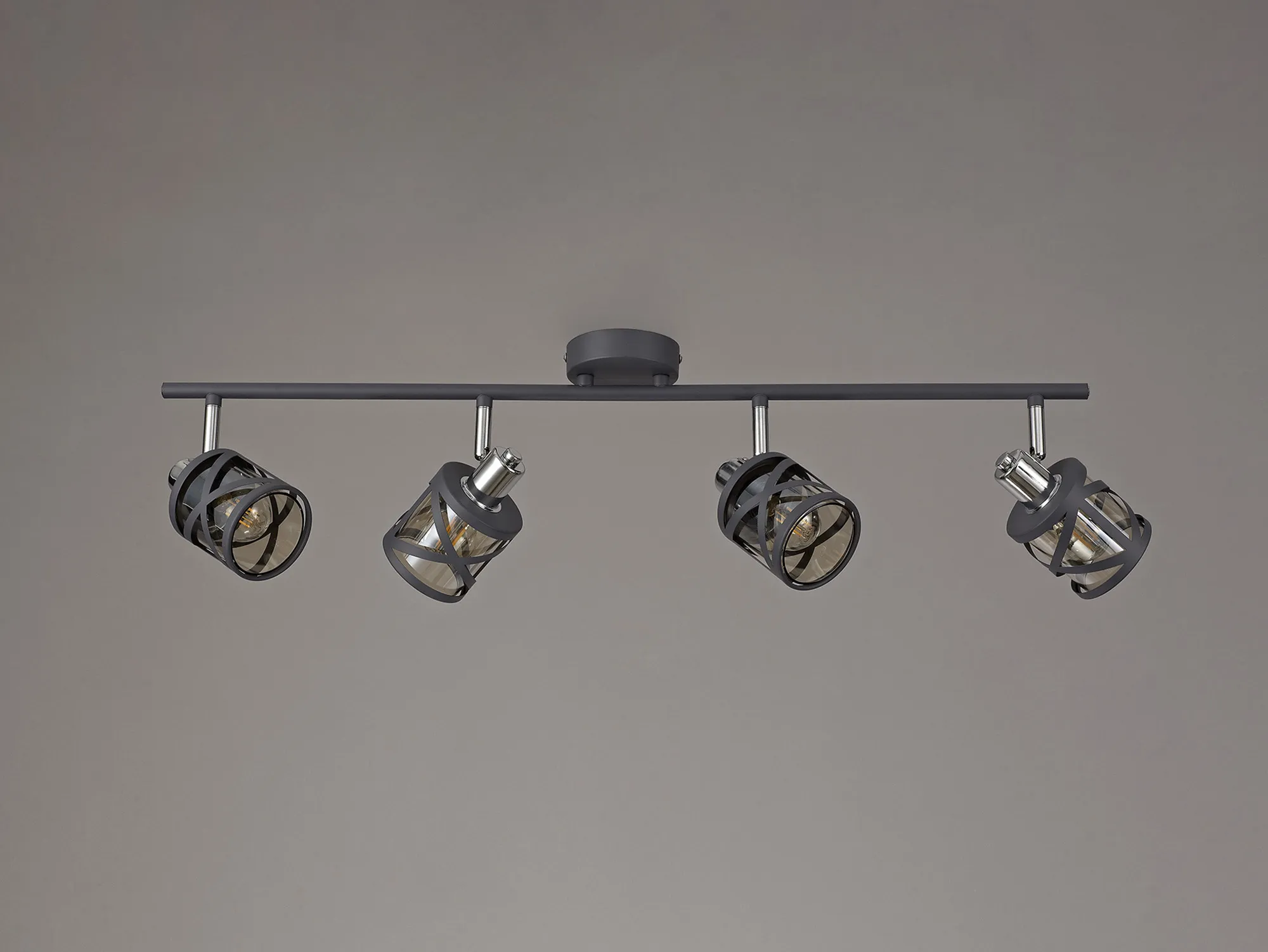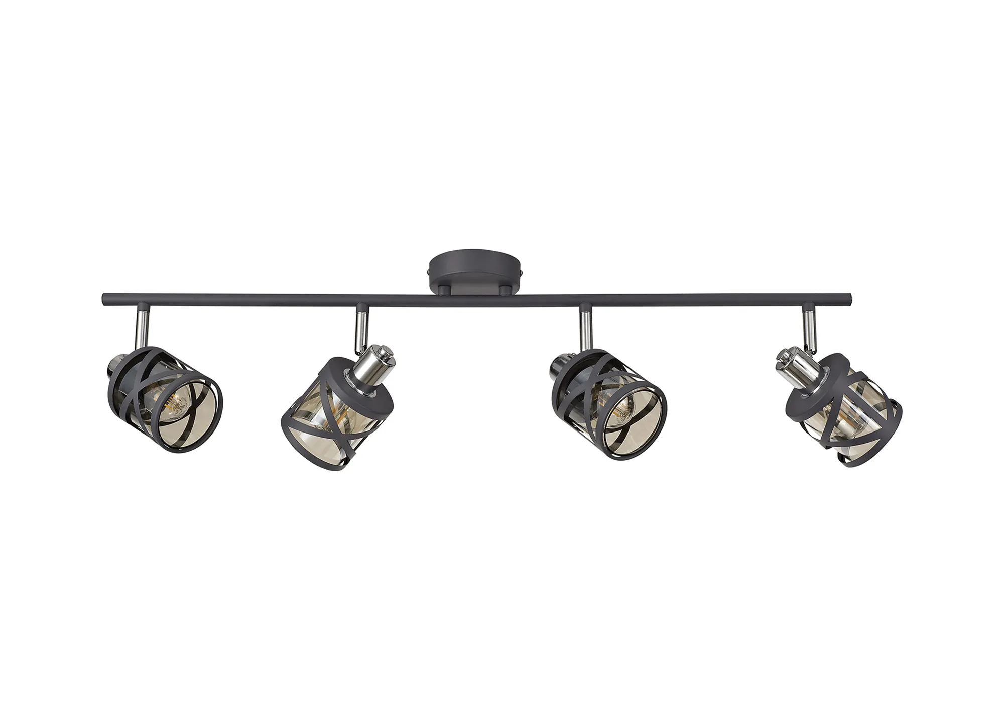 An exquisitely intricate frame crosses over the tinted cylindrical glass which houses E14 lamp holders. All seven designs in the Minaret range are available in either a matt grey or polished chrome finish with cognac glass or oiled bronze and polished chrome frame with amber glass. The spotlights, linear pendant, 1 and 3 light pendants all follow fairly standard compositions whereas the round pendant 4 light has an innovative feature. The lamp holders are situated at either end of two bars which can be pivoted and turned showing art imitating function replicating a baton concept for increased adjustability.