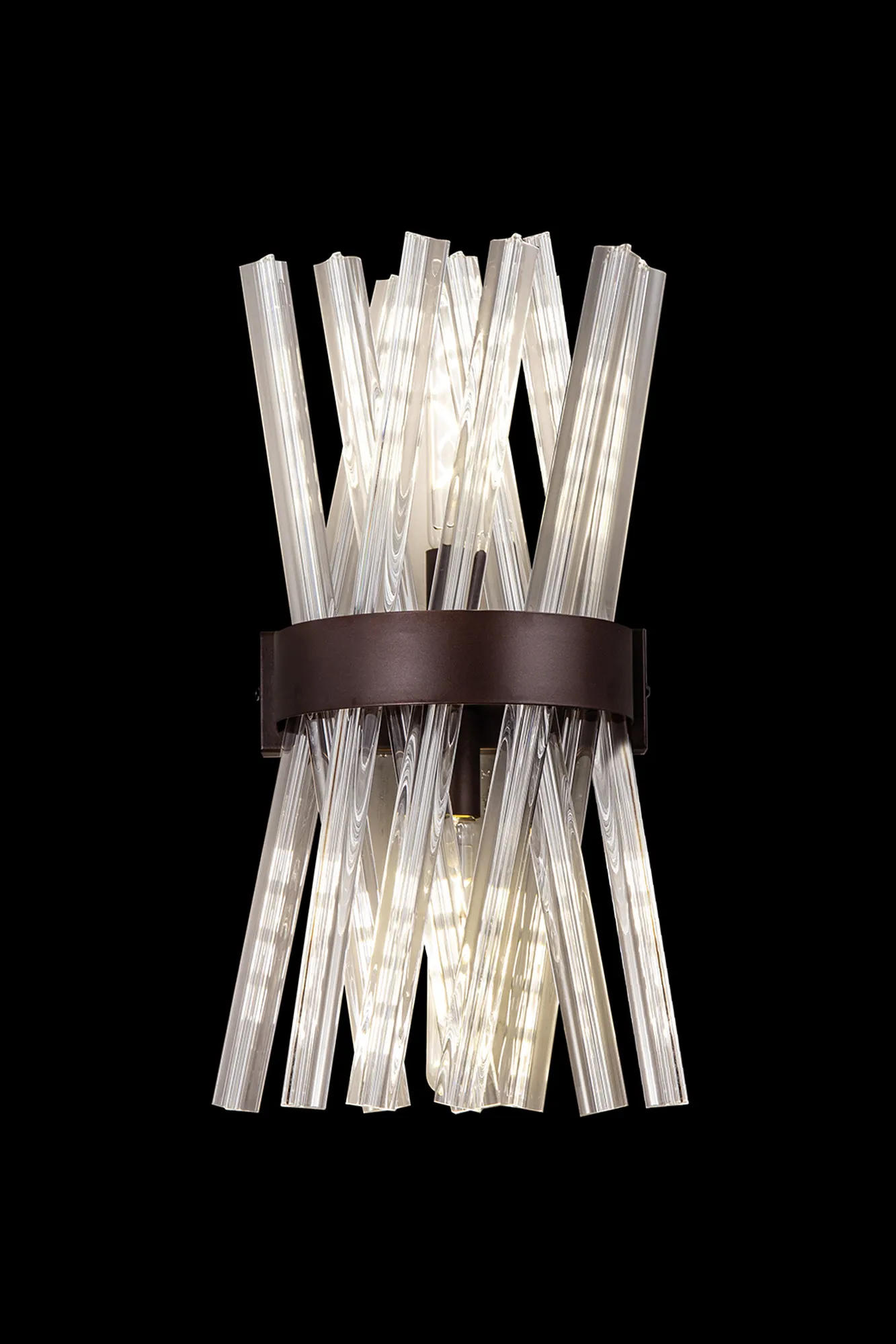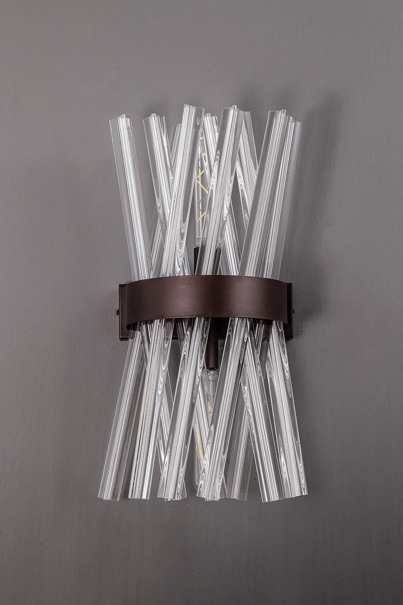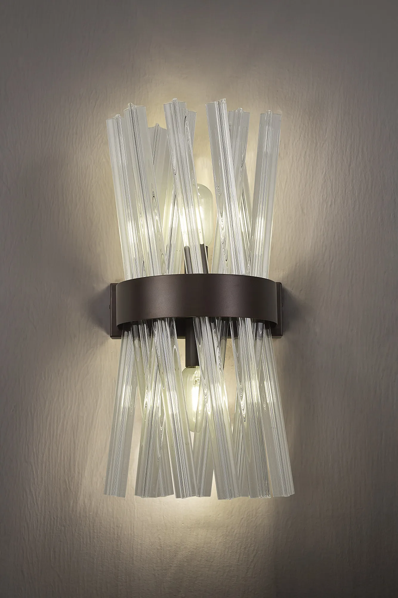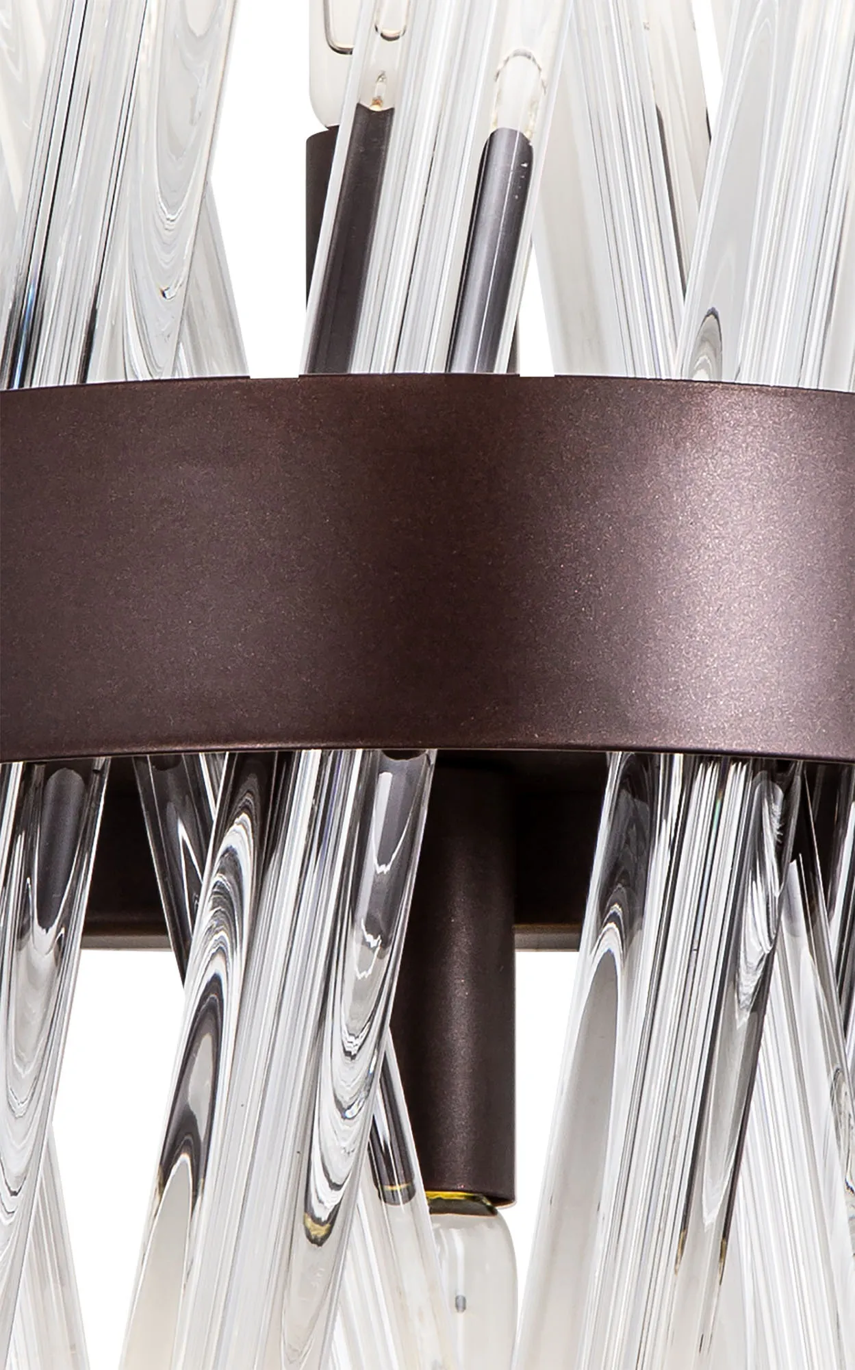 The Tora collection presents an intriguing glass shape moulded into a three dimensional triquetra. The grooves along each sized glass create an appealing optical effect which is effortlessly enhanced with the use of tubular lamps. The wide variety of fixtures available in this range span from a 6 light semi flush to an impacting 32 light pendant. The complementing wall lamps available allow for further application built around the same lighting family. Each frame can be chosen with either a brown oxide, polished nickel or matt black frame with either clear, champagne gold or smoke glass.
