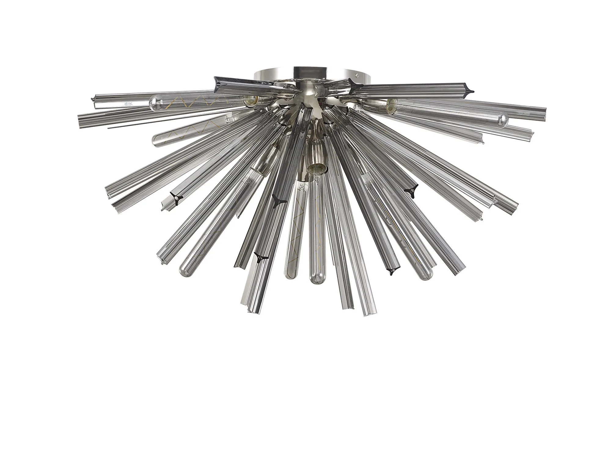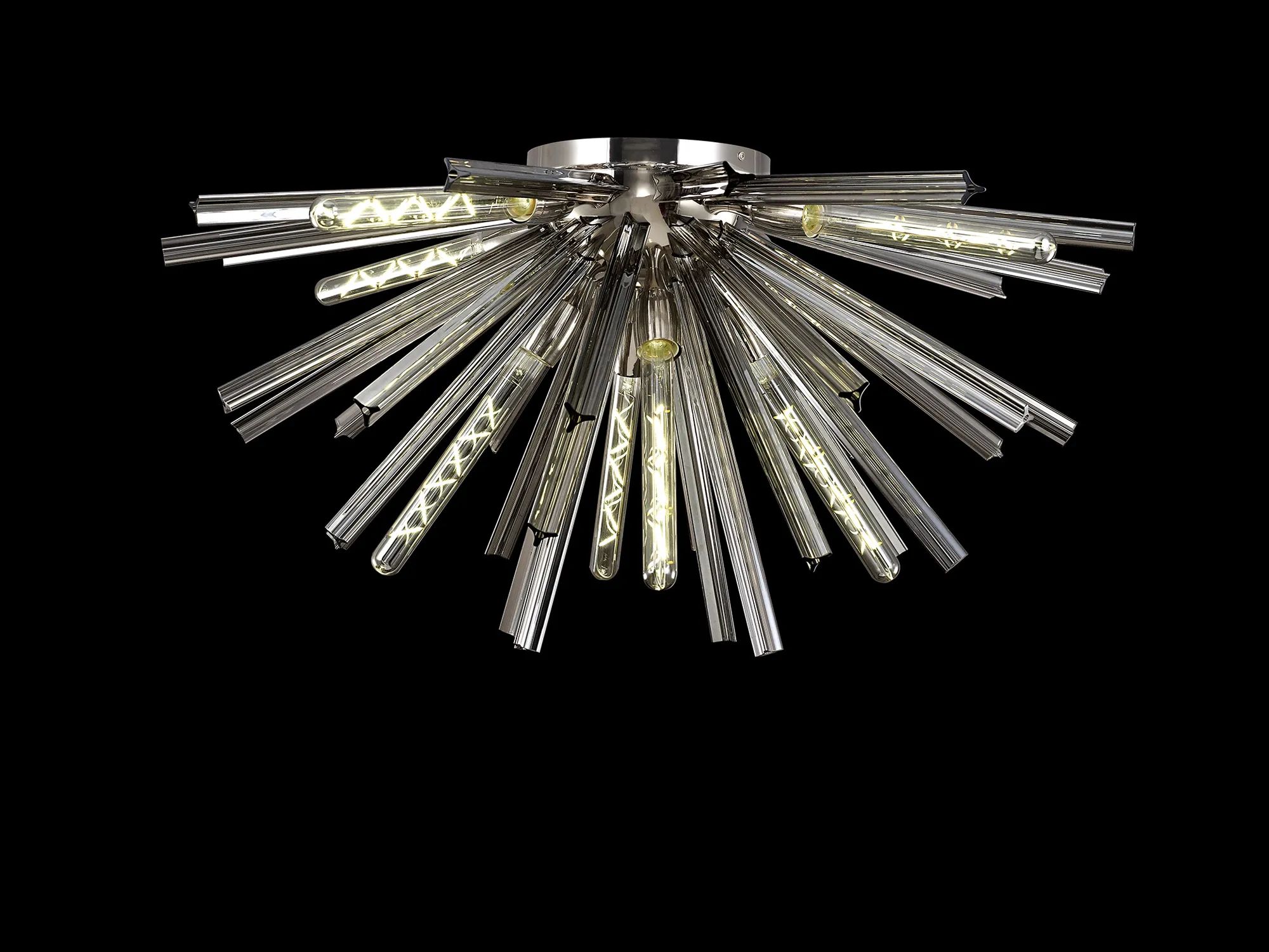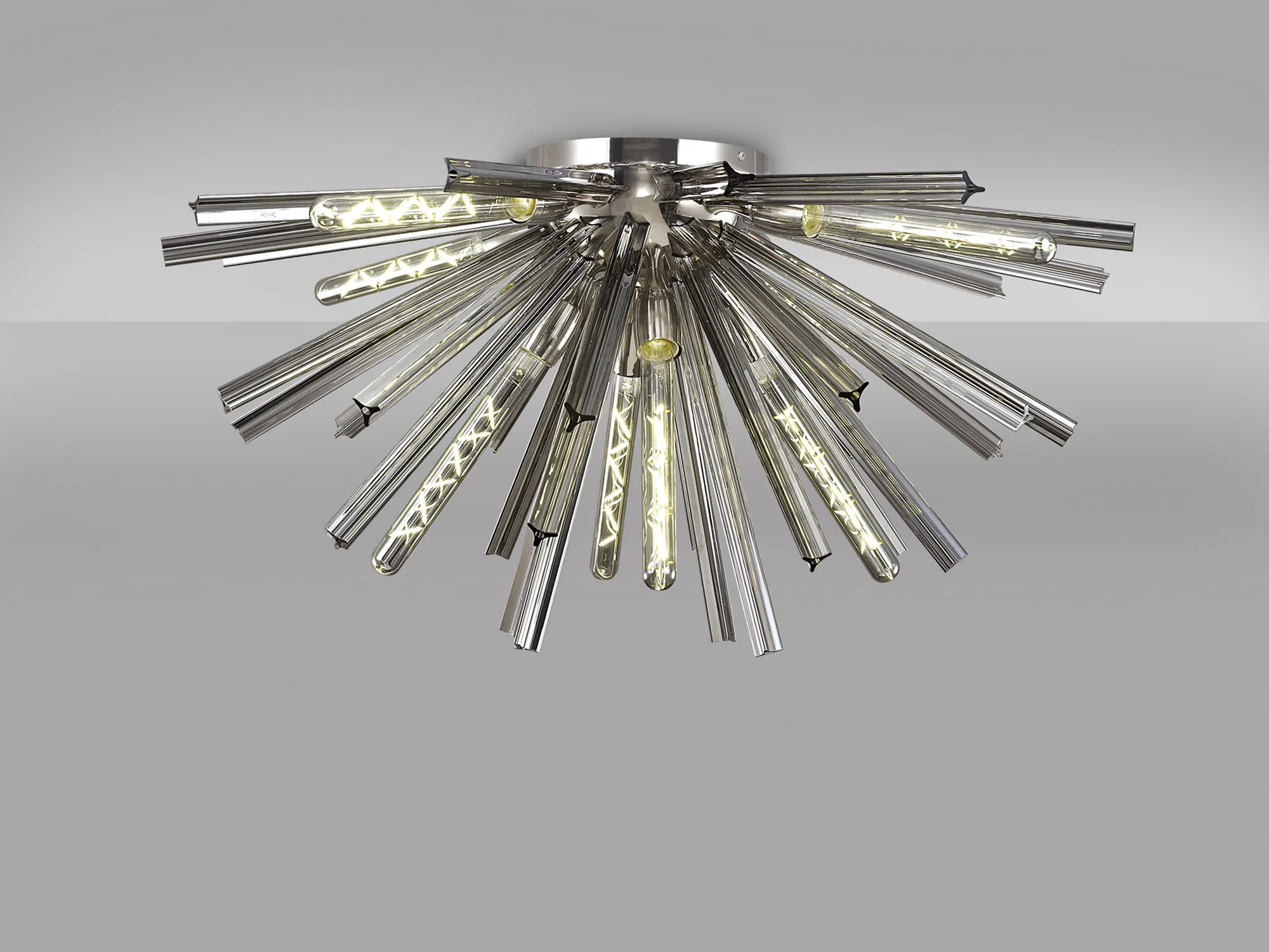 The Tora collection presents an intriguing glass shape moulded into a three dimensional triquetra. The grooves along each sized glass create an appealing optical effect which is effortlessly enhanced with the use of tubular lamps. The wide variety of fixtures available in this range span from a 6 light semi flush to an impacting 32 light pendant. The complementing wall lamps available allow for further application built around the same lighting family. Each frame can be chosen with either a brown oxide, polished nickel or matt black frame with either clear, champagne gold or smoke glass.