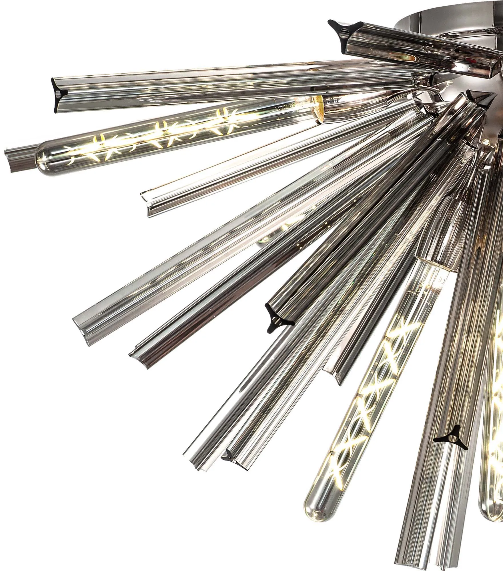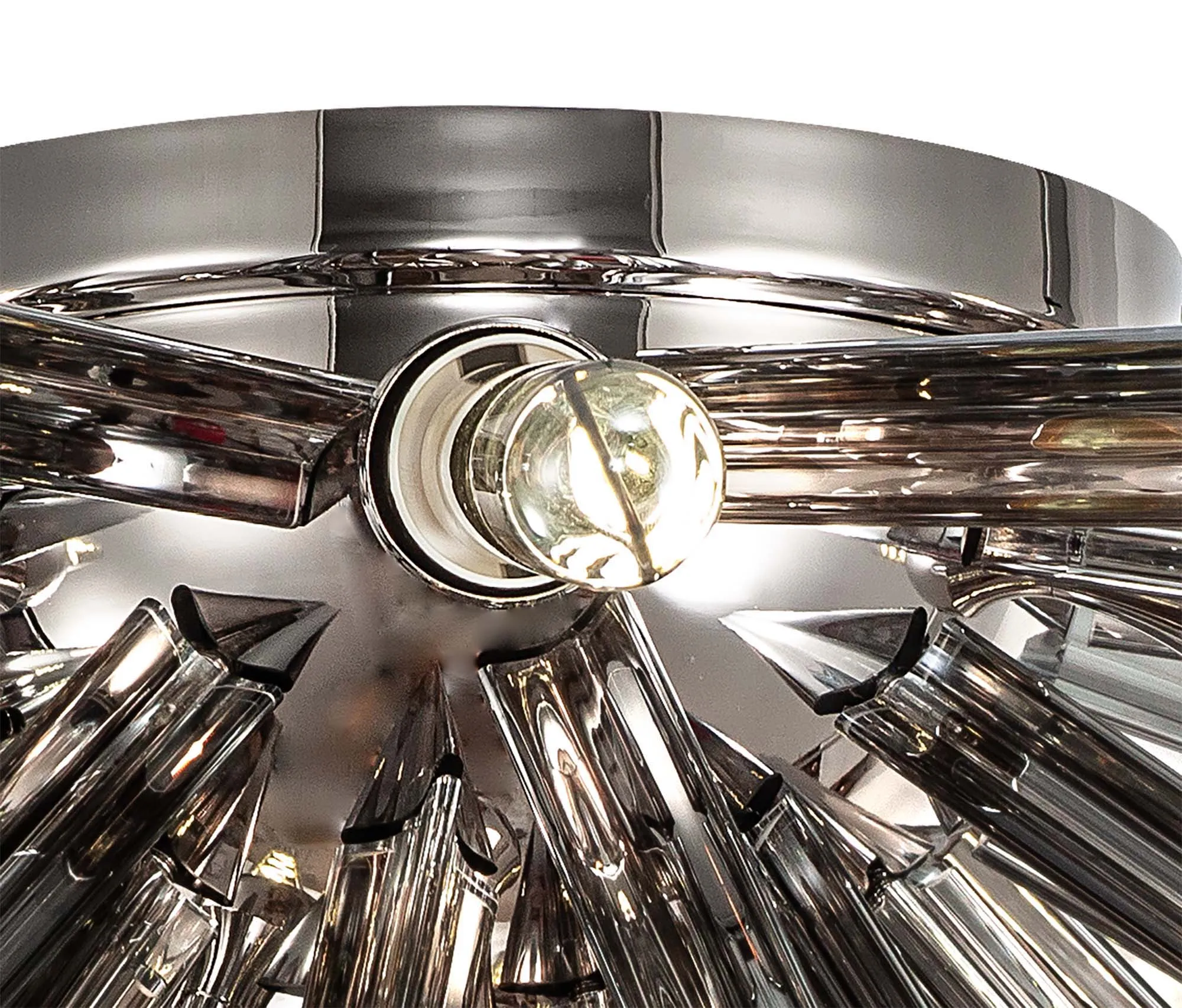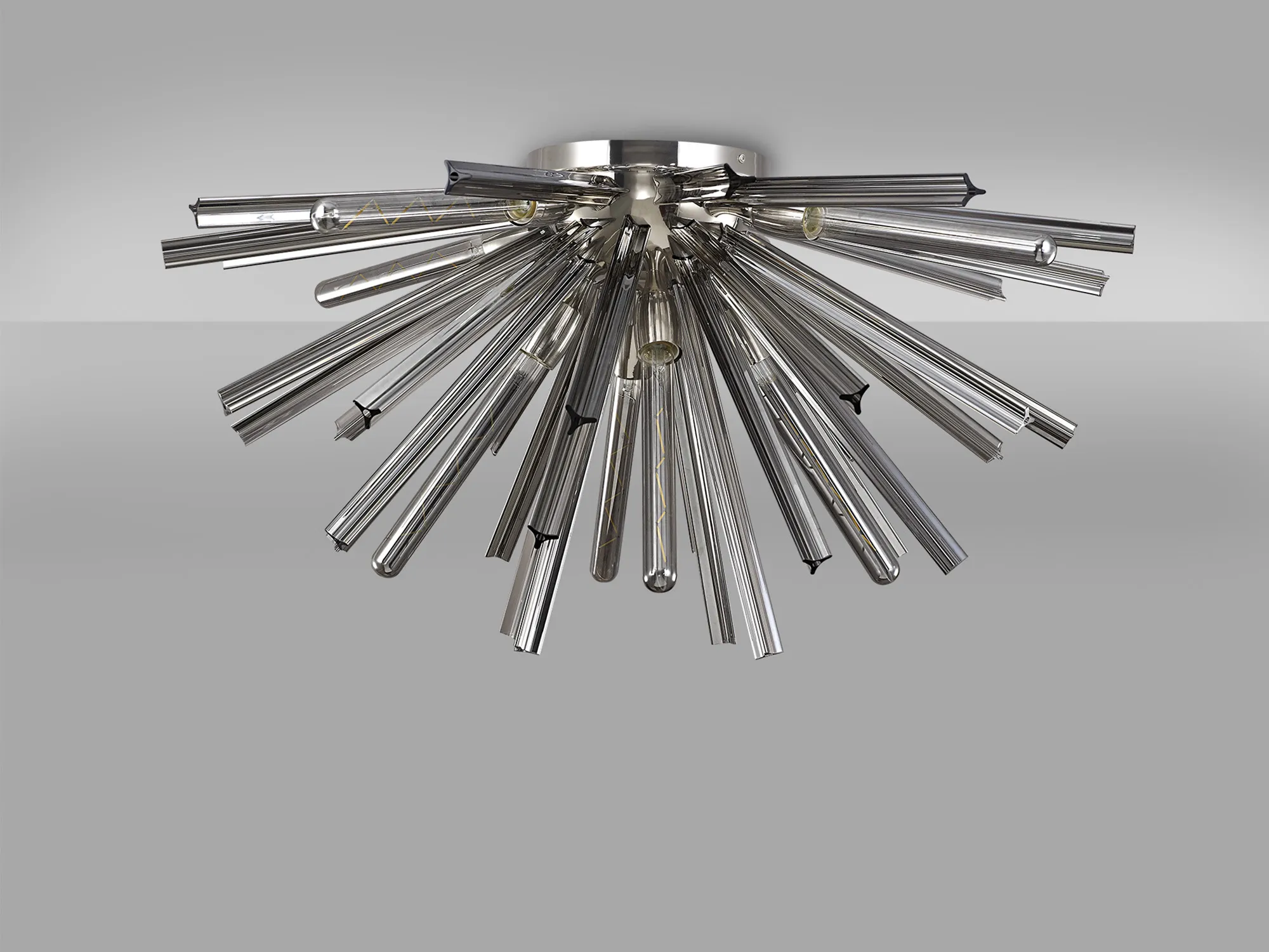 The Tora collection presents an intriguing glass shape moulded into a three dimensional triquetra. The grooves along each sized glass create an appealing optical effect which is effortlessly enhanced with the use of tubular lamps. The wide variety of fixtures available in this range span from a 6 light semi flush to an impacting 32 light pendant. The complementing wall lamps available allow for further application built around the same lighting family. Each frame can be chosen with either a brown oxide, polished nickel or matt black frame with either clear, champagne gold or smoke glass.
