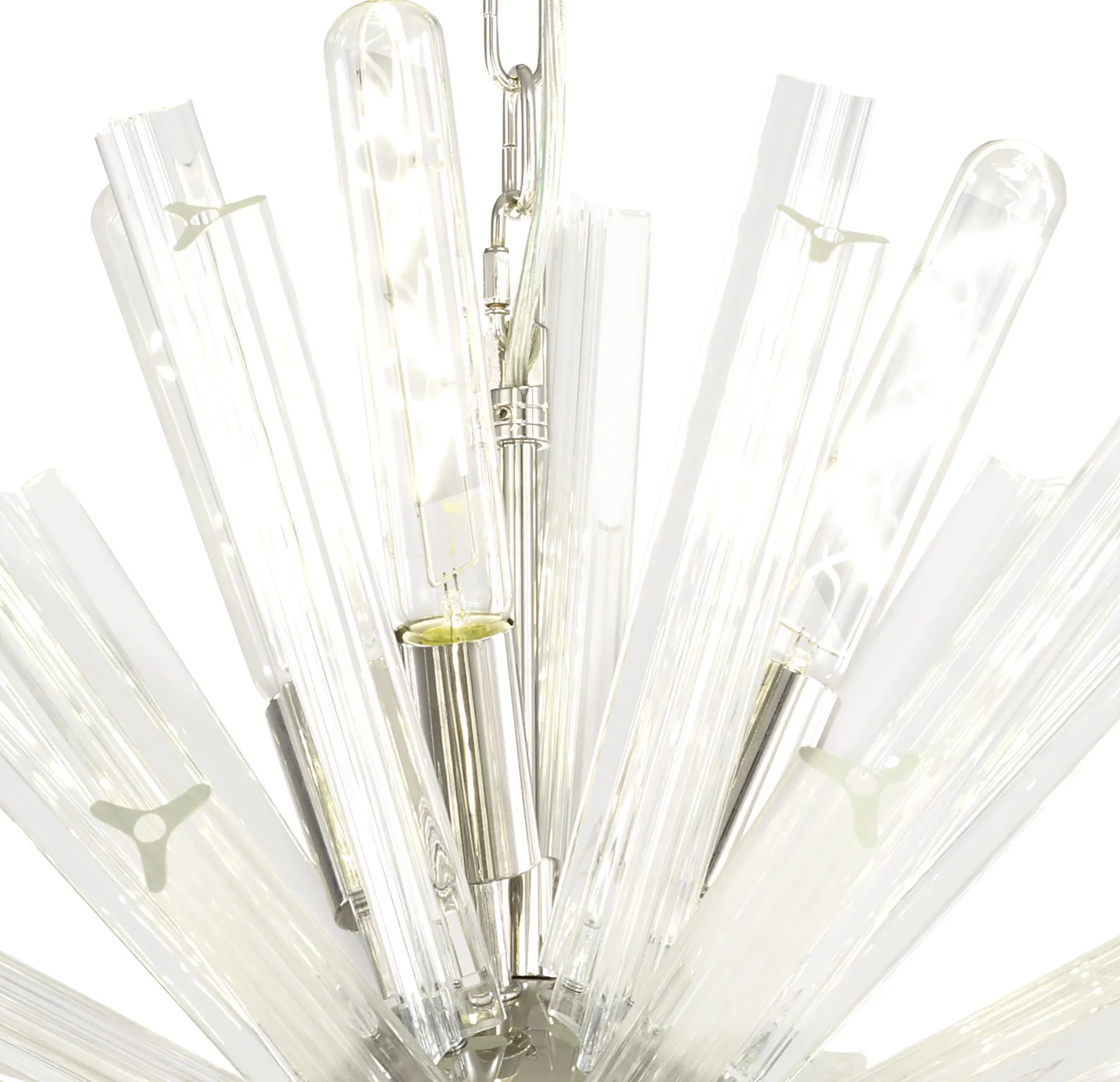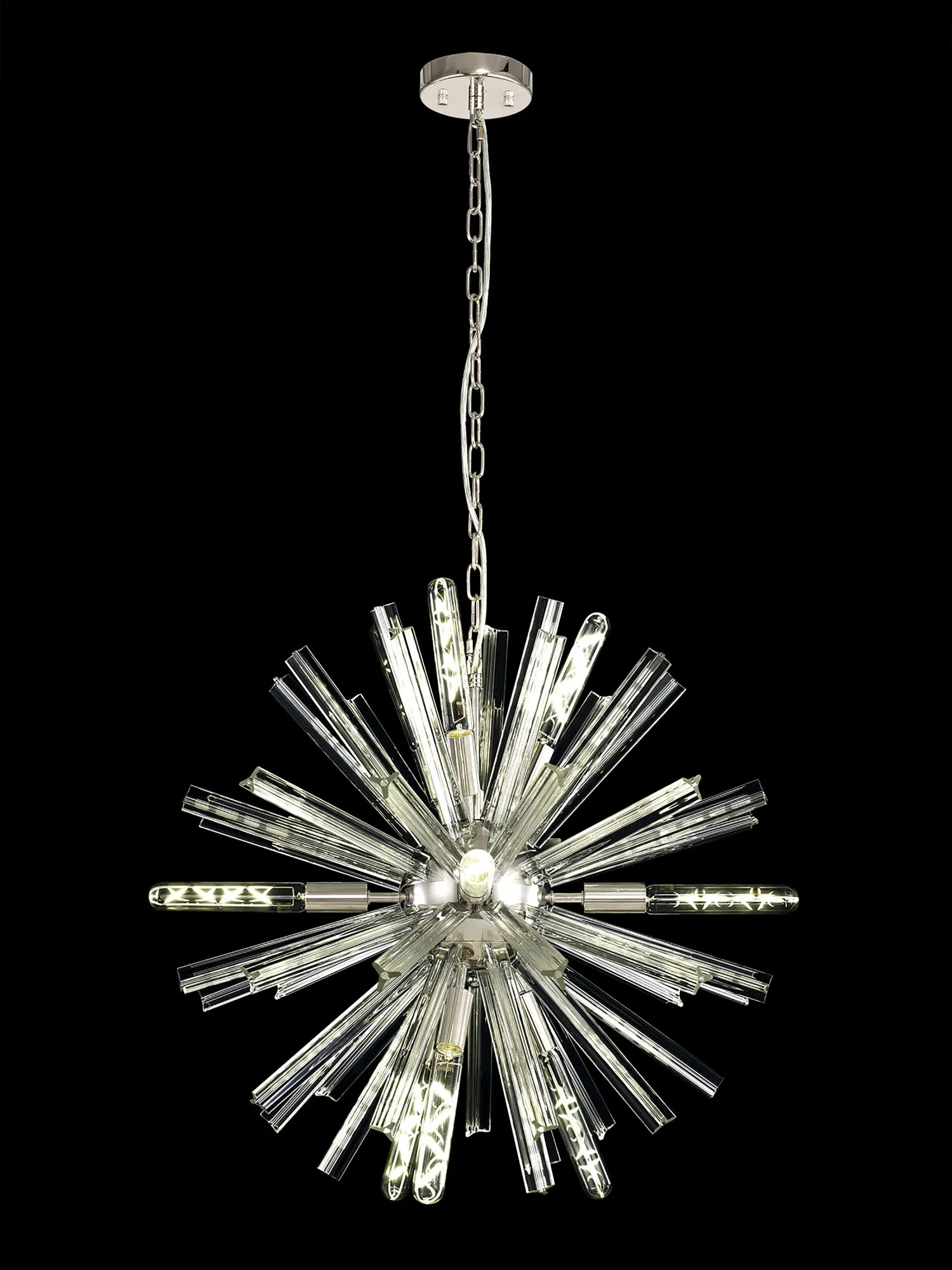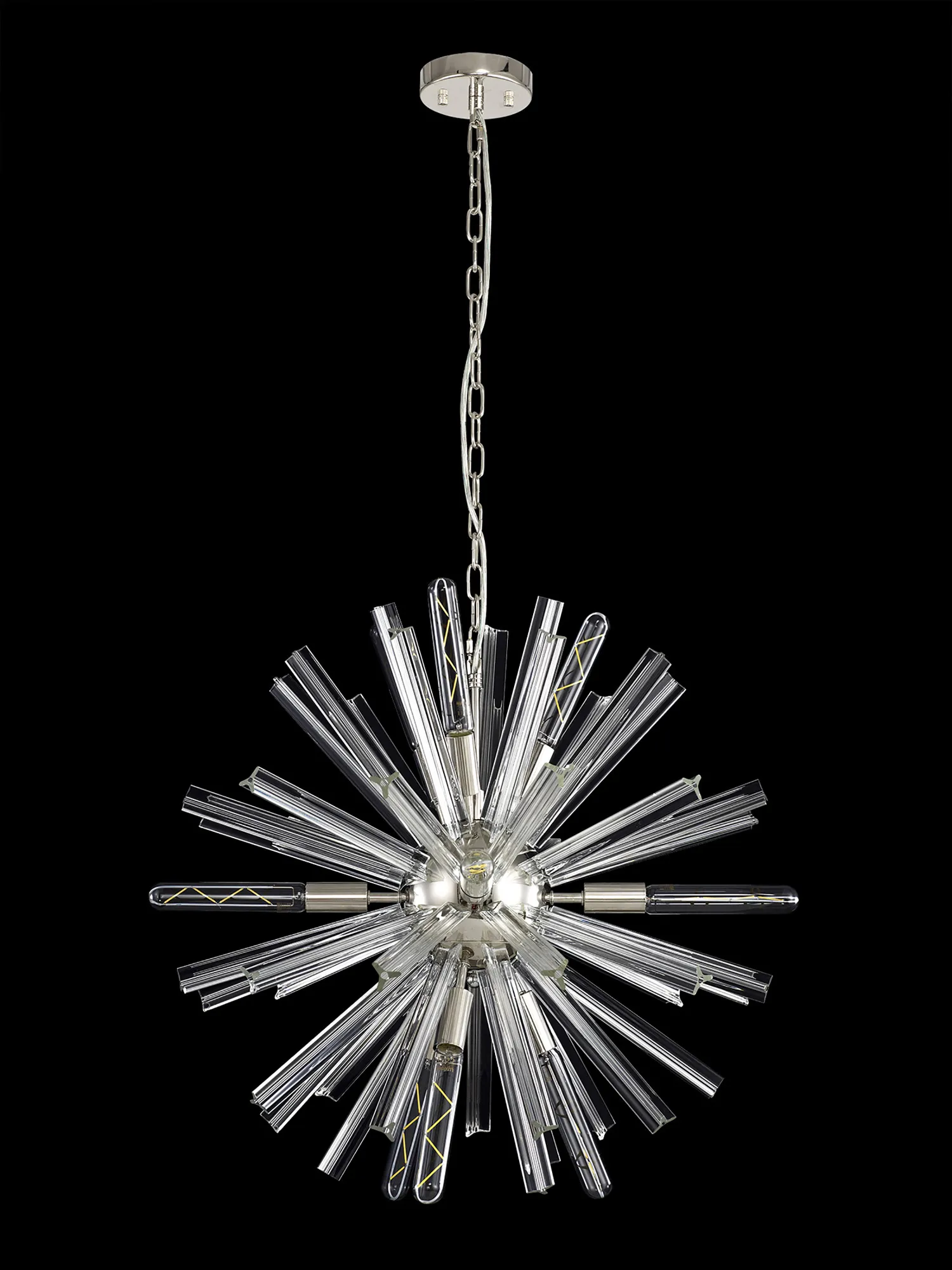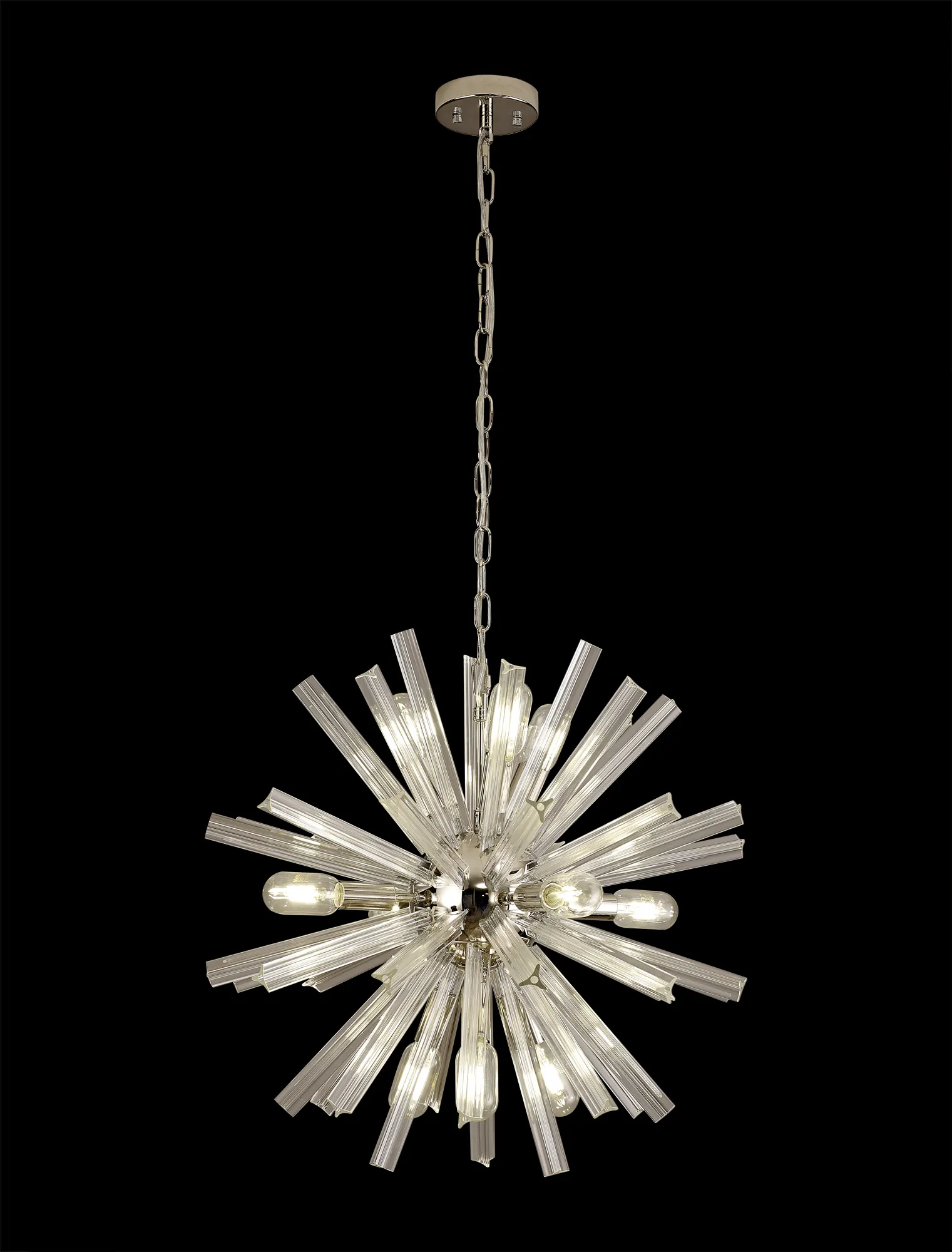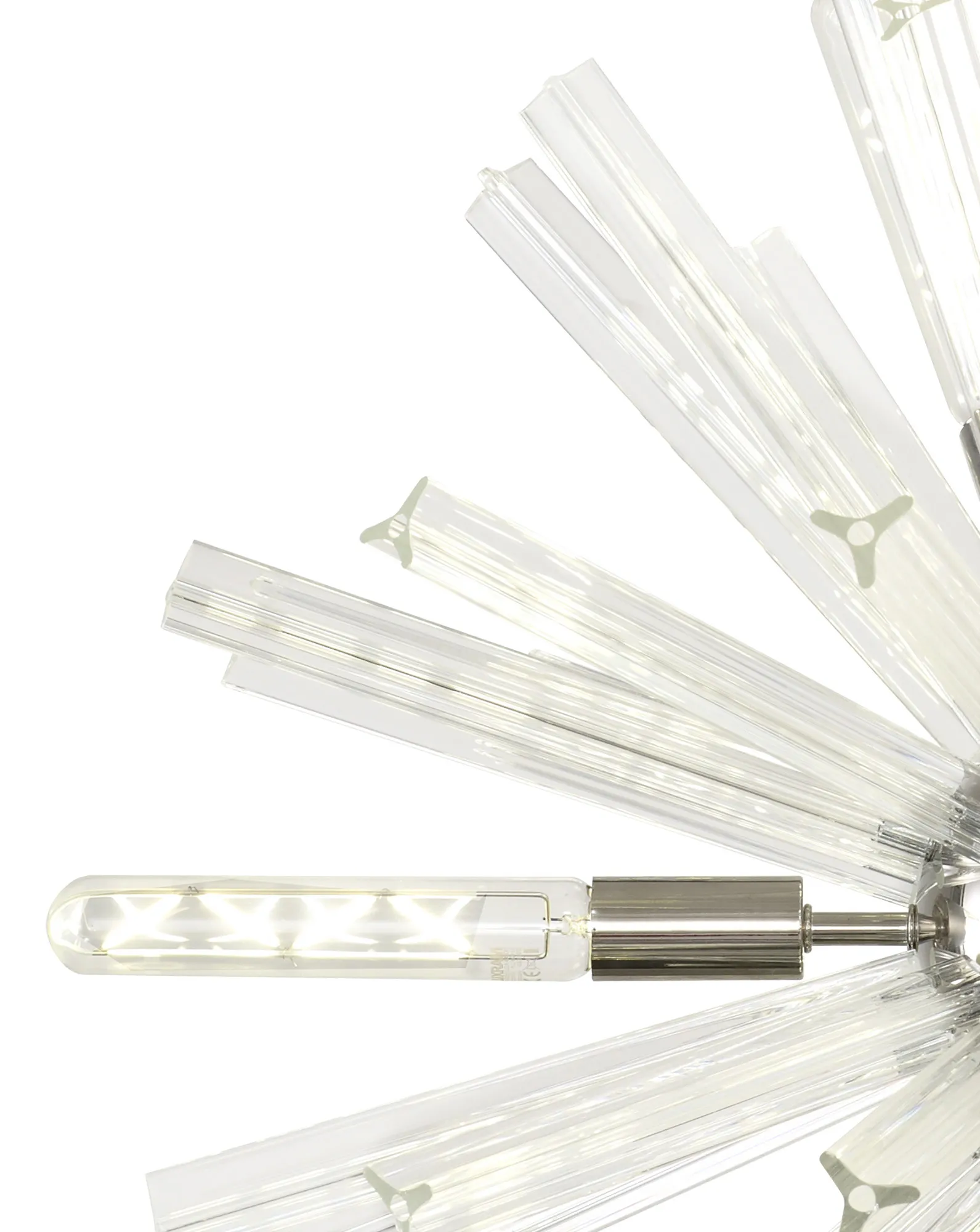 The Tora collection presents an intriguing glass shape moulded into a three dimensional triquetra. The grooves along each sized glass create an appealing optical effect which is effortlessly enhanced with the use of tubular lamps. The wide variety of fixtures available in this range span from a 6 light semi flush to an impacting 32 light pendant. The complementing wall lamps available allow for further application built around the same lighting family. Each frame can be chosen with either a brown oxide, polished nickel or matt black frame with either clear, champagne gold or smoke glass.