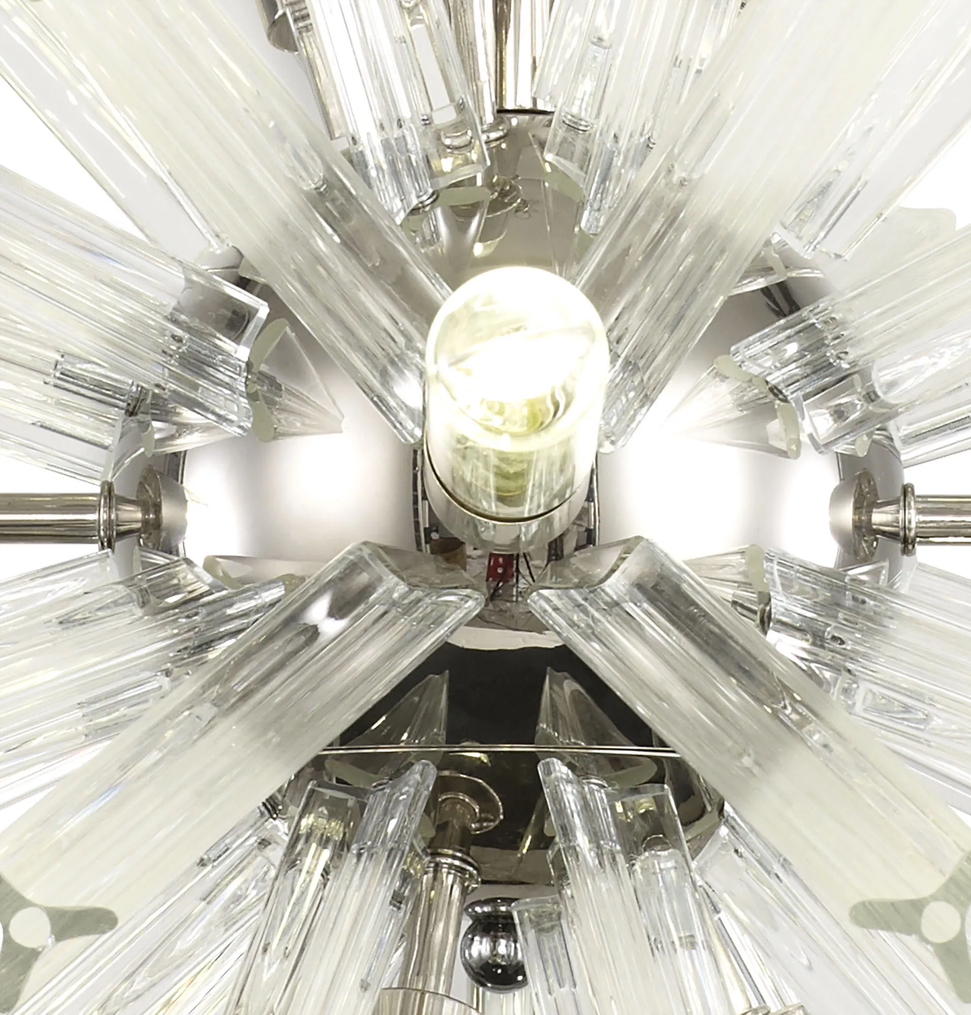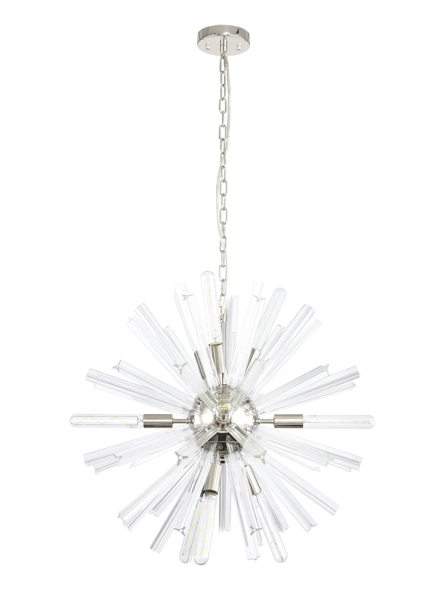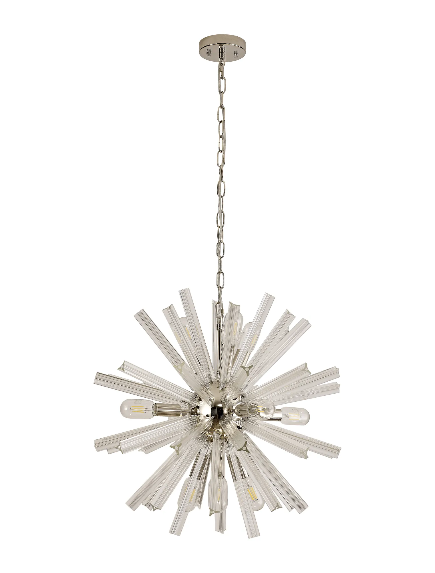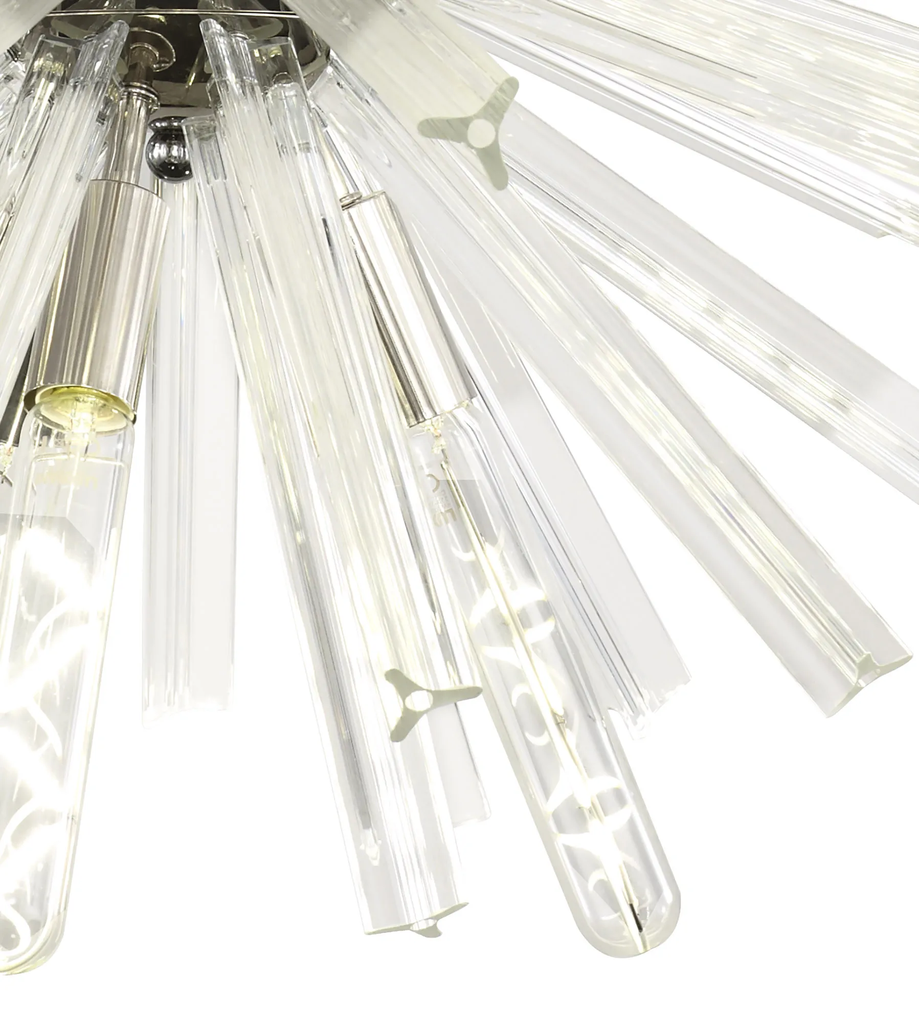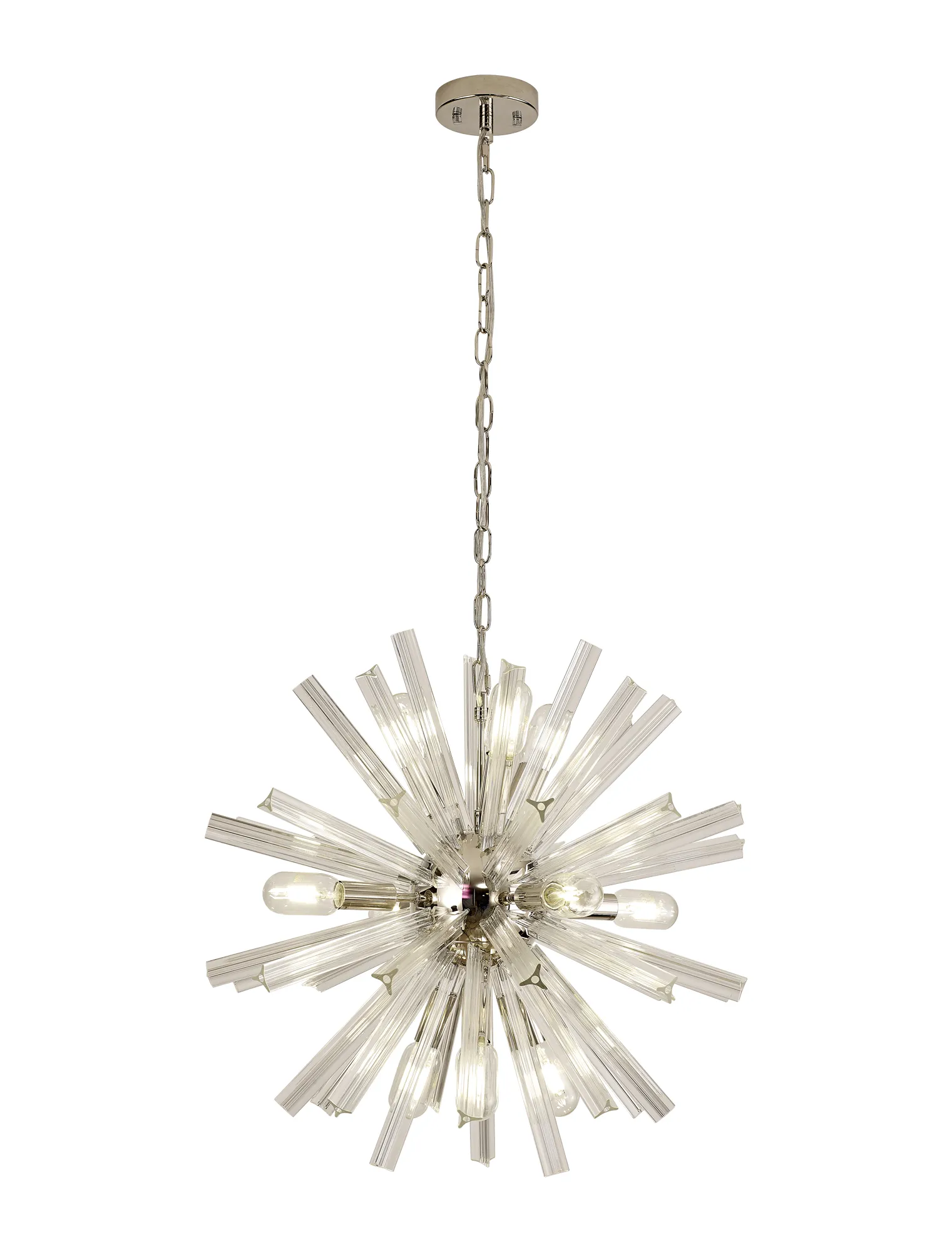 The Tora collection presents an intriguing glass shape moulded into a three dimensional triquetra. The grooves along each sized glass create an appealing optical effect which is effortlessly enhanced with the use of tubular lamps. The wide variety of fixtures available in this range span from a 6 light semi flush to an impacting 32 light pendant. The complementing wall lamps available allow for further application built around the same lighting family. Each frame can be chosen with either a brown oxide, polished nickel or matt black frame with either clear, champagne gold or smoke glass.