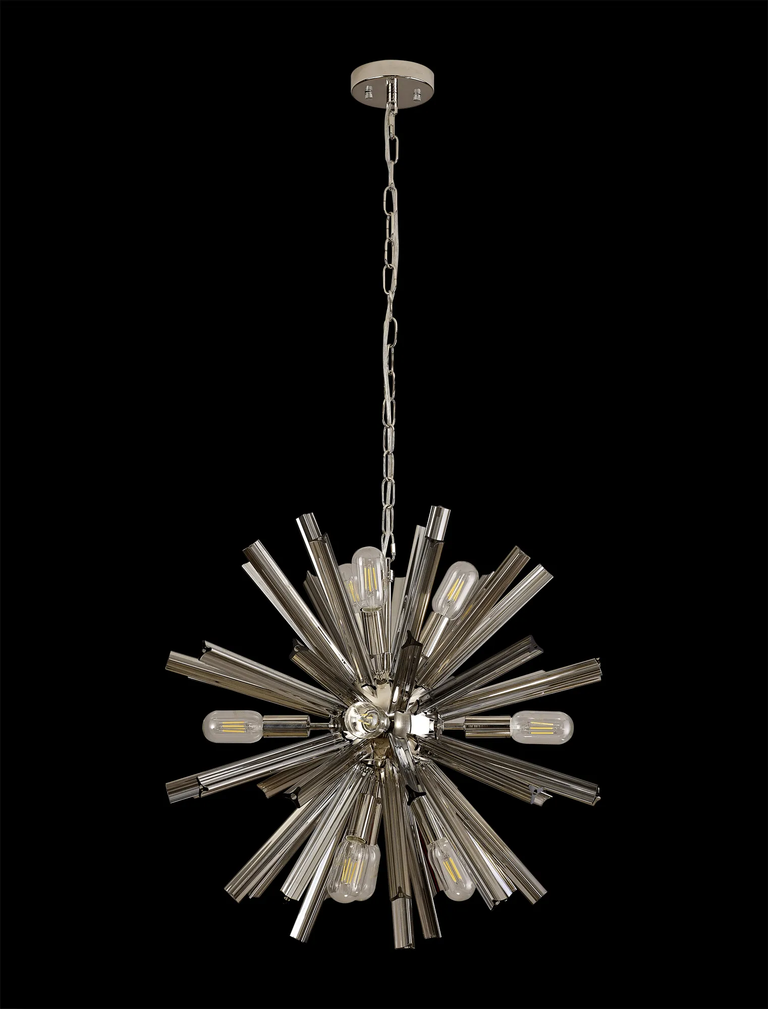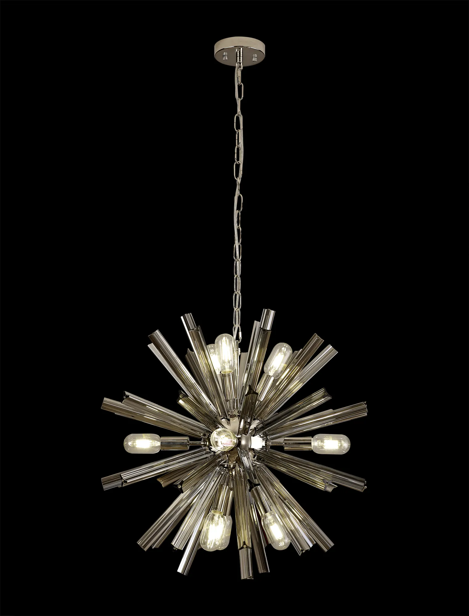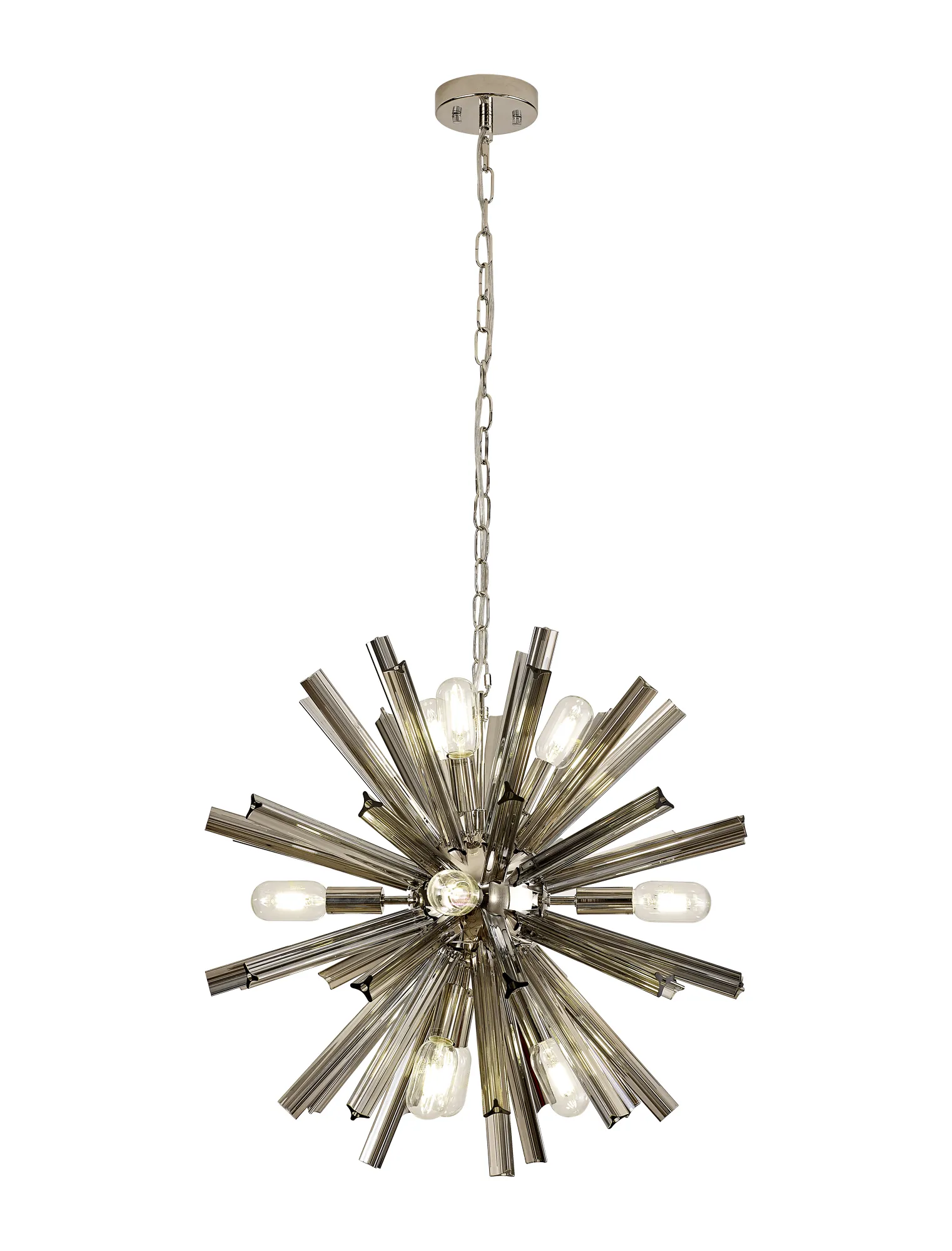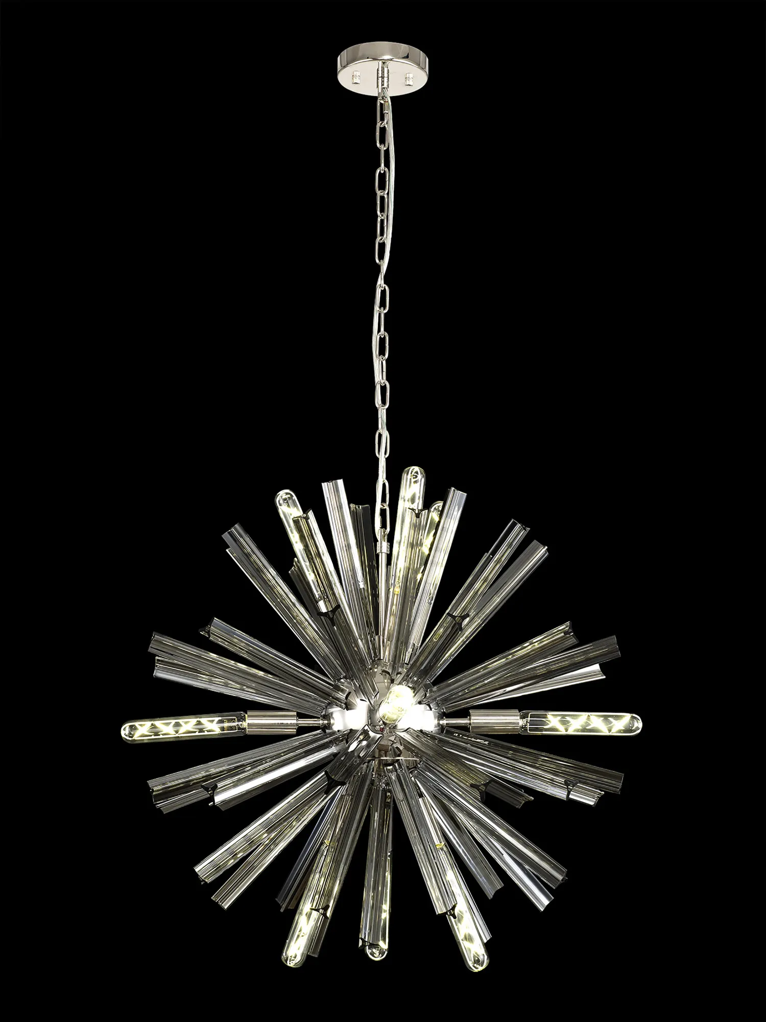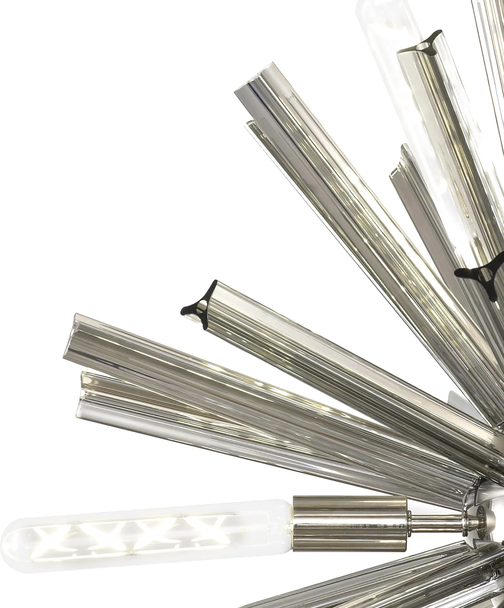 The Tora collection presents an intriguing glass shape moulded into a three dimensional triquetra. The grooves along each sized glass create an appealing optical effect which is effortlessly enhanced with the use of tubular lamps. The wide variety of fixtures available in this range span from a 6 light semi flush to an impacting 32 light pendant. The complementing wall lamps available allow for further application built around the same lighting family. Each frame can be chosen with either a brown oxide, polished nickel or matt black frame with either clear, champagne gold or smoke glass.