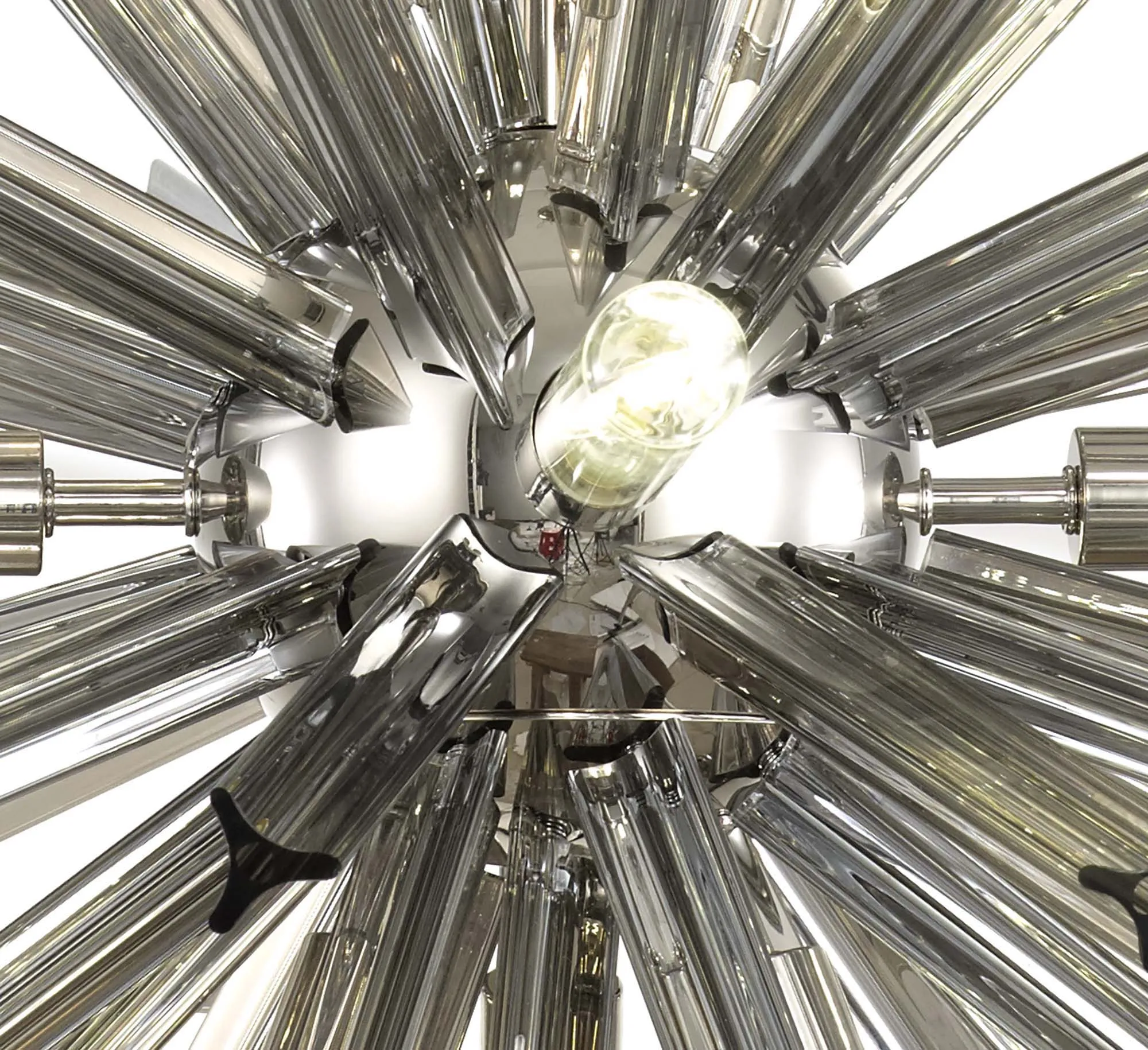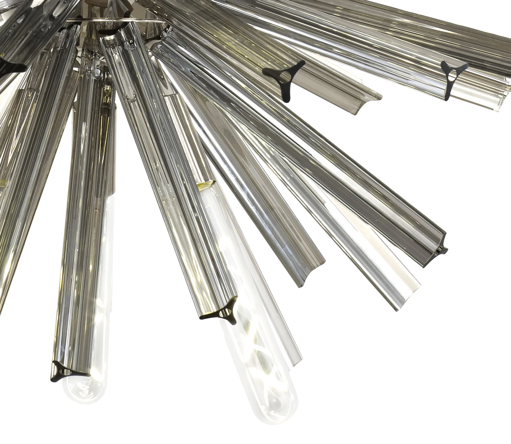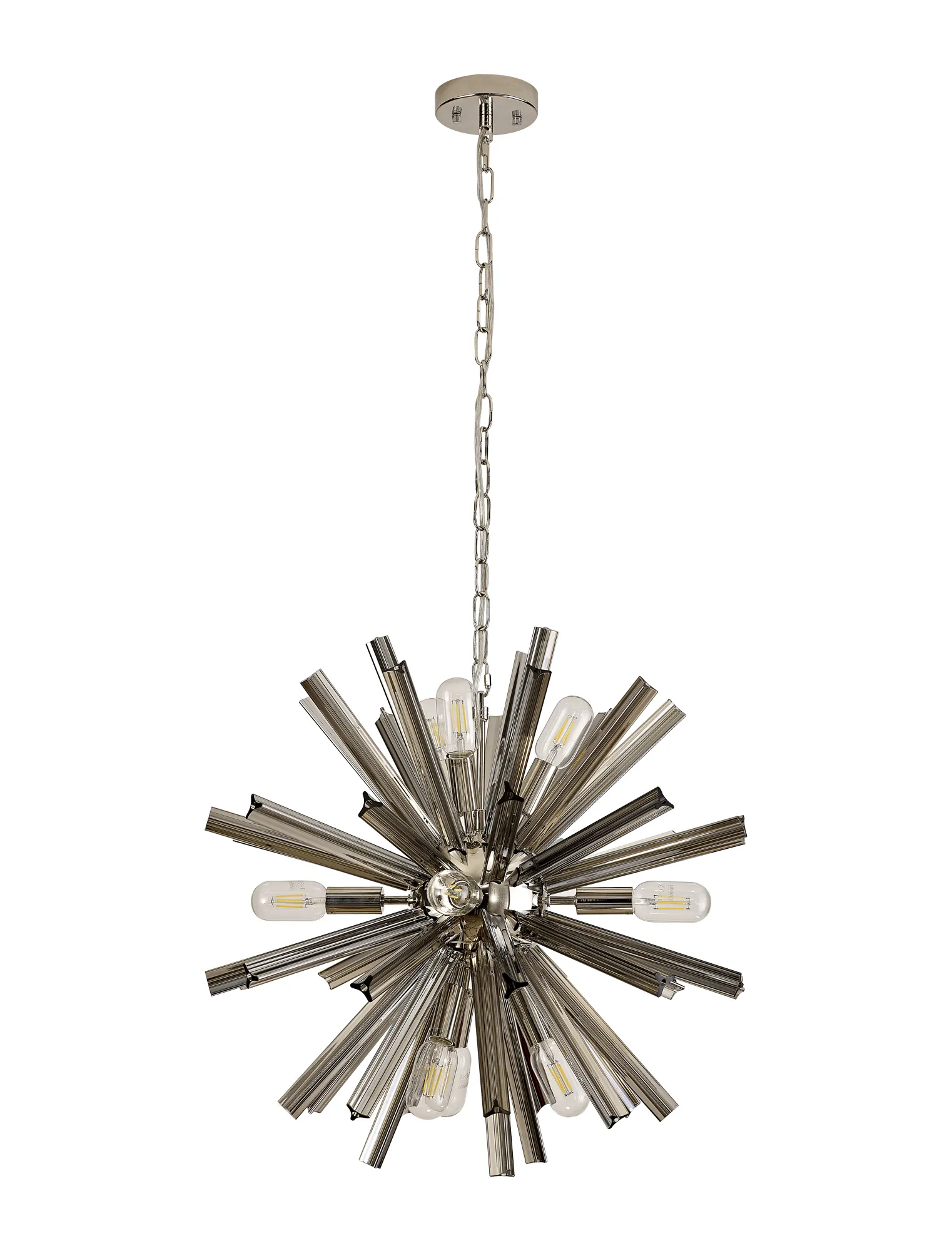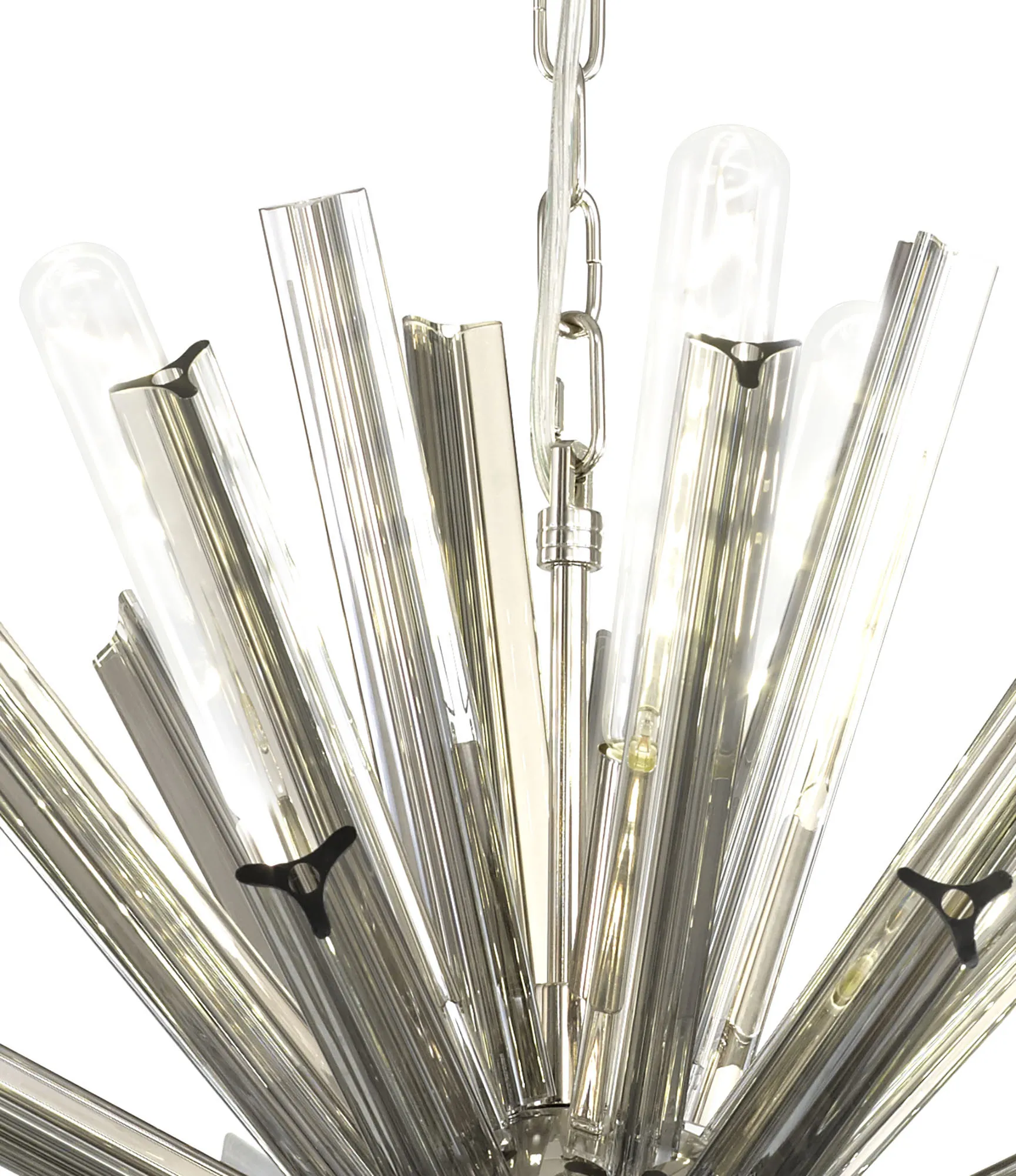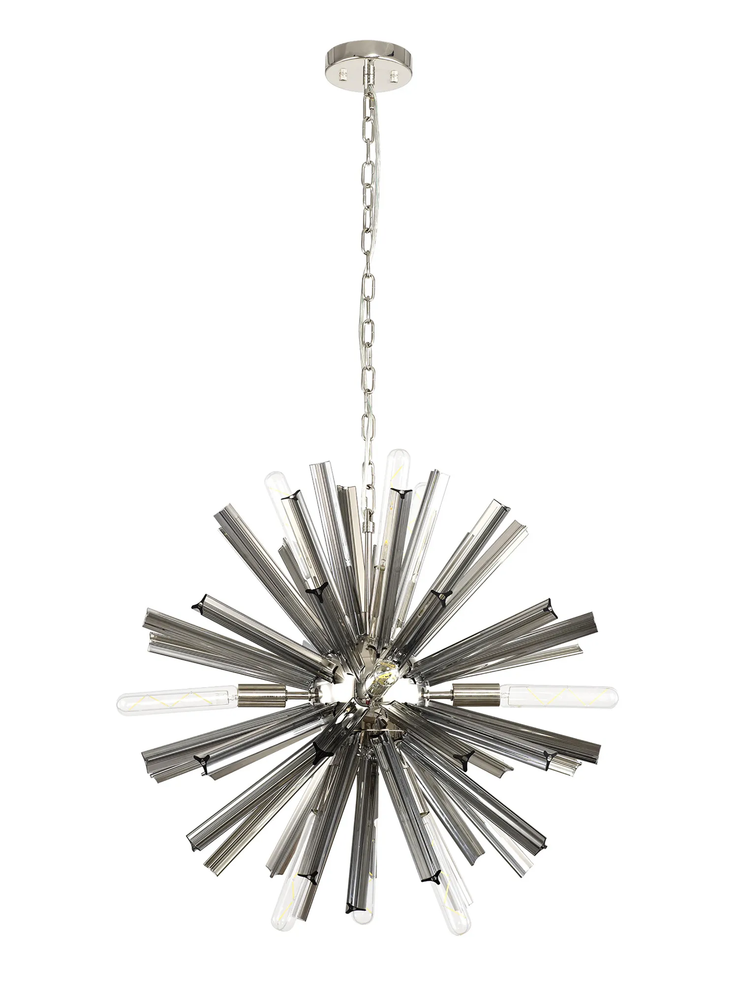 The Tora collection presents an intriguing glass shape moulded into a three dimensional triquetra. The grooves along each sized glass create an appealing optical effect which is effortlessly enhanced with the use of tubular lamps. The wide variety of fixtures available in this range span from a 6 light semi flush to an impacting 32 light pendant. The complementing wall lamps available allow for further application built around the same lighting family. Each frame can be chosen with either a brown oxide, polished nickel or matt black frame with either clear, champagne gold or smoke glass.