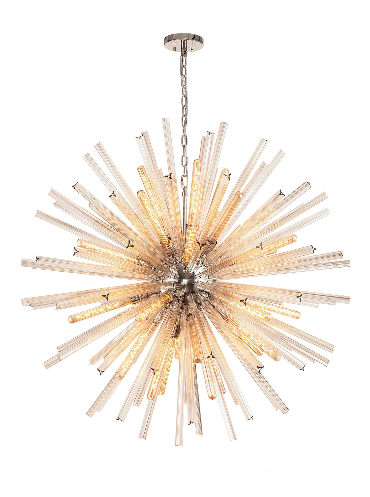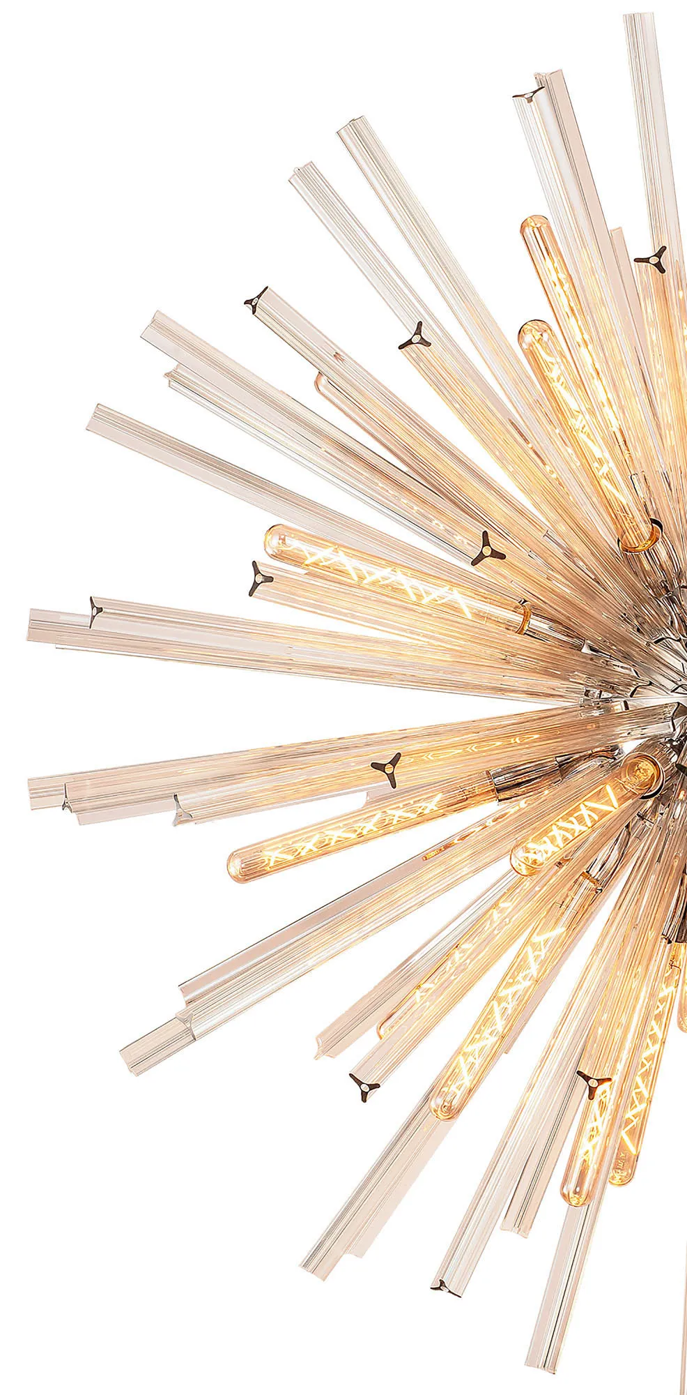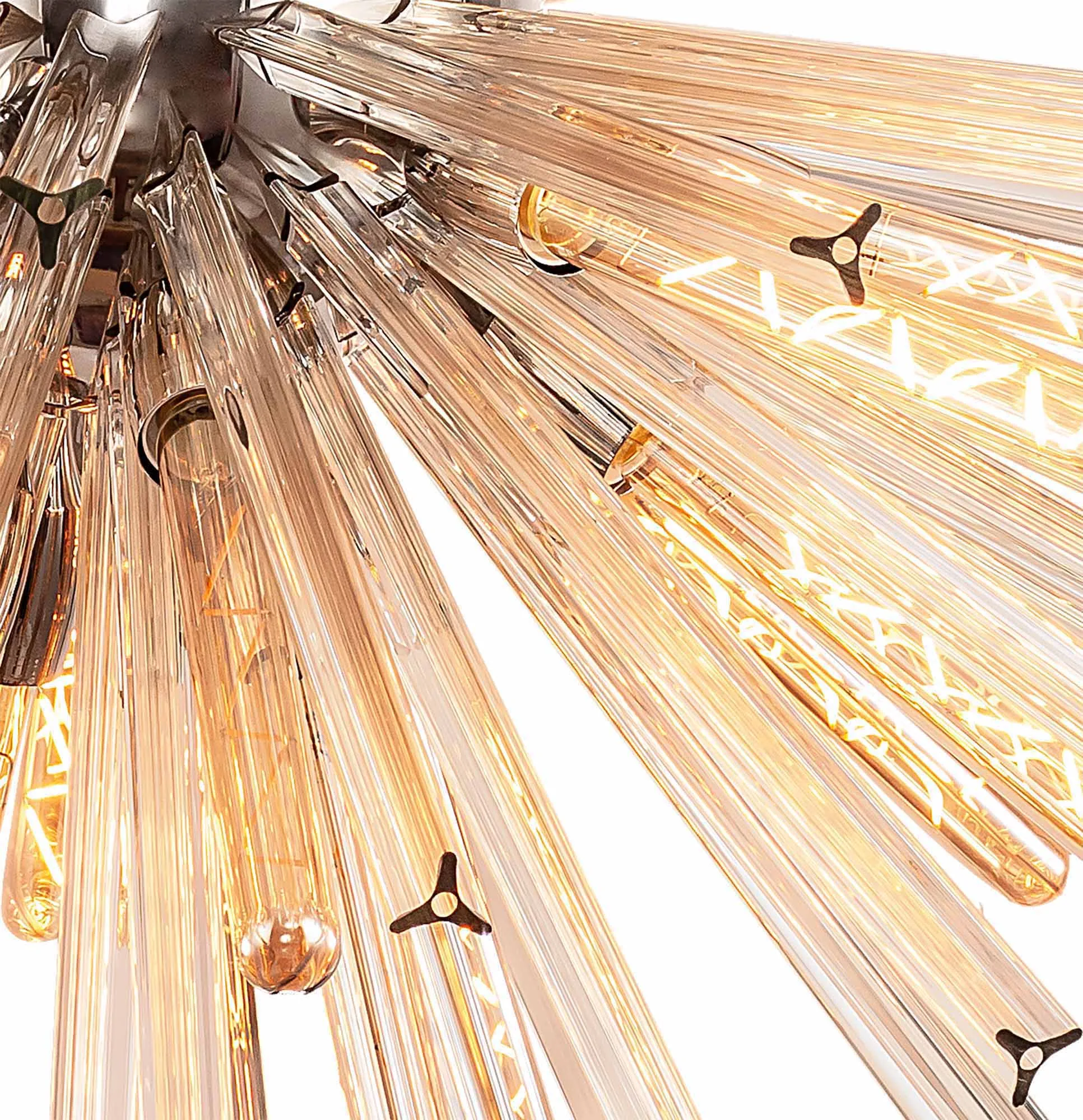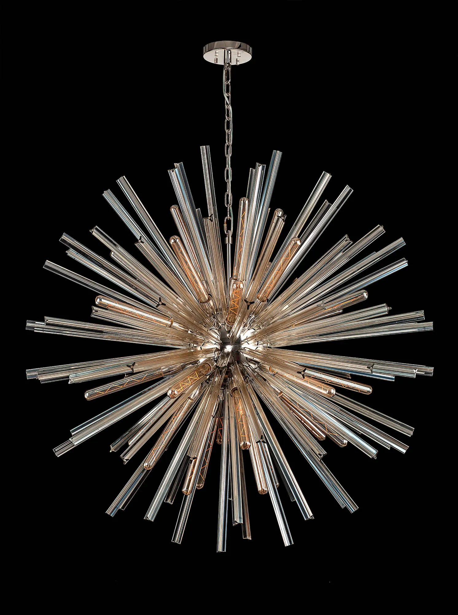 The Tora collection presents an intriguing glass shape moulded into a three dimensional triquetra. The grooves along each sized glass create an appealing optical effect which is effortlessly enhanced with the use of tubular lamps. The wide variety of fixtures available in this range span from a 6 light semi flush to an impacting 32 light pendant. The complementing wall lamps available allow for further application built around the same lighting family. Each frame can be chosen with either a brown oxide, polished nickel or matt black frame with either clear, champagne gold or smoke glass.