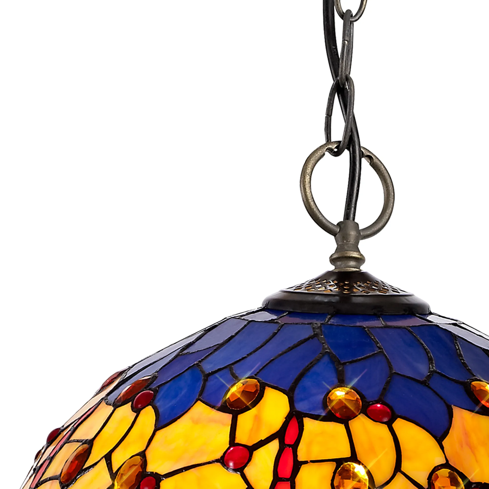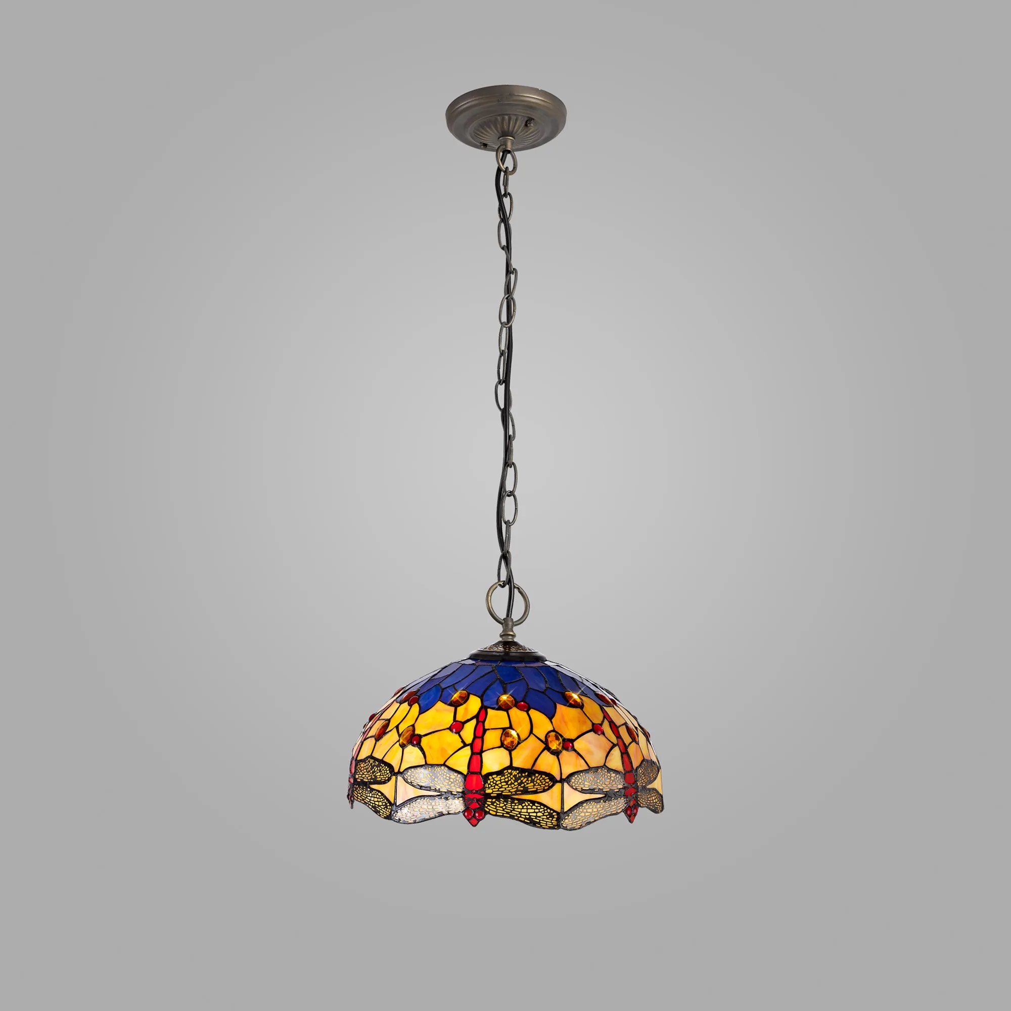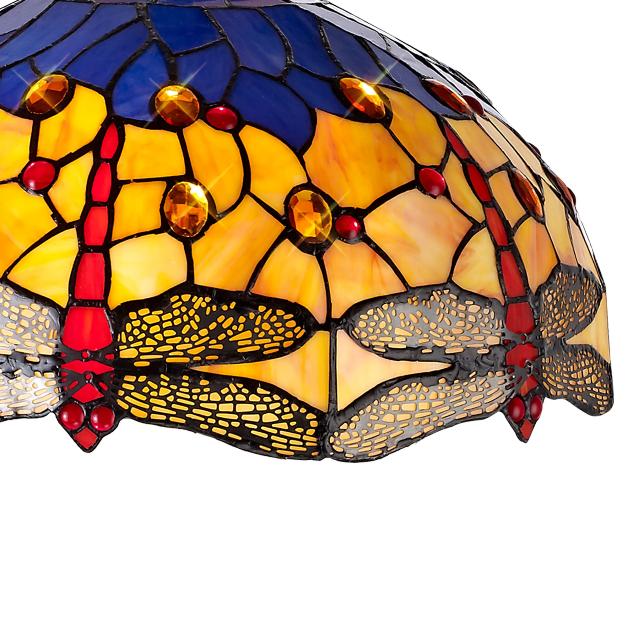 Hunterville's stunning Tiffany glass design features the classic dragonfly form, effortlessly fashioned into the overall mosaic collection of Tiffany glass pieces. Reinterpreting an old-fashioned concept, additional crystal pieces have been inserted into the glass shades providing a touch of modern sparkle and elegance. Available in two colour finishes this beautiful pattern is featured across a comprehensive variety of lighting solutions.