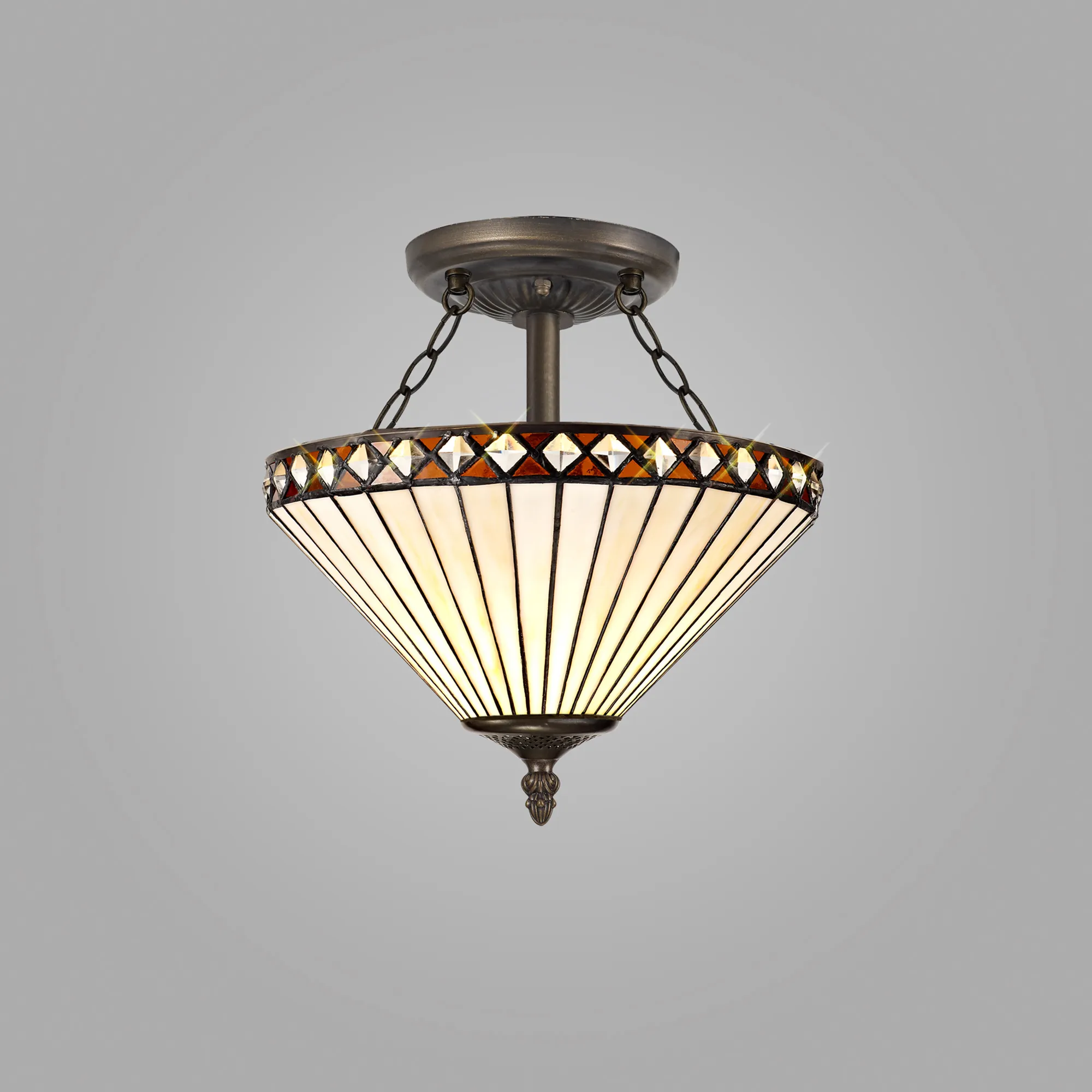 OTHER Wattle 2 Light Semi Flush E27 With 30cm Tiffany Shade, Amber/Cream/Crystal/Aged Antique Brass