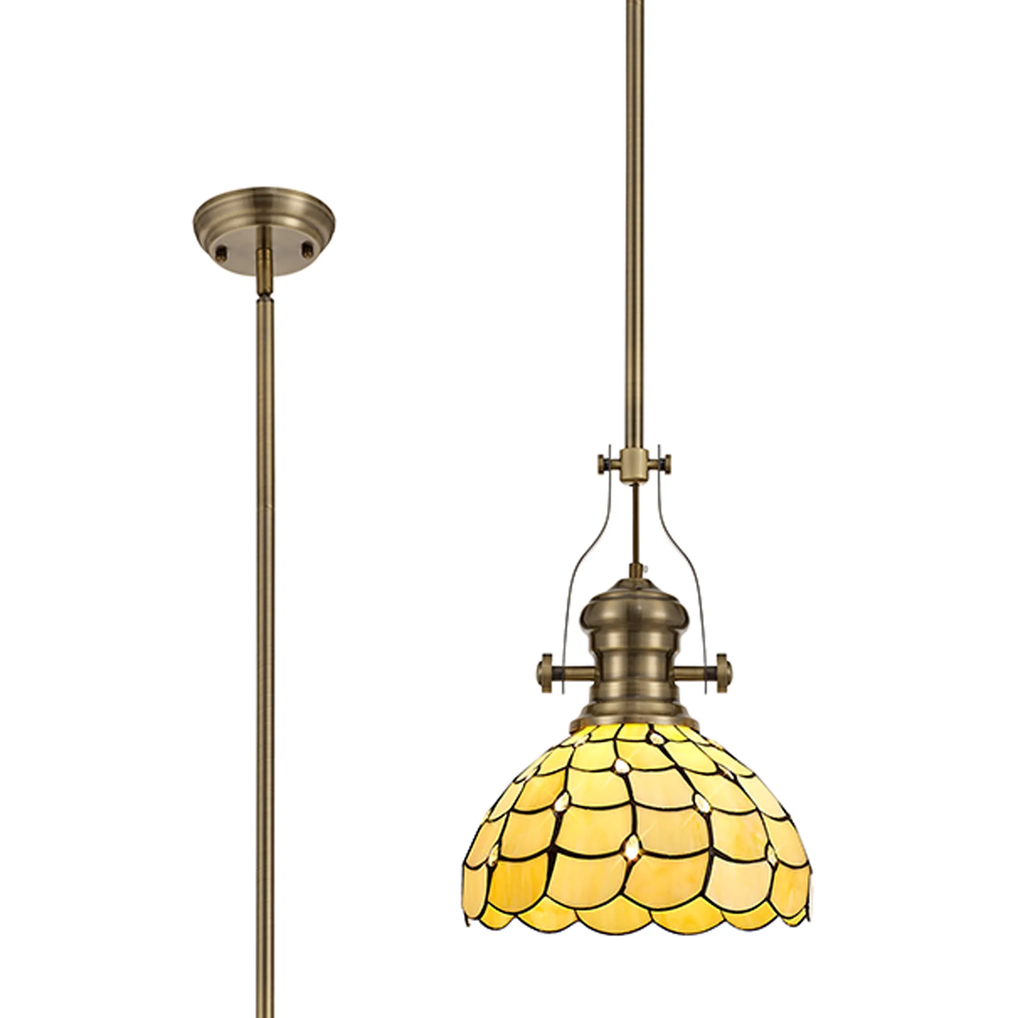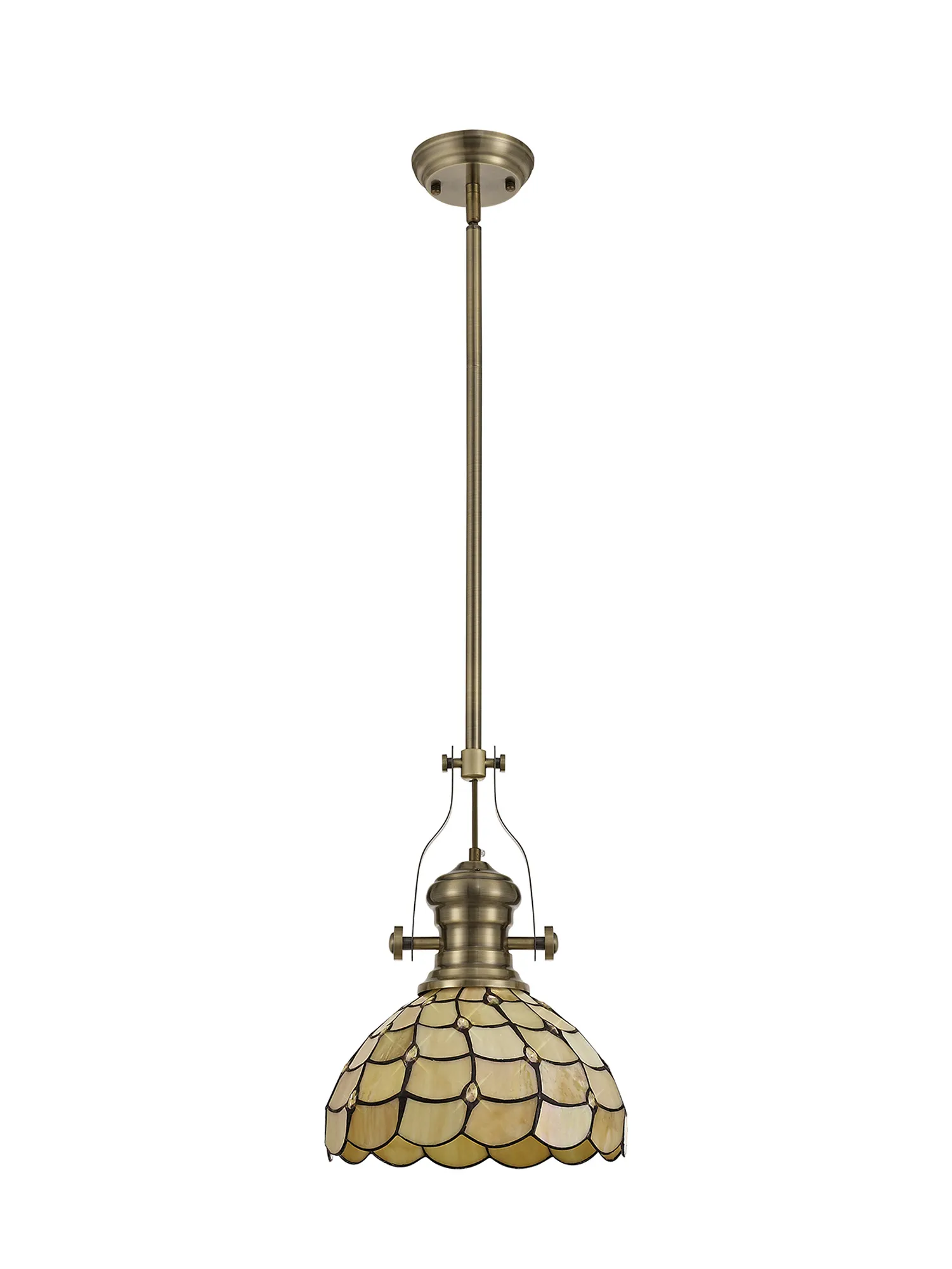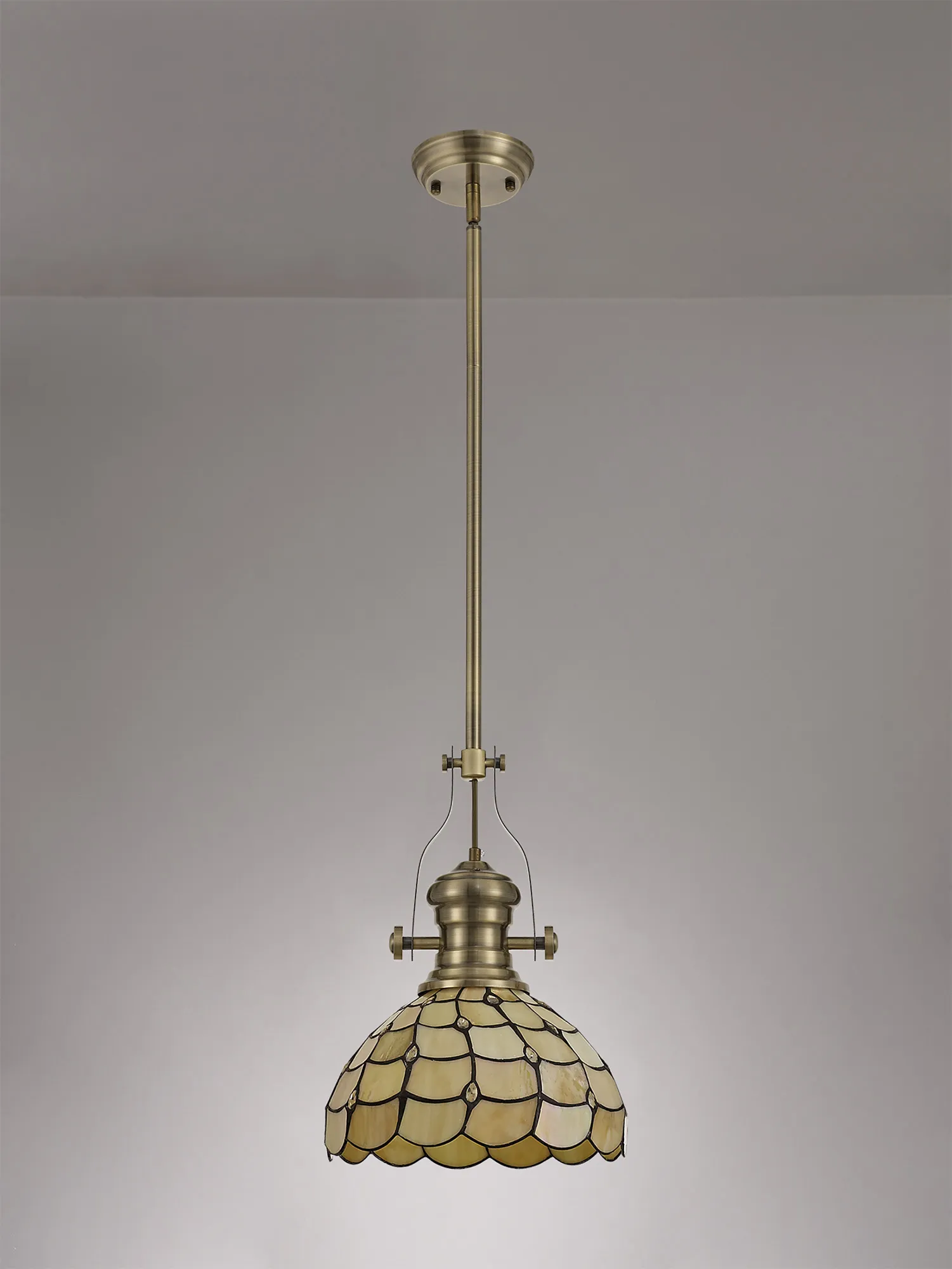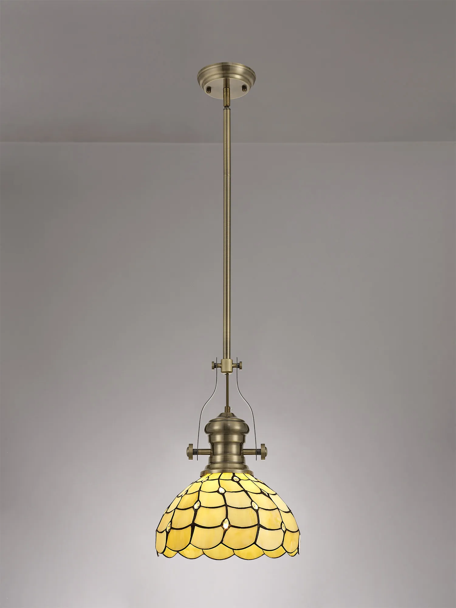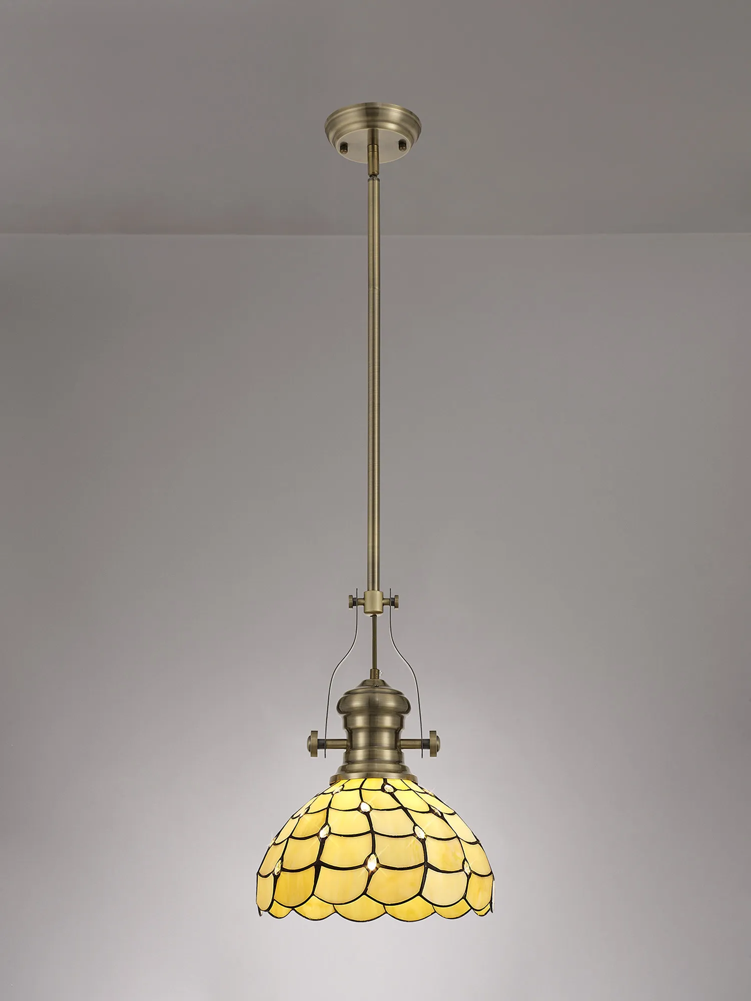 The Rosebank Tiffany collection is a harmonious balance of old and new, forming a unique contemporary range that combines vintage design with modern elements. The domed shades, assembled from beige sheened glass shapes and black outlines are adorned with multiple clear crystal tear drops. This not only ensures a muted homely ambience of light but also dazzling points of sparkle. Rosebank can be used to create classic character in a room setting with ceiling lights and table lamps.