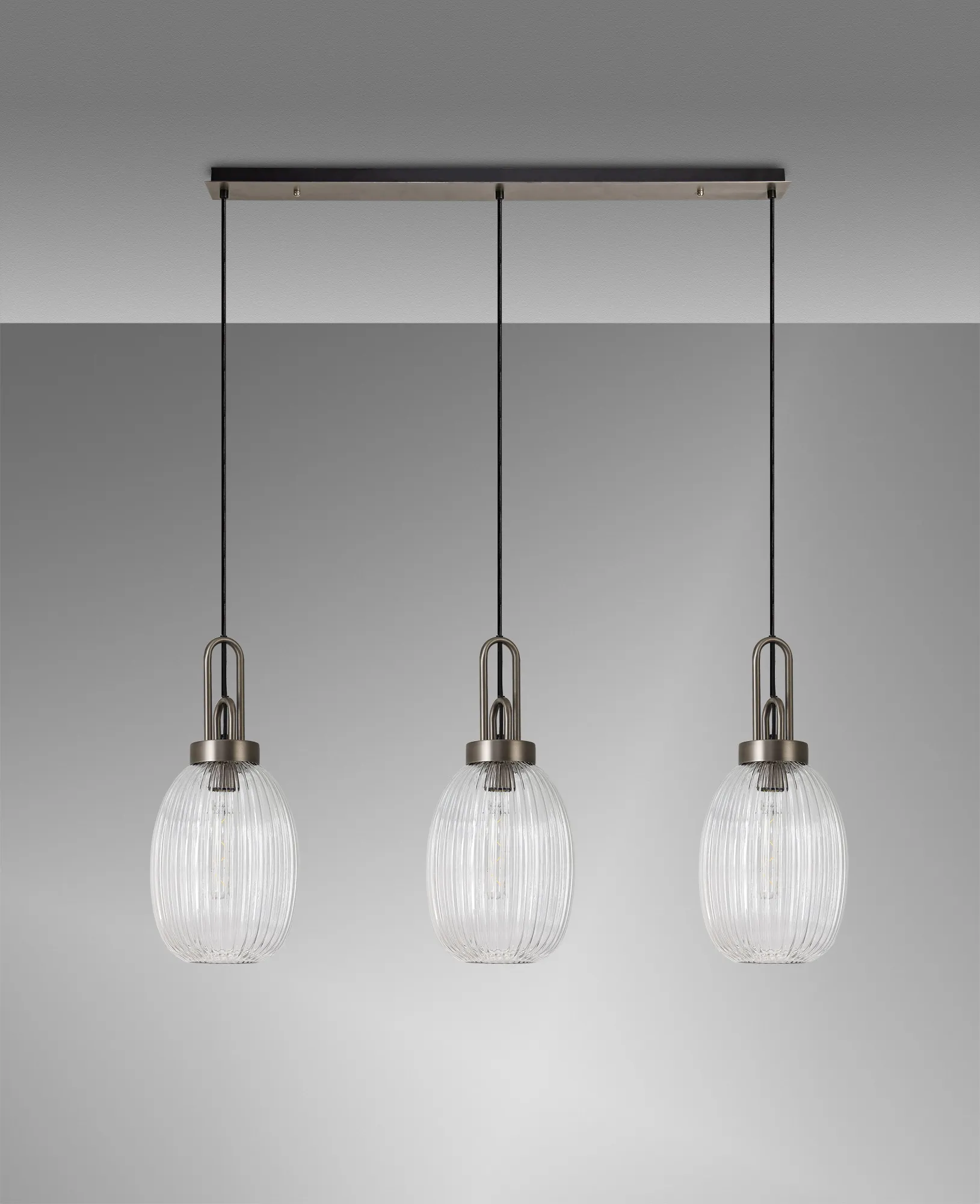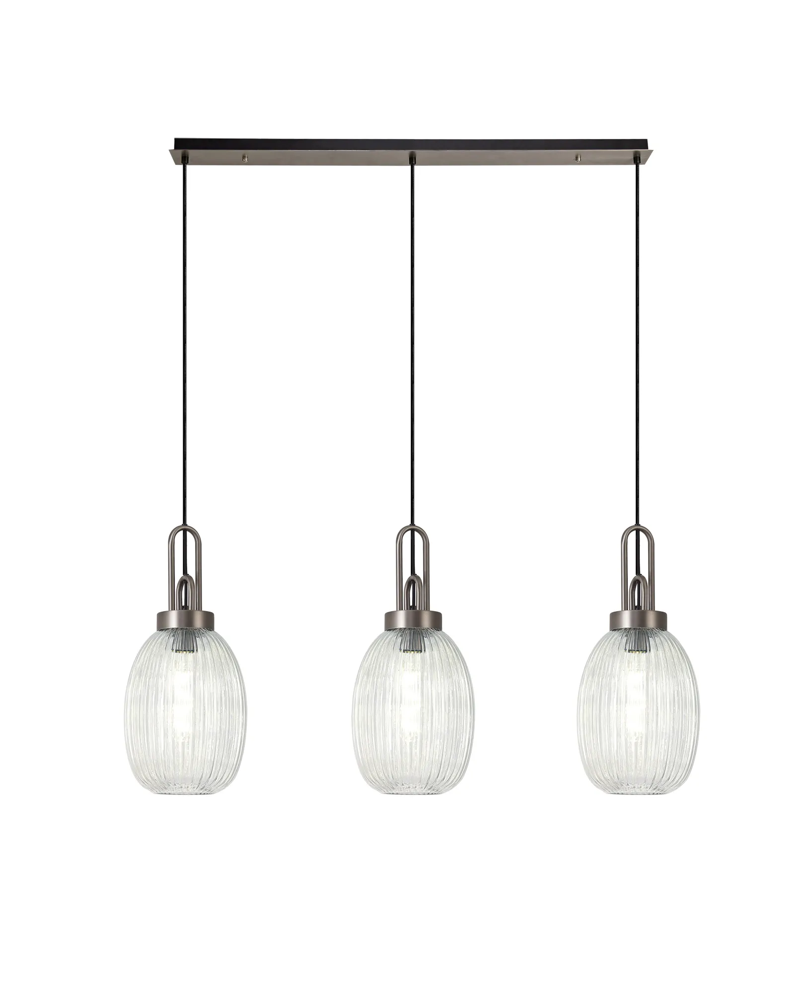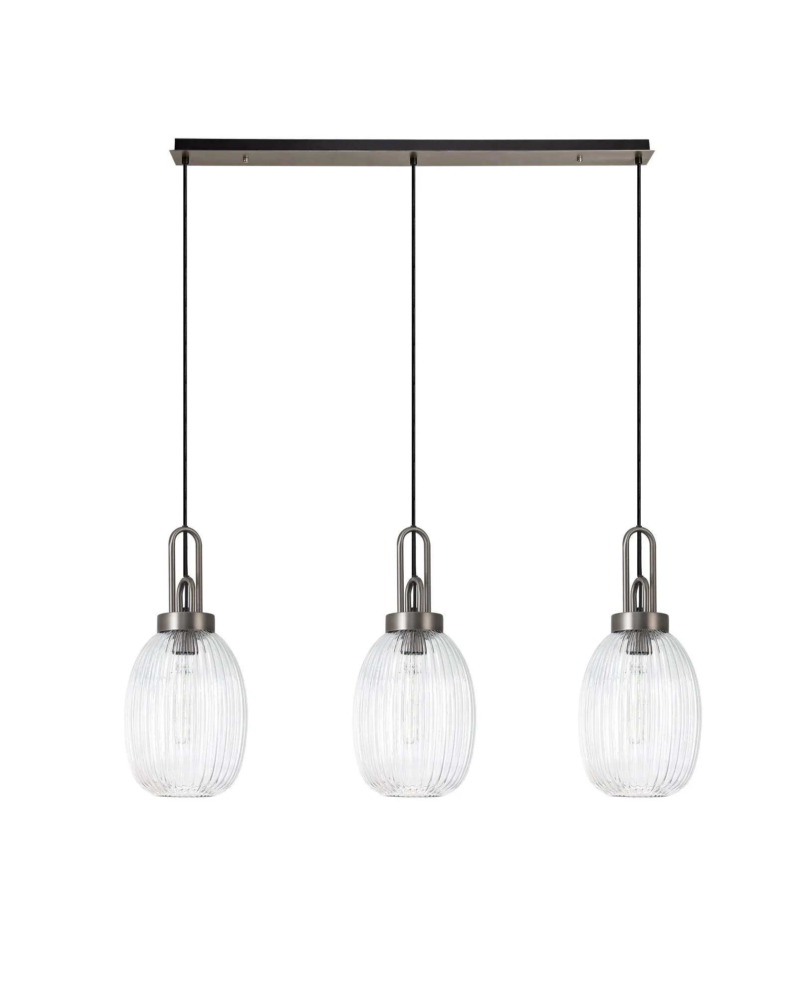 Kirby 2.5m Round Pendant, 5 x E27, Antique Silver/Matt Black With 30cm Pumpkin Shaped Ribbed Clear Glass