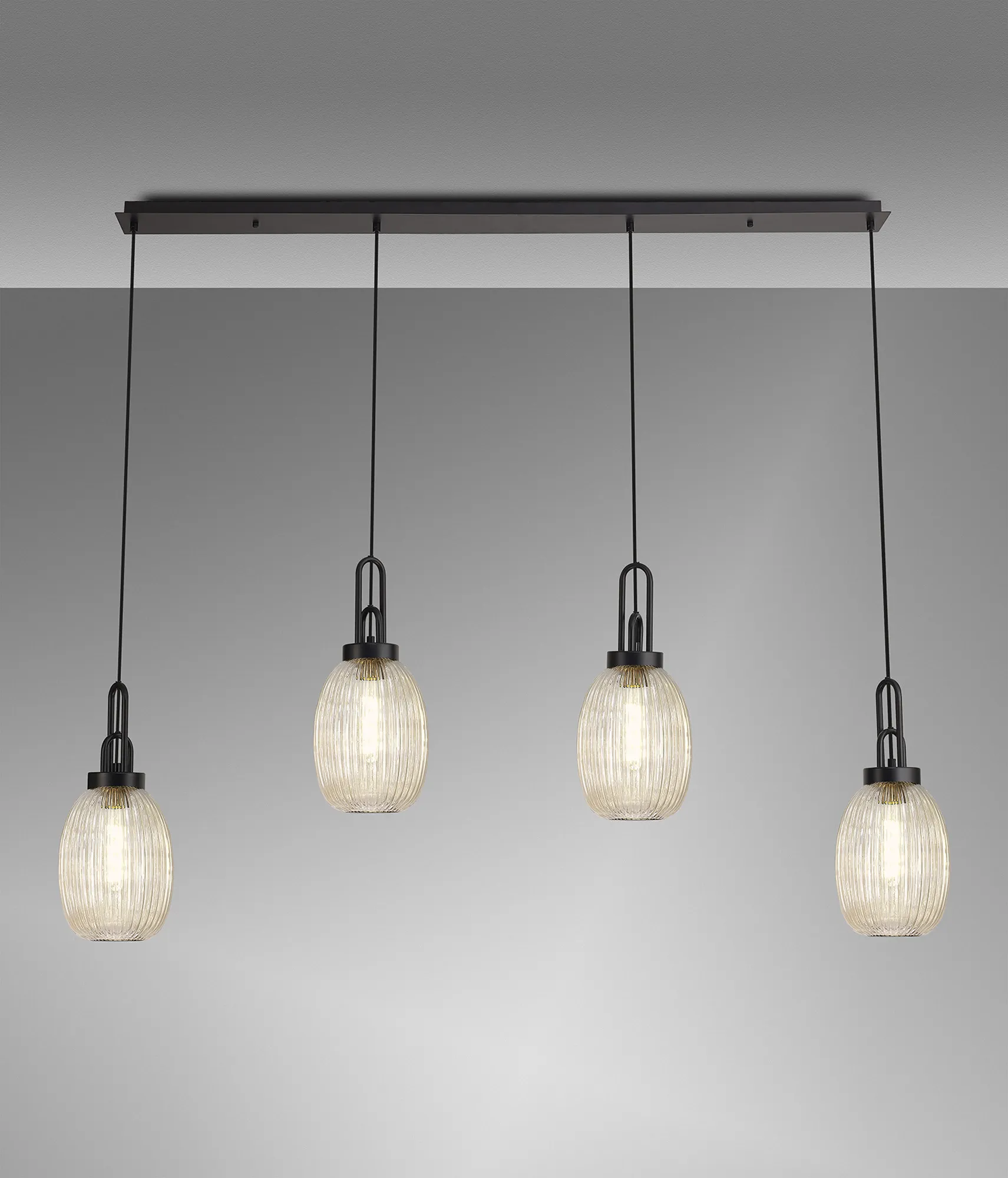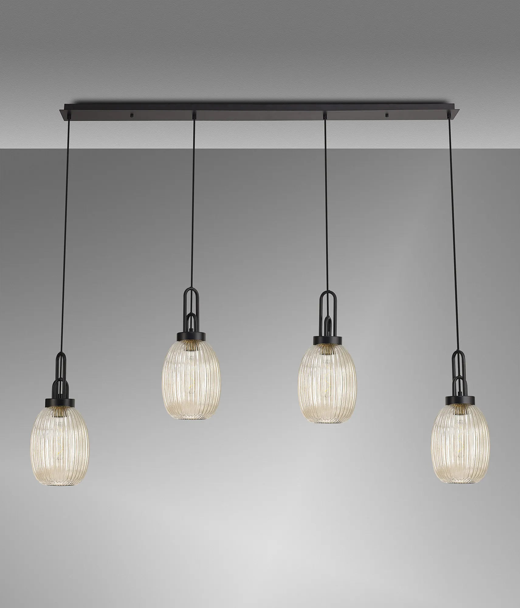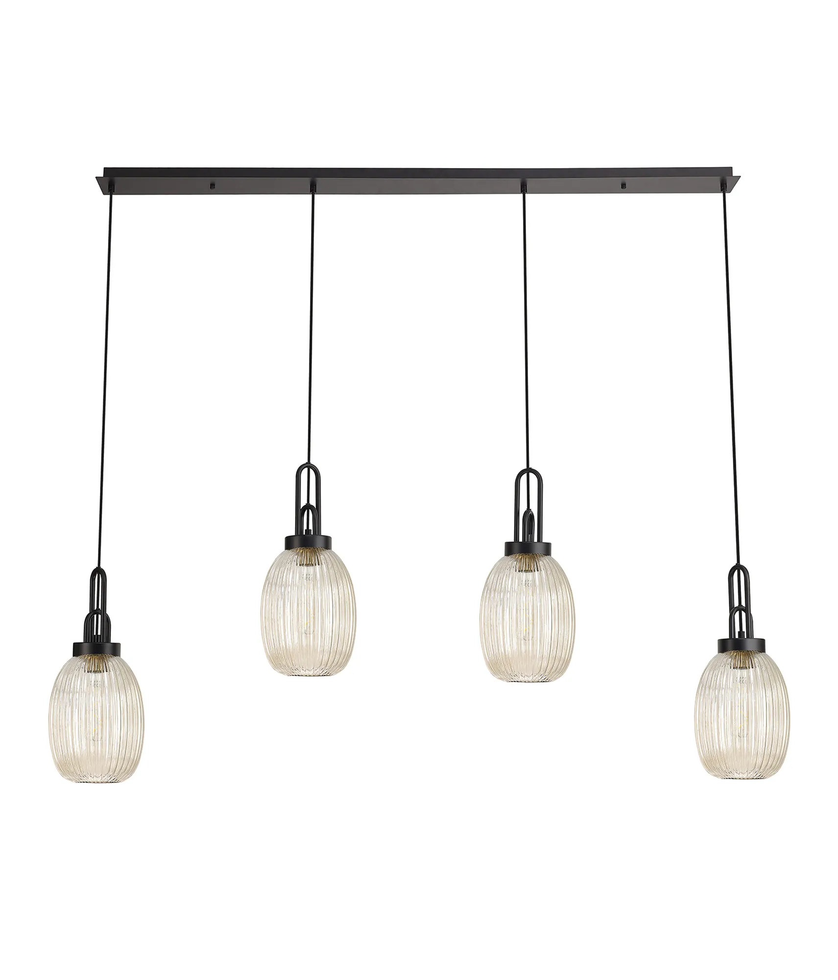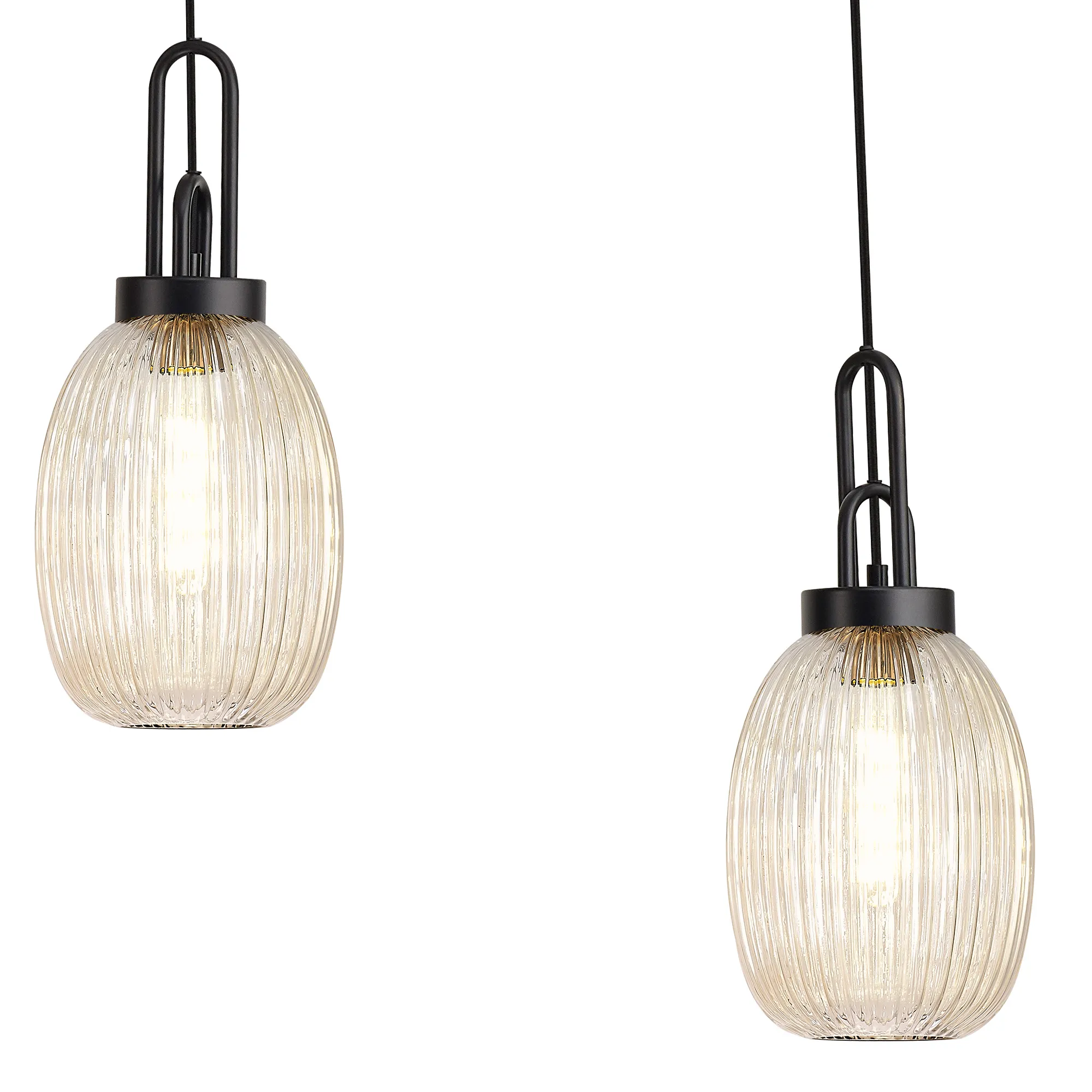 Kirby Round 3 Light Pendant With 20cm Almond Ribbed Glass, Matt Black/Matt Black Champagne