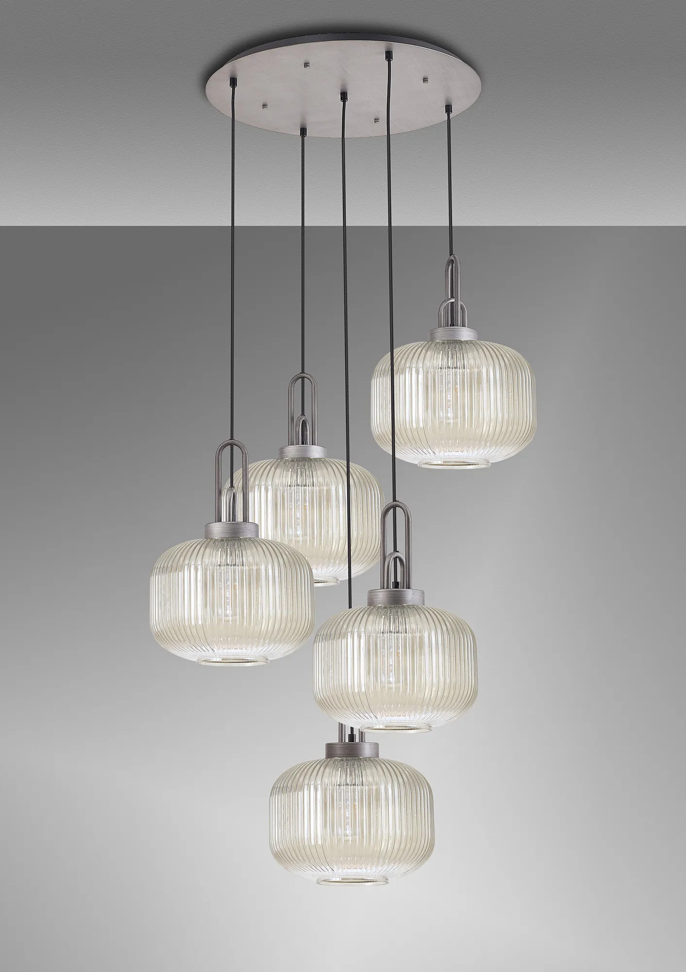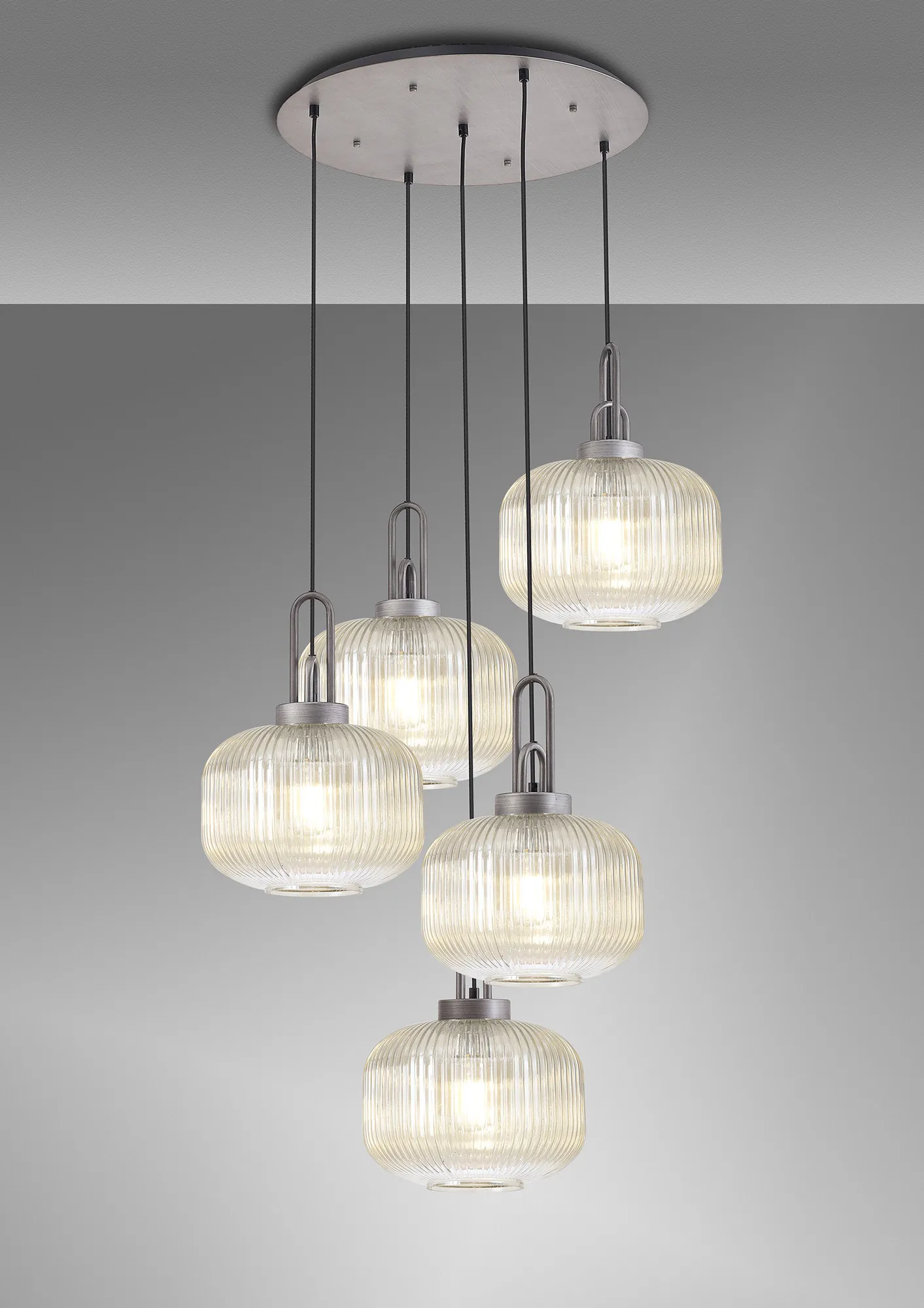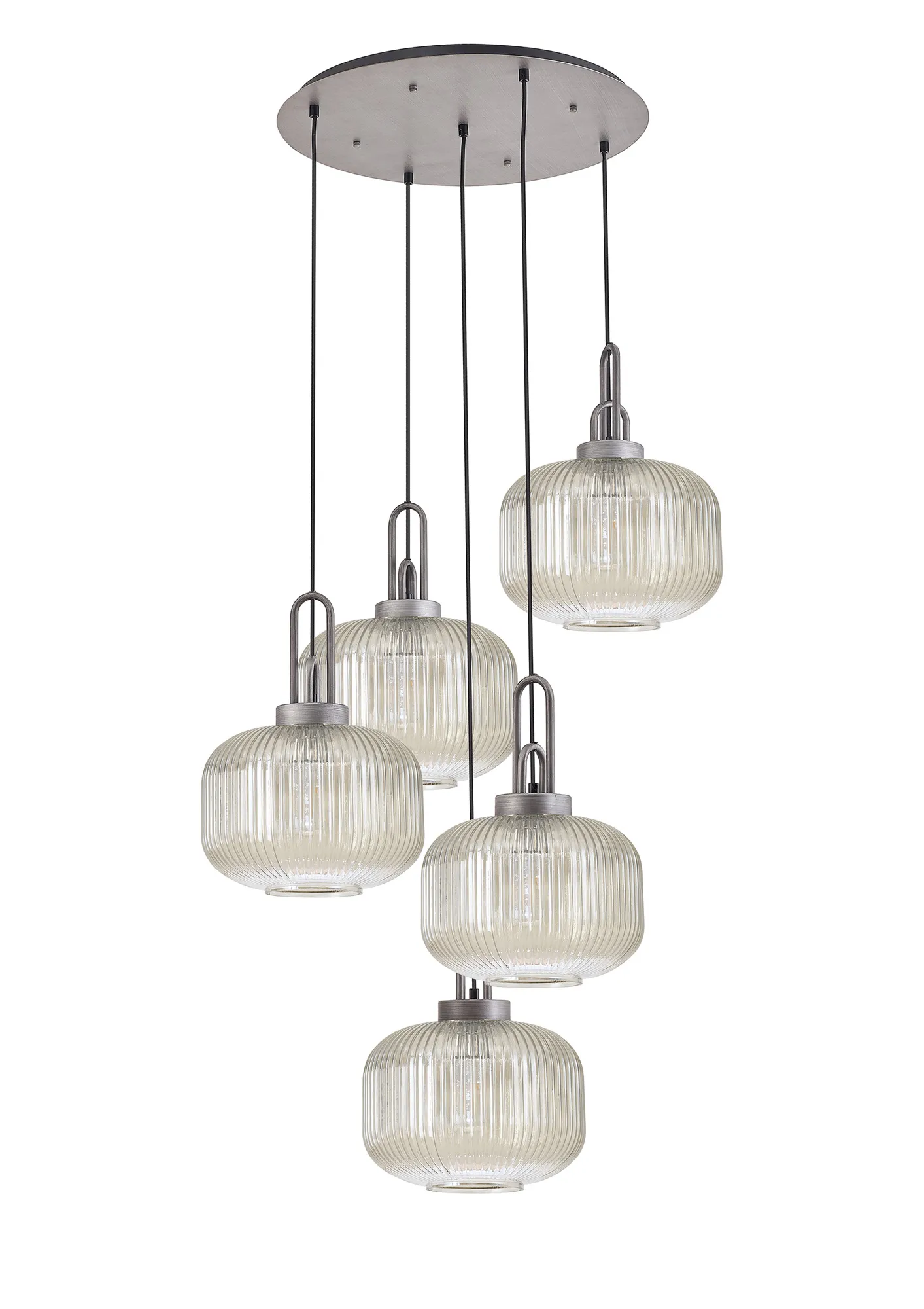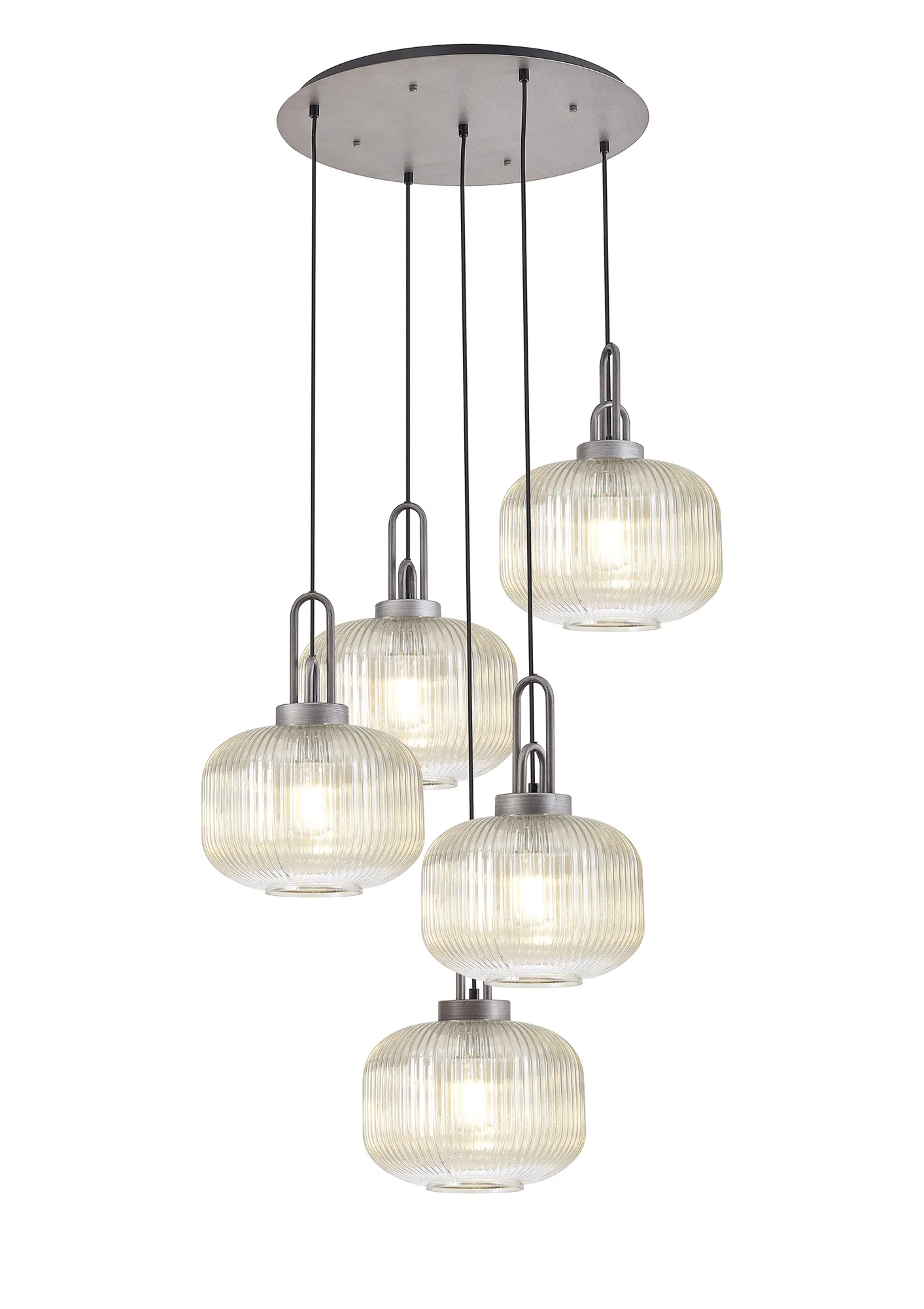 Kirby Linear Pendant, 4 x E27, Aged Pewter/Matt Black With 30cm Pumpkin Shaped Ribbed Champagne Glass