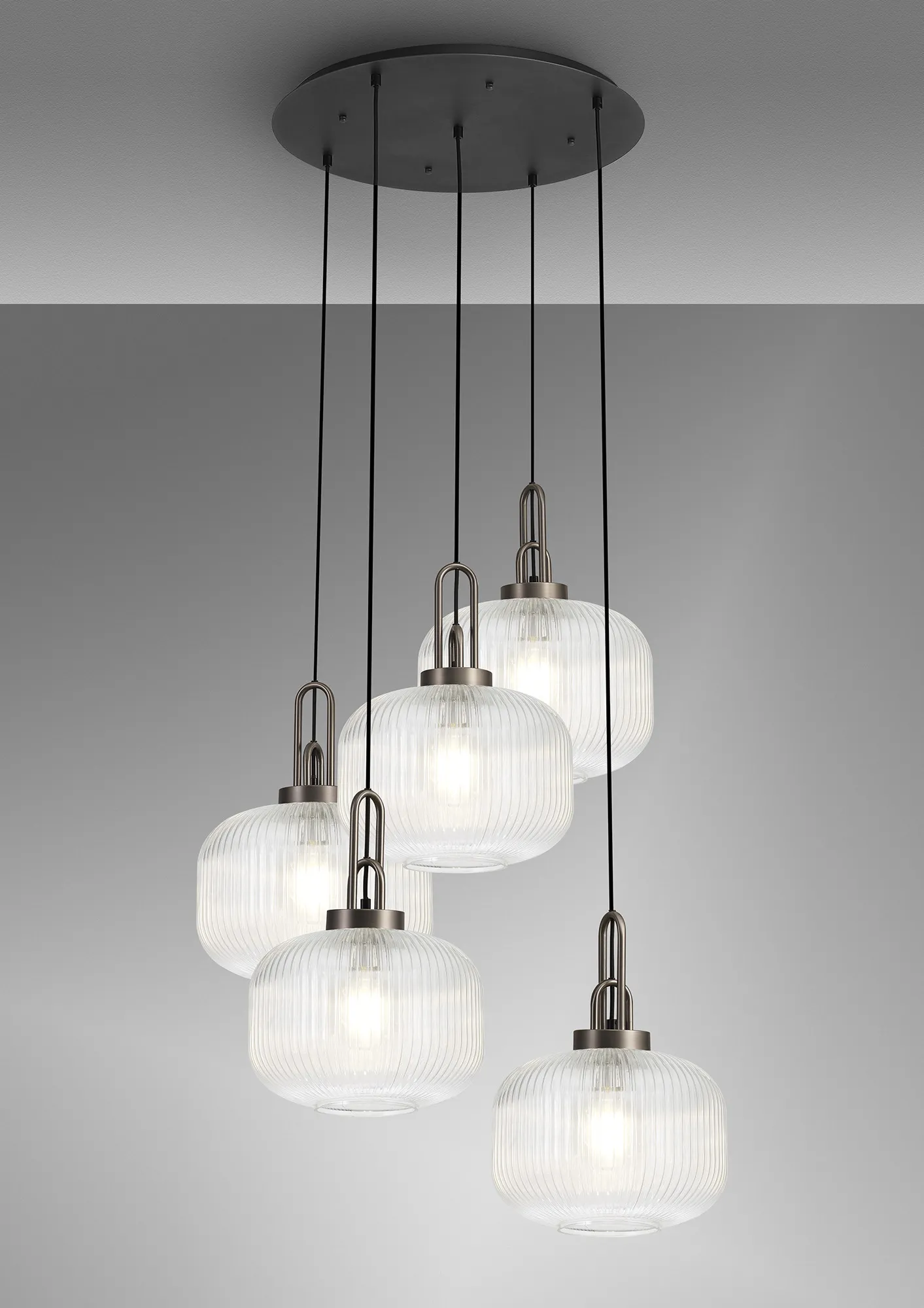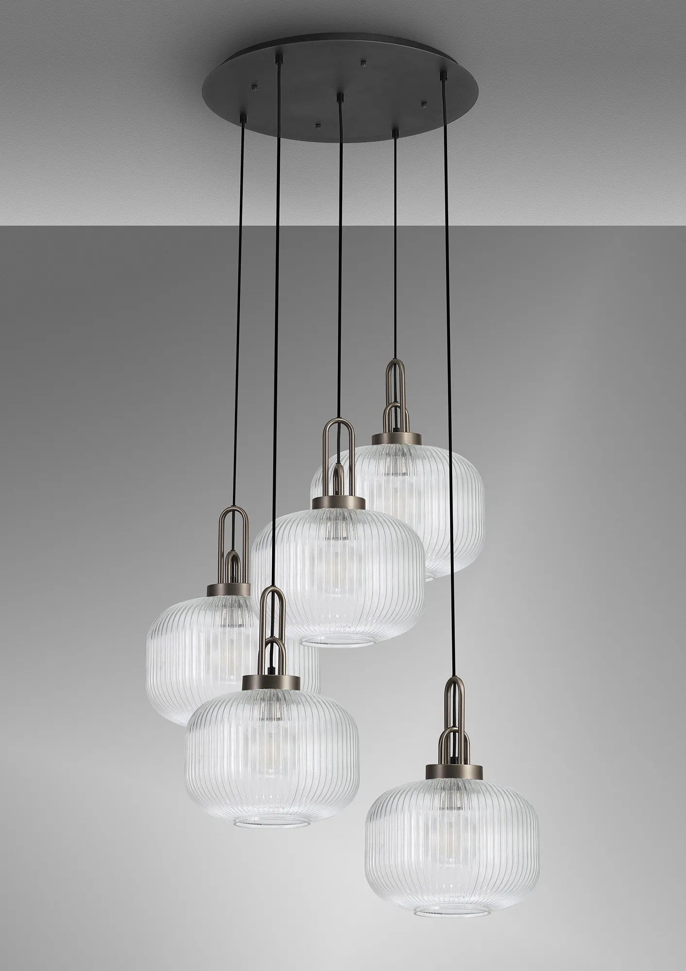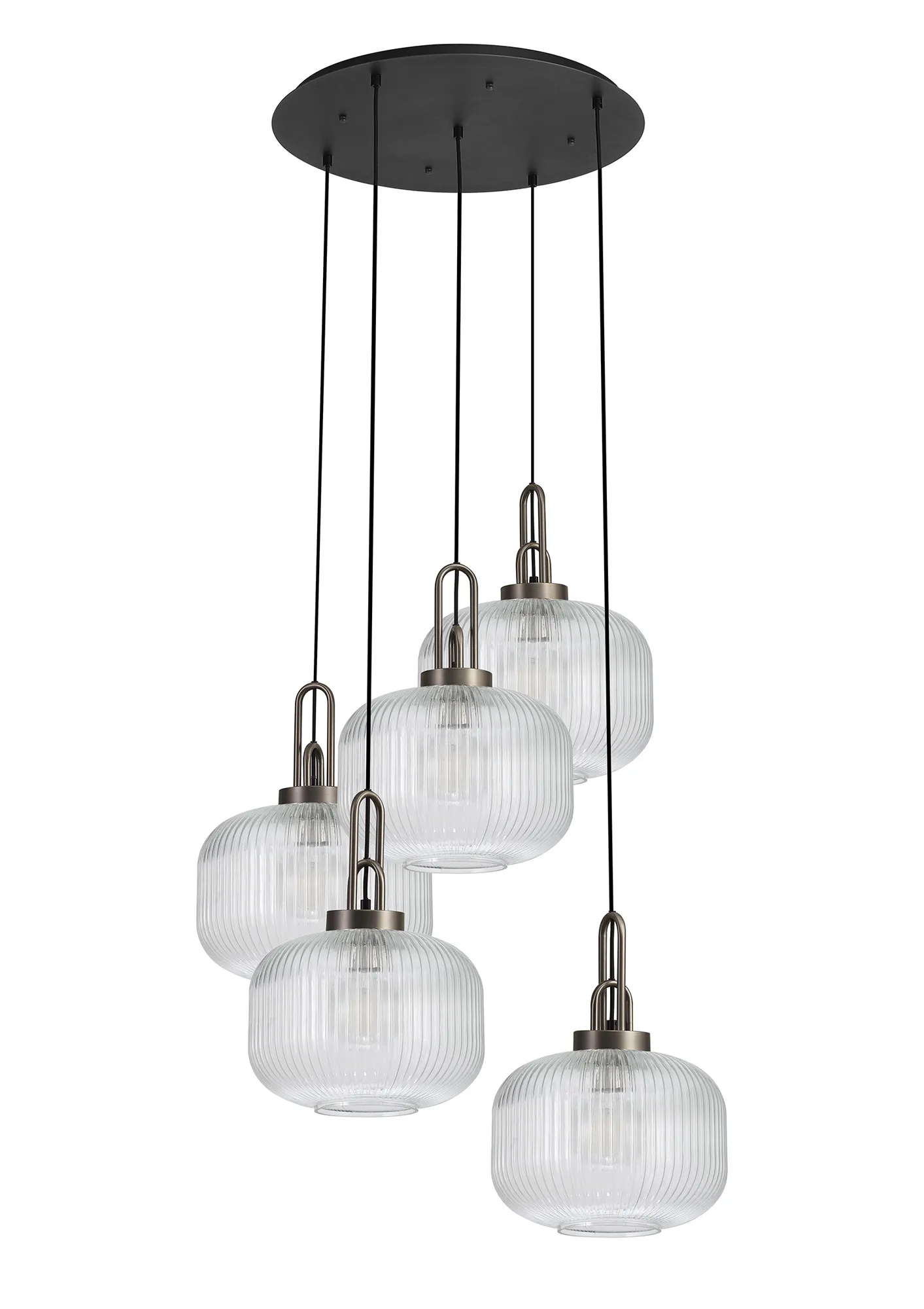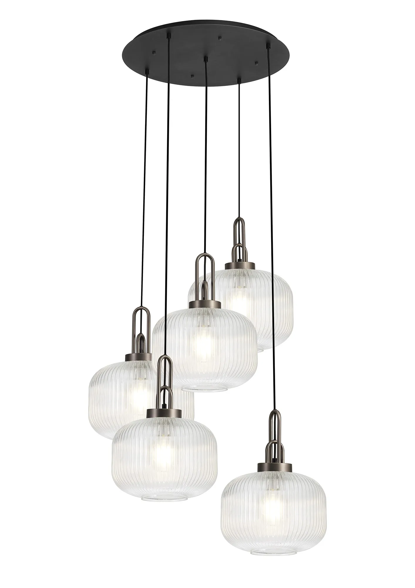 Kirby 2m Round Pendant, 3 x E27, Antique Silver/Matt Black With 30cm Pumpkin Shaped Ribbed Clear Glass