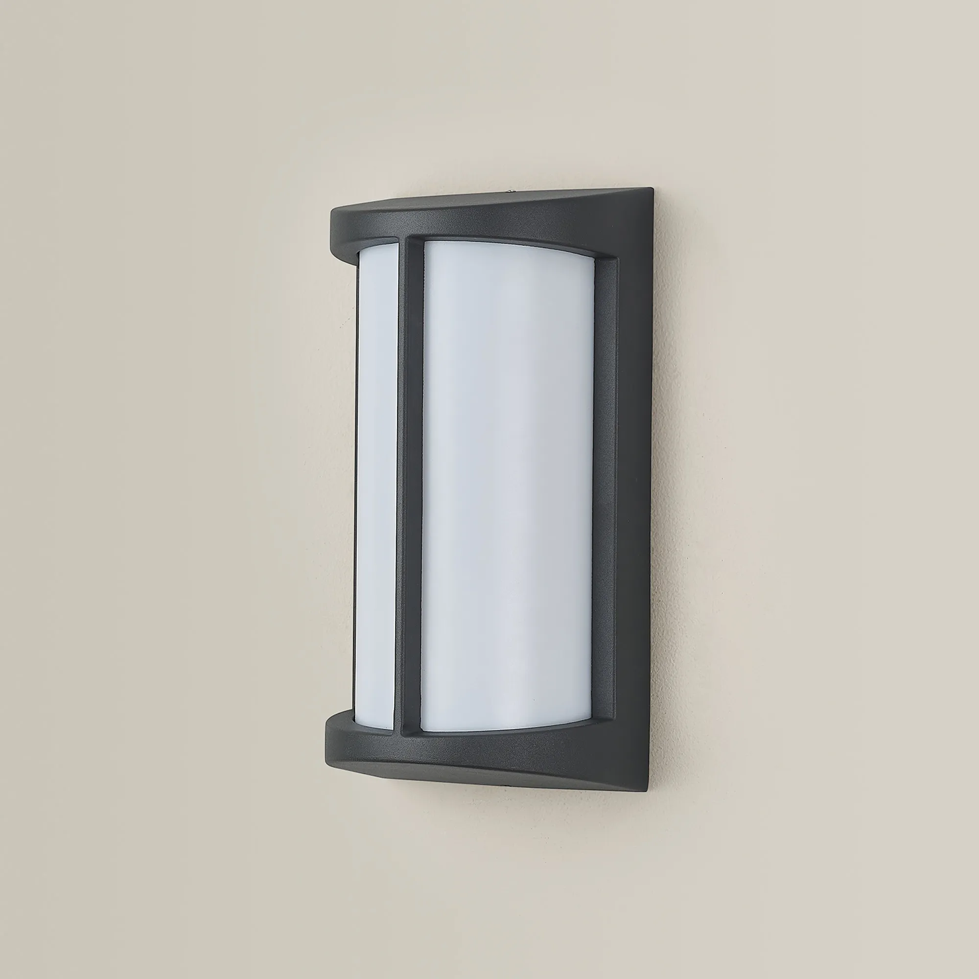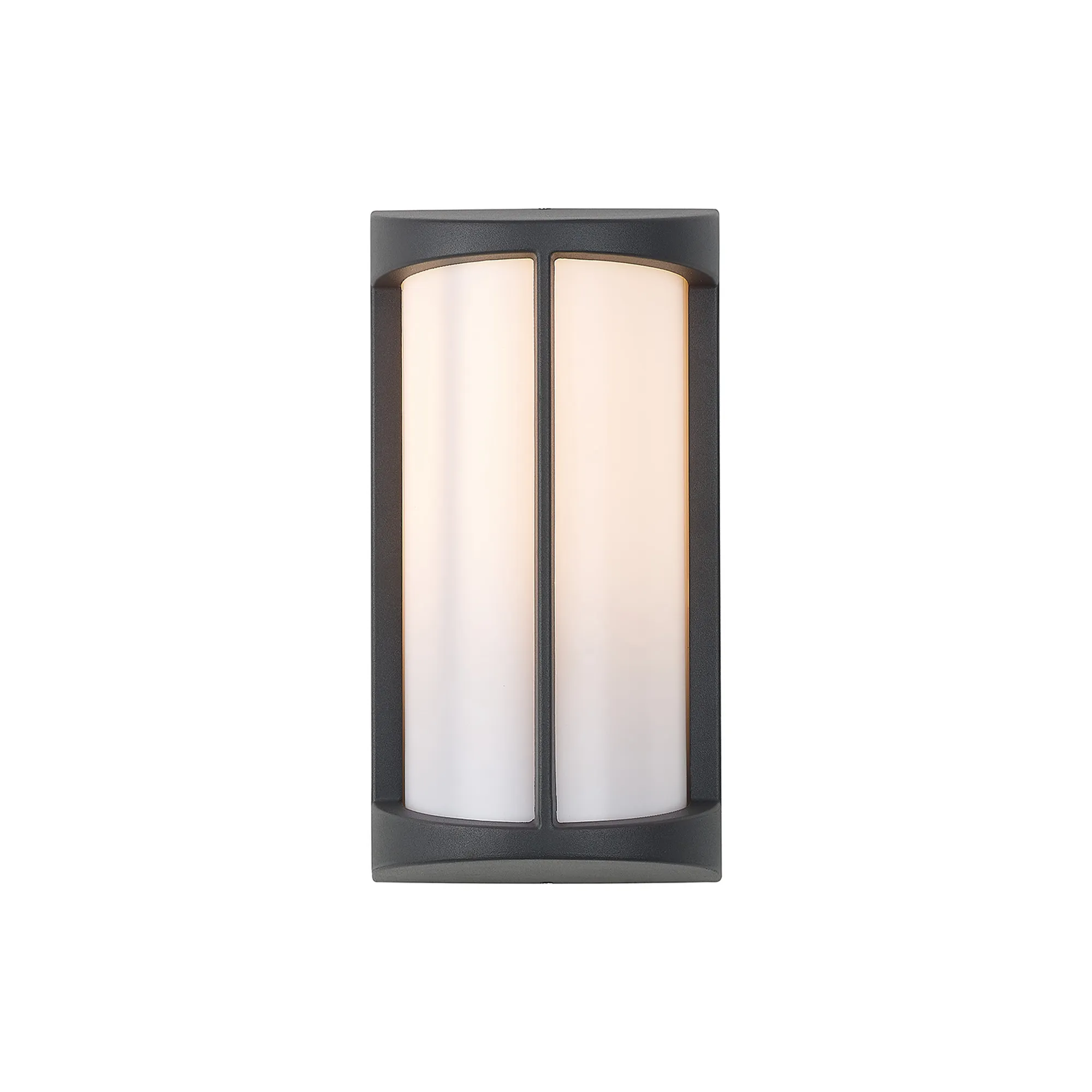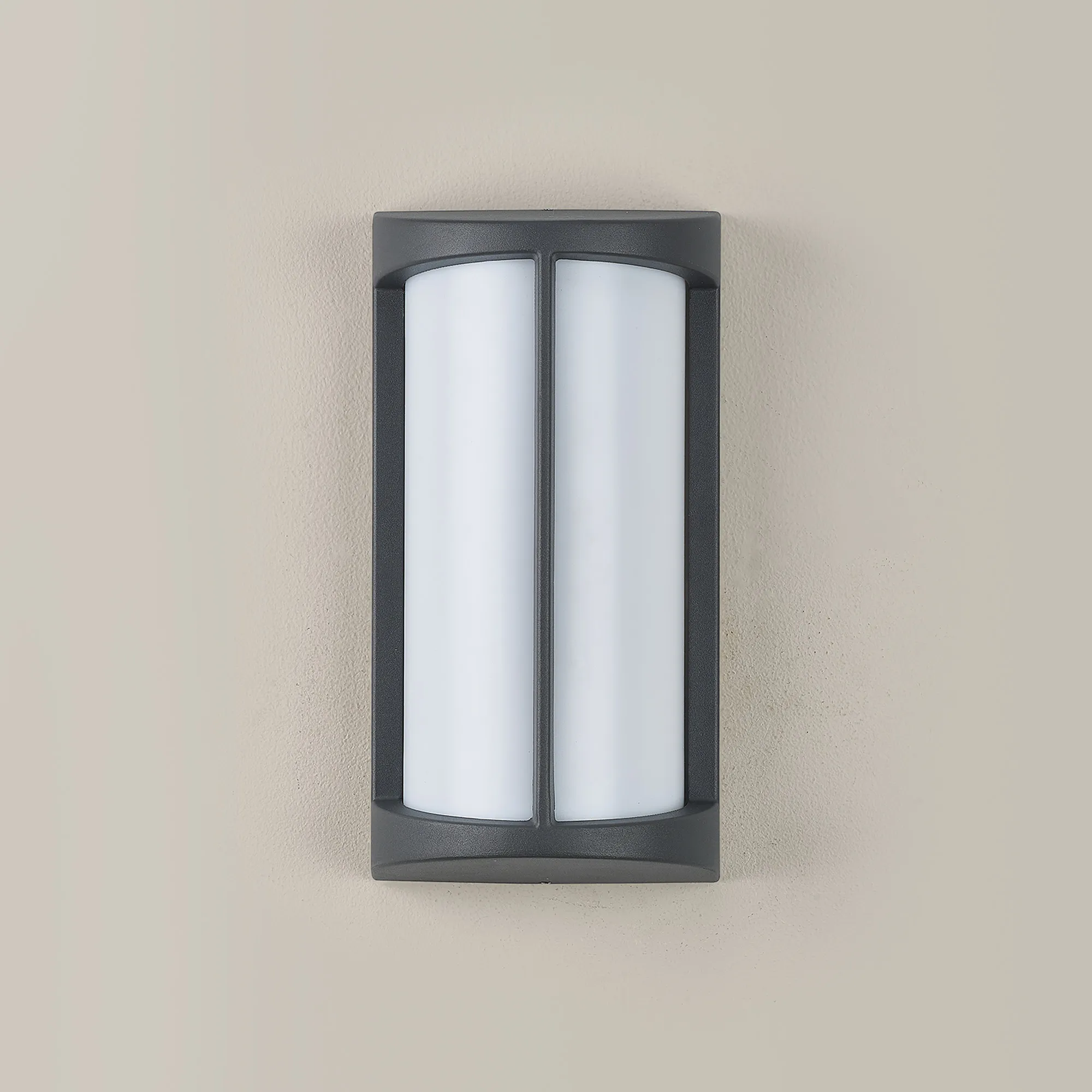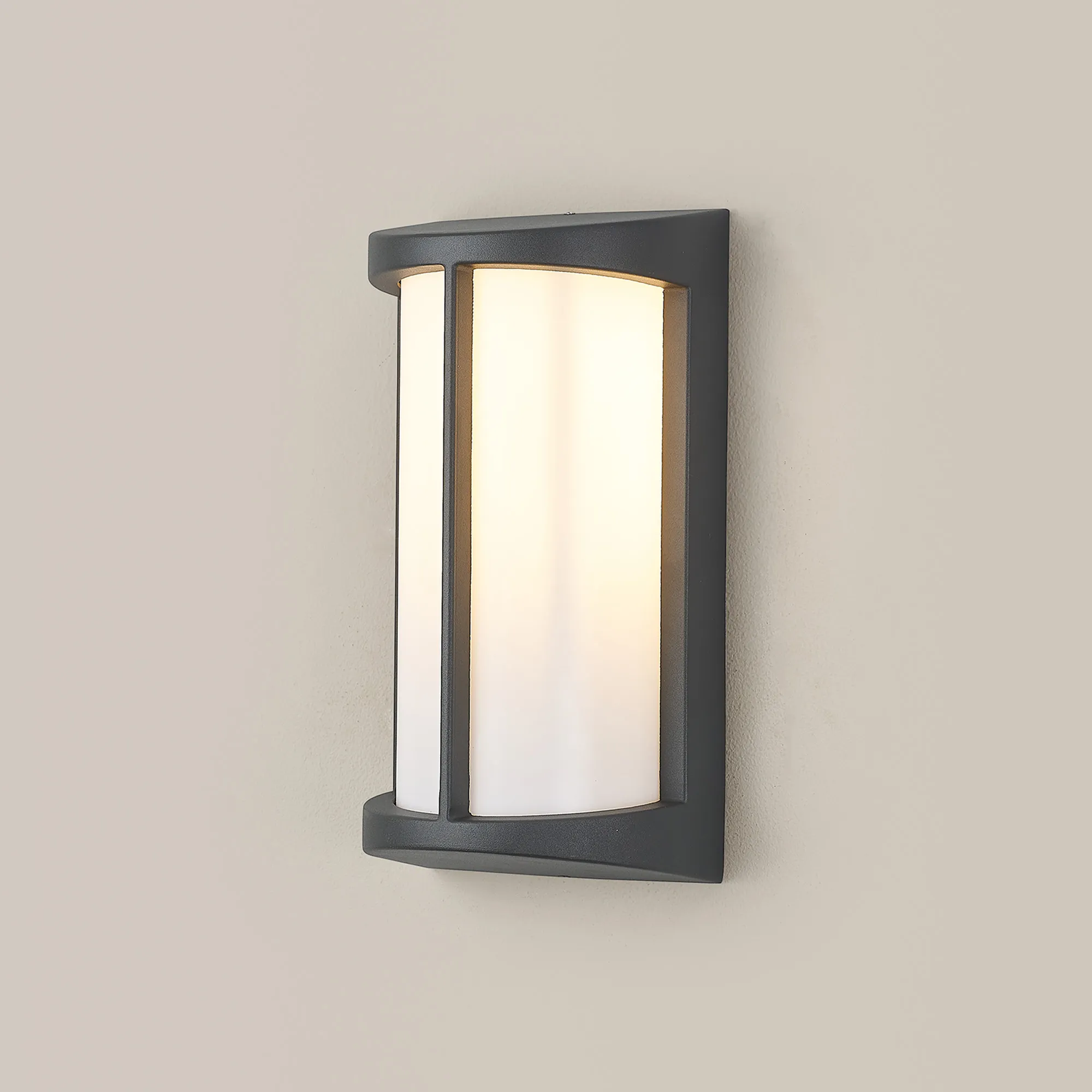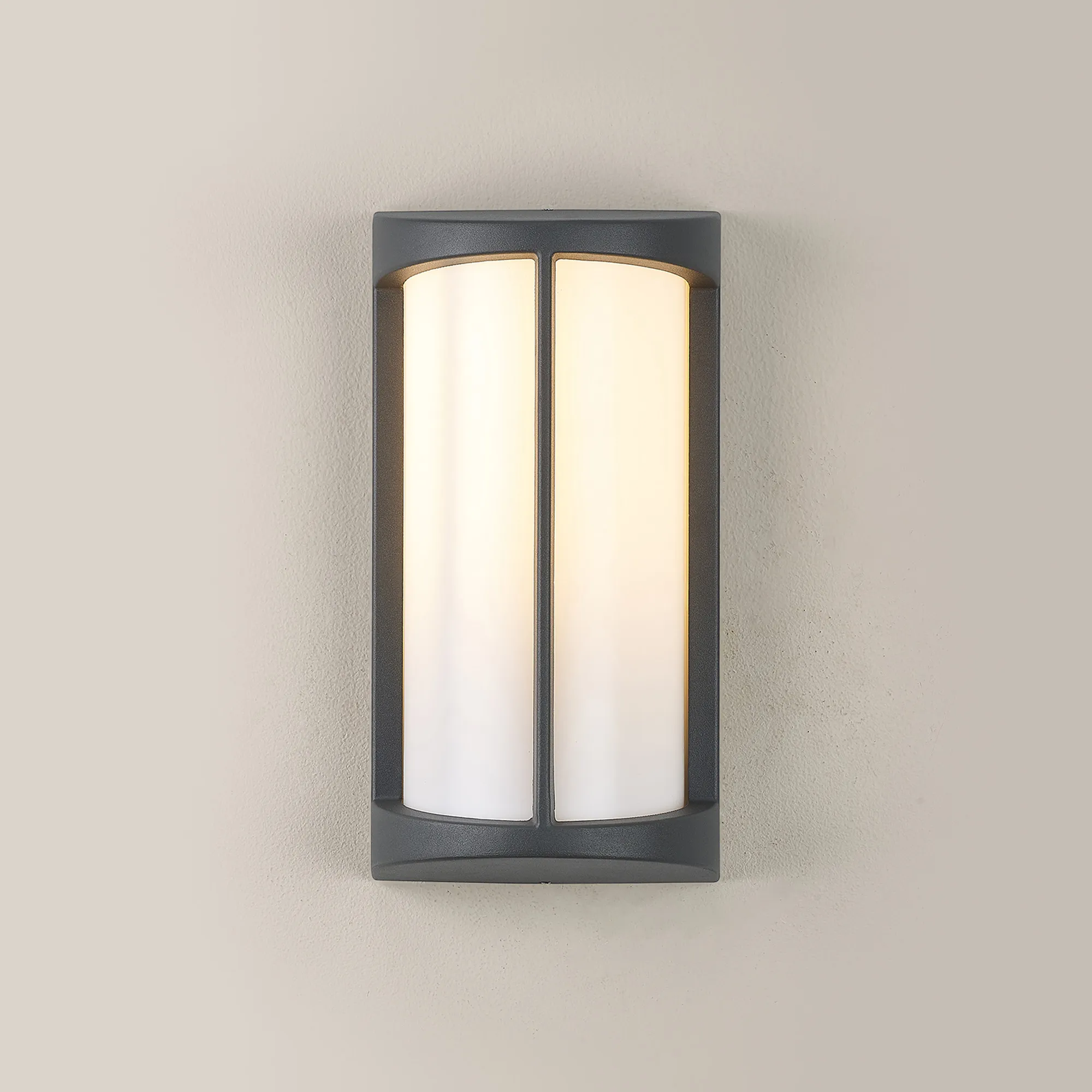 Beaumont is a stylish IP54 wall light ideal for outdoor use, even in bathrooms. The cylindrical opal diffuser sits flush against the elongated metal framework in which sits the E27 lamp holder. Available in three colour finishes; dark brown, dark grey or matt silver, a slim strip of the frame runs down the centre of the opal cover. This simple yet effective design creates a visually attractive piece.