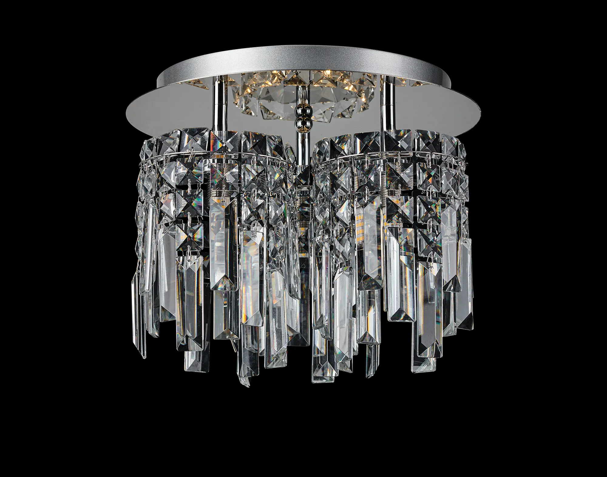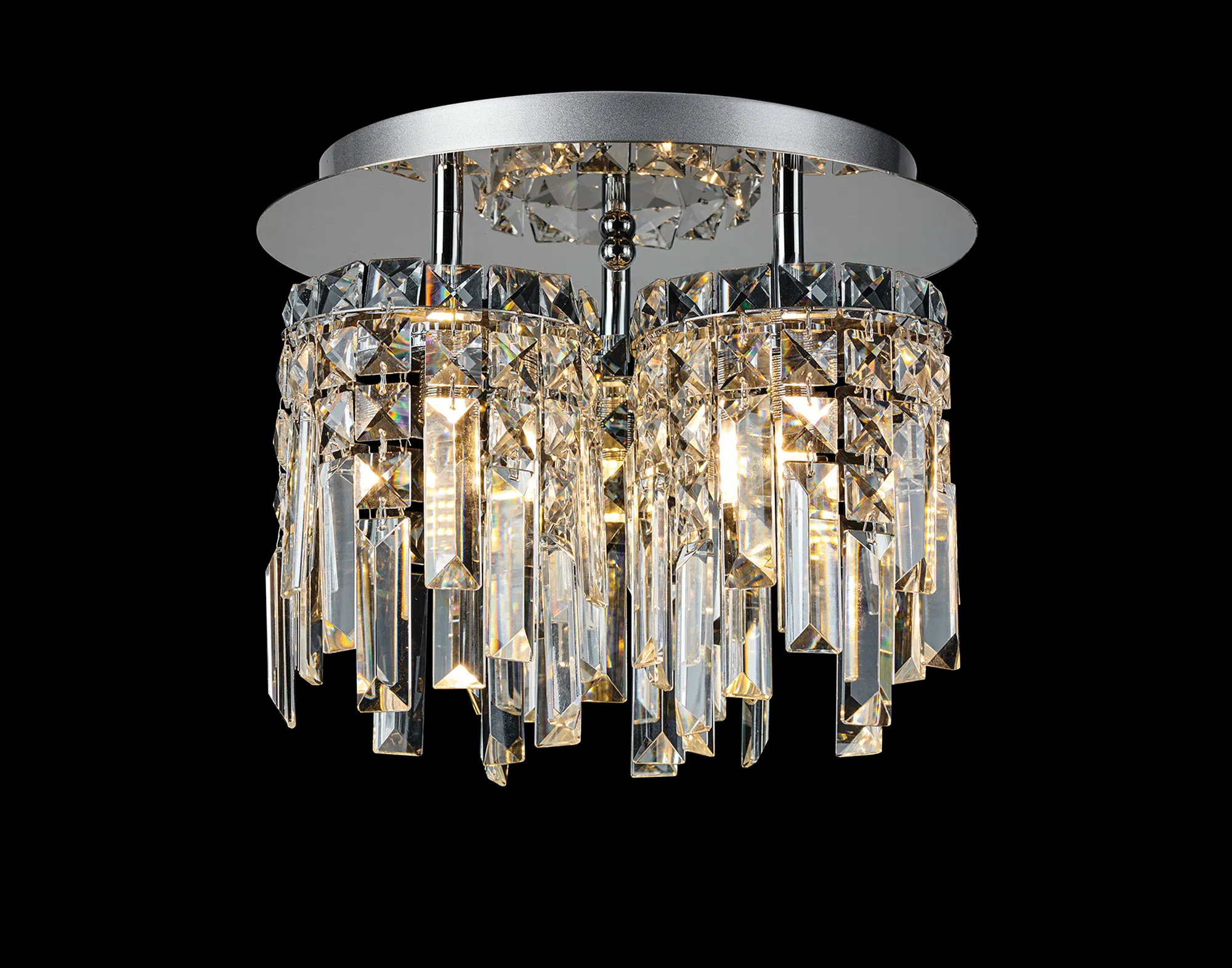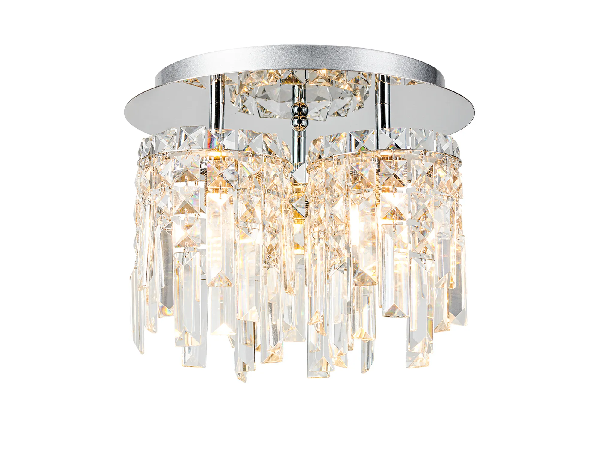Chestmere is a collection of stunning lighting fixtures utilising square and rectangular crystals. Numerous strands of crystal are hung in a systematic manner to deliver an outstanding effect in partnership with the polished chrome framework. All ceiling and pendant lights in this range are IP44 rated along with the complementing wall lamp offering a dazzling option for bathrooms.