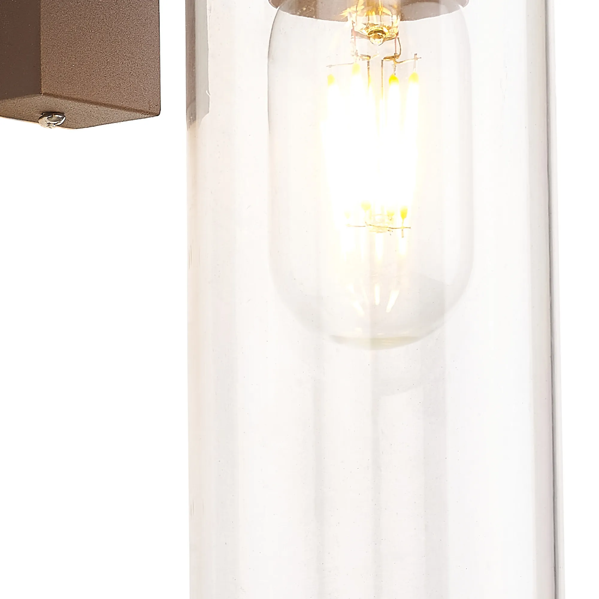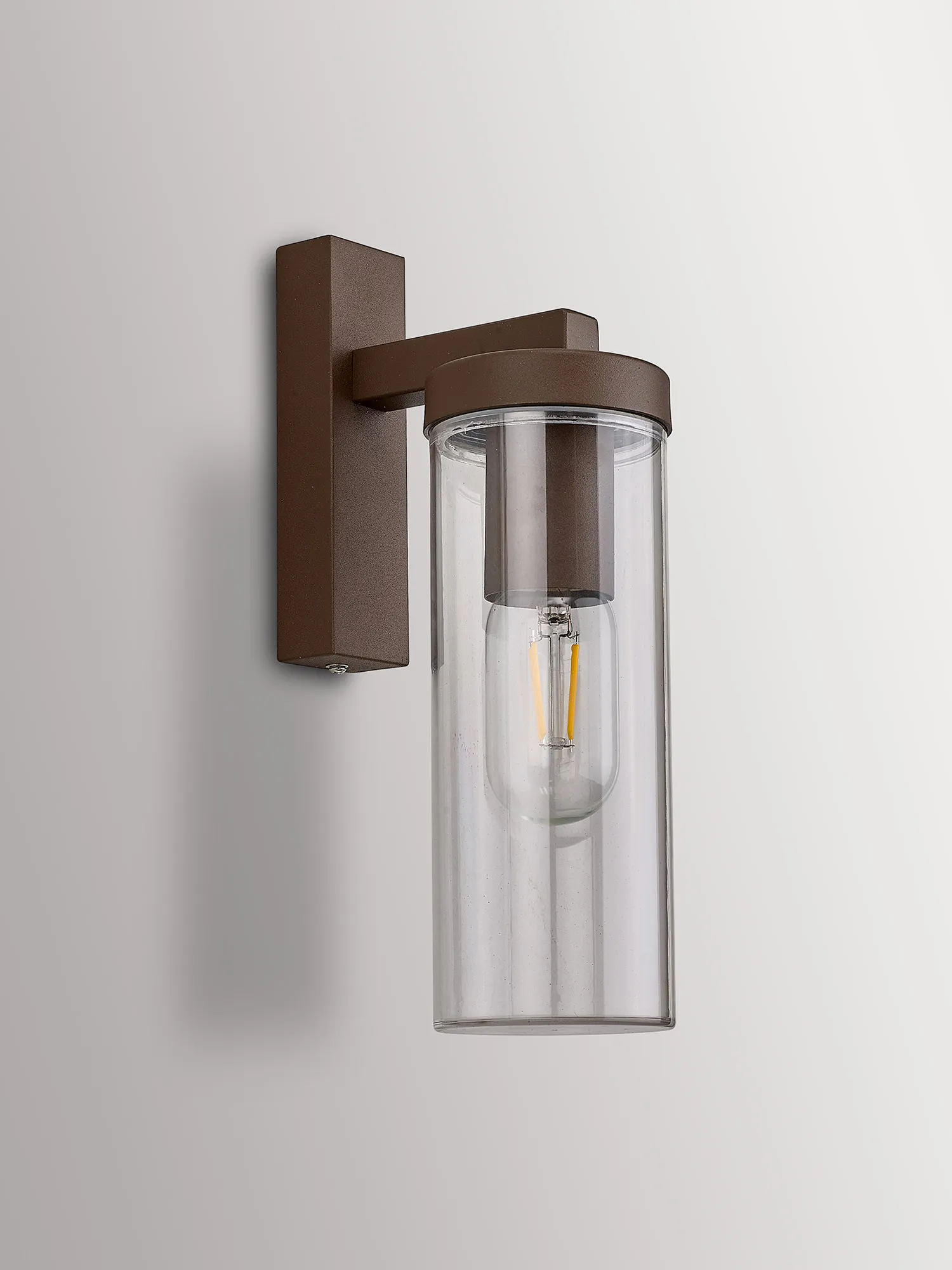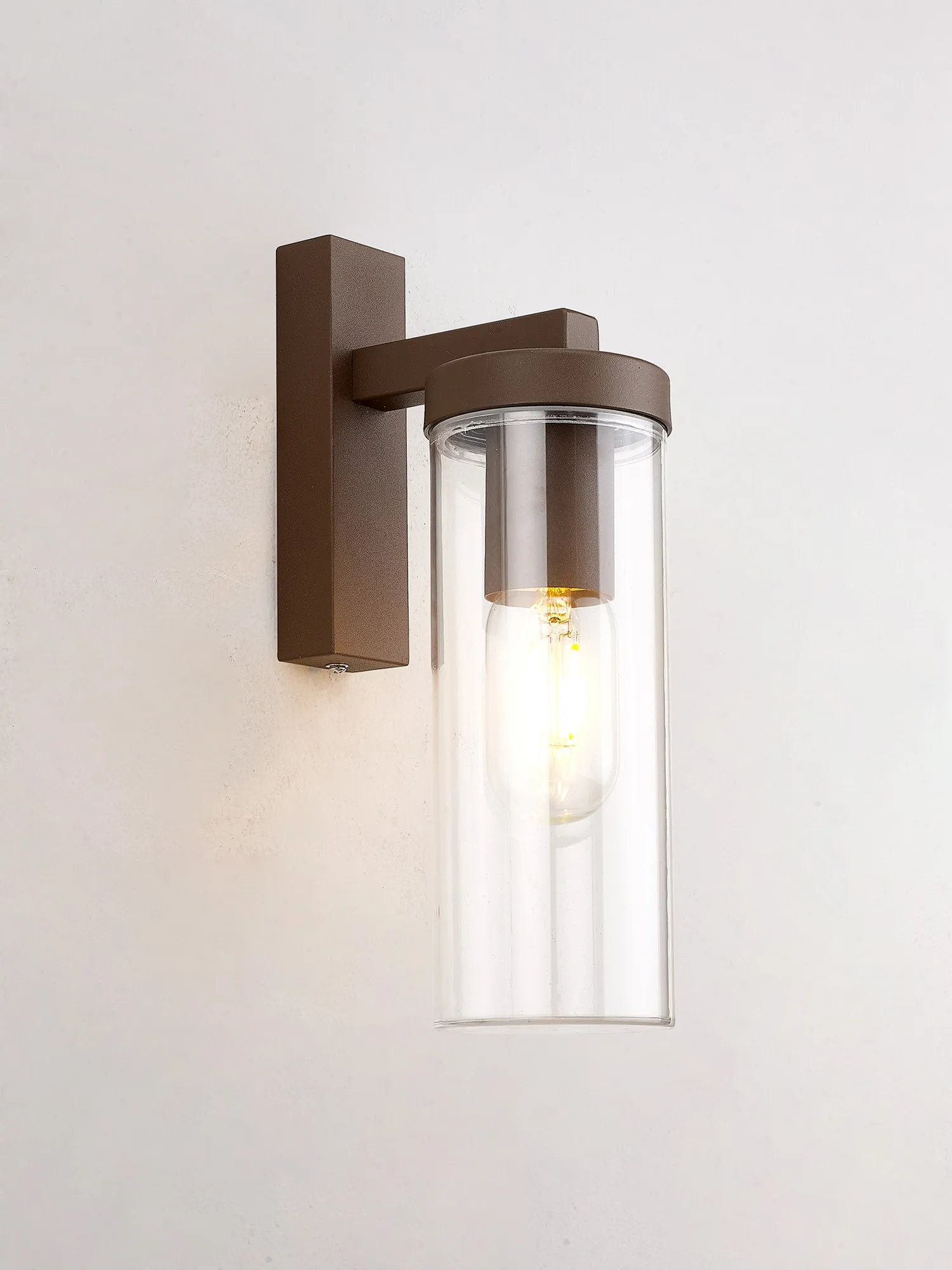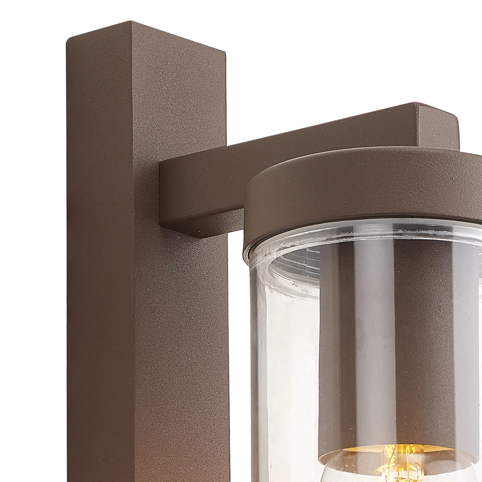 This IP54 rated wall light is suitable for bathrooms and outdoor areas. The block format of the framework provides an attractive yet functional design for an outdoor fixture. Available in two colour finishes; dark brown or dark grey, the E27 lamp holder is housed within a clear shade.