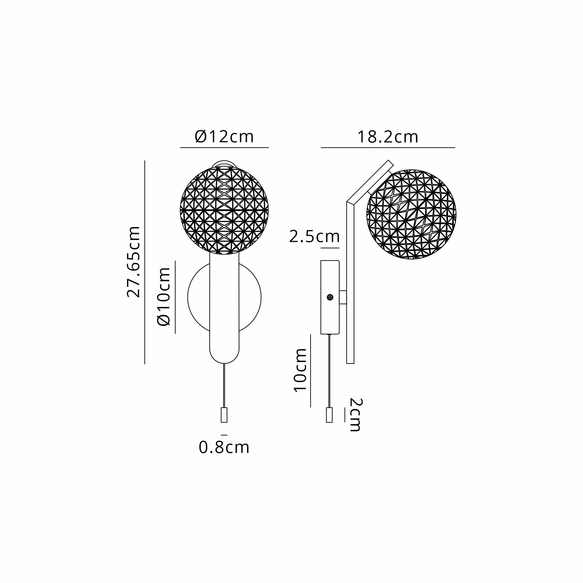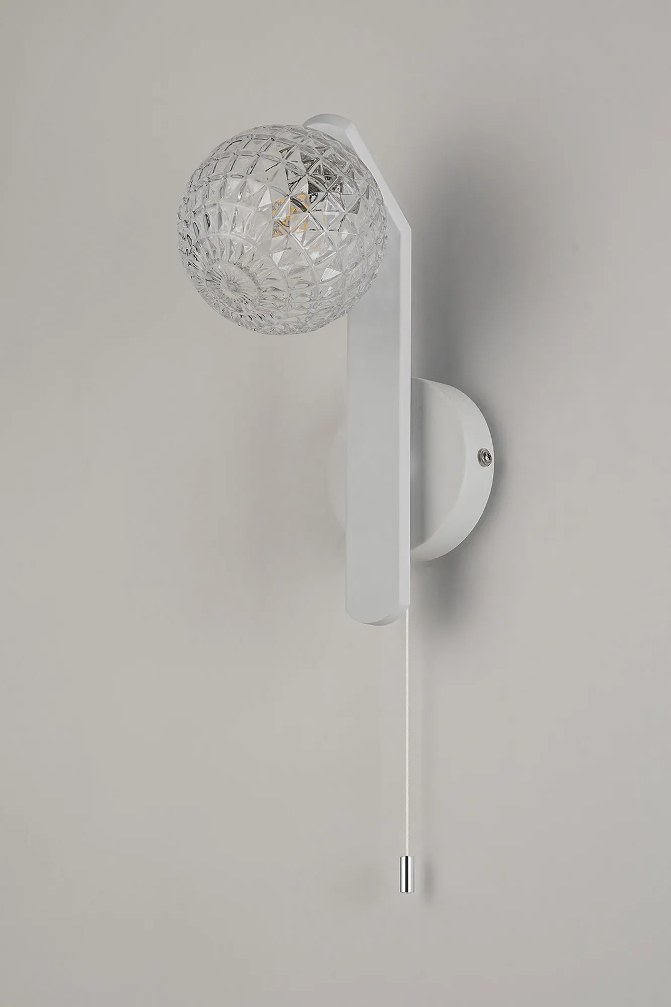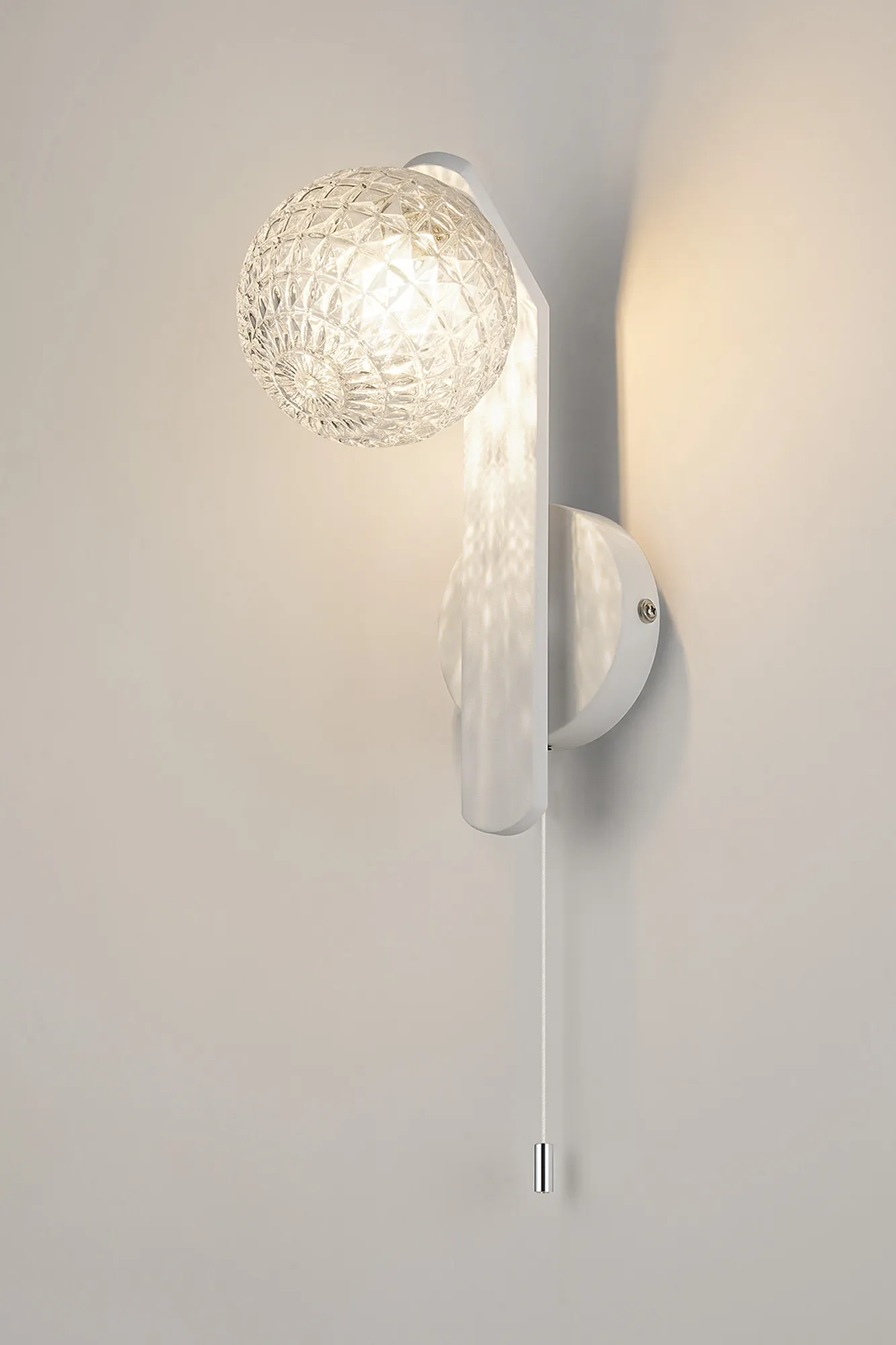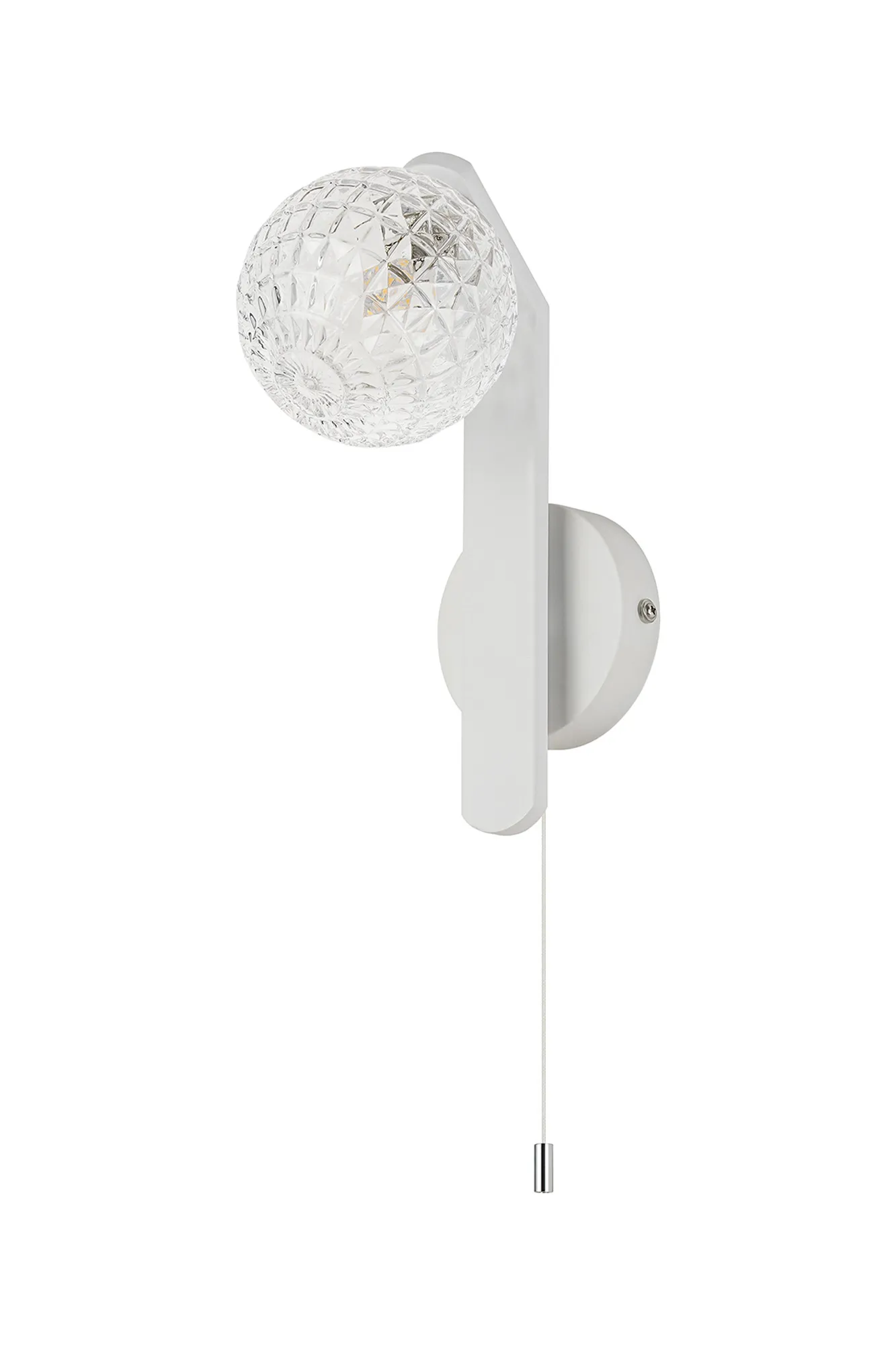 Campbell Pull Switch Wall Light, 1 x G9, IP44, White/Polished Chrome/Clear Dune Effect Round Glass