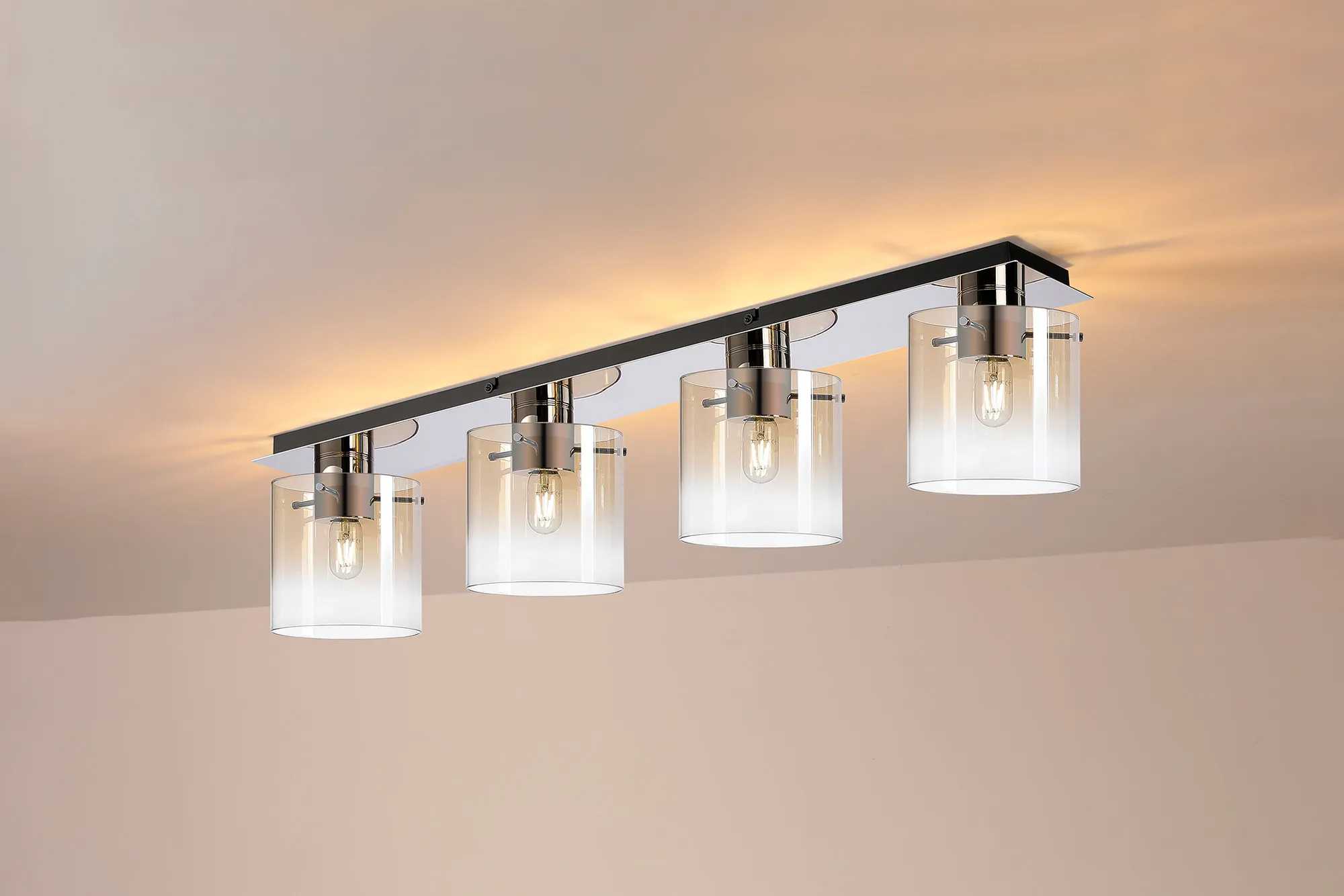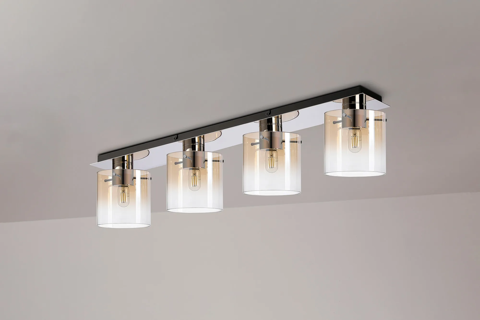 OTHER Mangere Linear Ceiling Flush, 4 Light Flush Fitting, Polished Nickel/Black/Amber Fade Glass