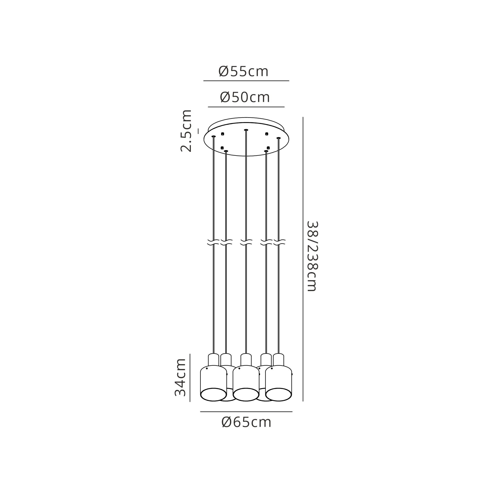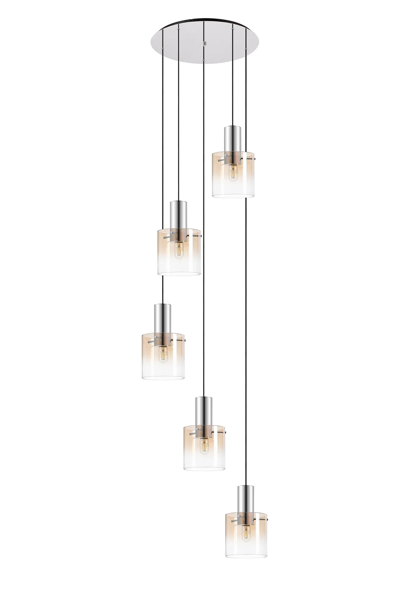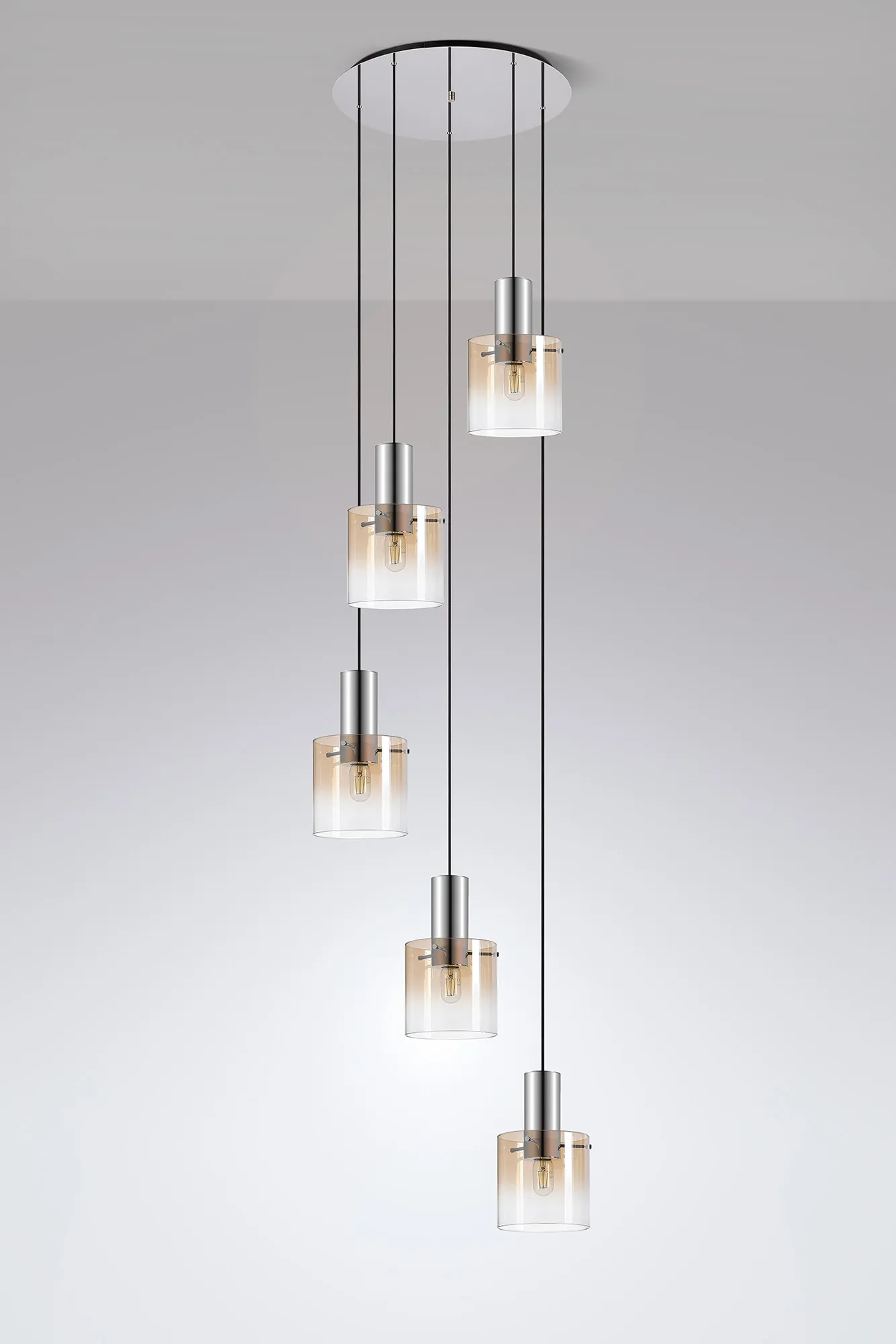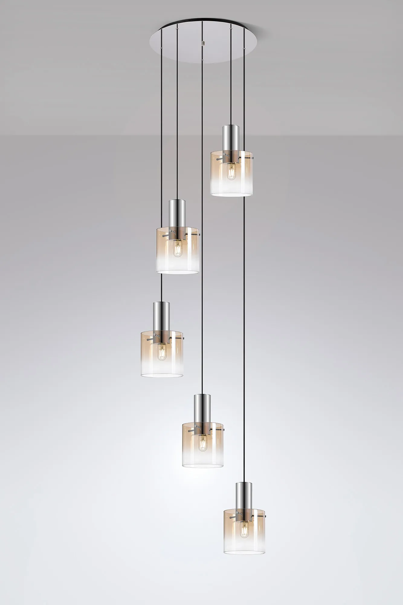 OTHER Mangere Round Pendant, 5 Light E27, Polished Nickel/Black/Amber Fade Glass