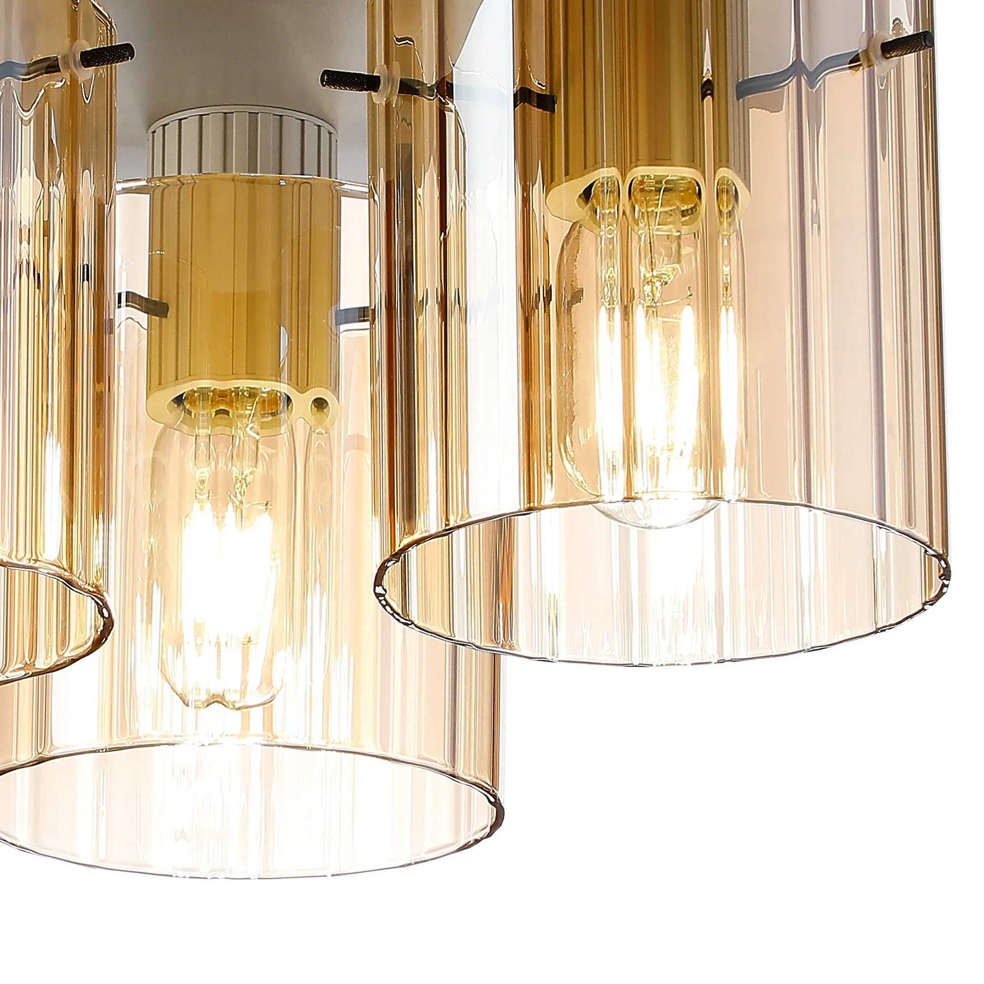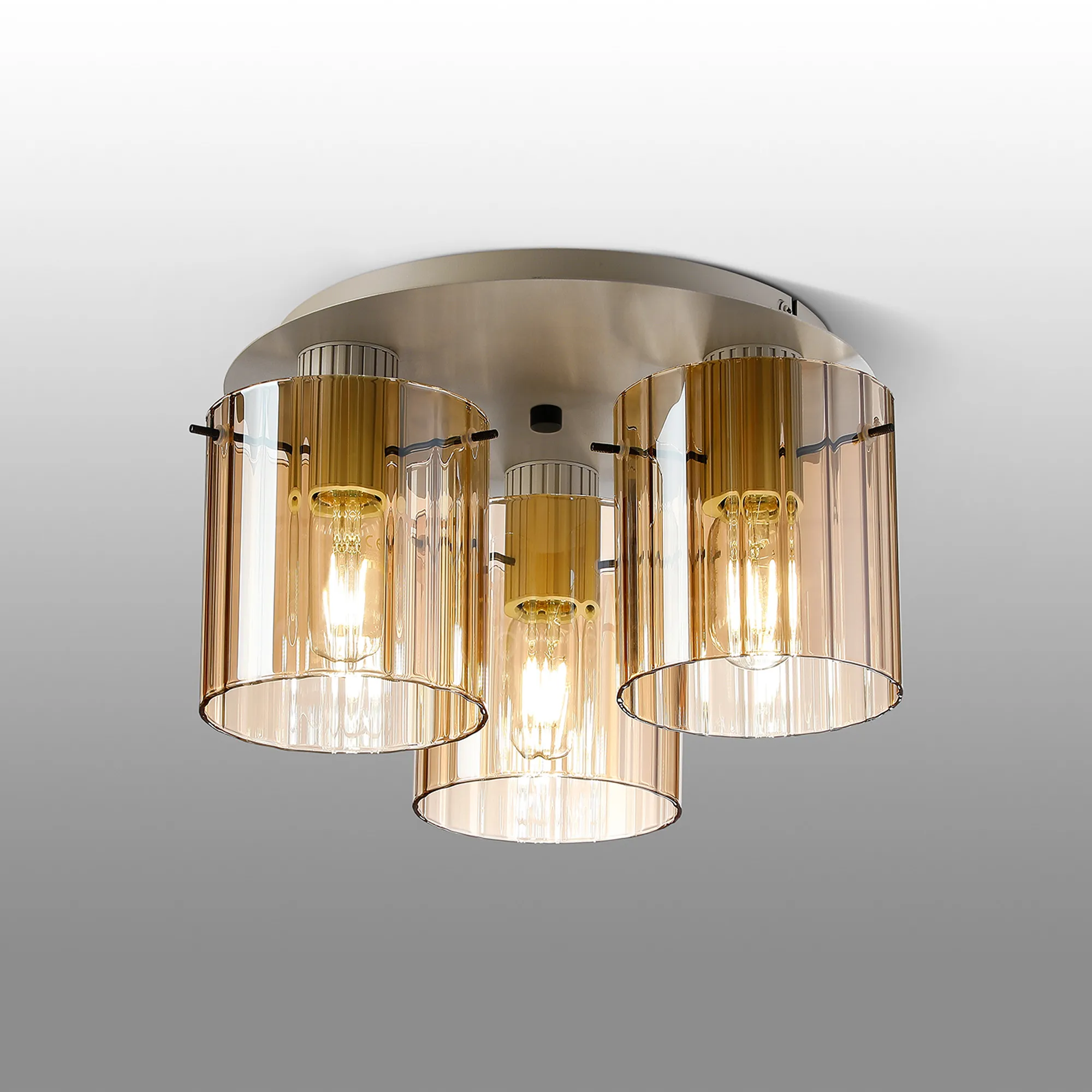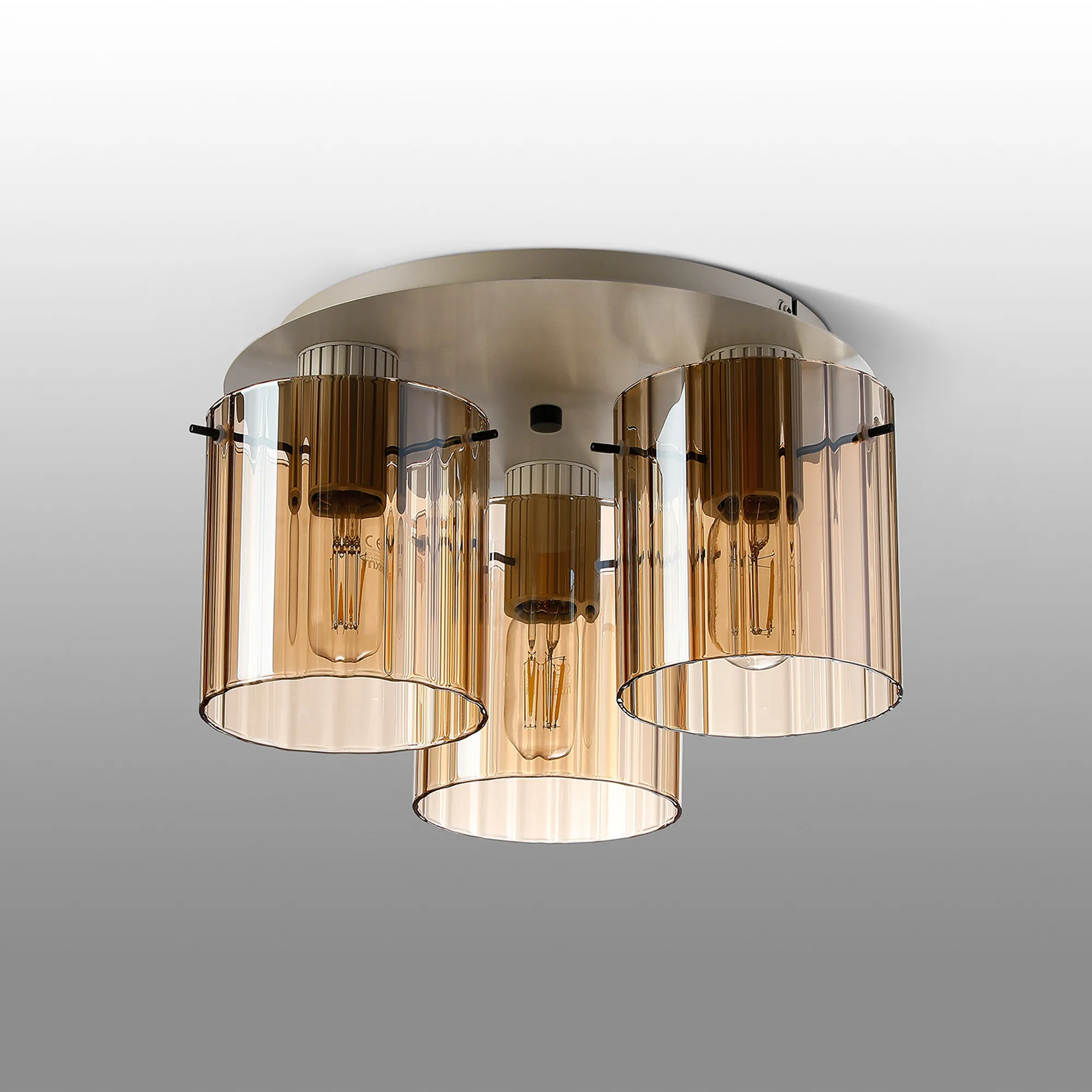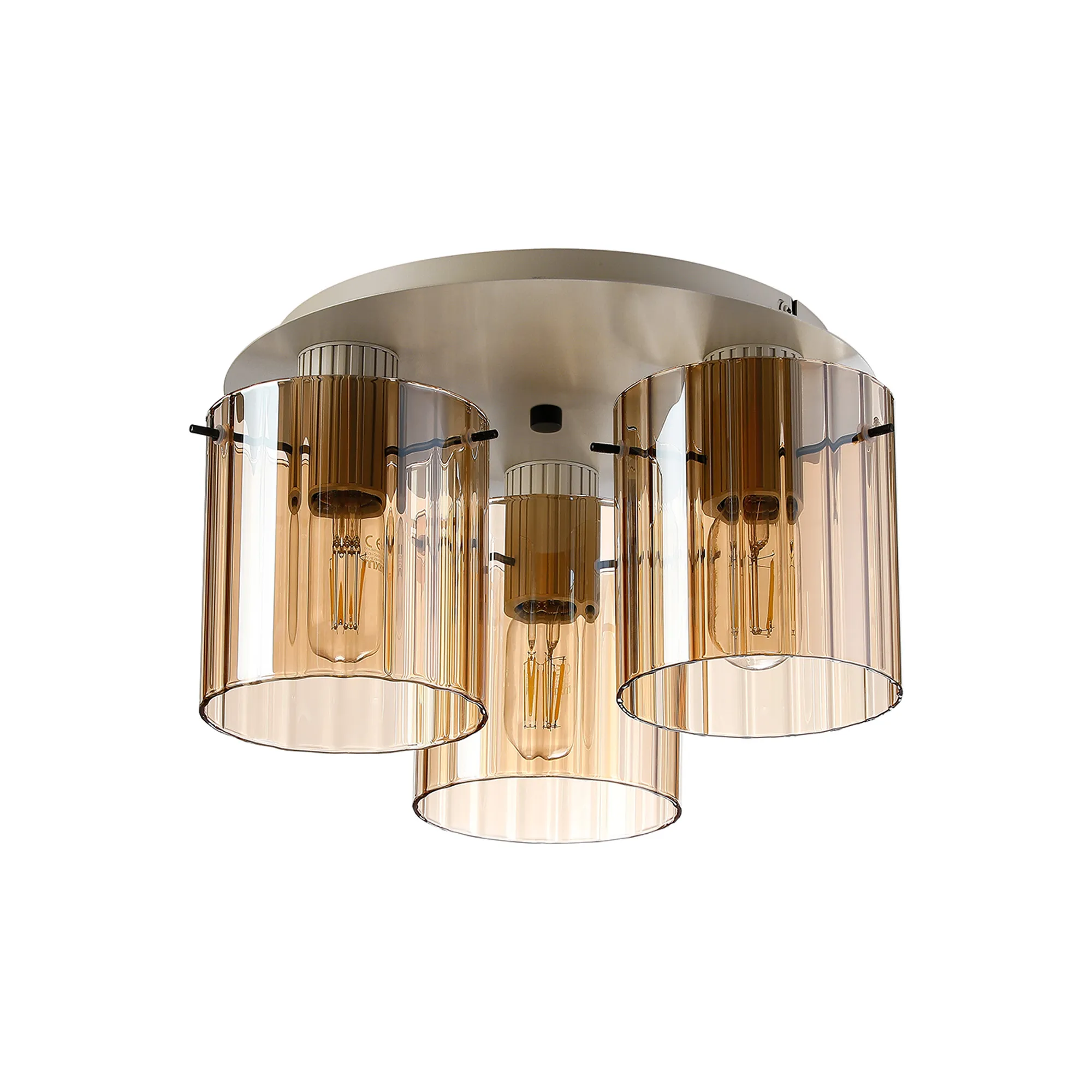 OTHER Castlegar Round Ceiling Flush, 3 Light Flush Fitting E27, Beige Stone/Amber Wide Line Glass