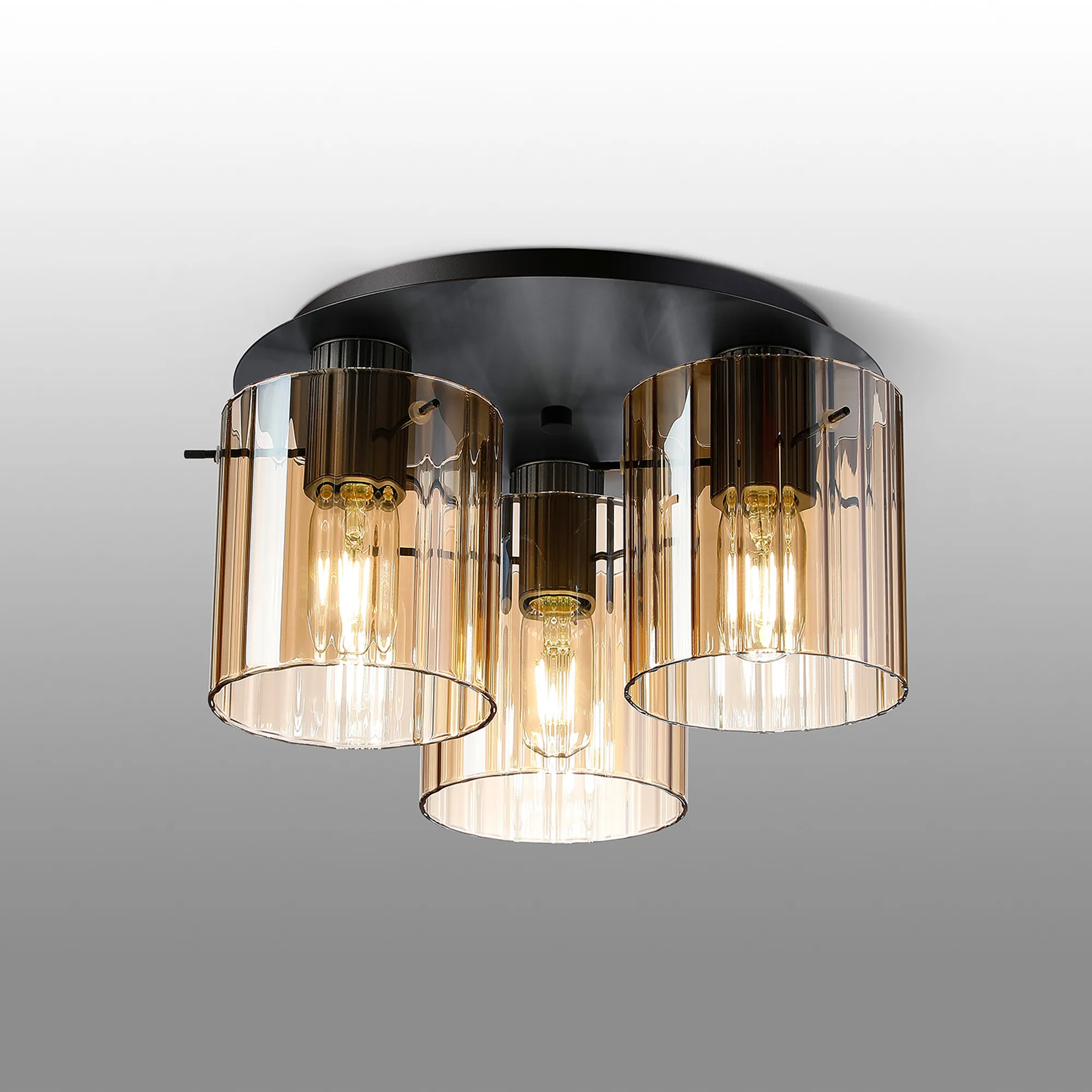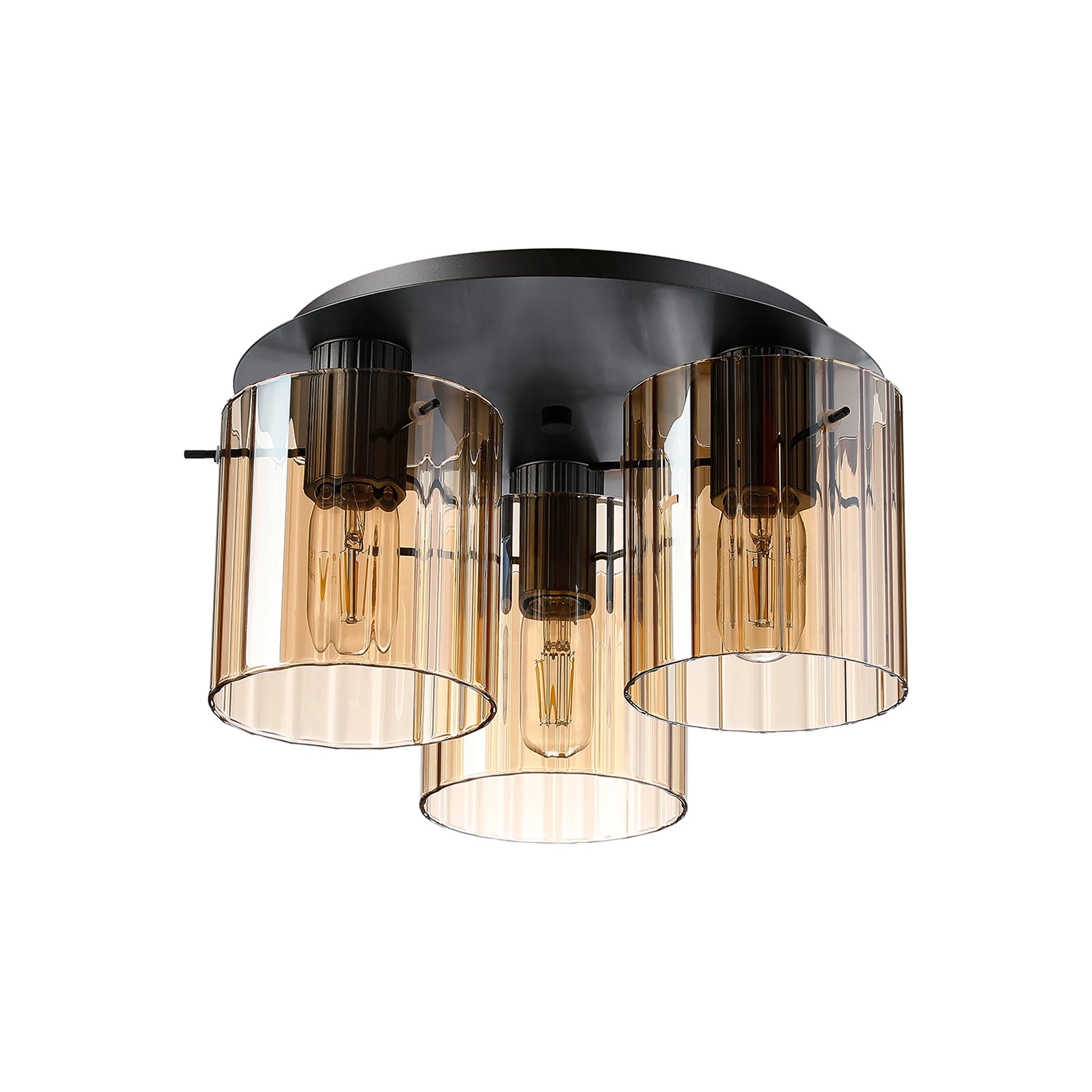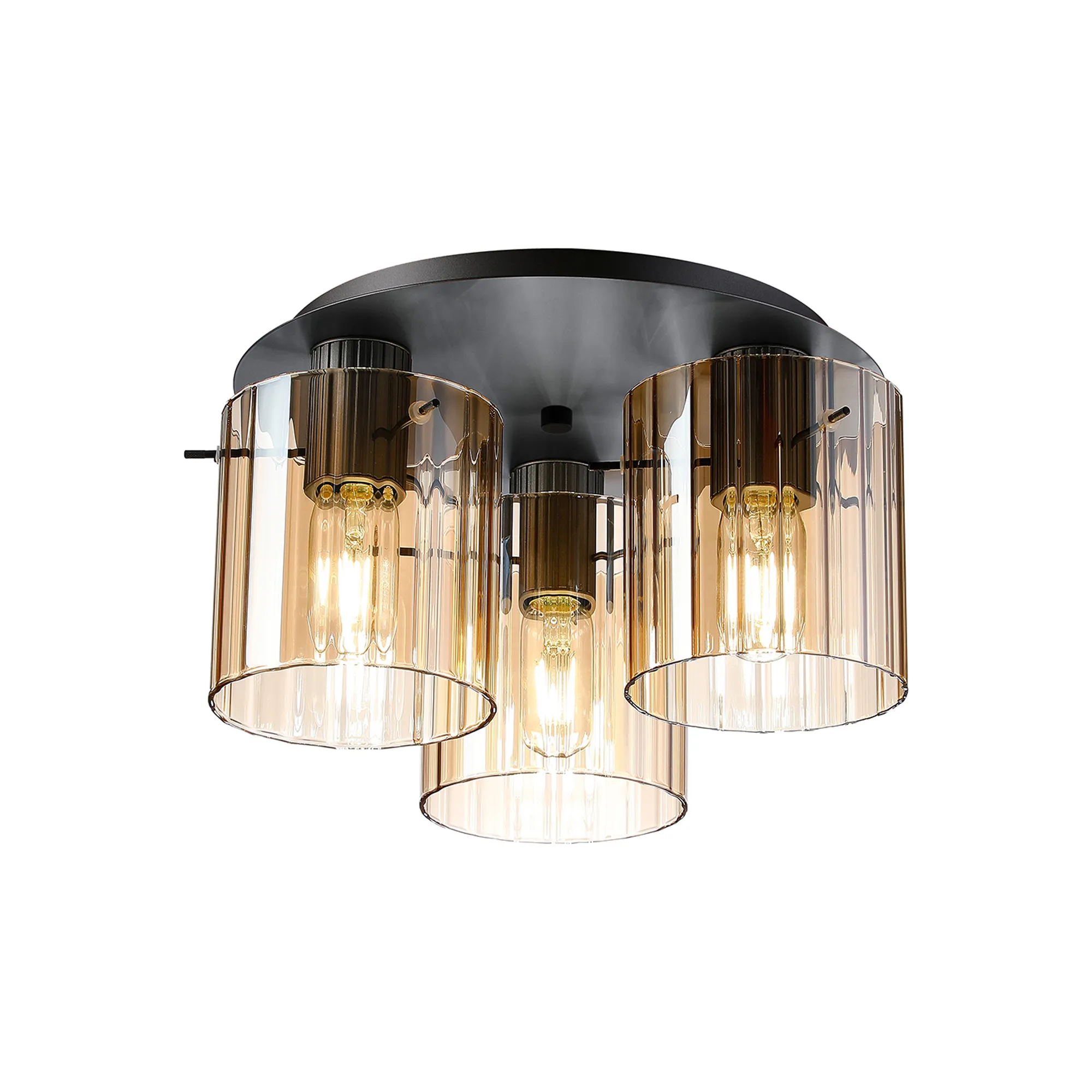OTHER Castlegar Round Ceiling Flush, 3 Light Flush Fitting E27, Dark Grey/Amber Wide Line Glass