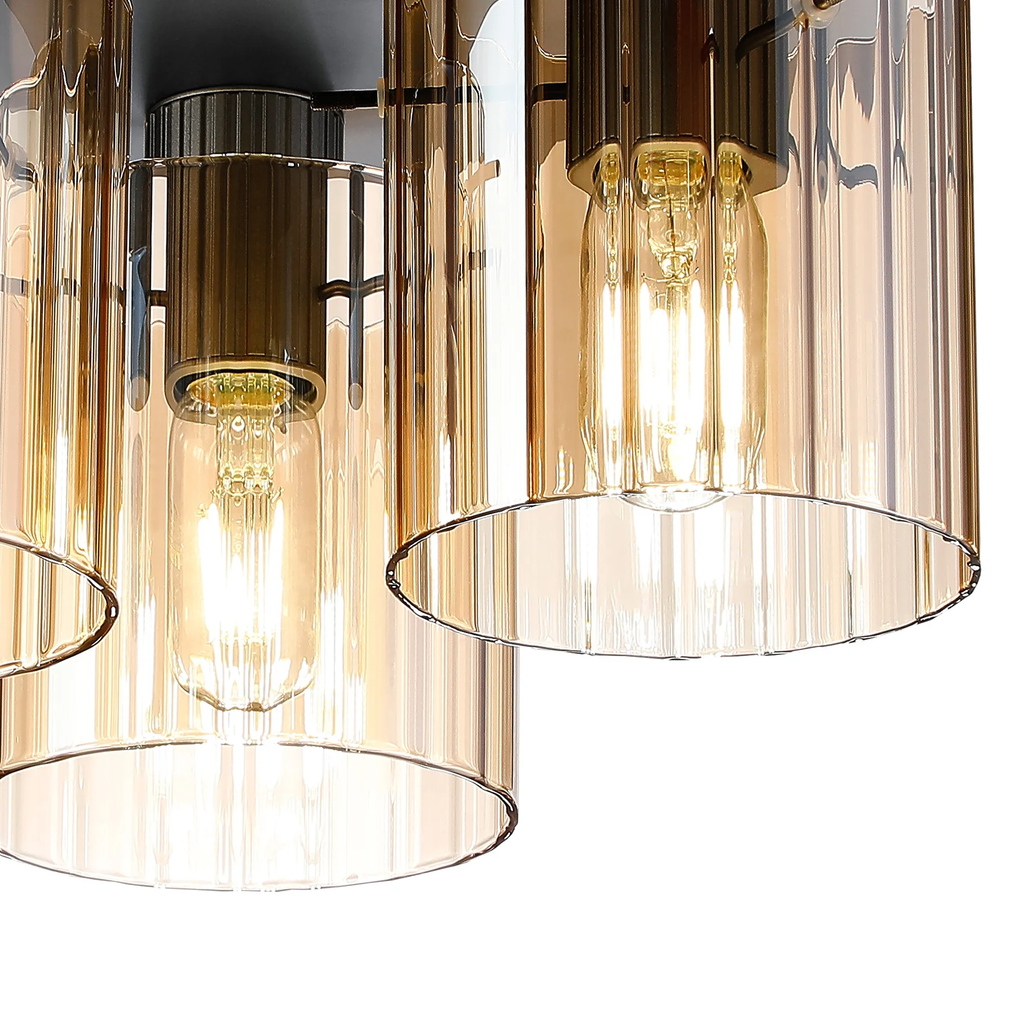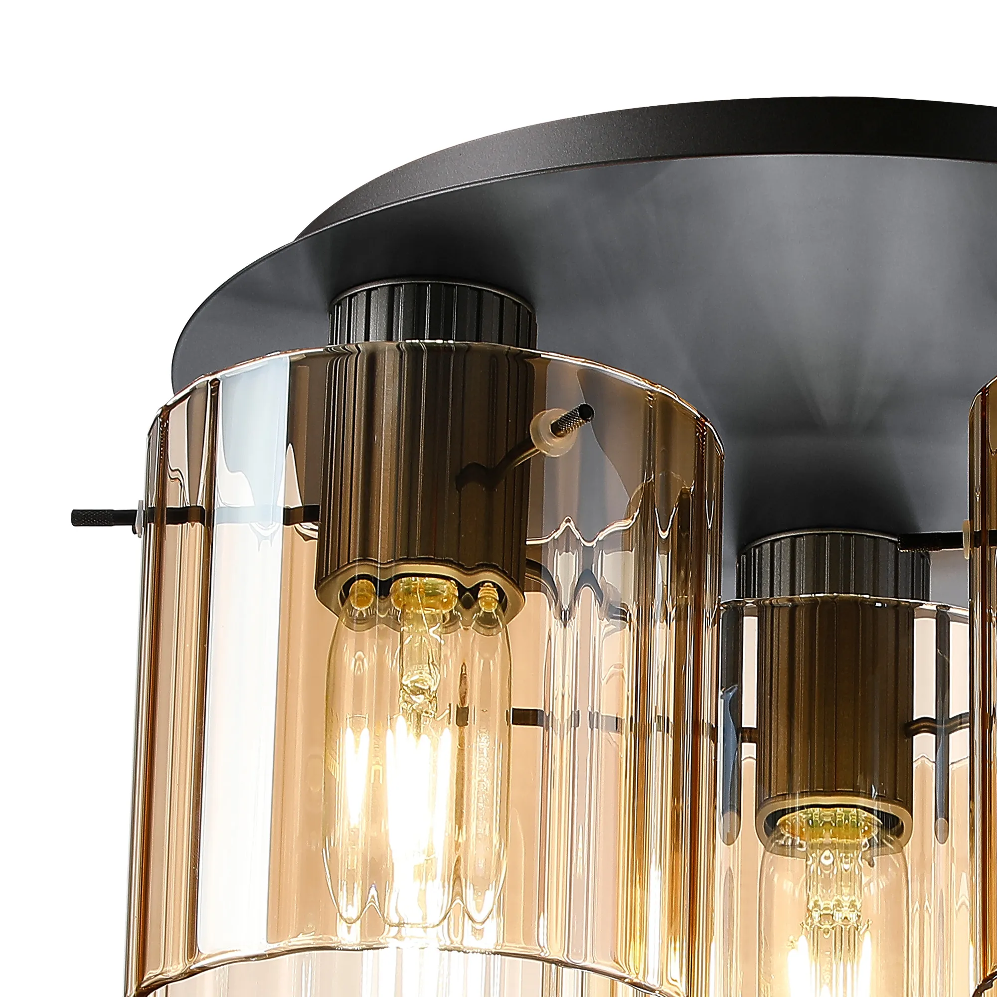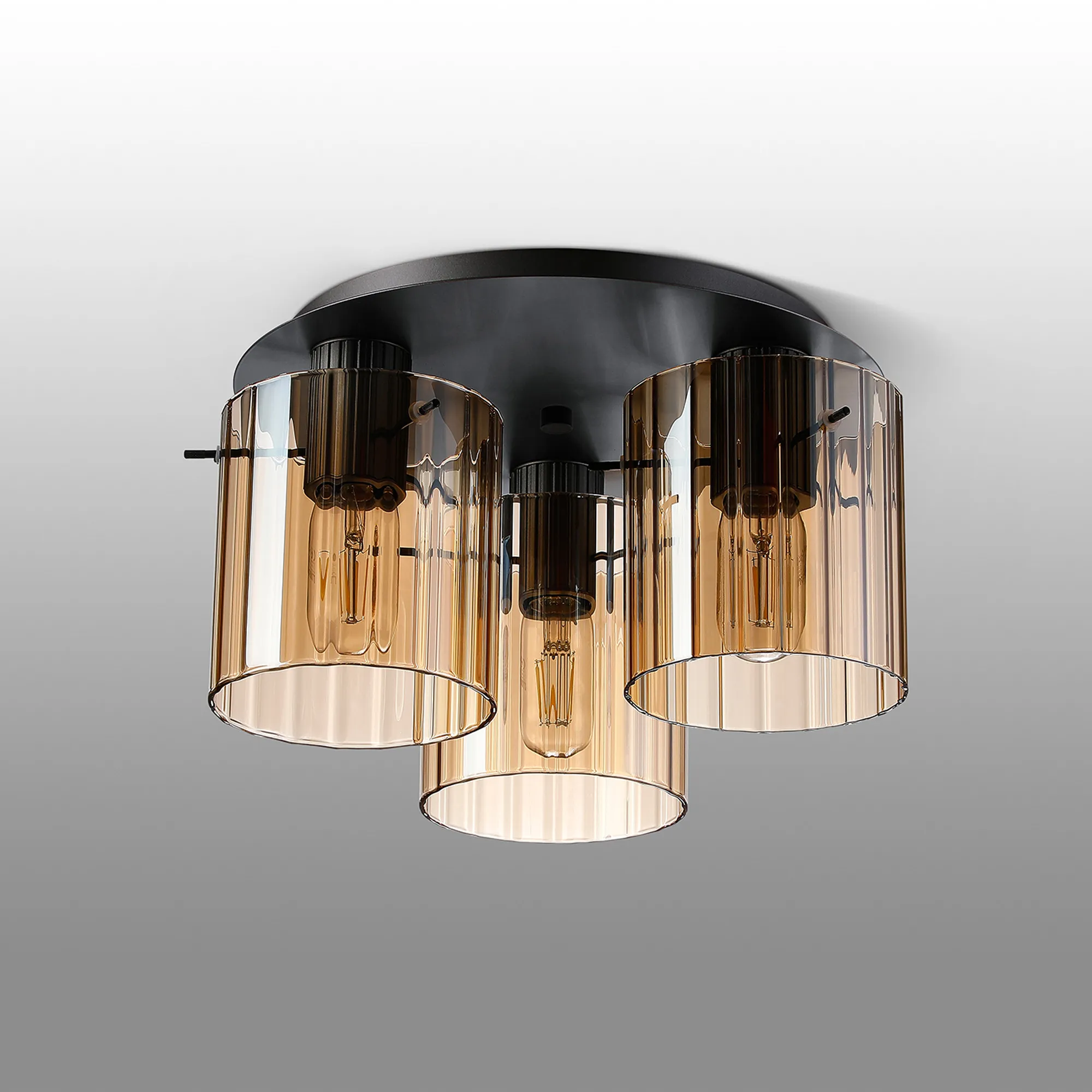 OTHER Castlegar Round Ceiling Flush, 3 Light Flush Fitting E27, Dark Grey/Amber Wide Line Glass