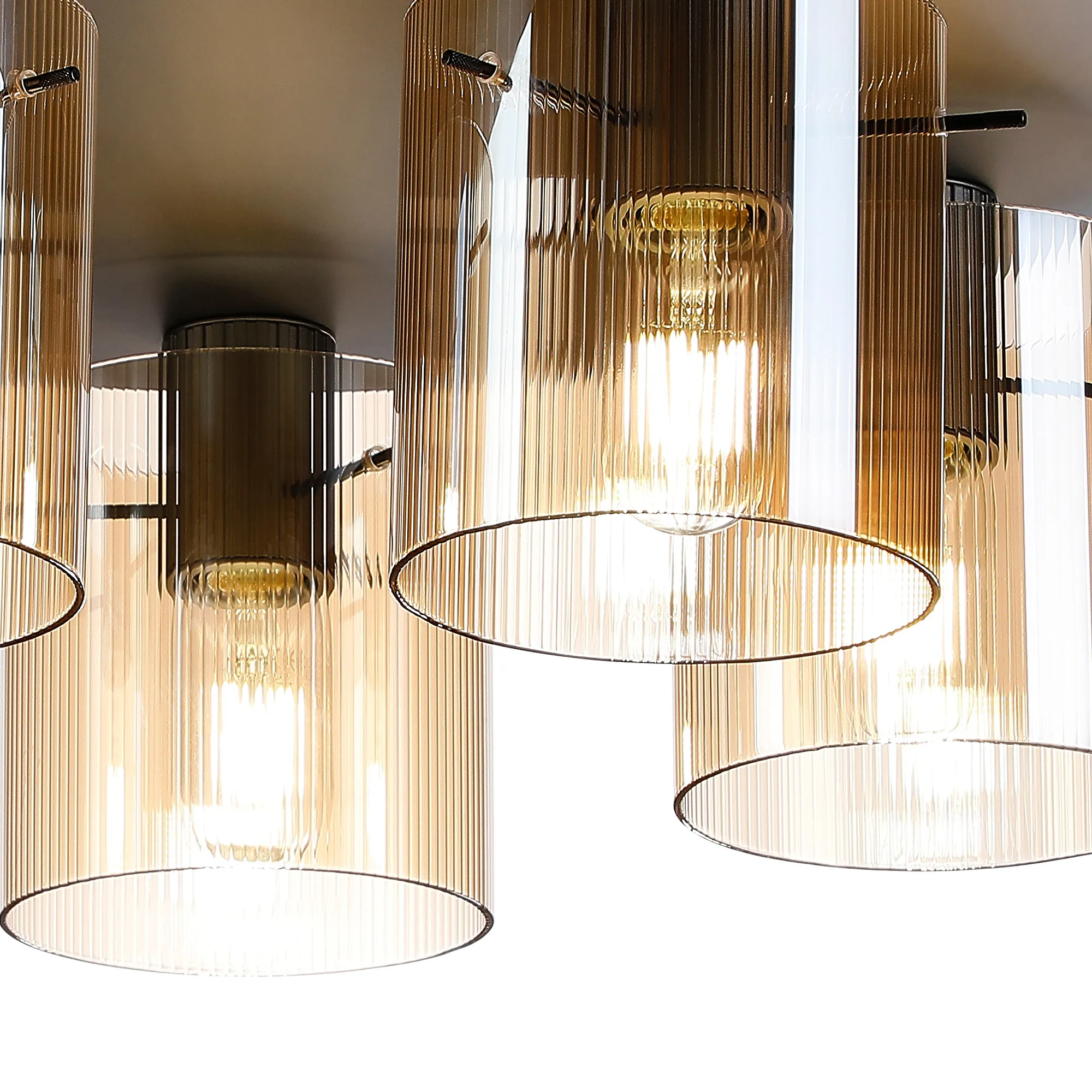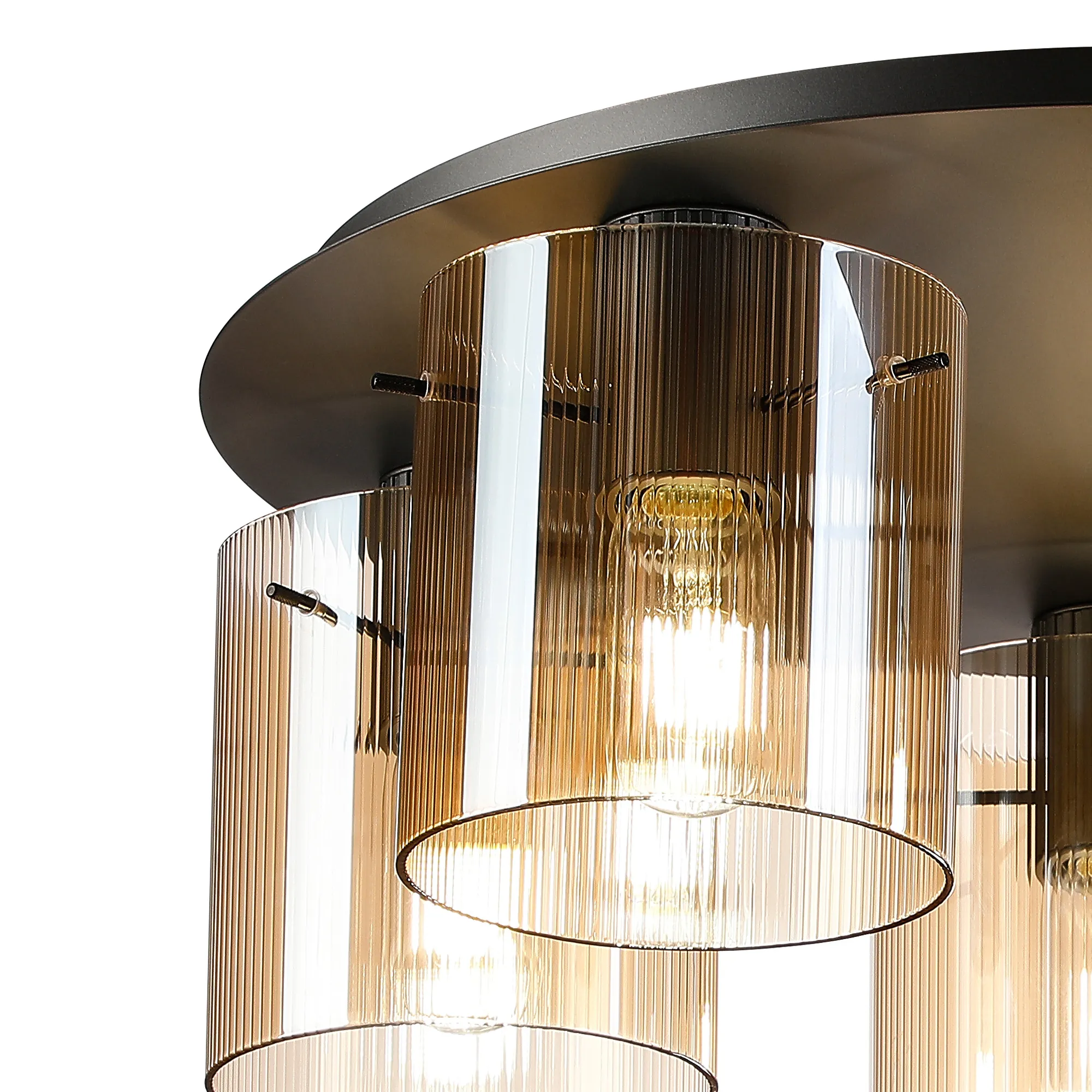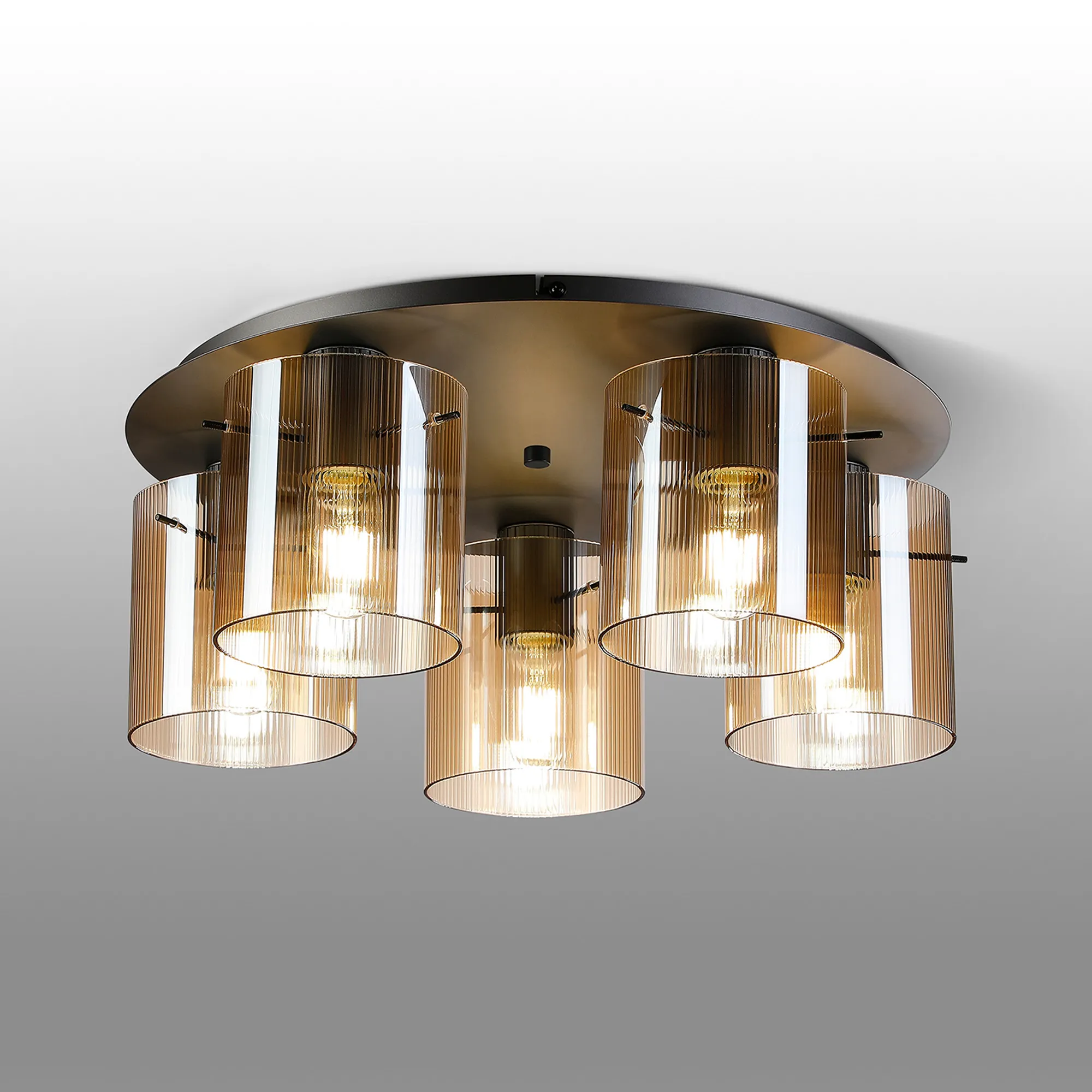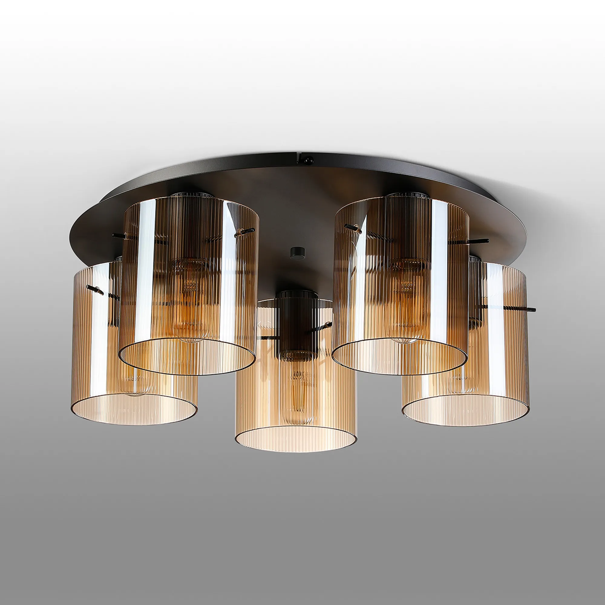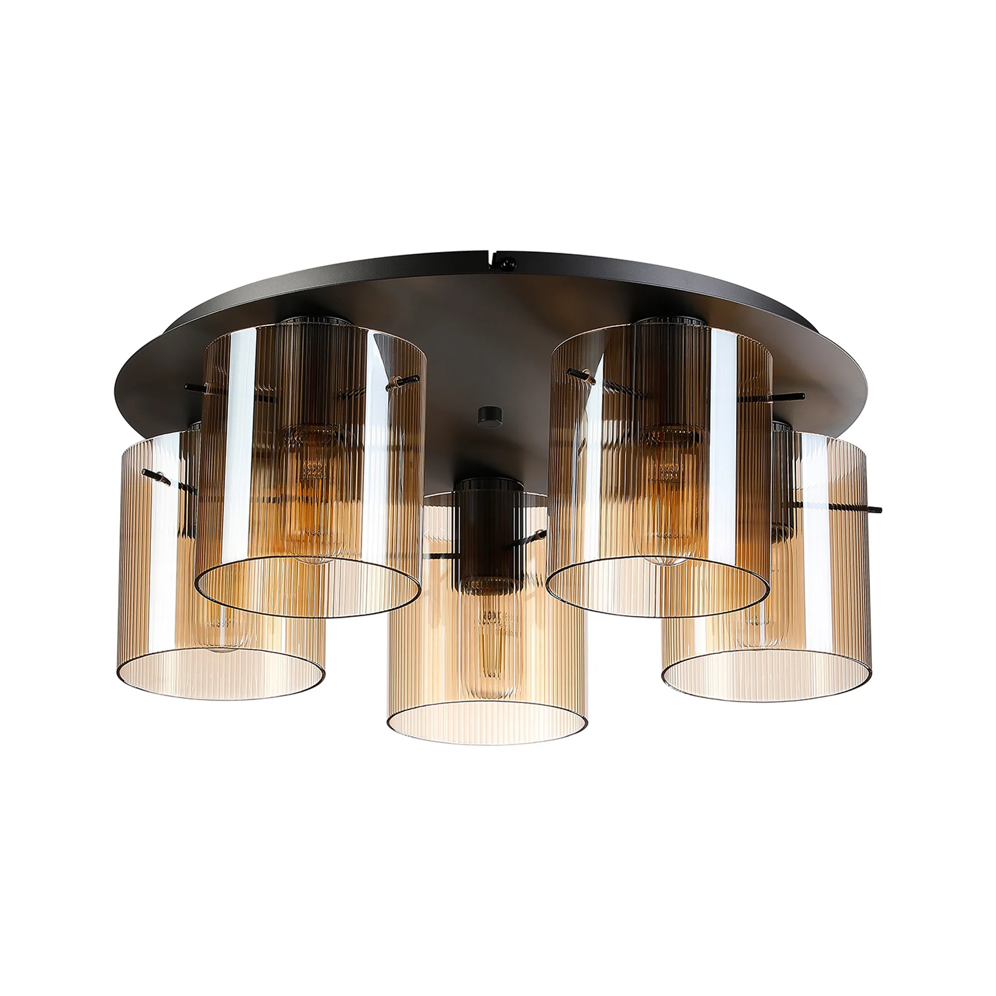 OTHER Castlegar Round Ceiling Flush, 5 Light Flush Fitting E27, Dark Grey/Amber Narrow Line Glass