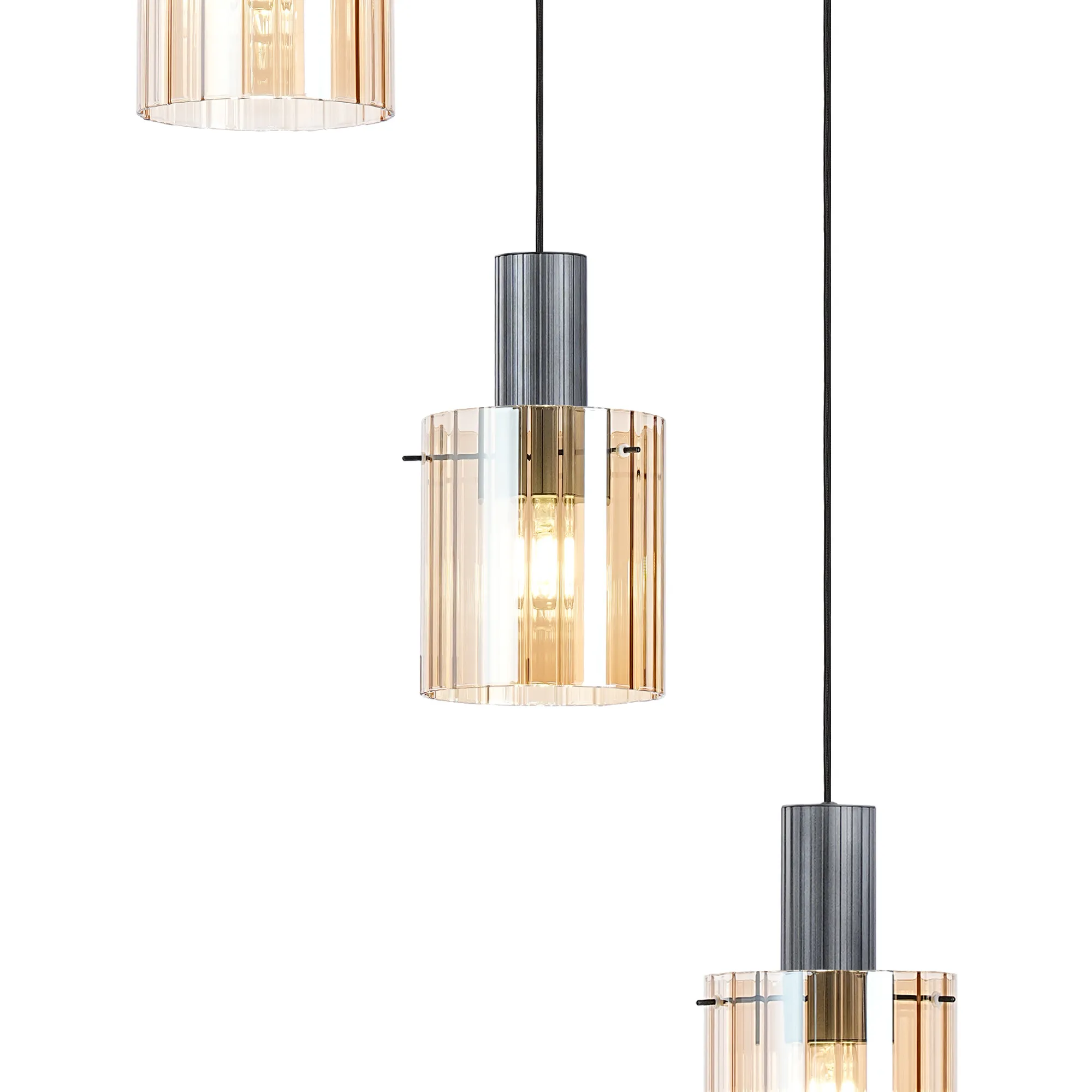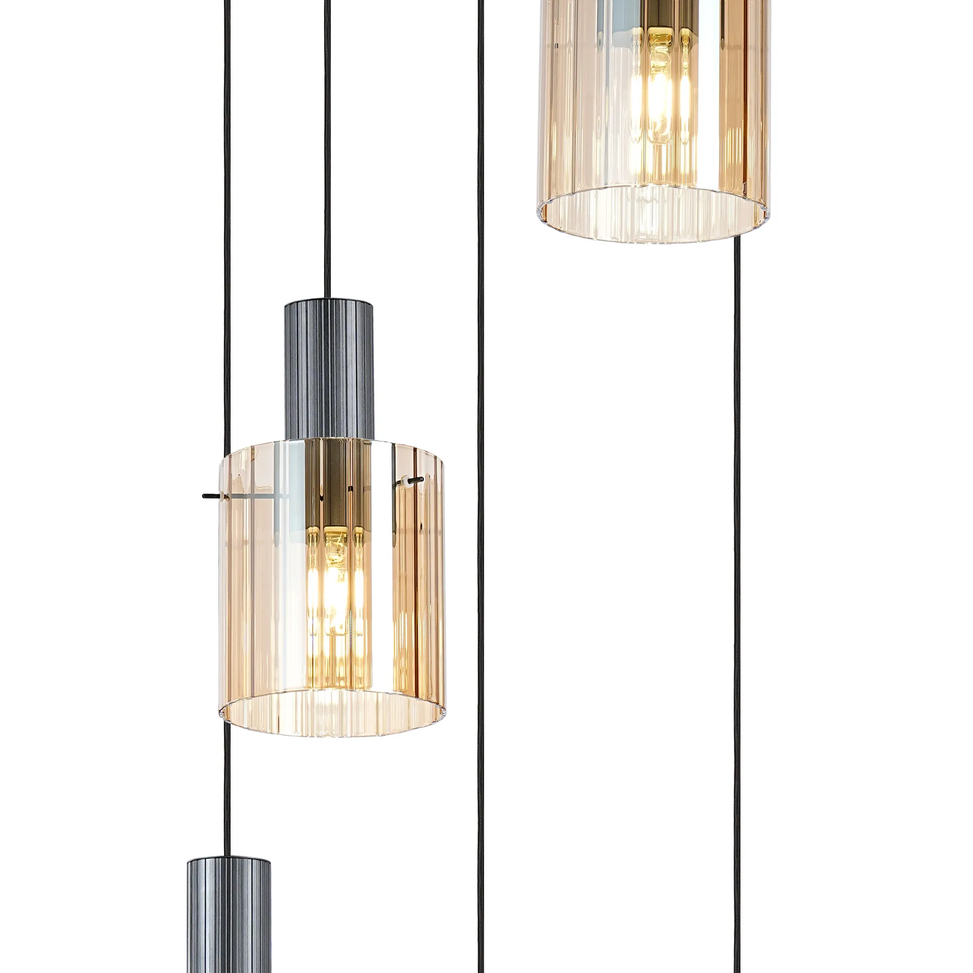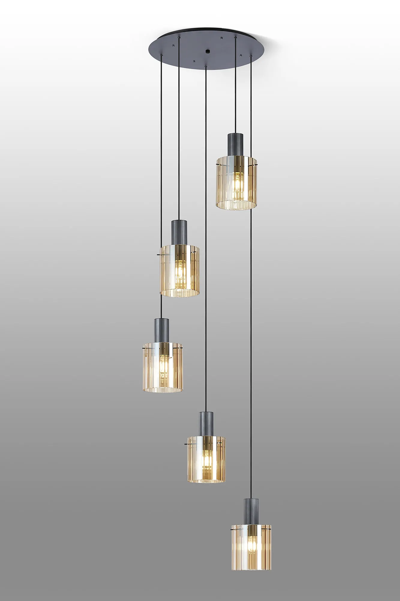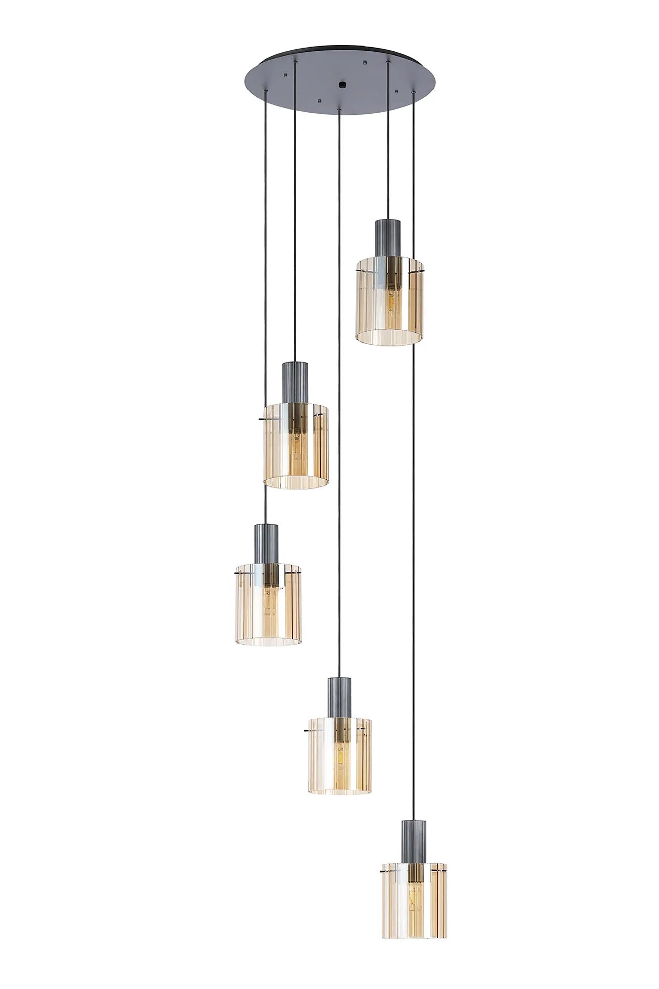 OTHER Castlegar Round Pendant, 5 Light Adjustable E27, Dark Grey/Amber Wide Line Glass