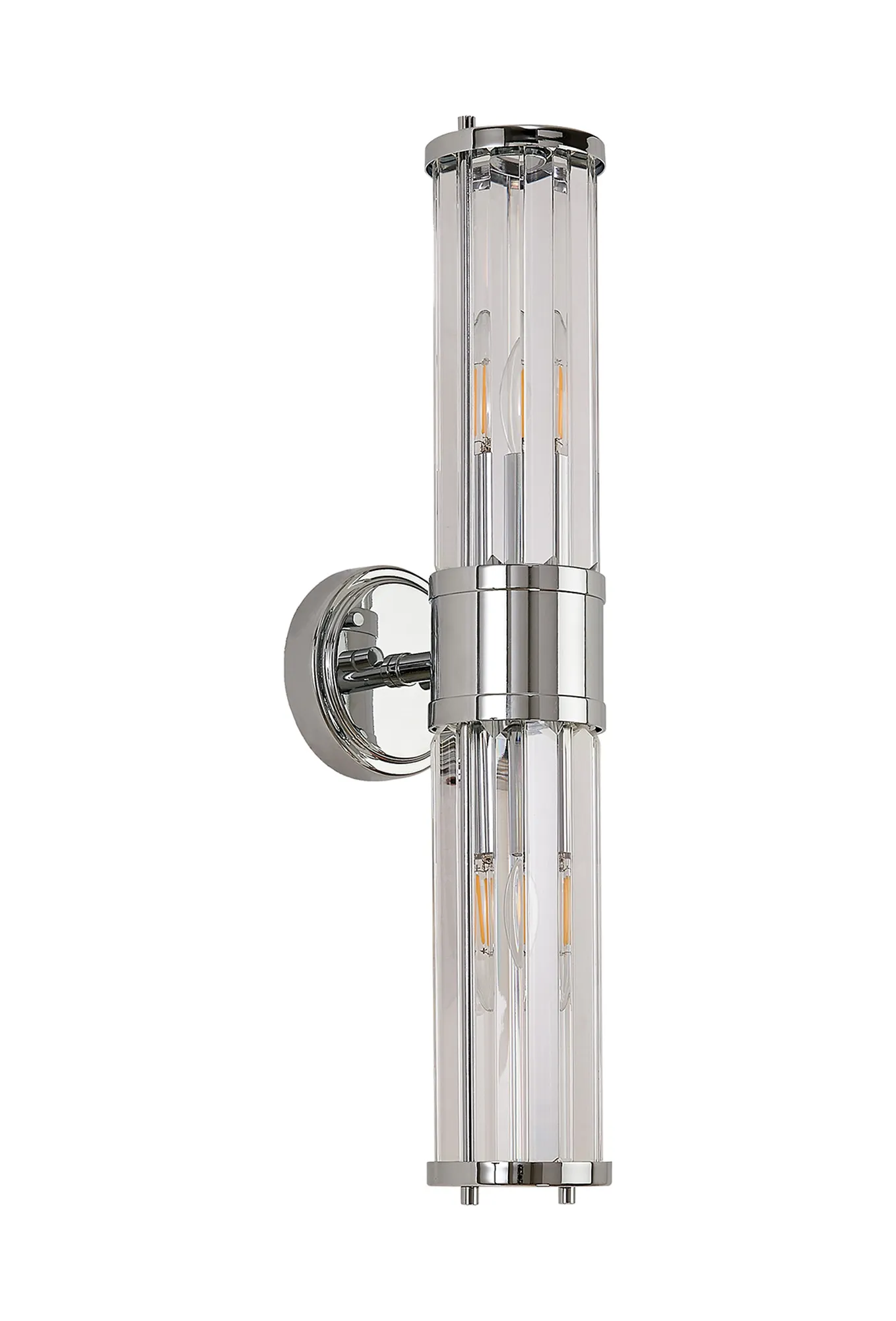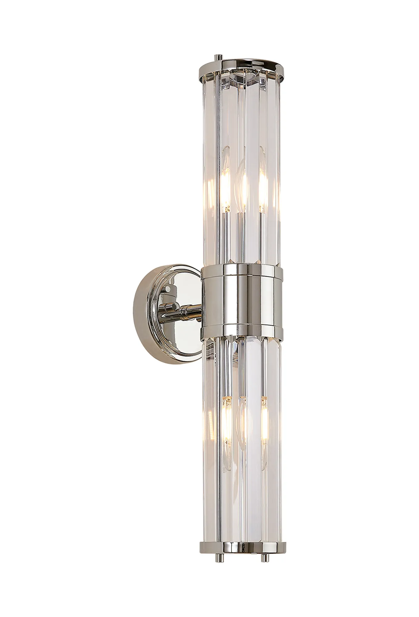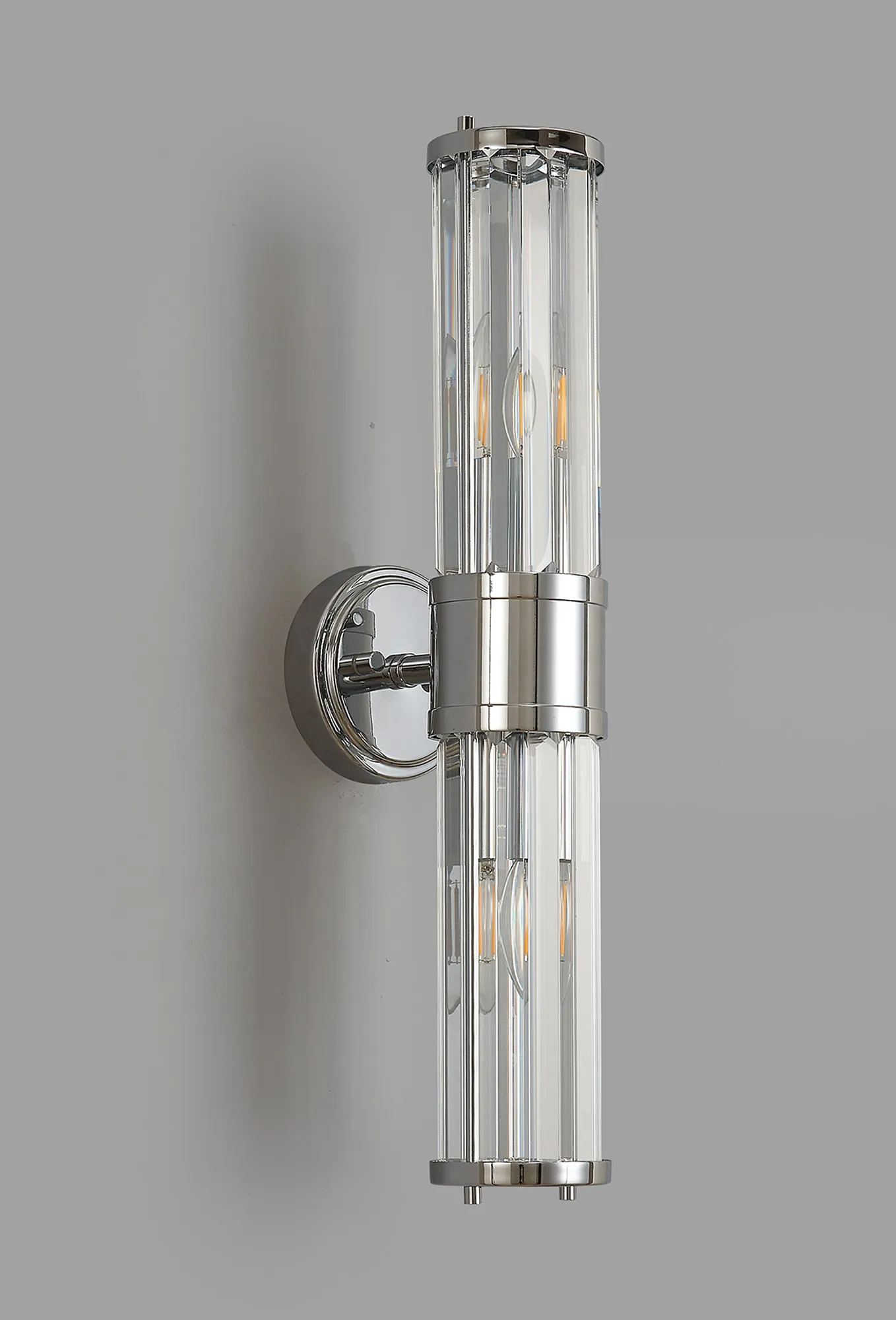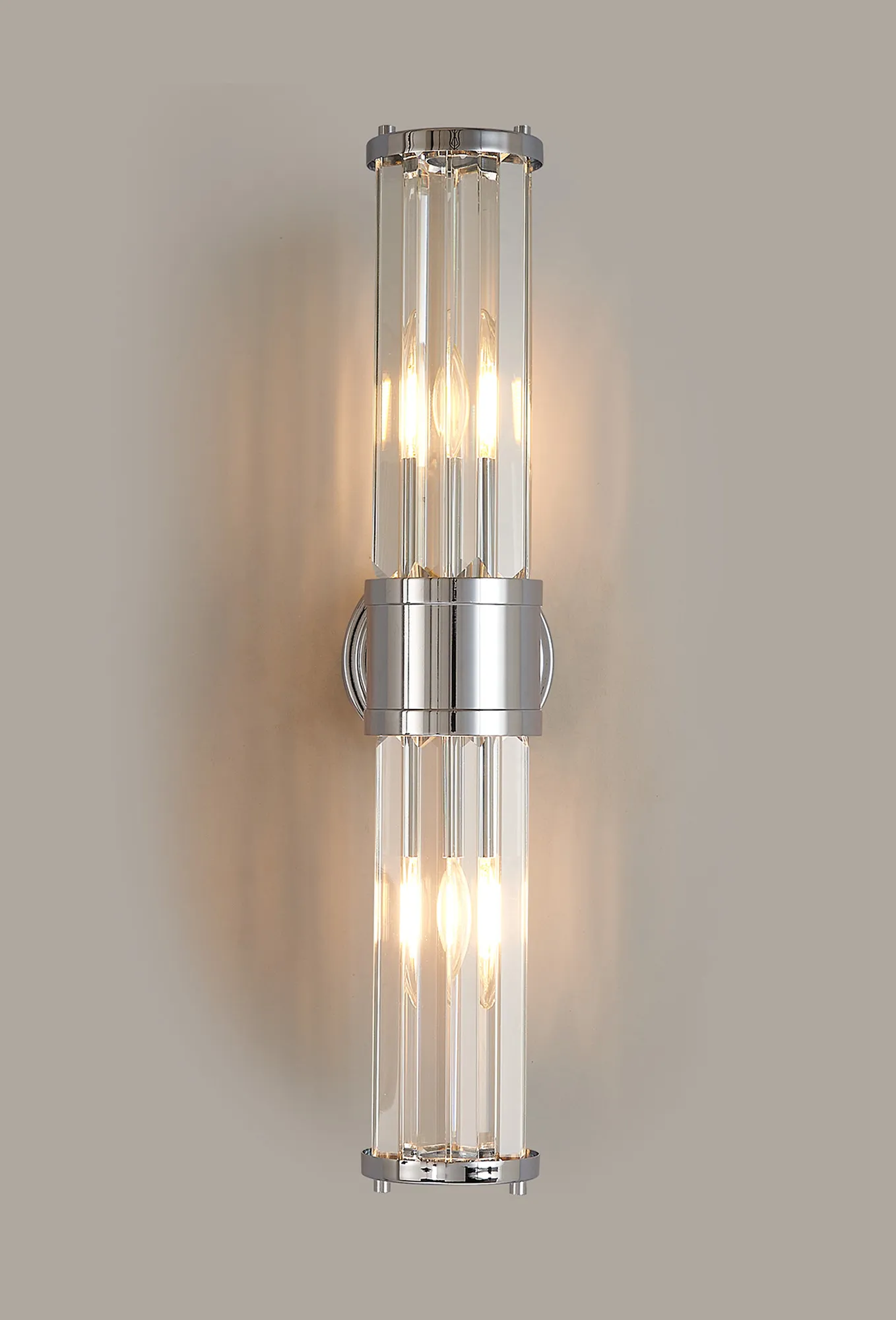 The Delta collection presents sophisticated wall light fixtures that combine functionality with elegance. Featuring an IP44 rating, their clear crystal rods provide ample illumination and a stunning visual effect. These tubular shaped wall lights are available in a range of finishes including gold, antique brass, satin black, and polished chrome, each complementing the clear crystal elements that refract light beautifully to create a warm, inviting ambiance.