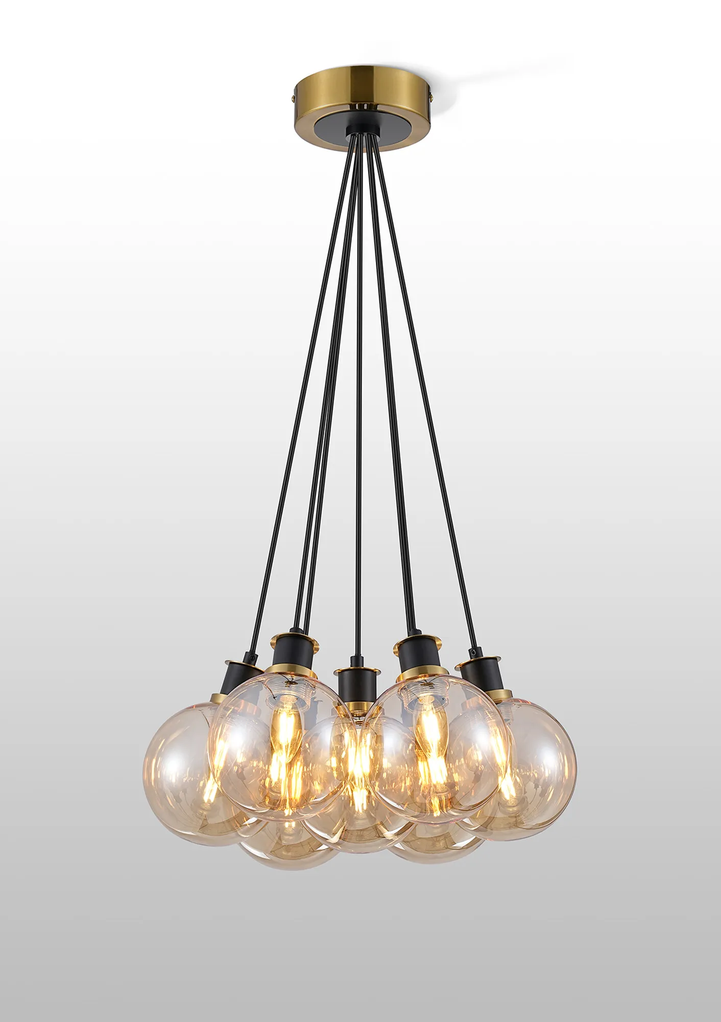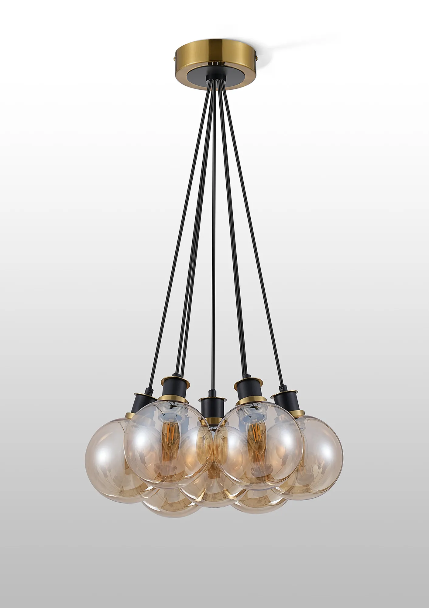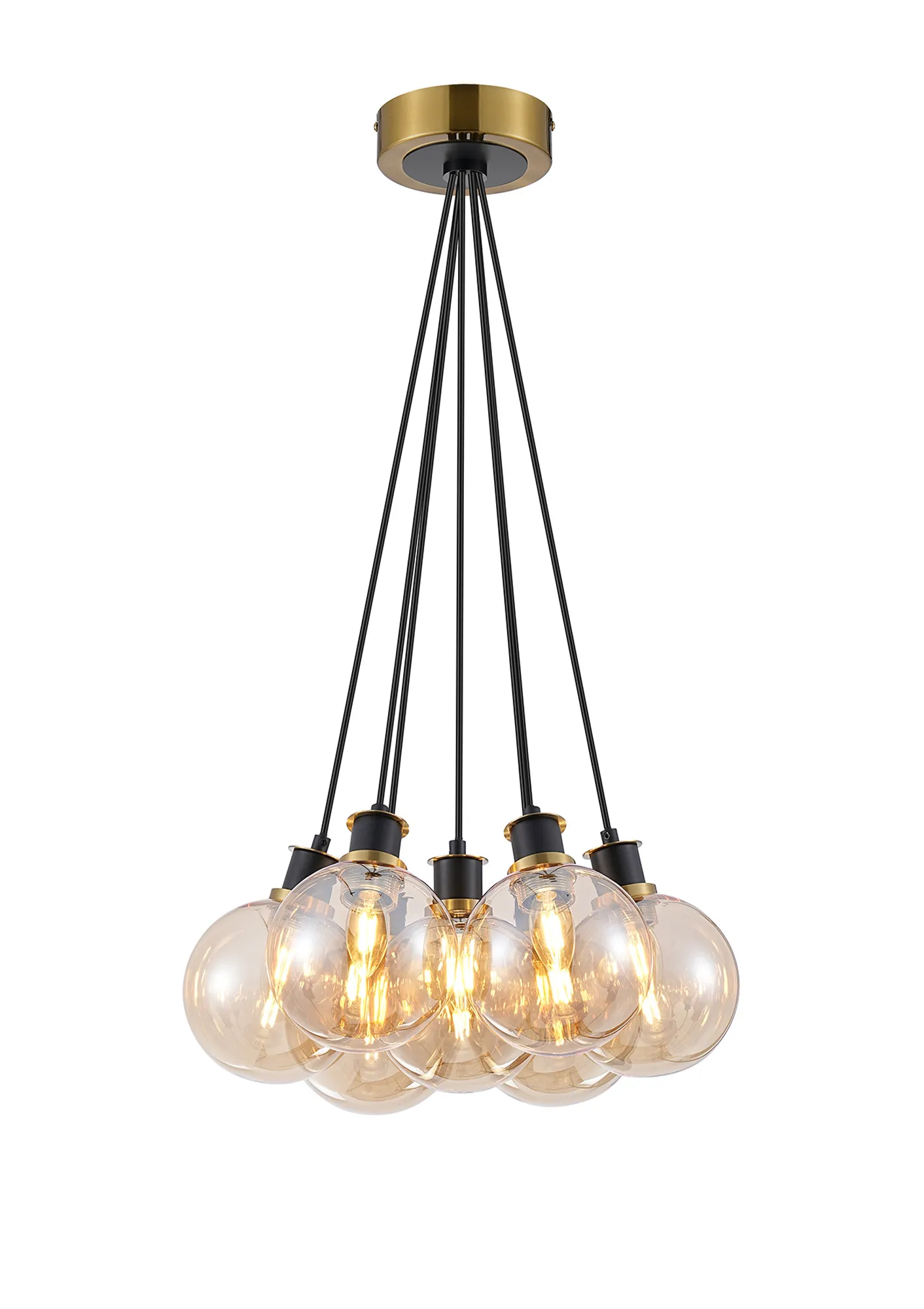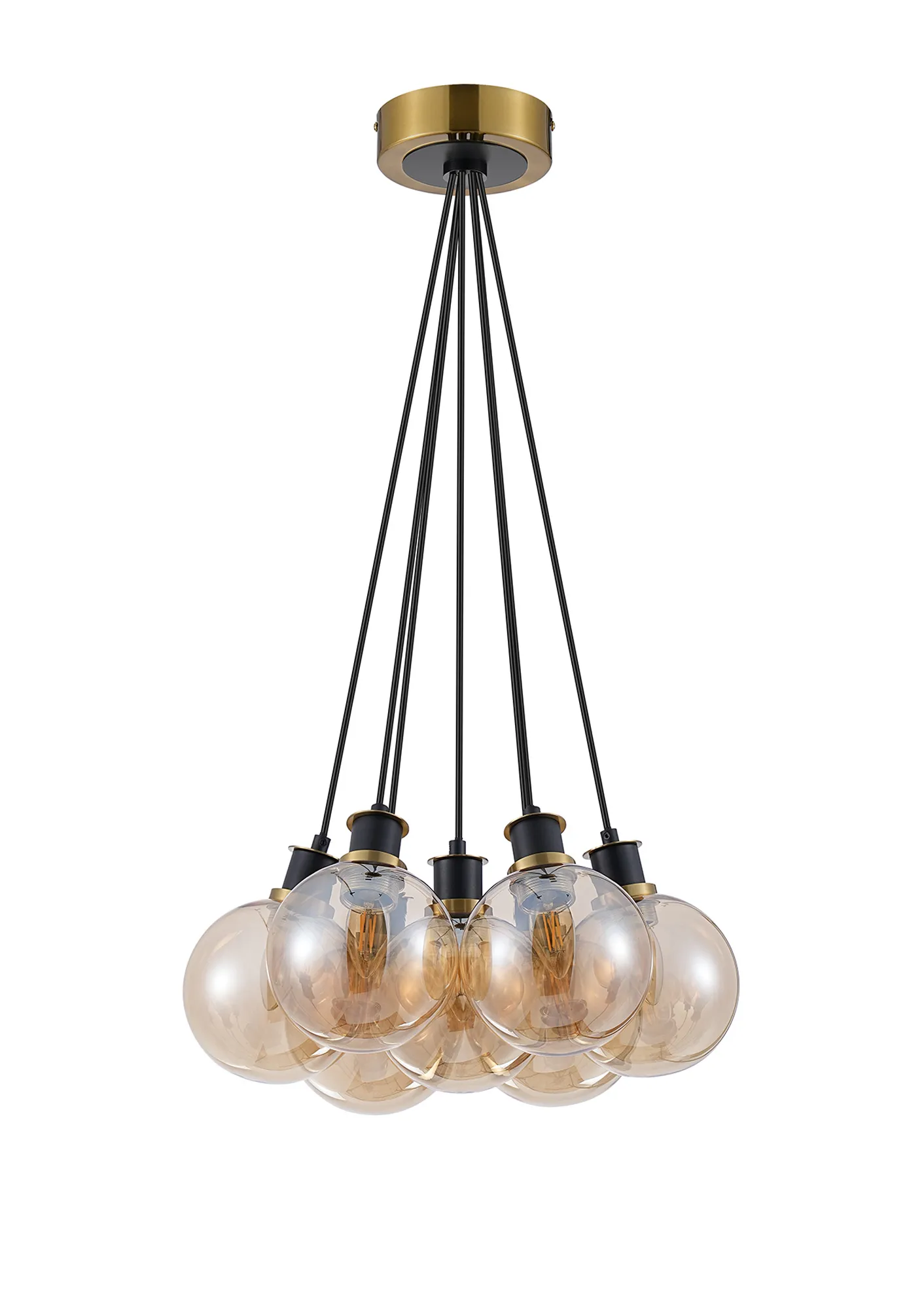 OTHER Fernie 1.3m Round Cluster Pendant, 7 x E14 With 15cm Round Glass Shade, Brass, Amber Plated & Satin Black