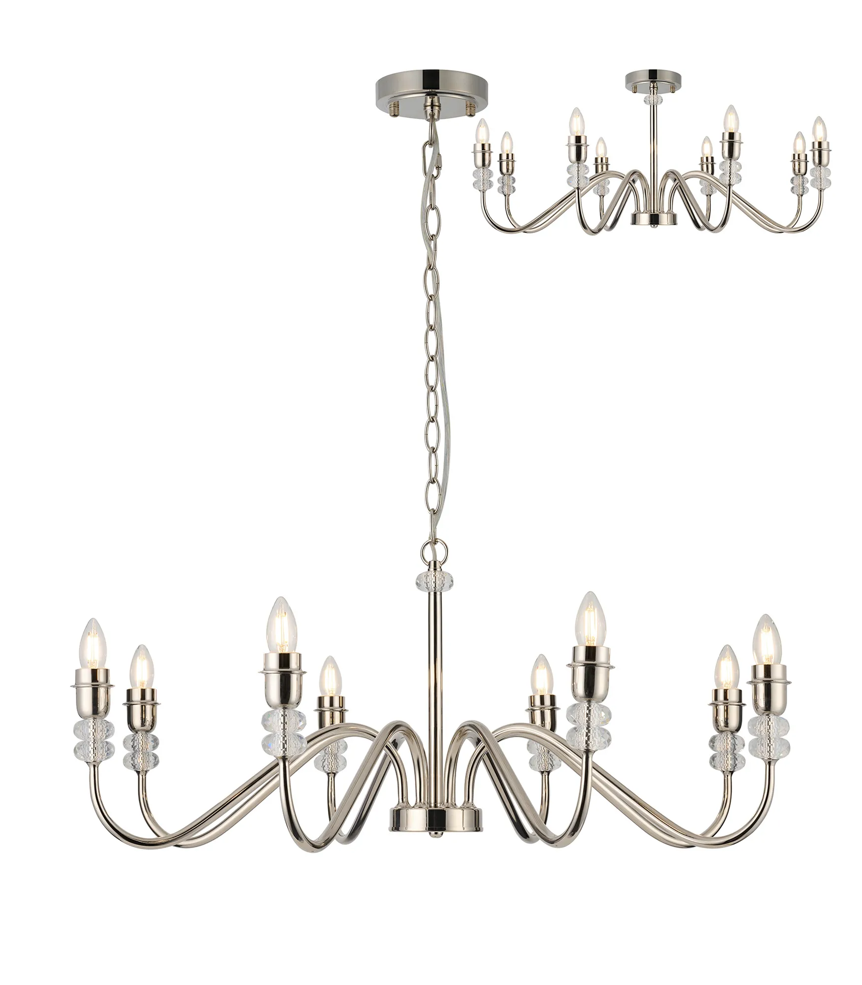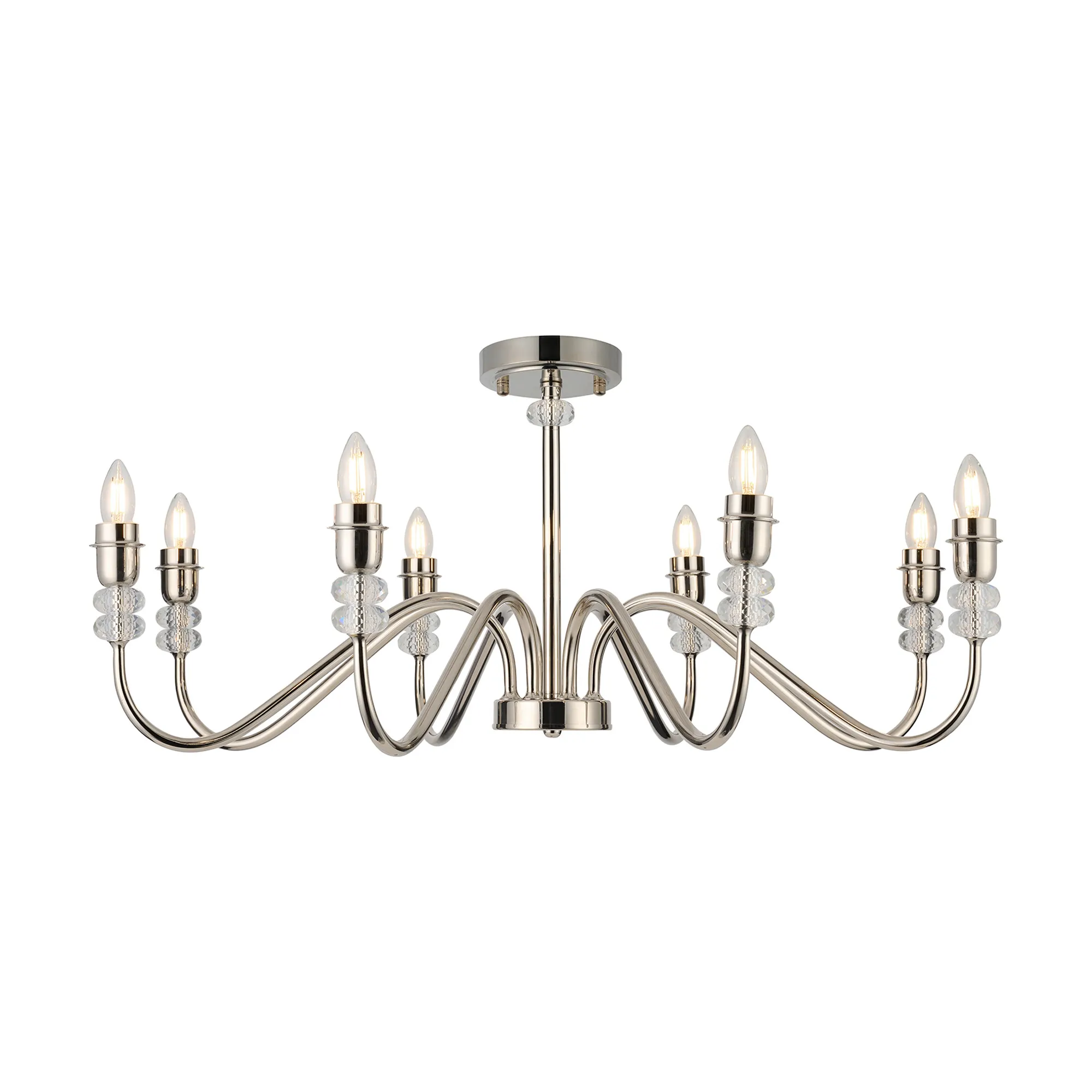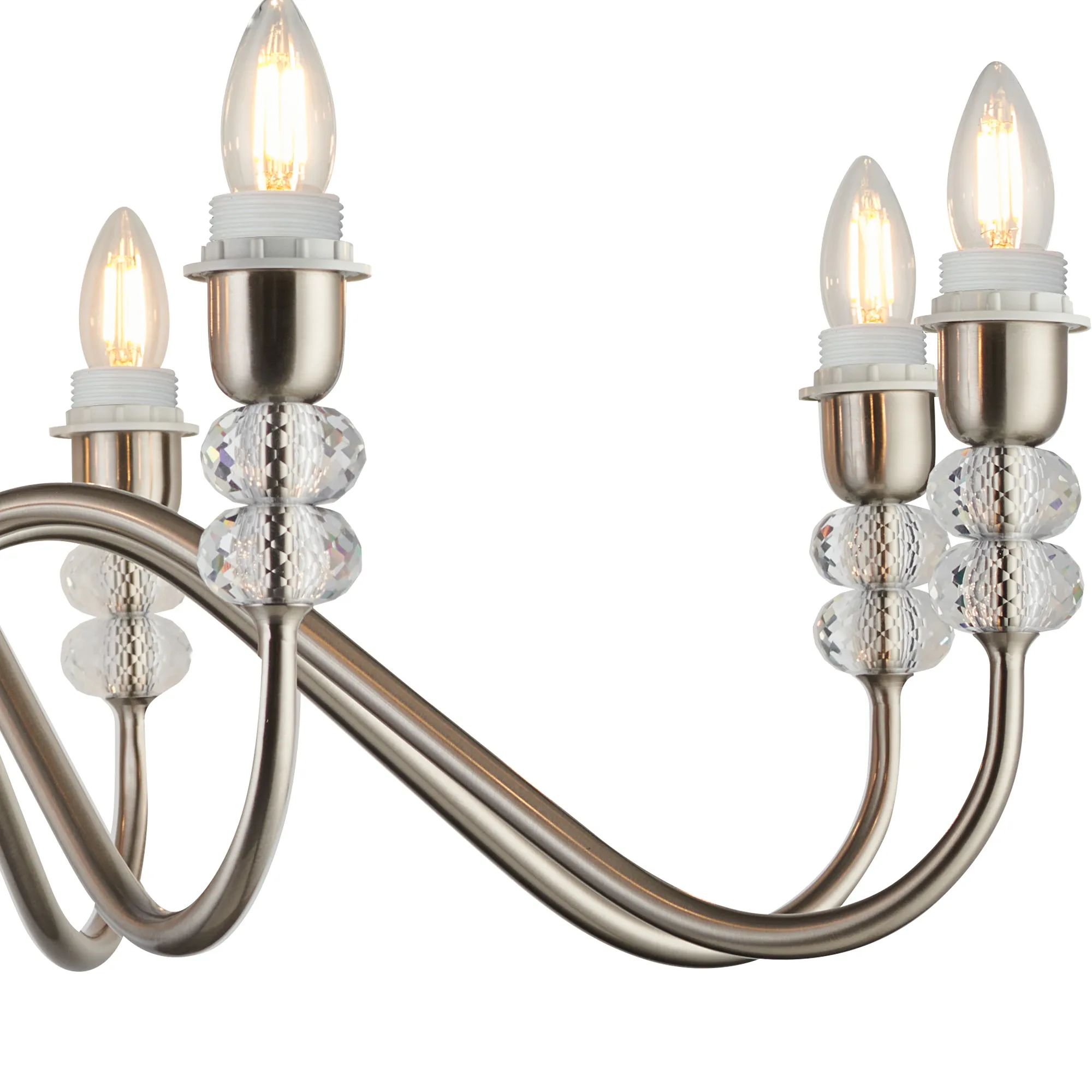 The Kelowna range comprises an assortment of multi-arm pendants and switched wall lamps, offered in your choice of antique brass, satin black, or polished nickel finishes. The crystal-adorned fixtures boast uniquely designed curved arms, featuring varying thickness along their length, and elegantly housing two round crystals beneath the lamp holder. This exquisitely crafted range accommodates E27 lamps, adding a touch of sophistication to your lighting choices.