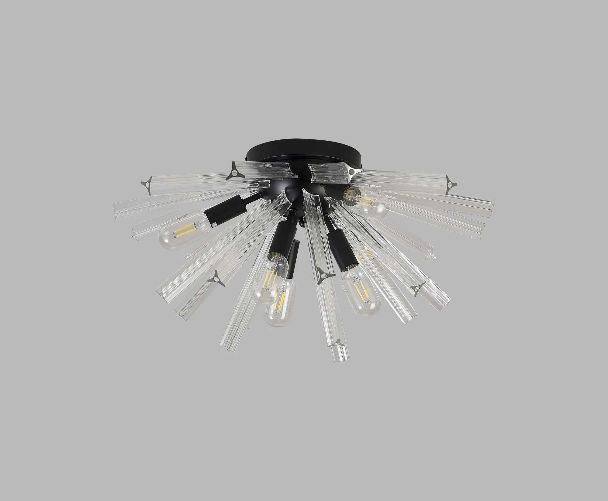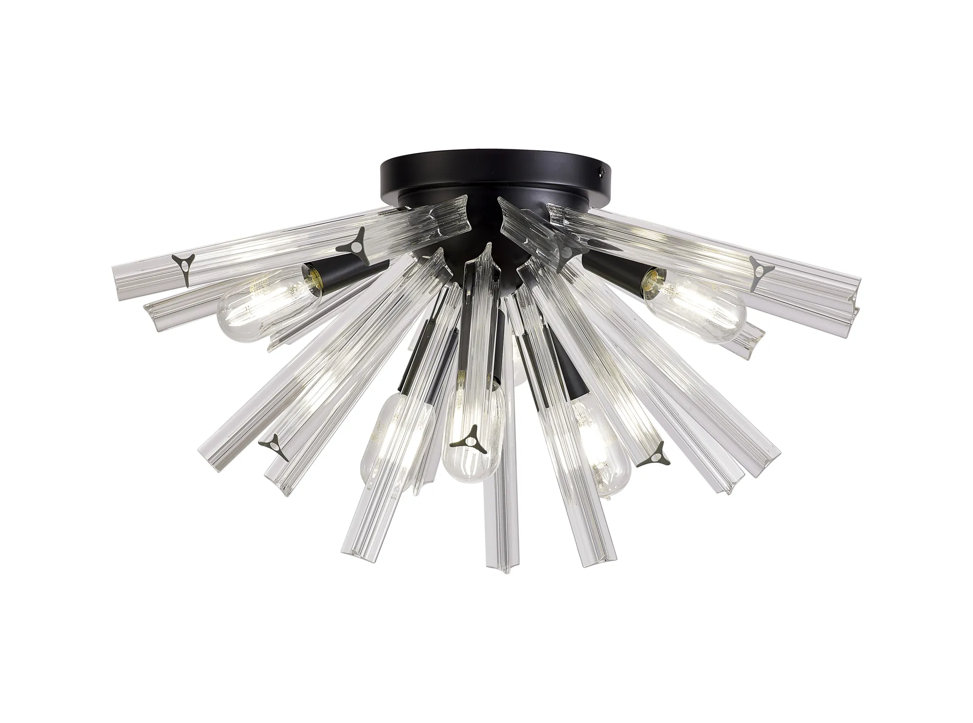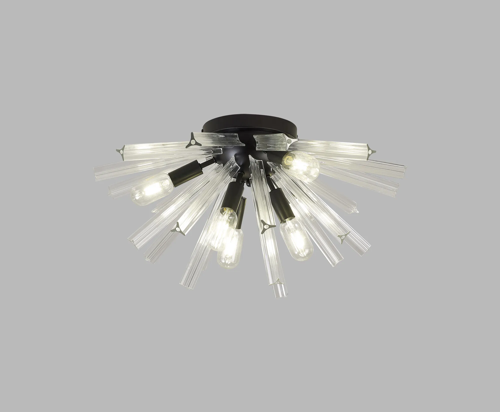 The Tora collection presents an intriguing glass shape moulded into a three dimensional triquetra. The grooves along each sized glass create an appealing optical effect which is effortlessly enhanced with the use of tubular lamps. The wide variety of fixtures available in this range span from a 6 light semi flush to an impacting 32 light pendant. The complementing wall lamps available allow for further application built around the same lighting family. Each frame can be chosen with either a brown oxide, polished nickel or matt black frame with either clear, champagne gold or smoke glass.