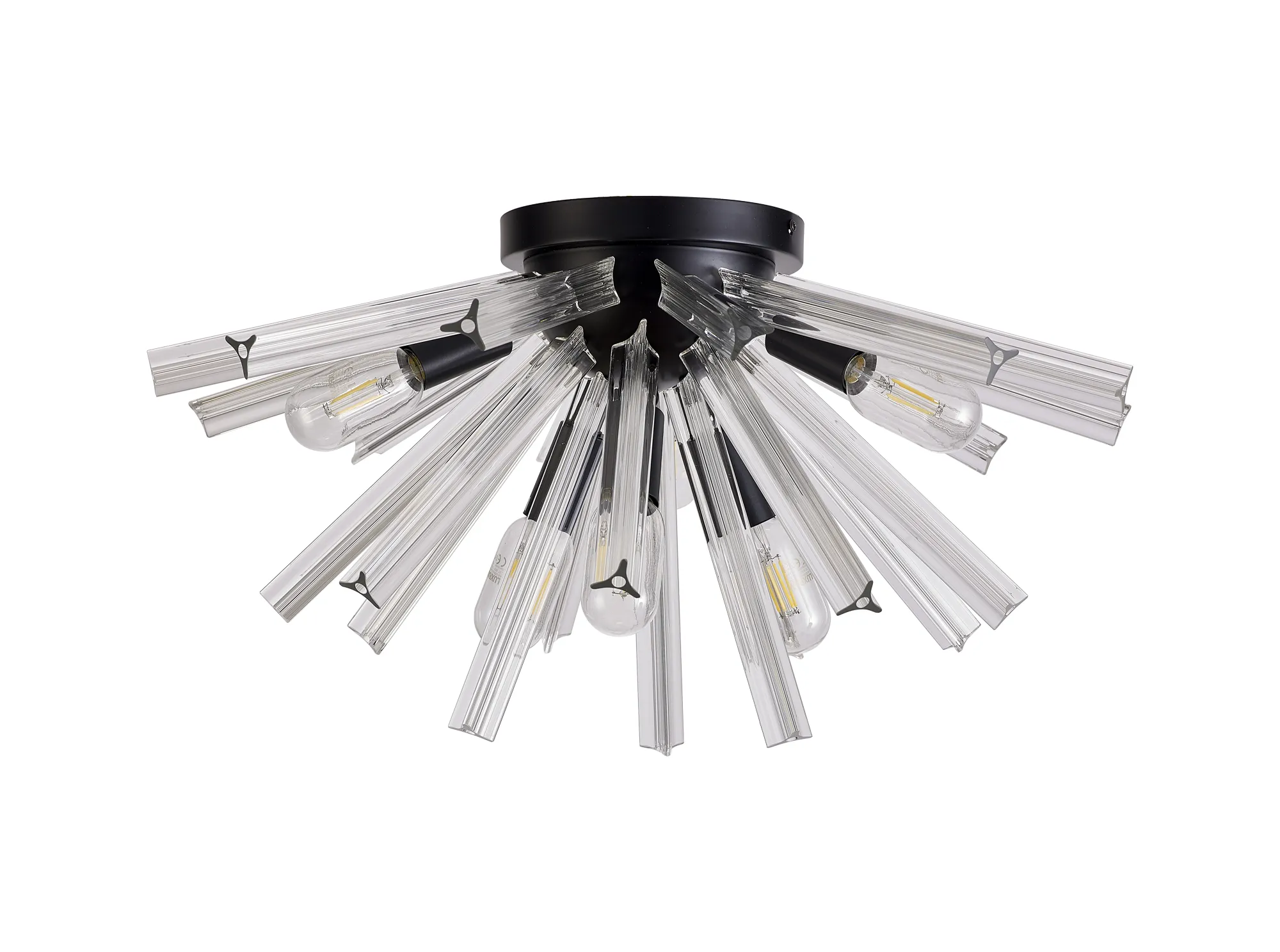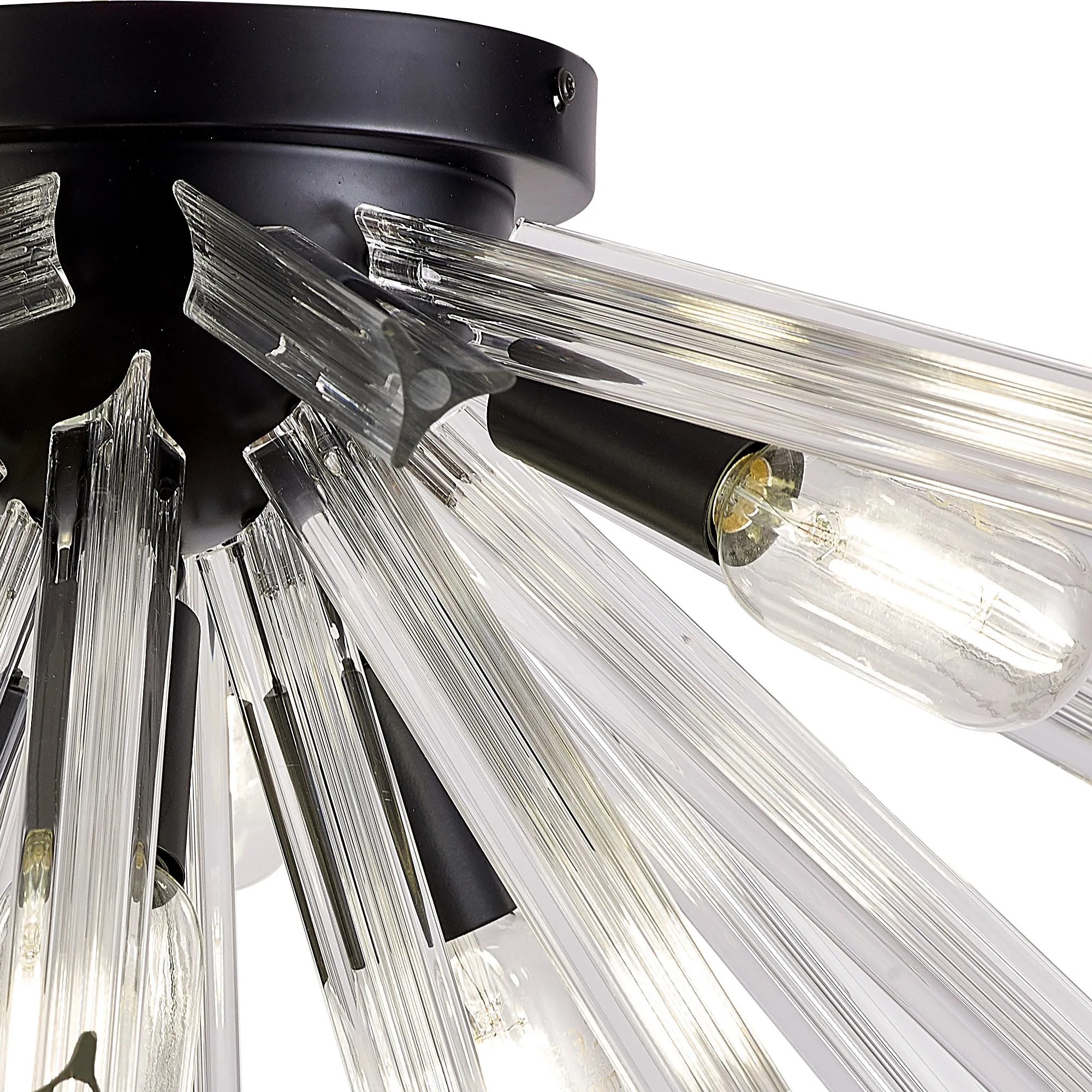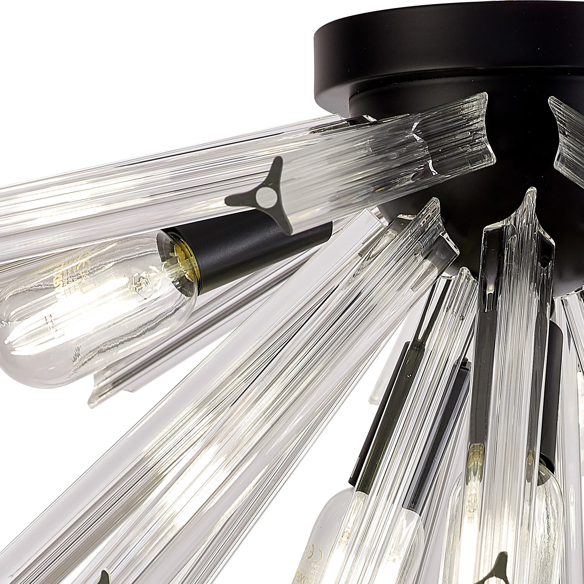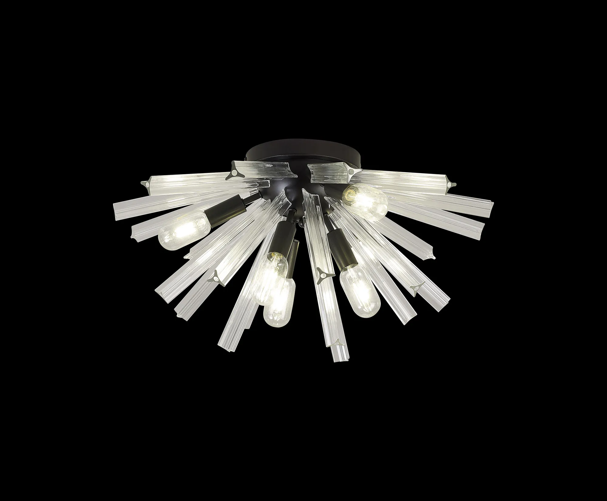 The Tora collection presents an intriguing glass shape moulded into a three dimensional triquetra. The grooves along each sized glass create an appealing optical effect which is effortlessly enhanced with the use of tubular lamps. The wide variety of fixtures available in this range span from a 6 light semi flush to an impacting 32 light pendant. The complementing wall lamps available allow for further application built around the same lighting family. Each frame can be chosen with either a brown oxide, polished nickel or matt black frame with either clear, champagne gold or smoke glass.