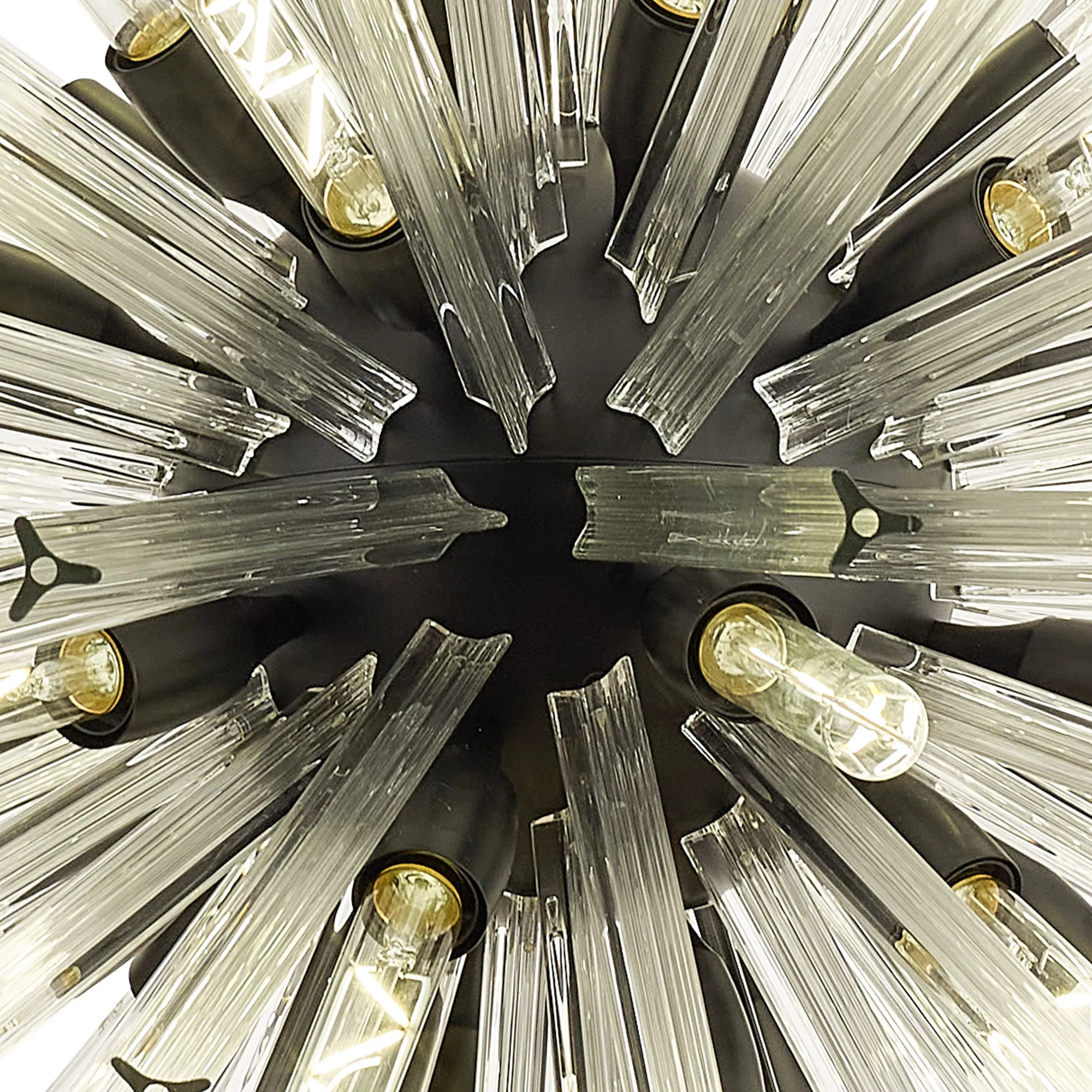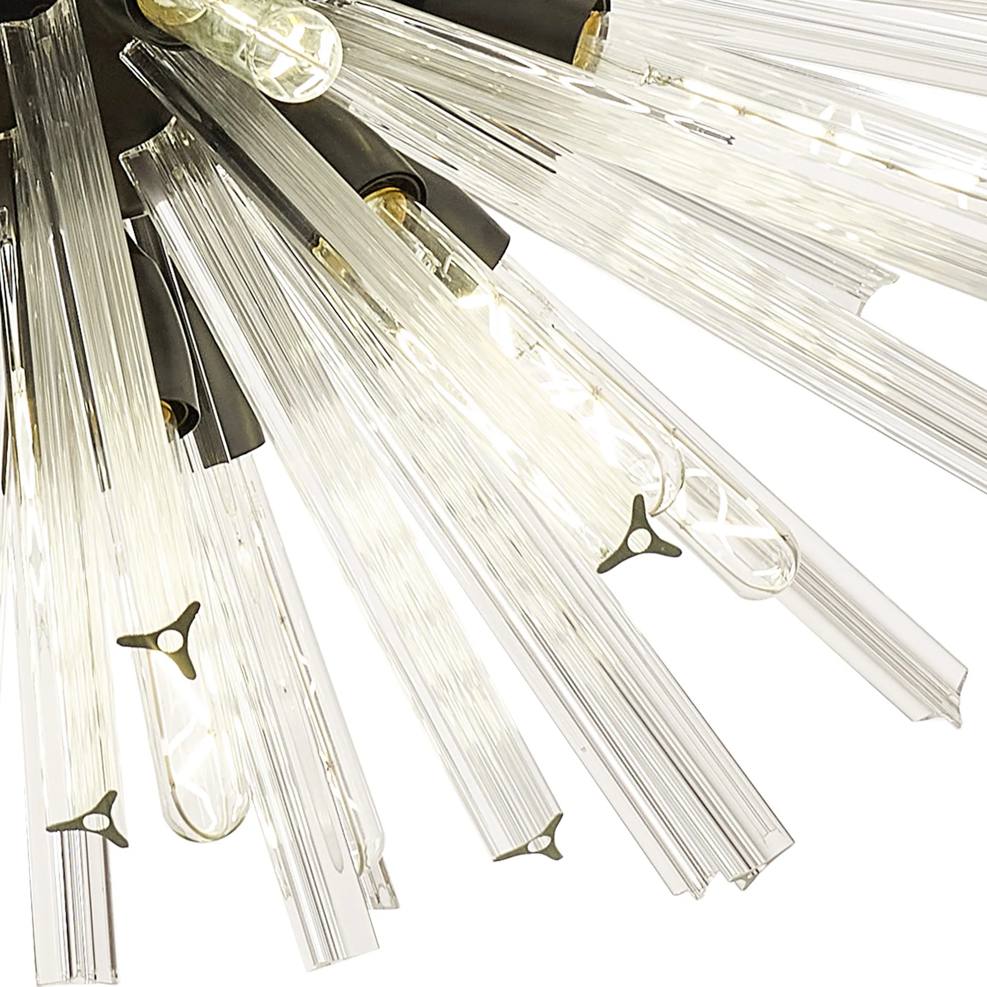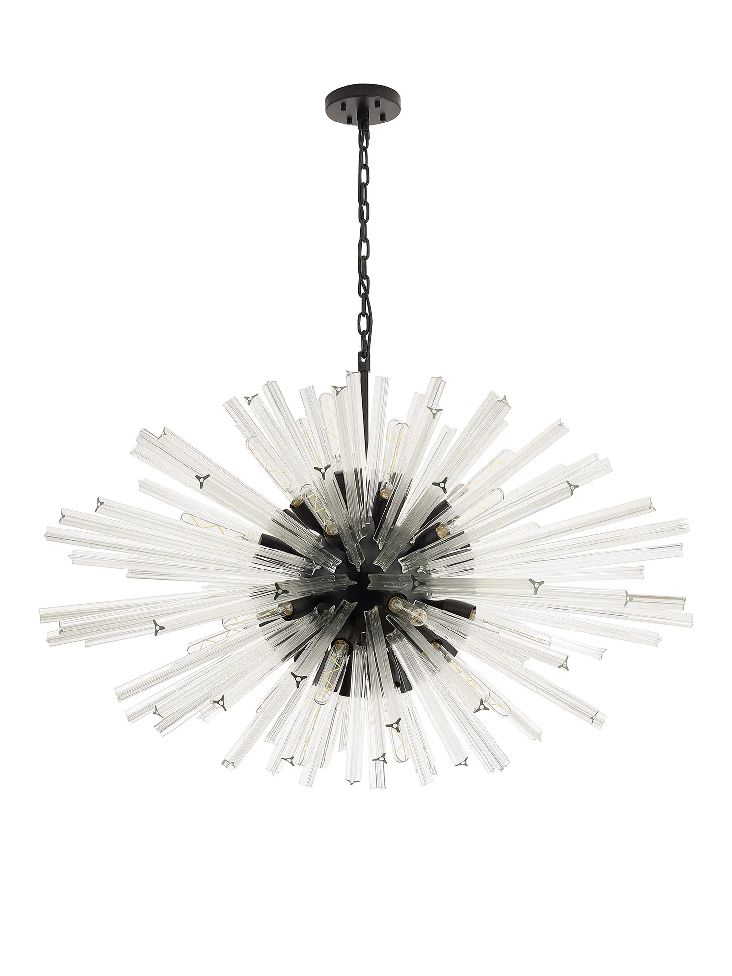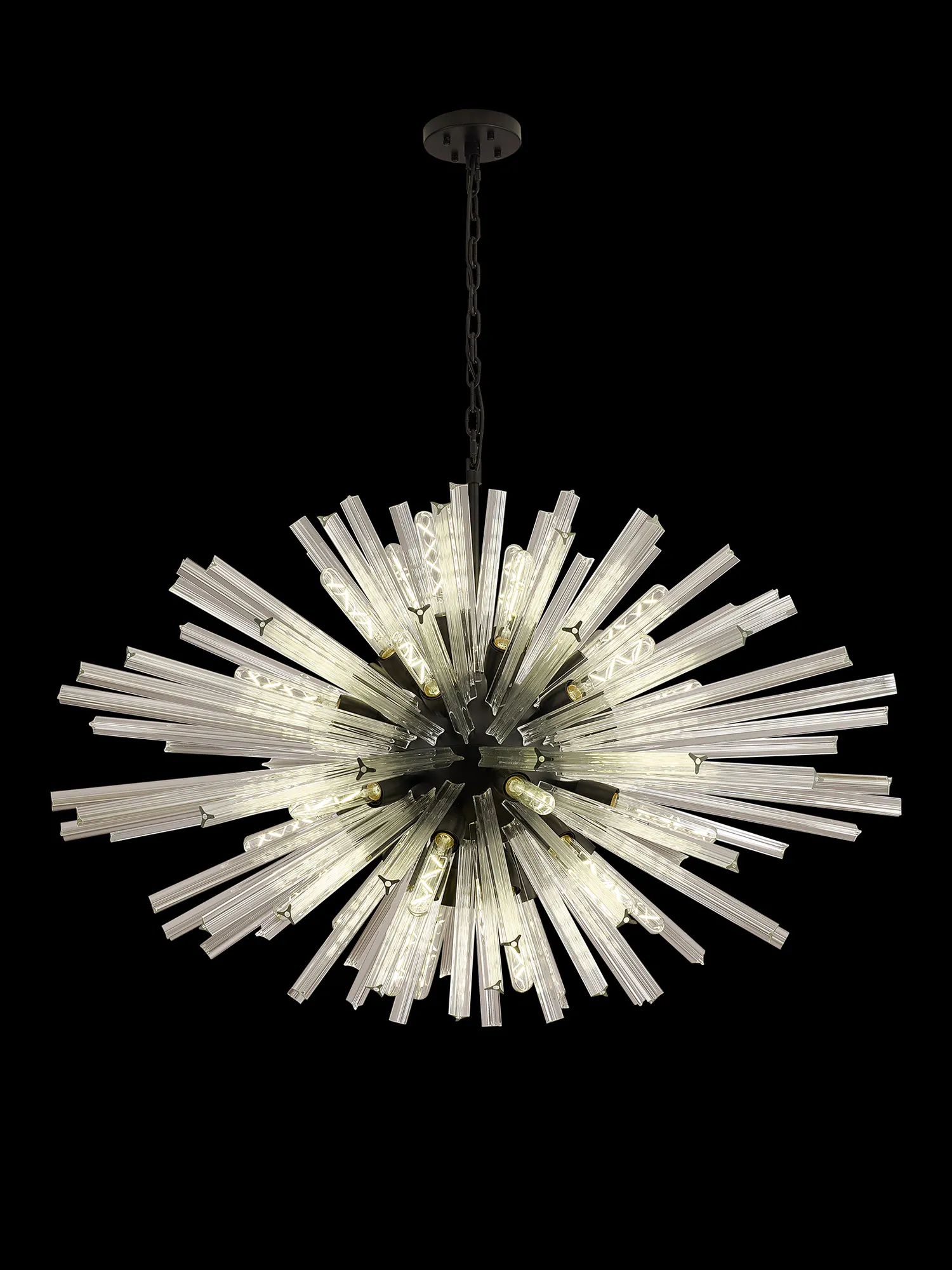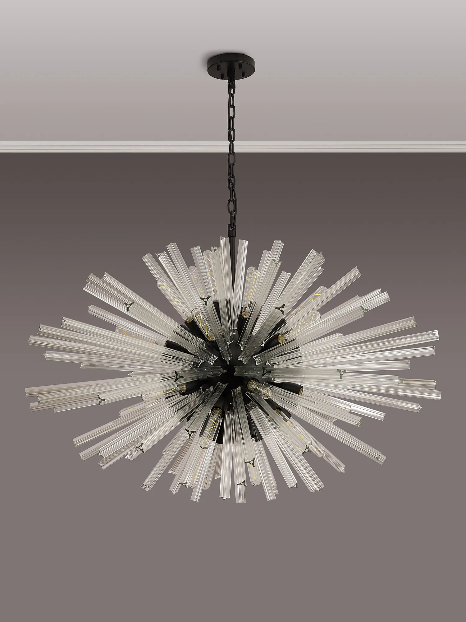 The Tora collection presents an intriguing glass shape moulded into a three dimensional triquetra. The grooves along each sized glass create an appealing optical effect which is effortlessly enhanced with the use of tubular lamps. The wide variety of fixtures available in this range span from a 6 light semi flush to an impacting 32 light pendant. The complementing wall lamps available allow for further application built around the same lighting family. Each frame can be chosen with either a brown oxide, polished nickel or matt black frame with either clear, champagne gold or smoke glass.
