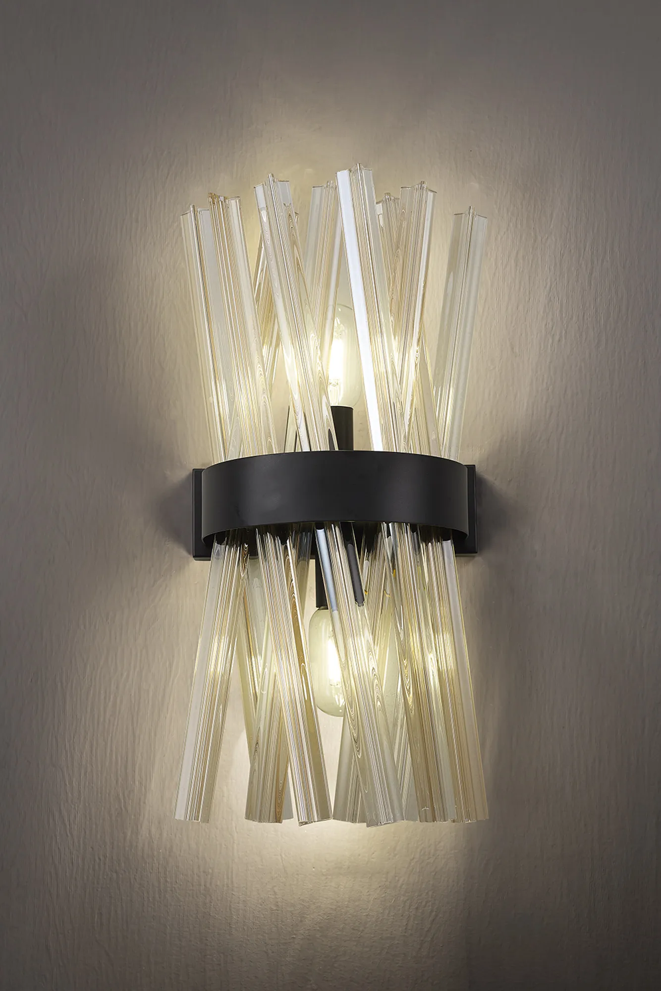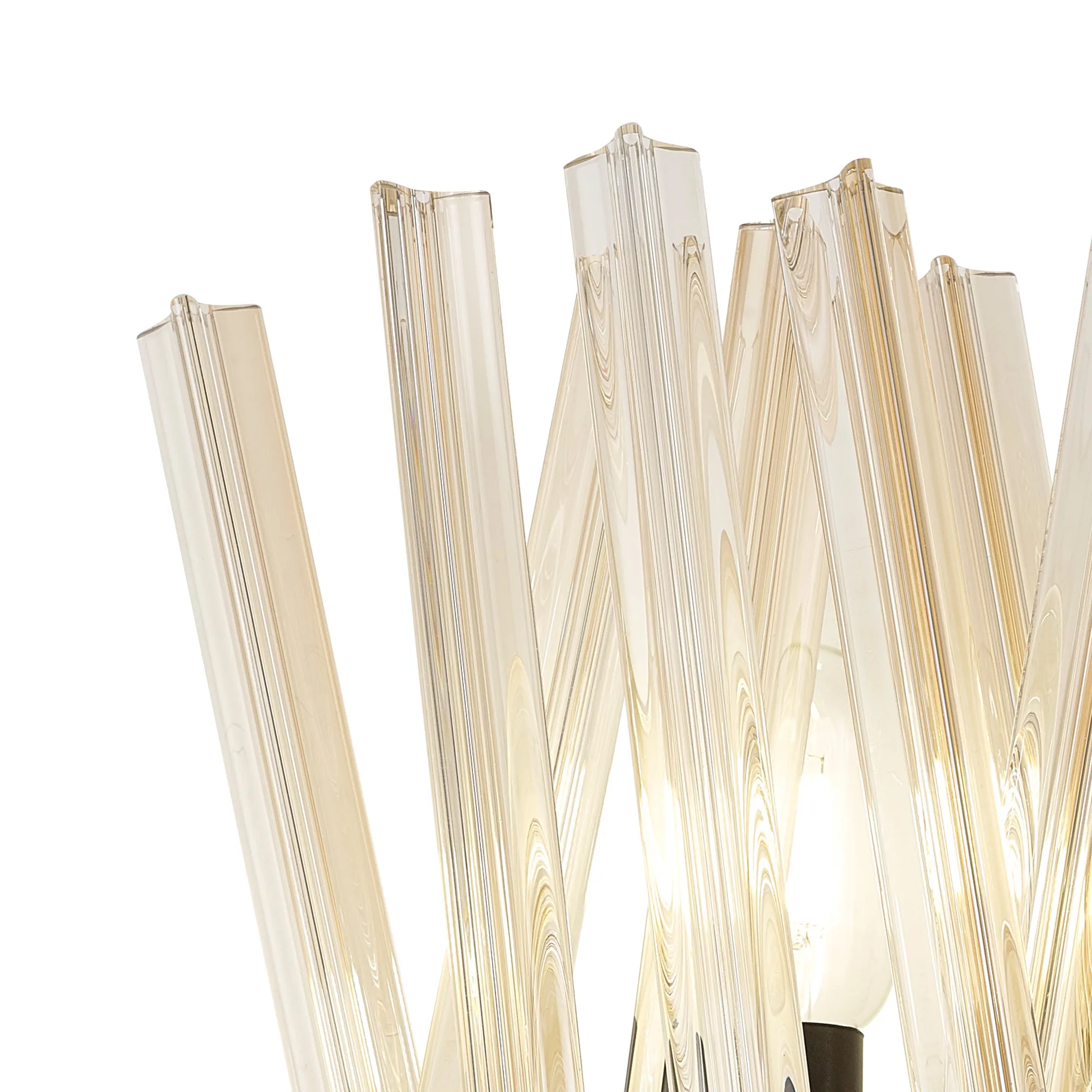 The Tora collection presents an intriguing glass shape moulded into a three dimensional triquetra. The grooves along each sized glass create an appealing optical effect which is effortlessly enhanced with the use of tubular lamps. The wide variety of fixtures available in this range span from a 6 light semi flush to an impacting 32 light pendant. The complementing wall lamps available allow for further application built around the same lighting family. Each frame can be chosen with either a brown oxide, polished nickel or matt black frame with either clear, champagne gold or smoke glass.