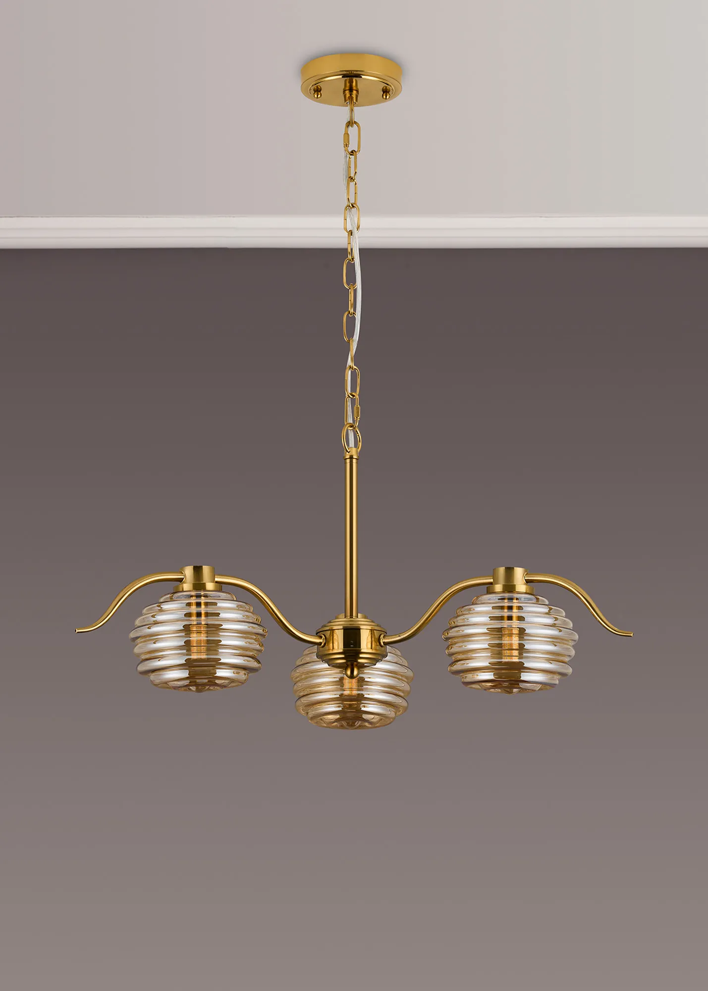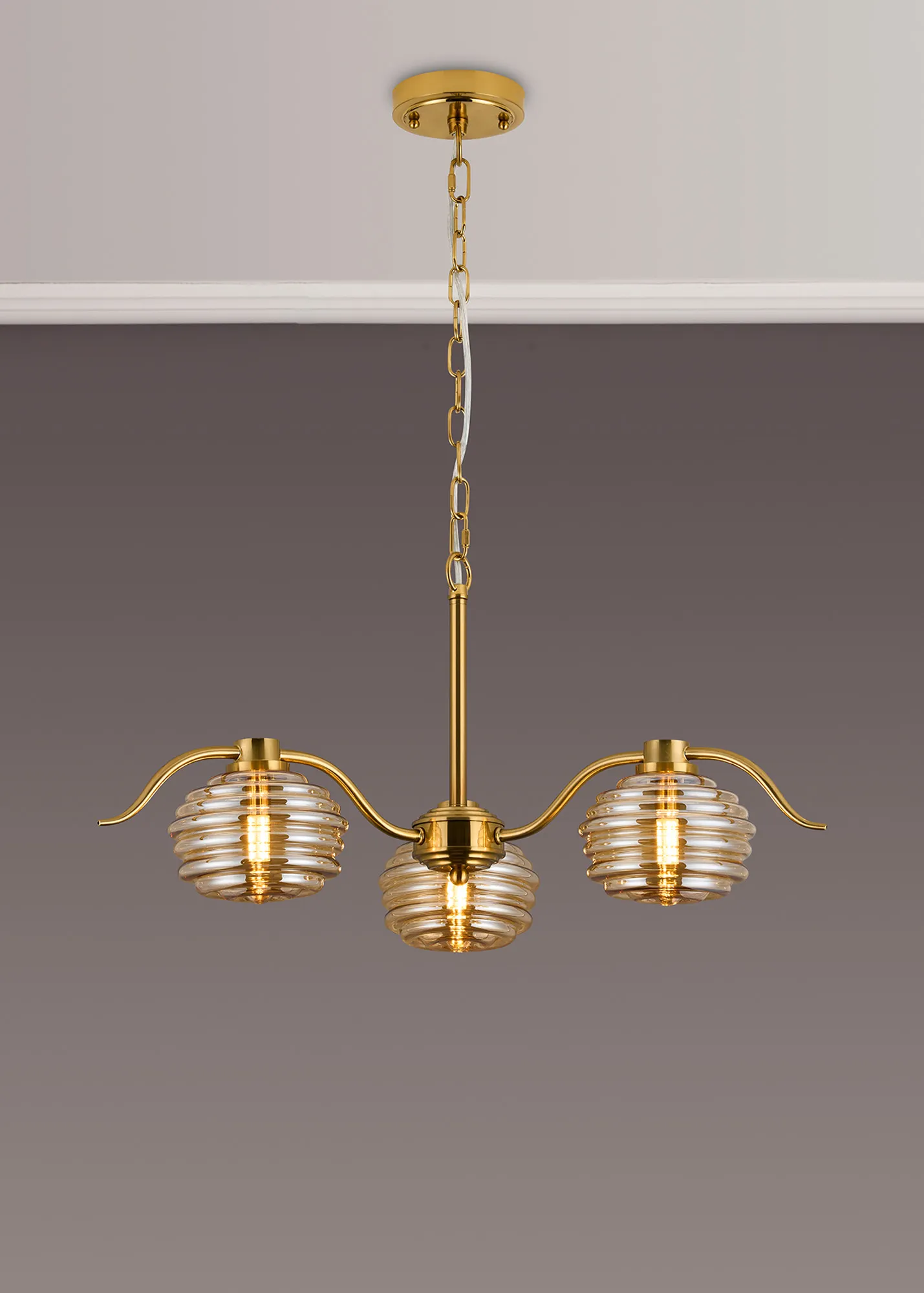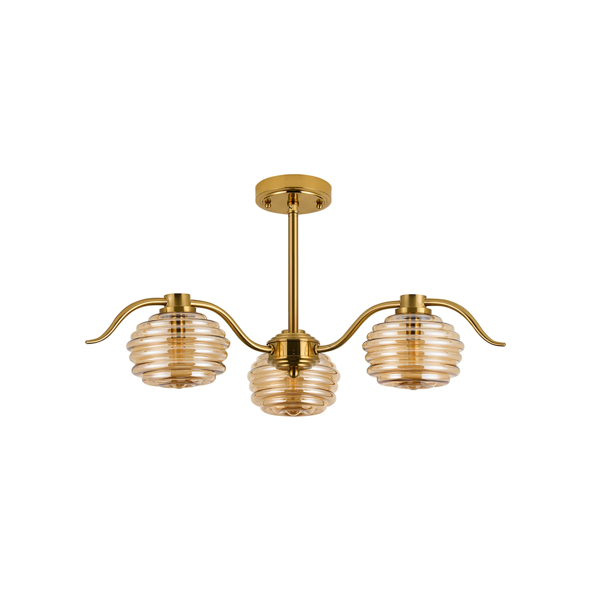 OTHER Penticton 3 Light Multi Arm Pendant/Semi Flush With 160mm Glass, Brass/Amber