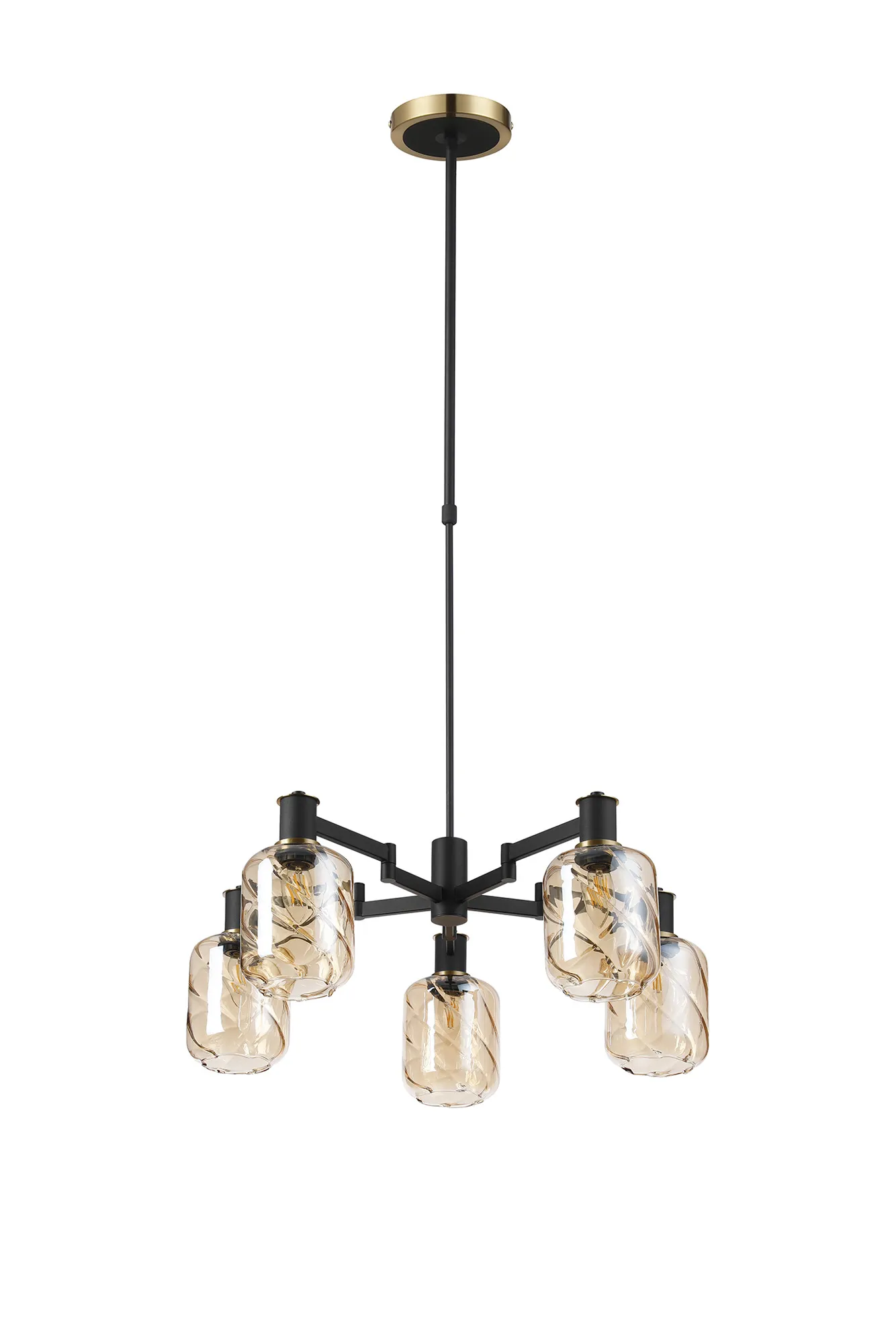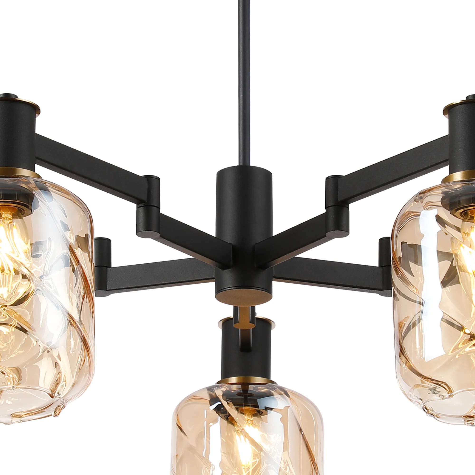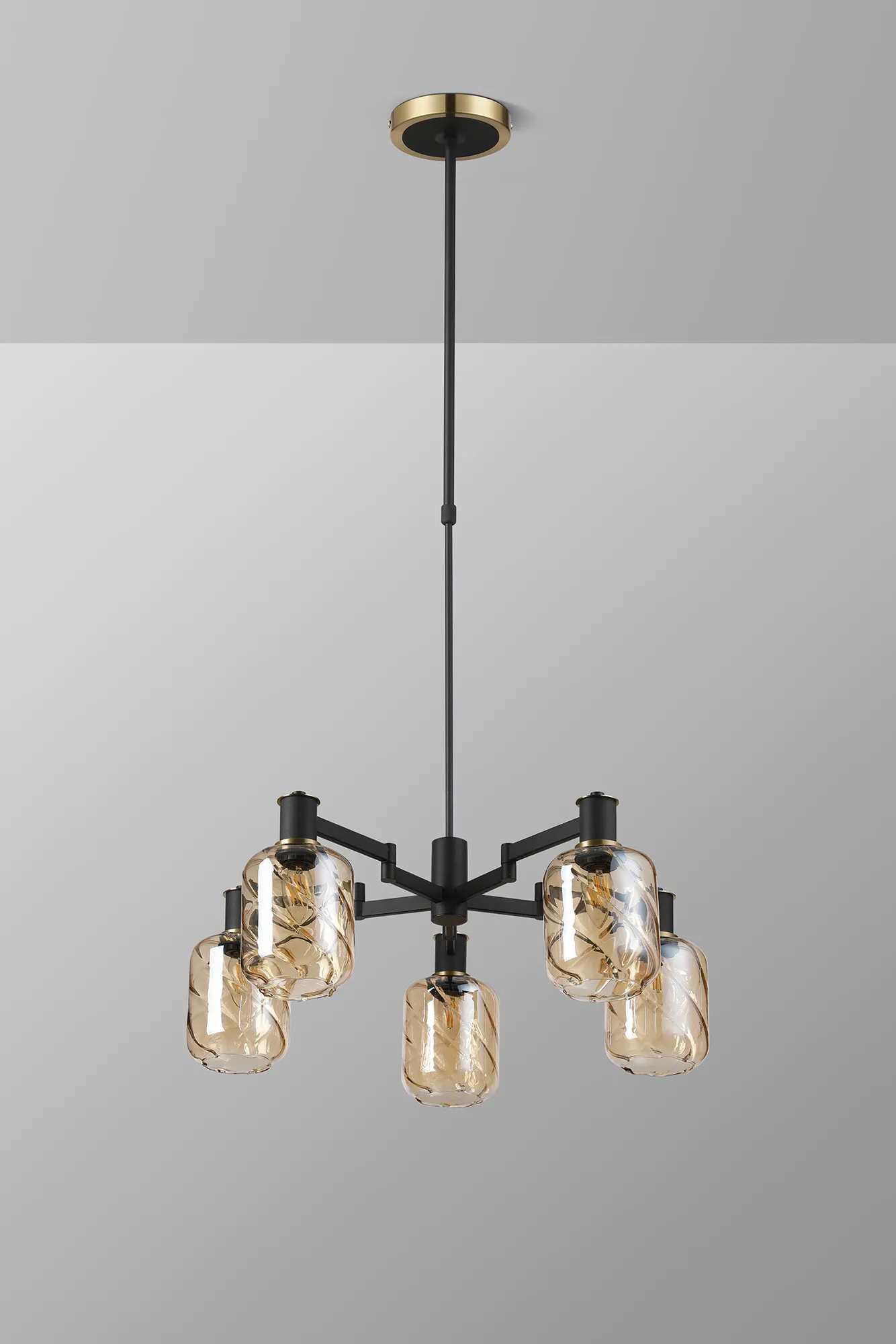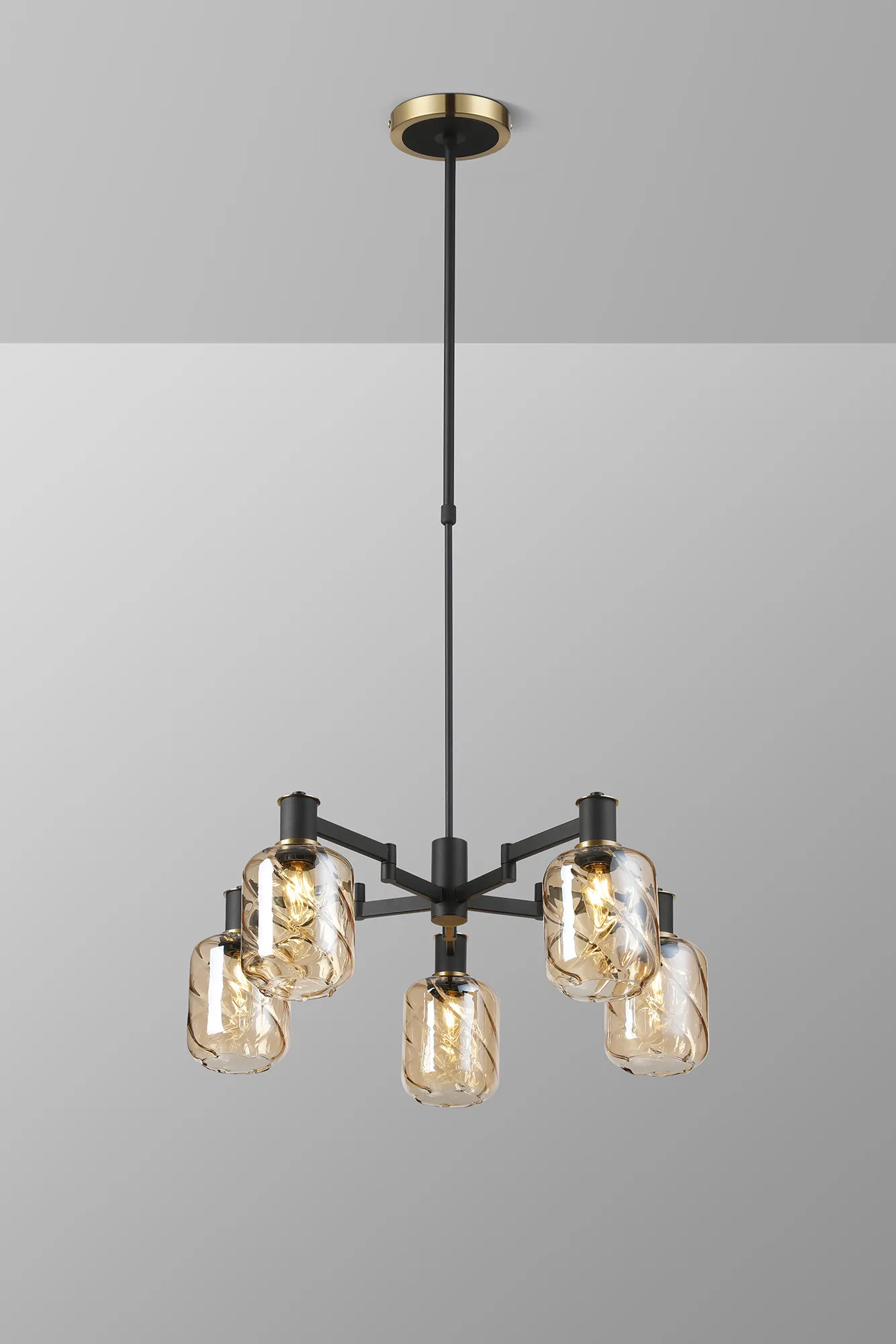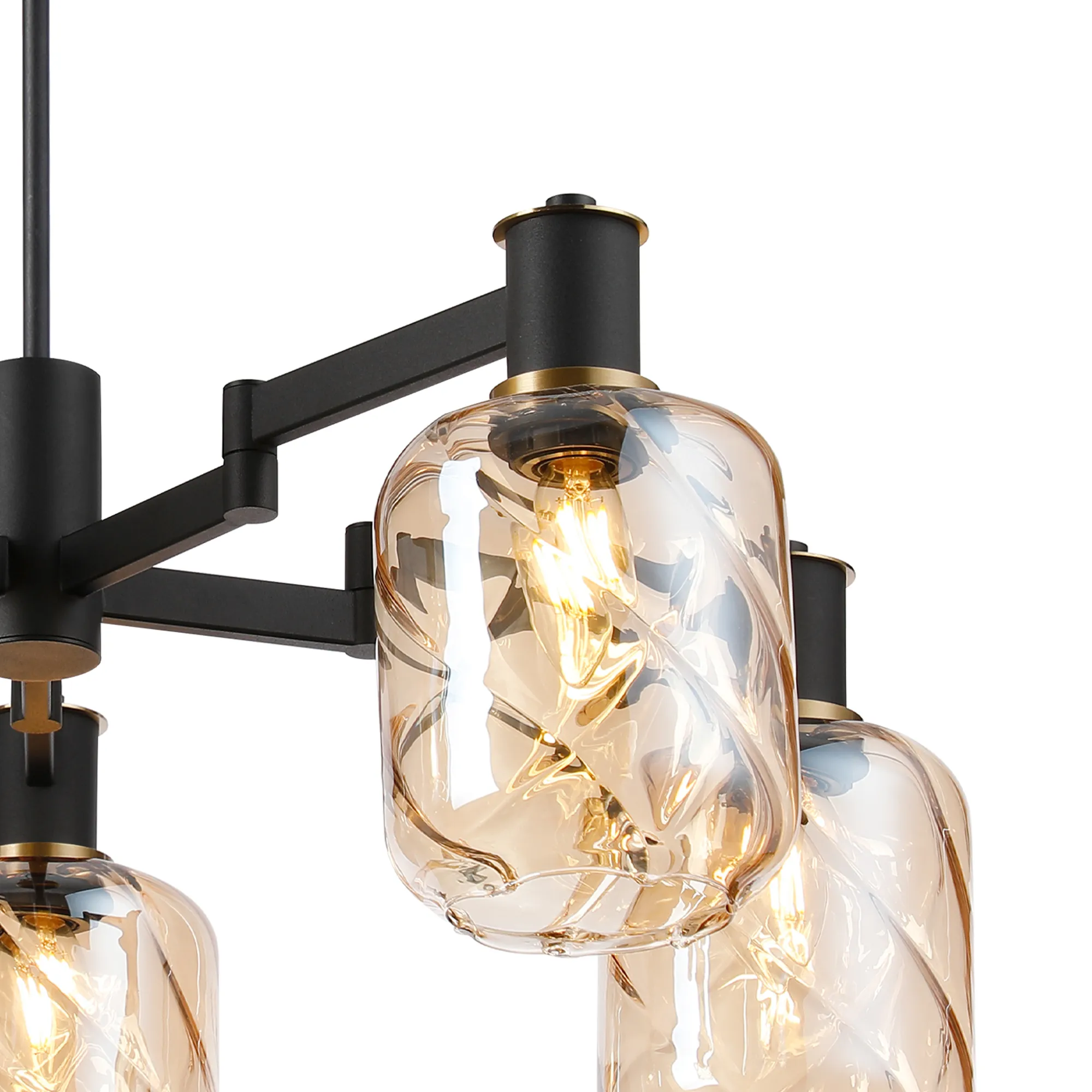 Alberni Swing Arm Telescopic Linear Pendant 6 x E14 Brass/Satin Black/Amber Uniform Dimple Cylinder Glass