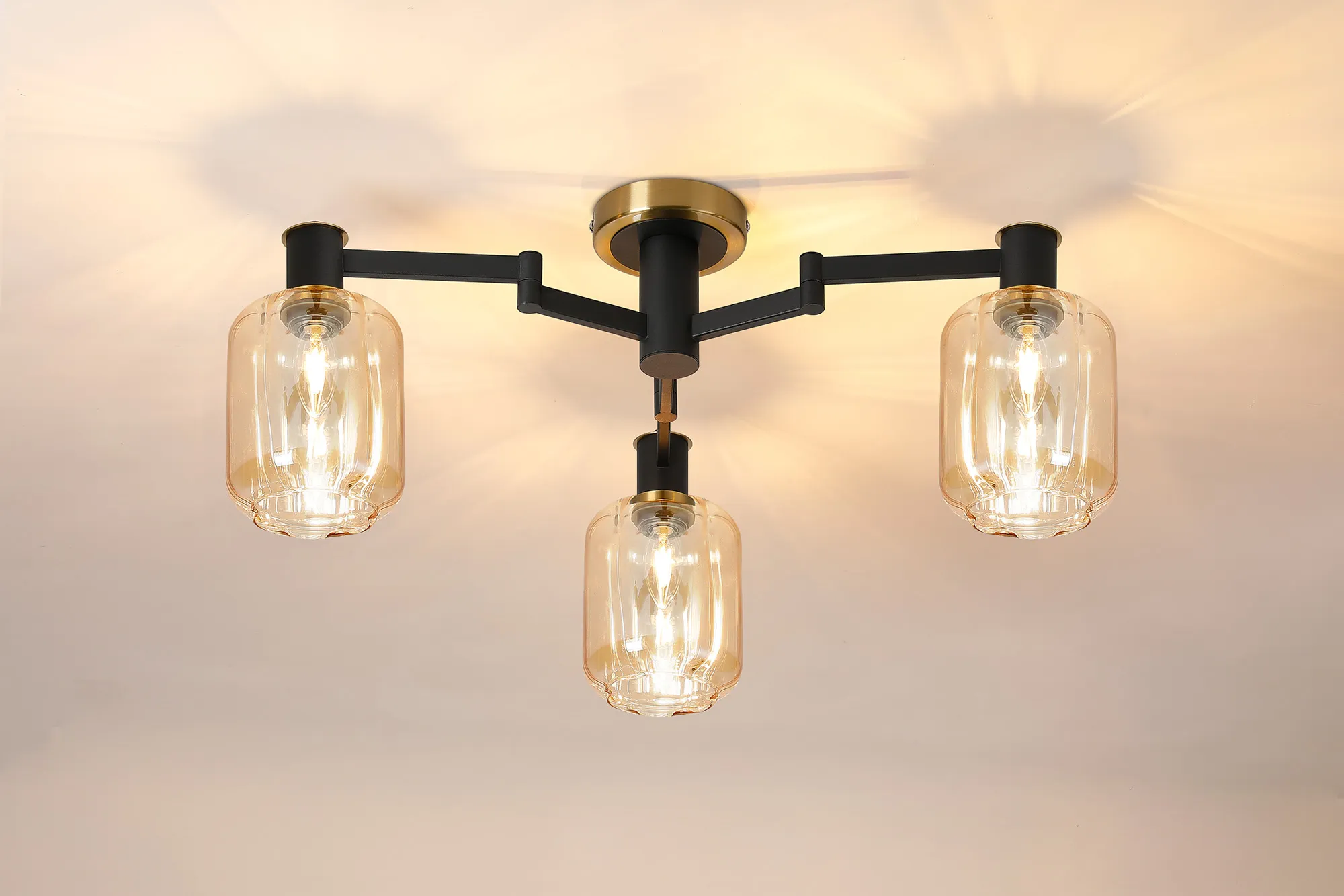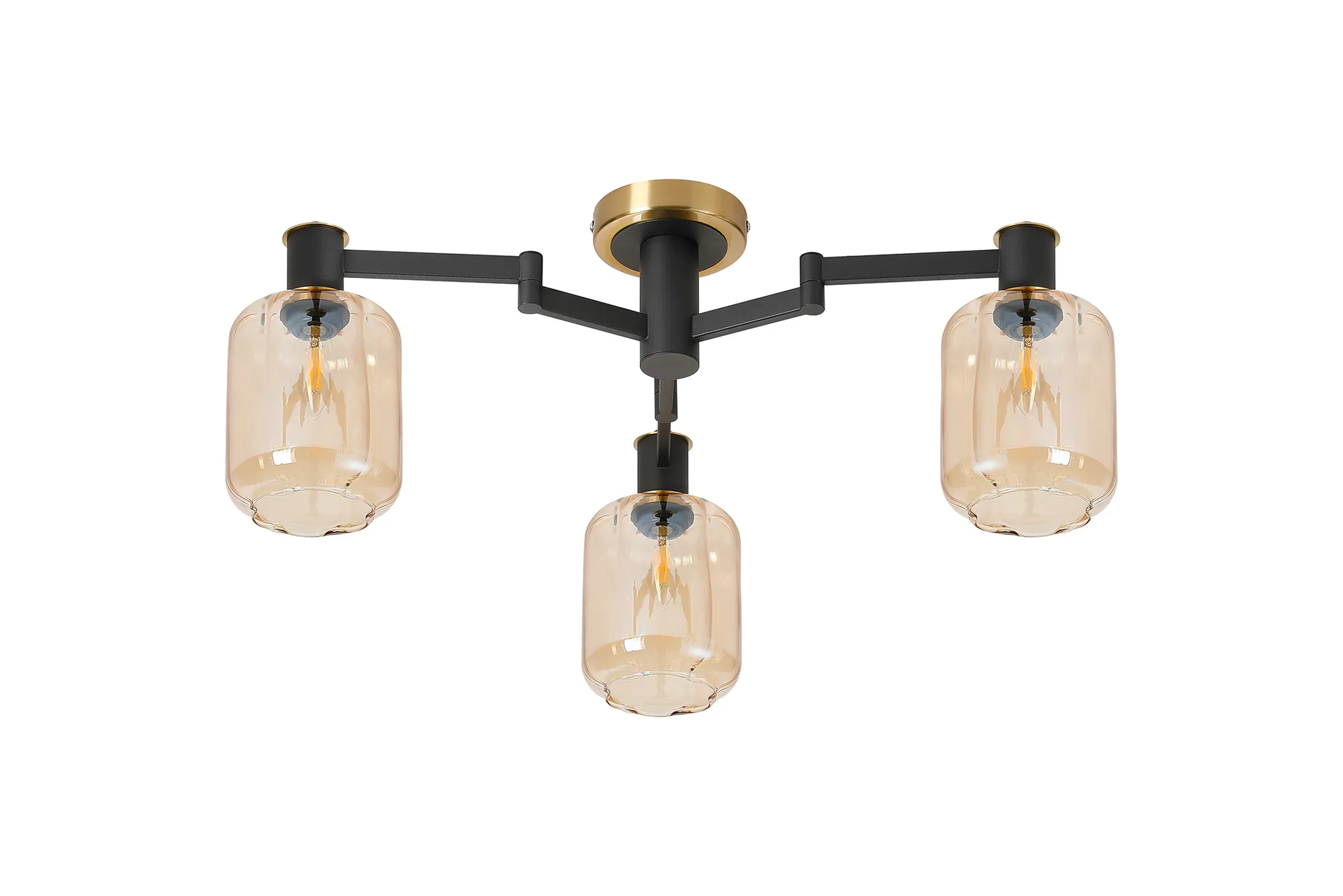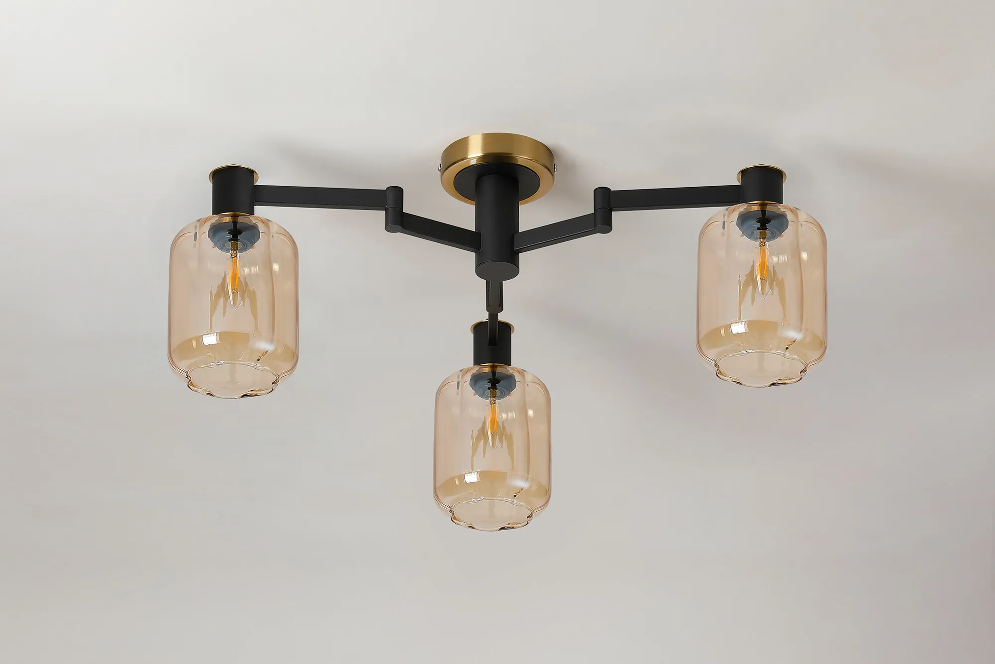 OTHER Alberni Swing Arm Flush Ceiling 3 x E14 Brass/Satin Black/Amber Striped Cylinder Glass