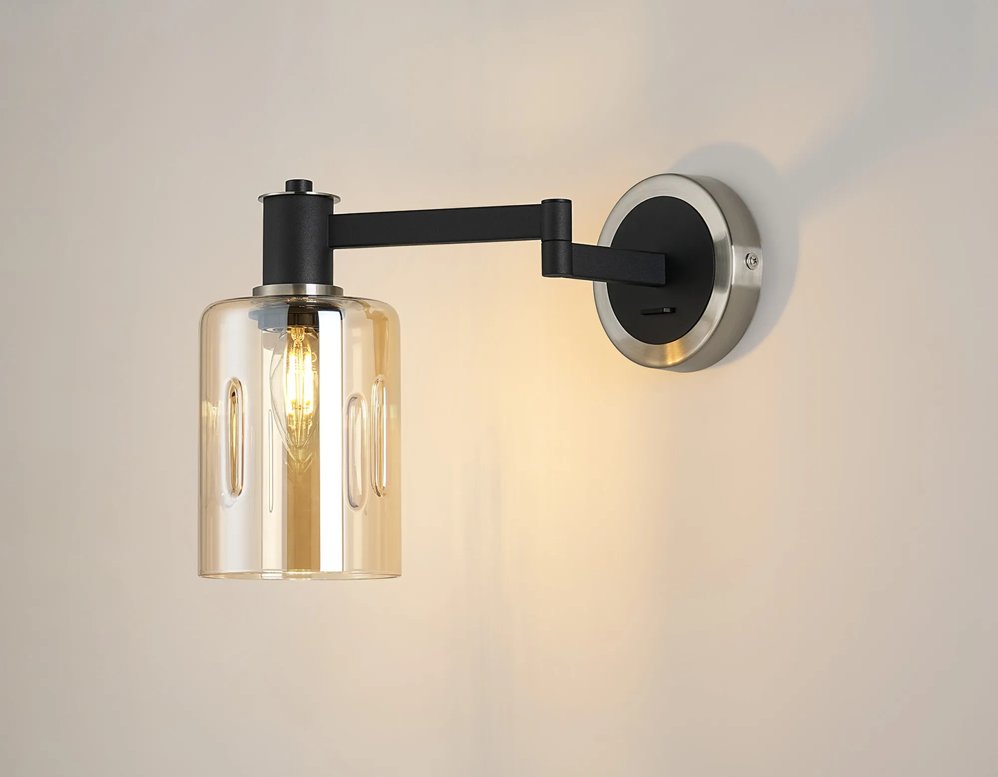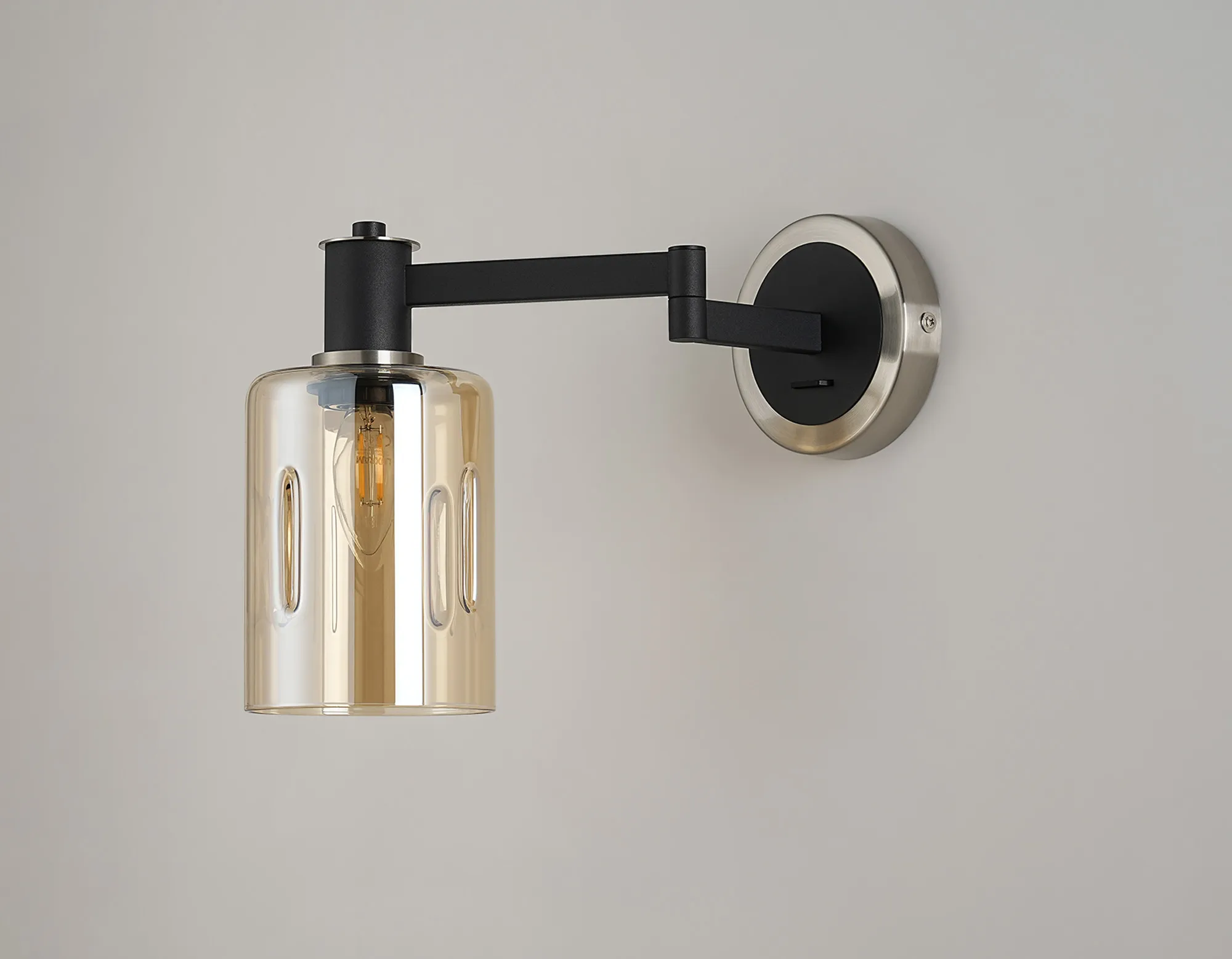 OTHER Alberni Adjustable Swing Arm Wall x 1 x E14 Satin Nickel/Satin Black/Amber Uniform Dimple Cylinder Glass