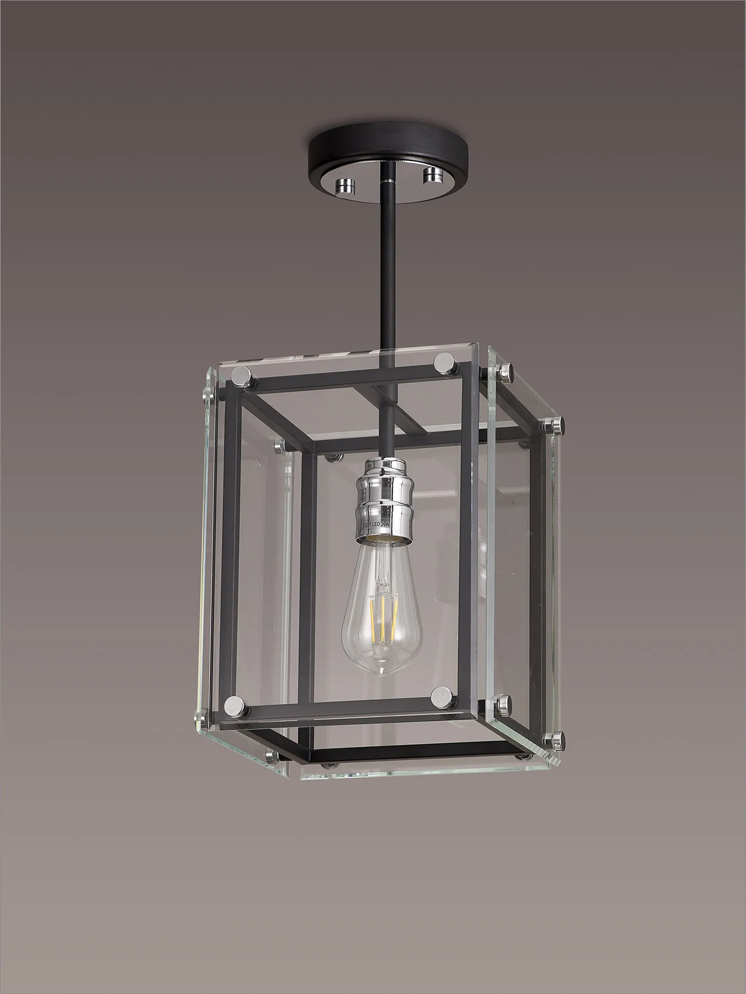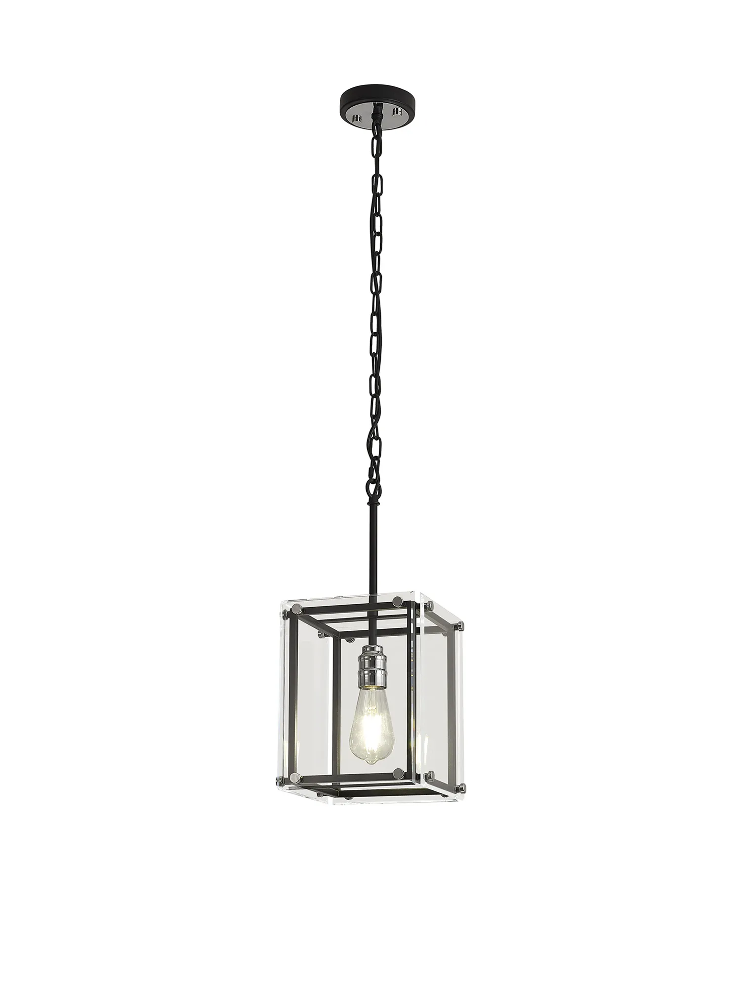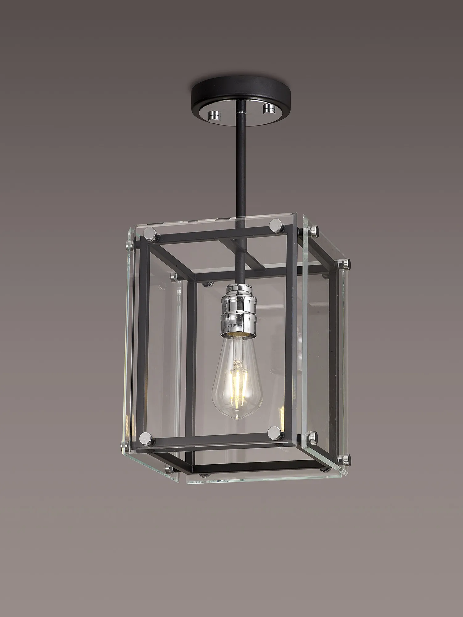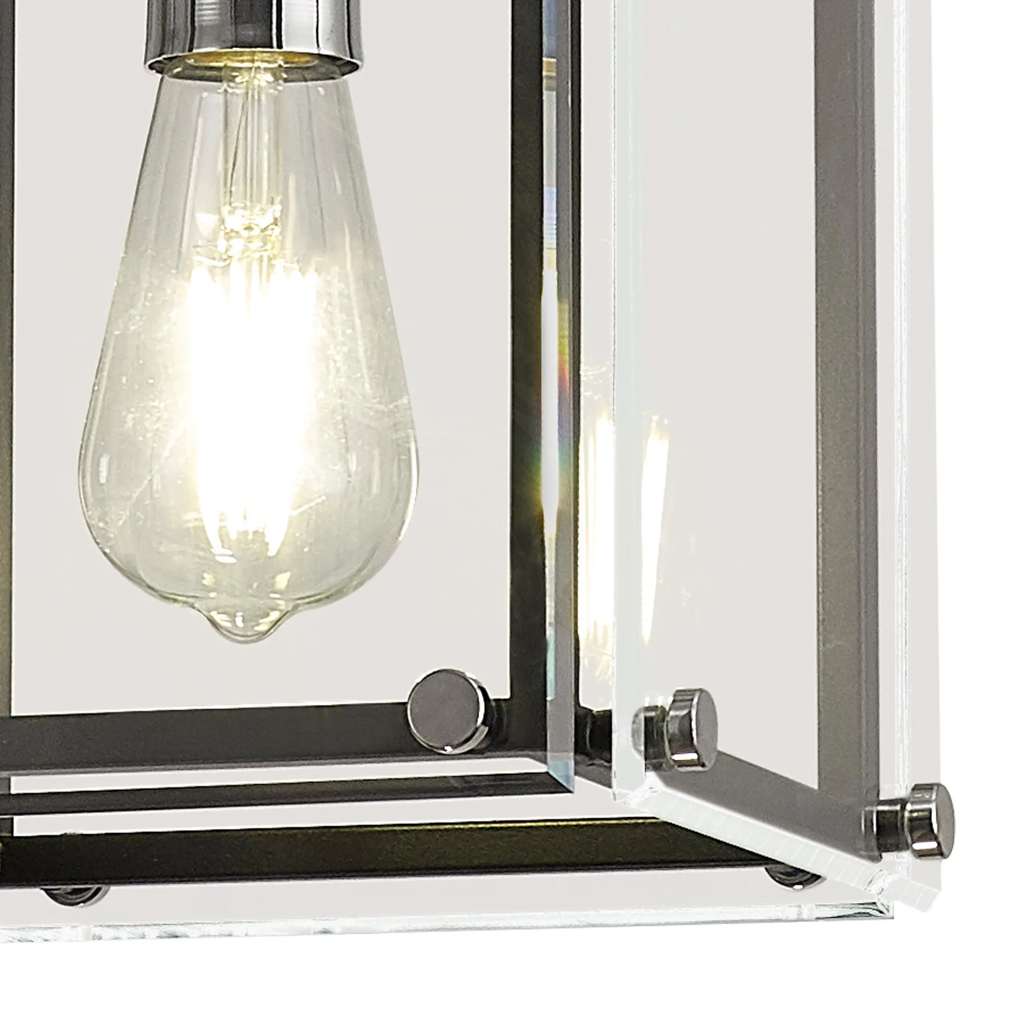 George is a contemporary range of square glass pendants with complementing flush, semi flush and wall light fixtures. The intricate design details of this range see the matt black colour finish accentuated by the polished chrome components. This added attractive, contrasting detail applies a modern twist to an otherwise traditional concept; suitable for a wide range of settings. The open spaces between the framework are filled with high quality clear glass panes to further reflect the light from the E27 lamp holders.