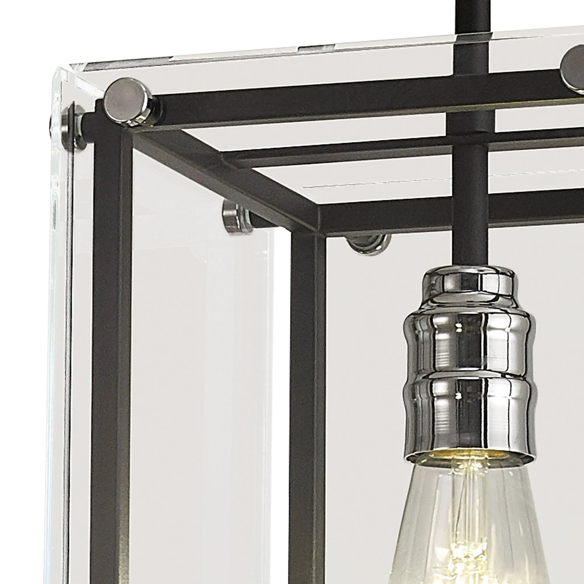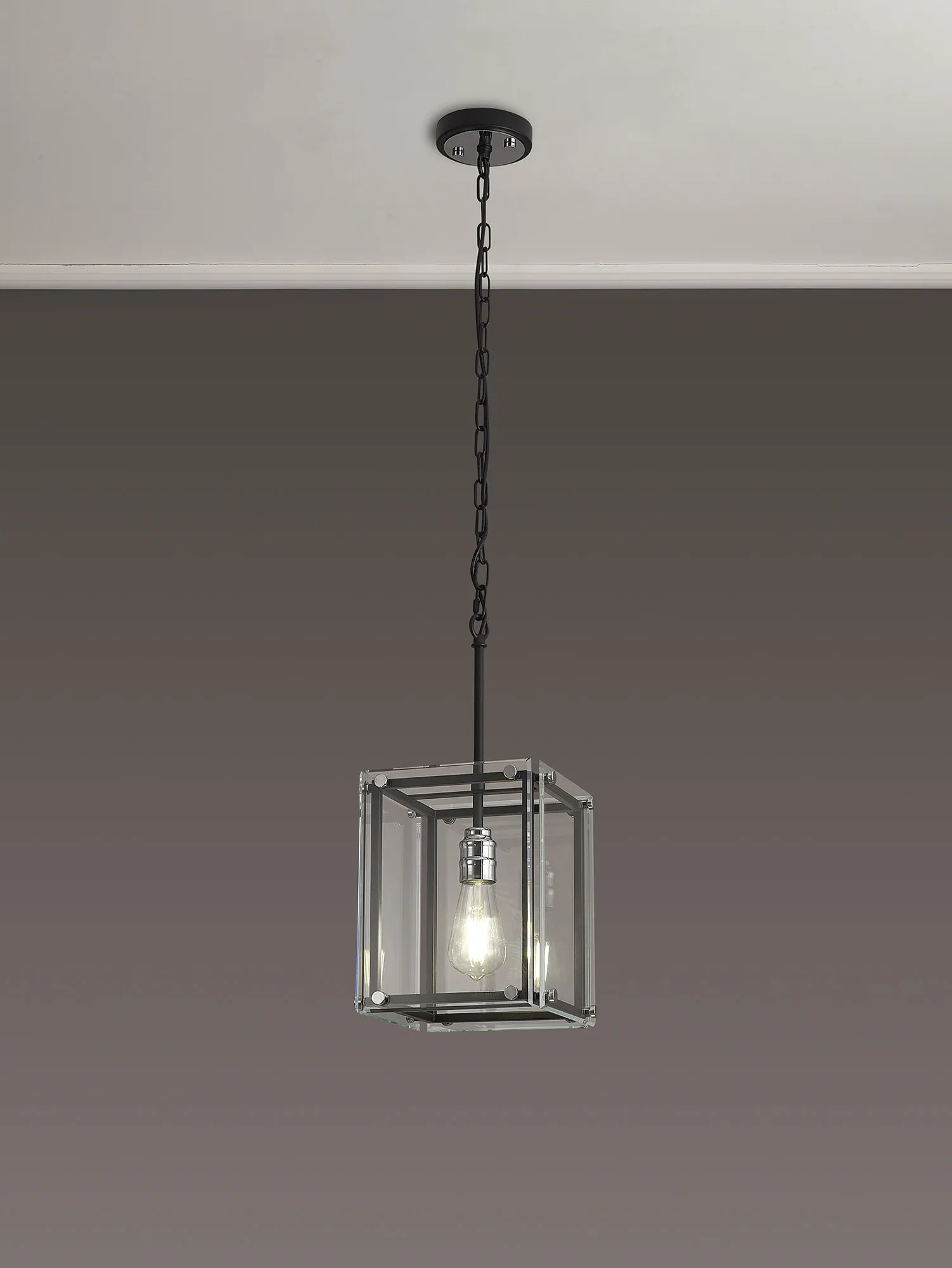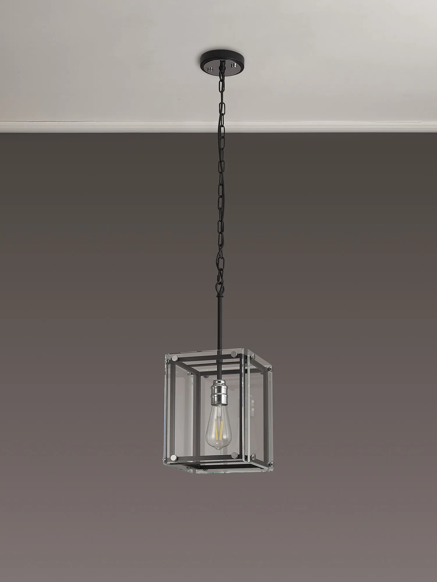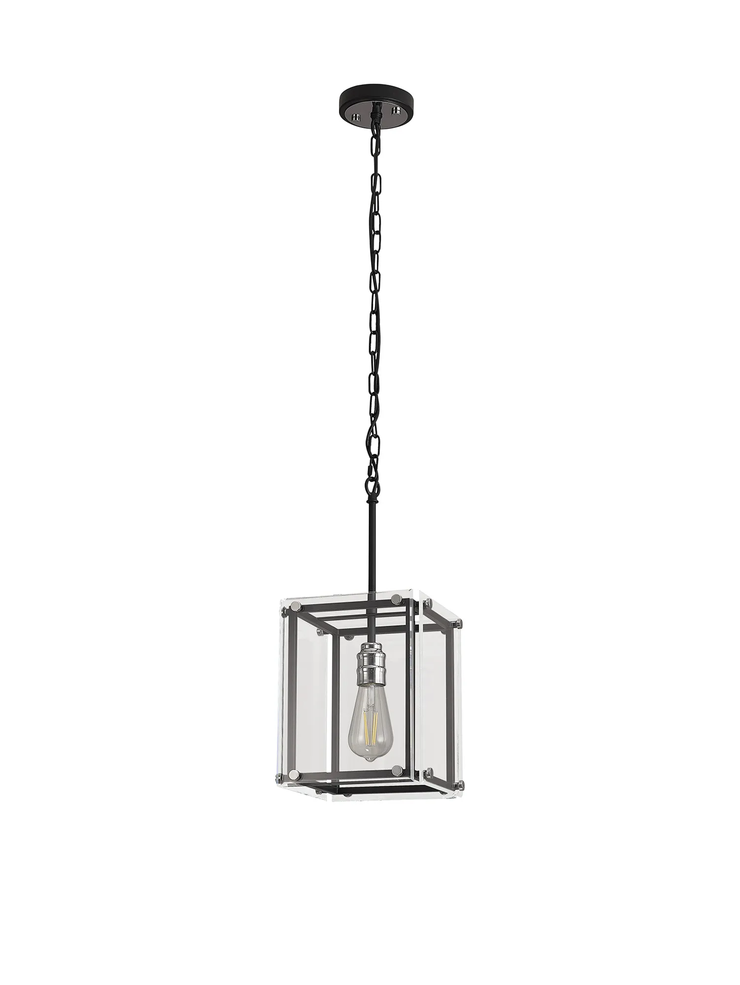 George is a contemporary range of square glass pendants with complementing flush, semi flush and wall light fixtures. The intricate design details of this range see the matt black colour finish accentuated by the polished chrome components. This added attractive, contrasting detail applies a modern twist to an otherwise traditional concept; suitable for a wide range of settings. The open spaces between the framework are filled with high quality clear glass panes to further reflect the light from the E27 lamp holders.