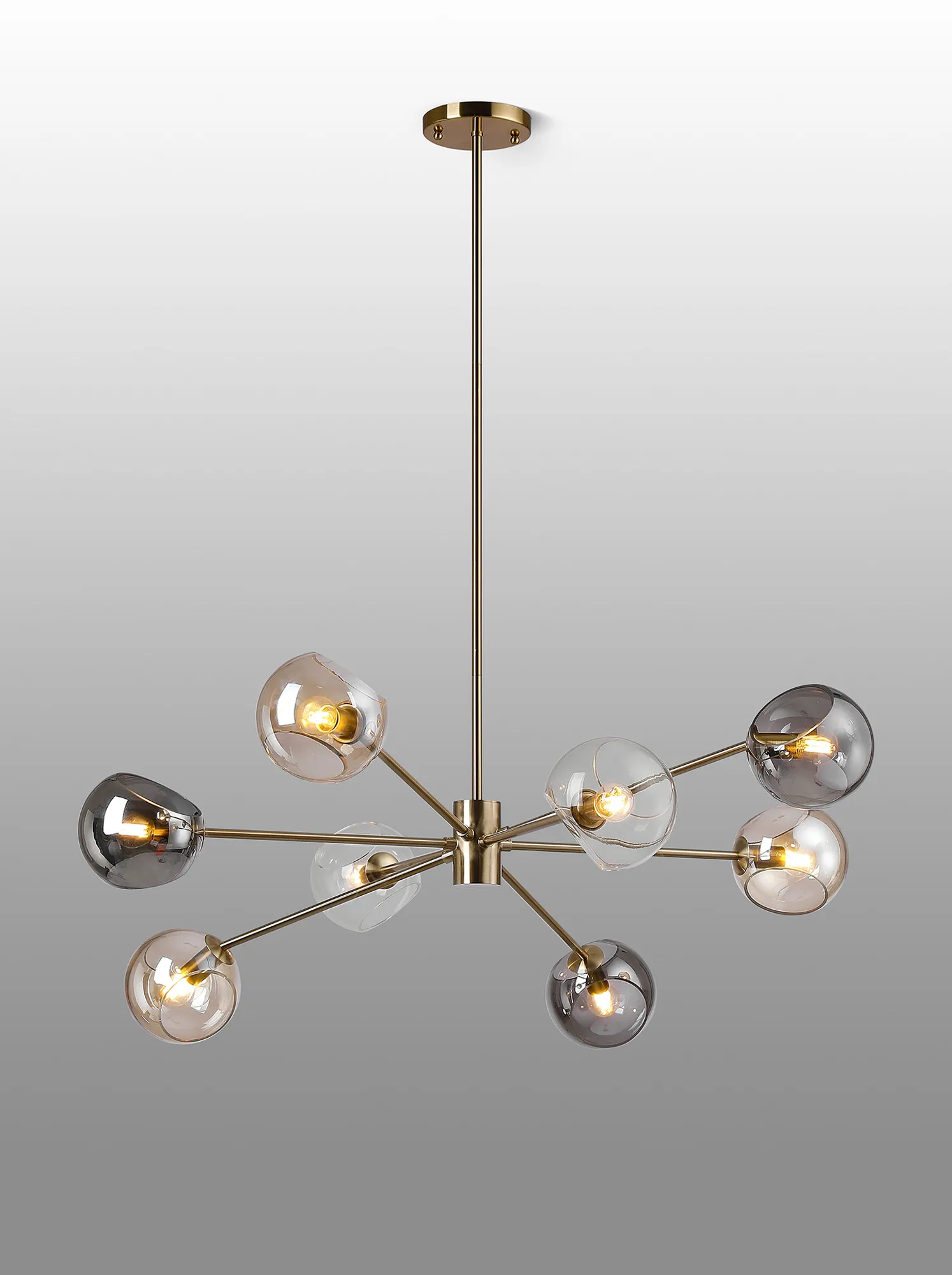 The Revelstoke collection offers a range of lighting options including E14 single and multi-drop pendants. Each piece is complemented by matching wall, floor, and table lamps. You can choose from three distinctive finishes: antique gold, satin black, or satin nickel. The collection features angled double-cut glass shades, available in an array of exquisite finishes such as blue, cognac, frosted, gold, iridescent, clear and smoked.