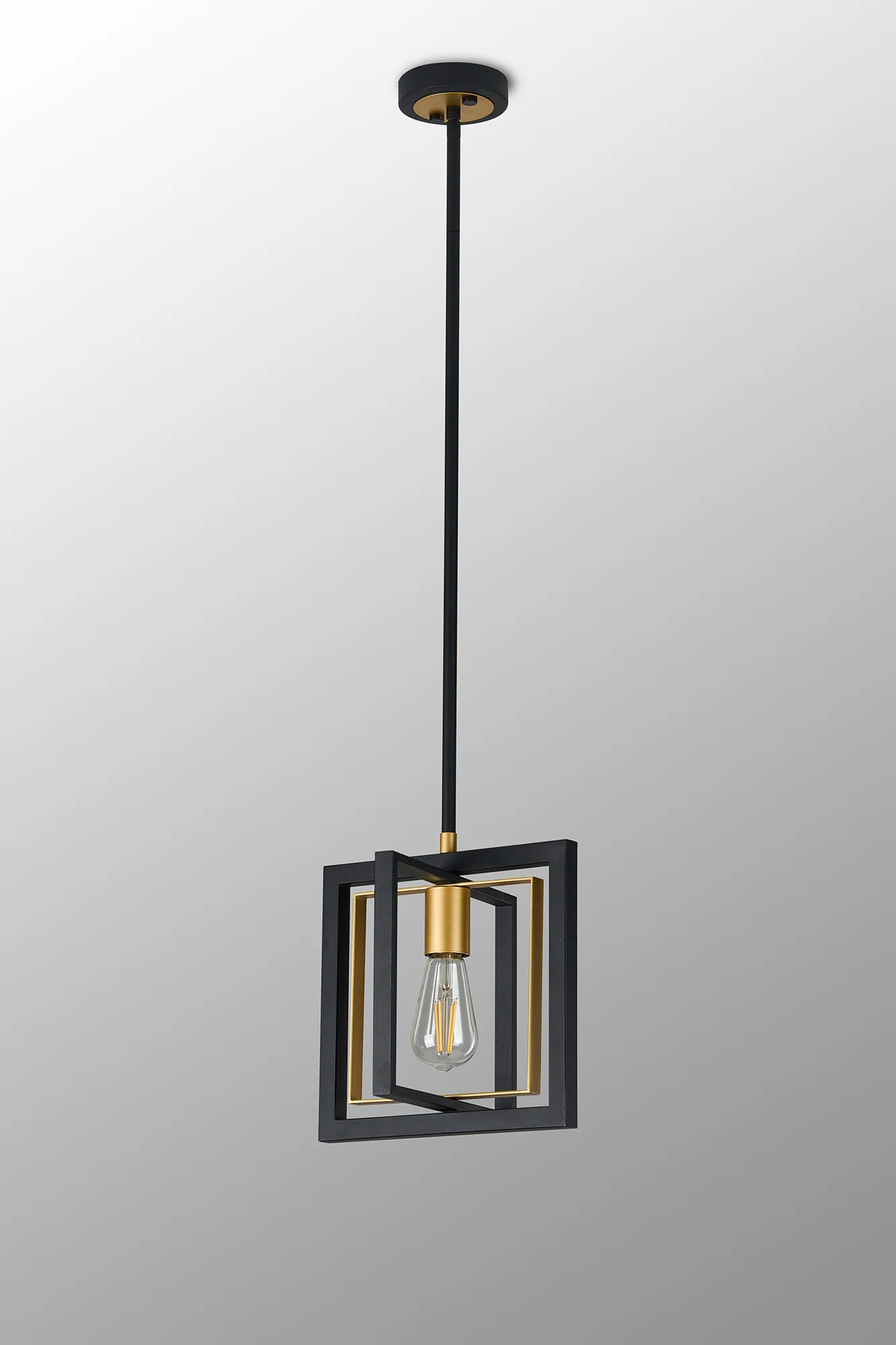 One of the earliest methods of lighting was illuminating a room by sitting candles within a hanging frame, this concept has been taken to create the contemporary collection Terrace. The satin black and champagne gold colour combination gives this selection of pendants, wall, table and floor lamp a contrasting antique feel whilst the rectangular and square shapes used to construct the frames bring modern elements to this E27 range.