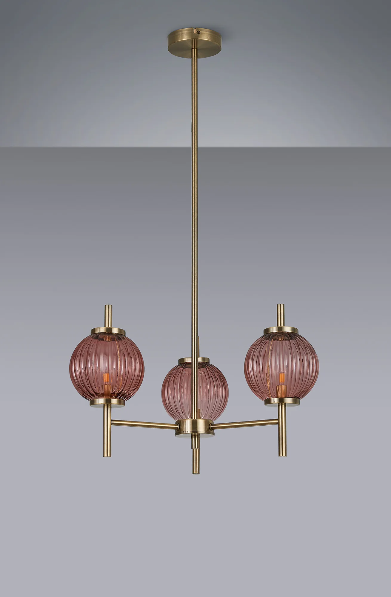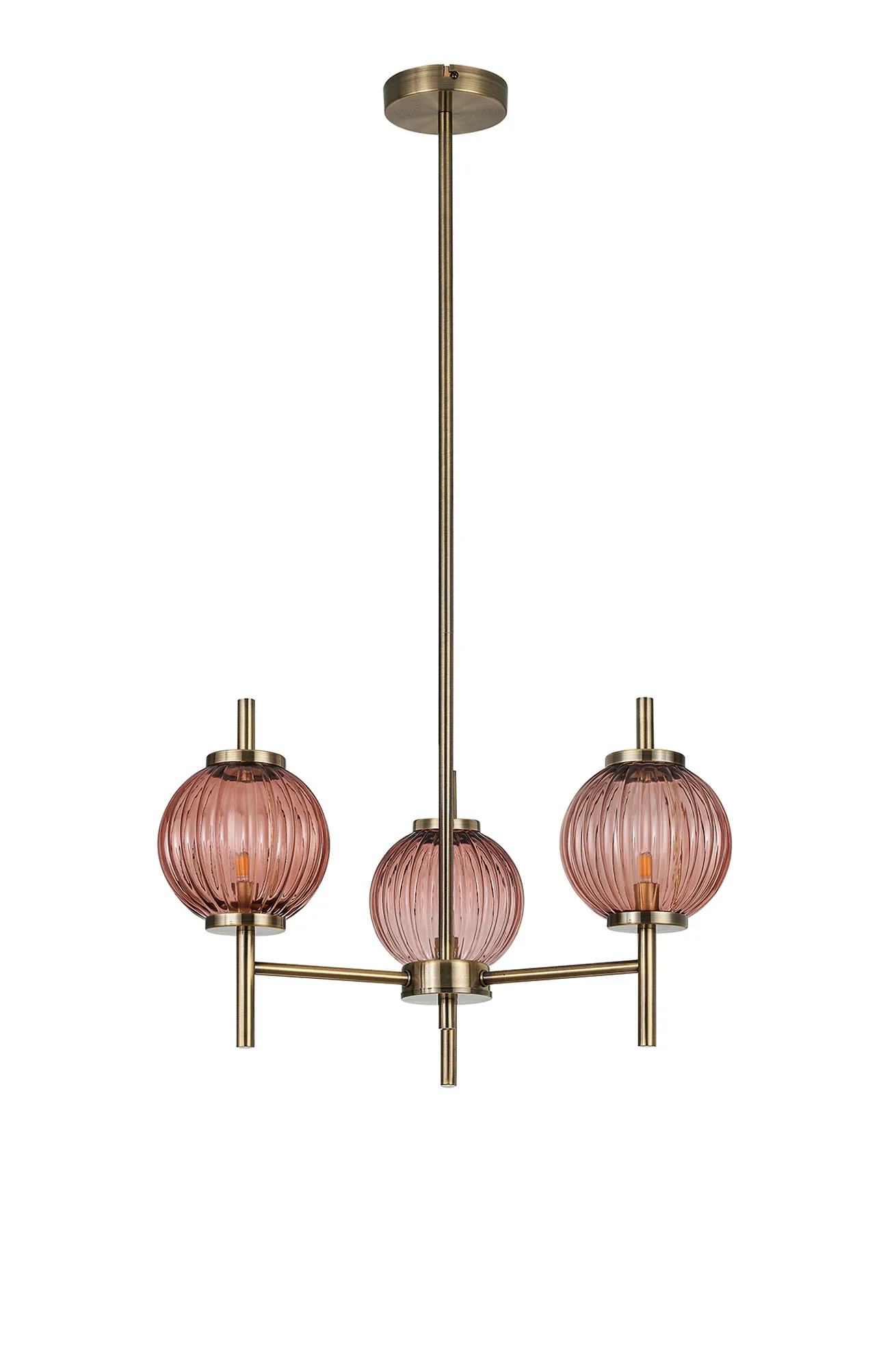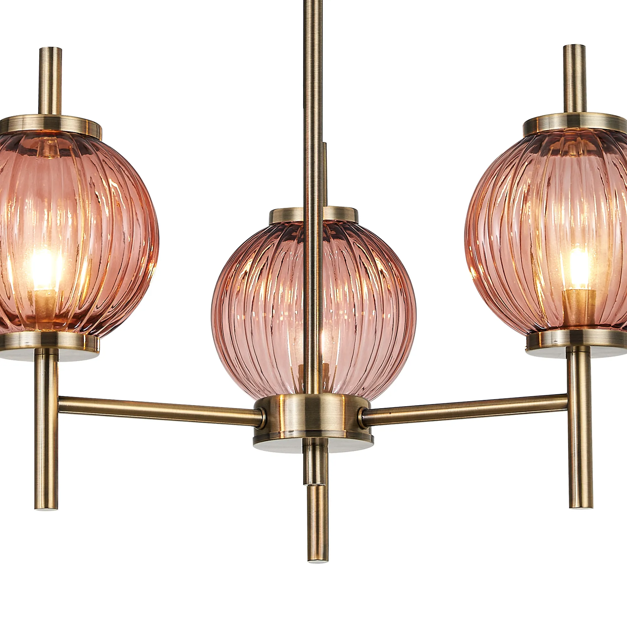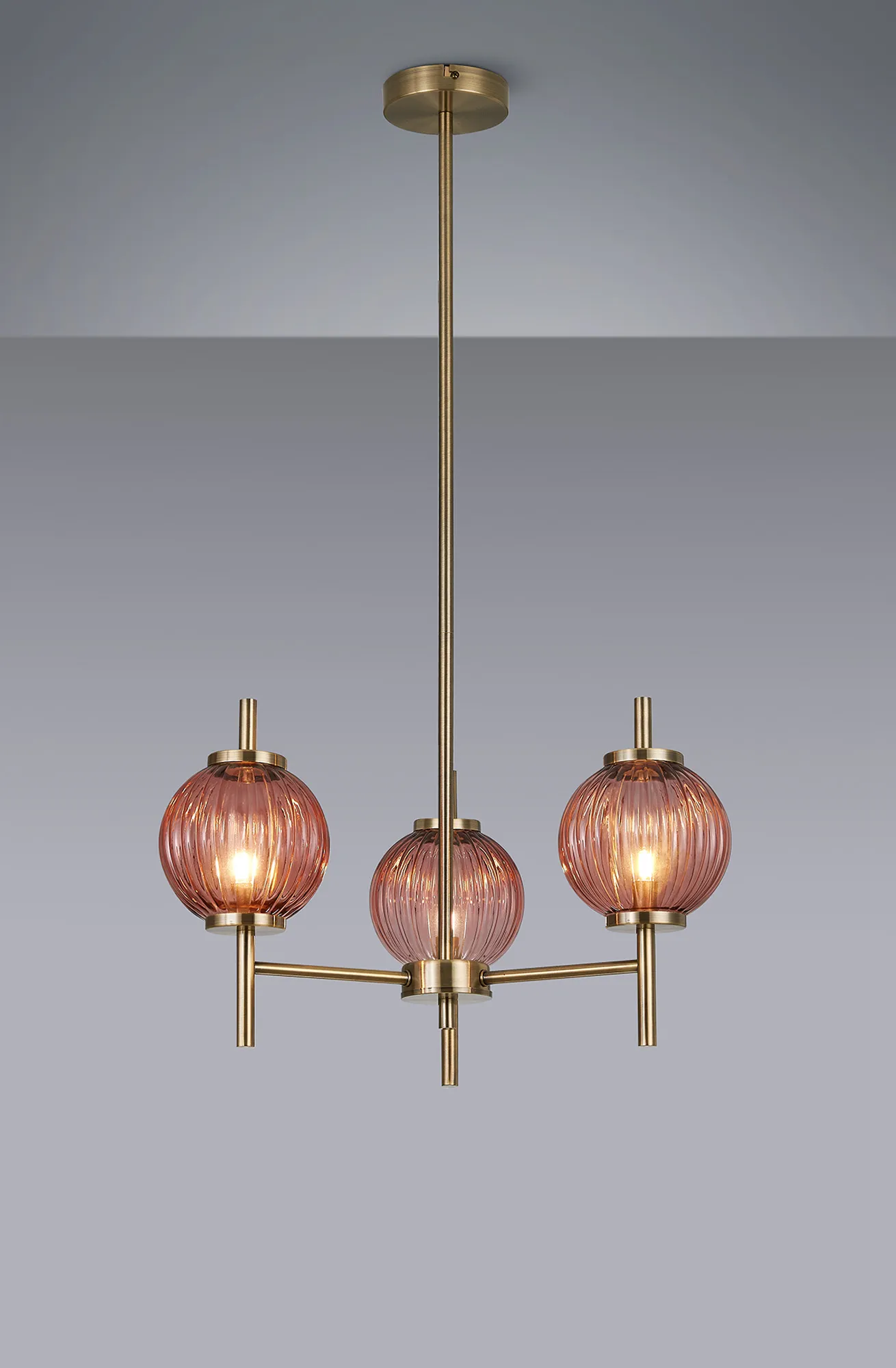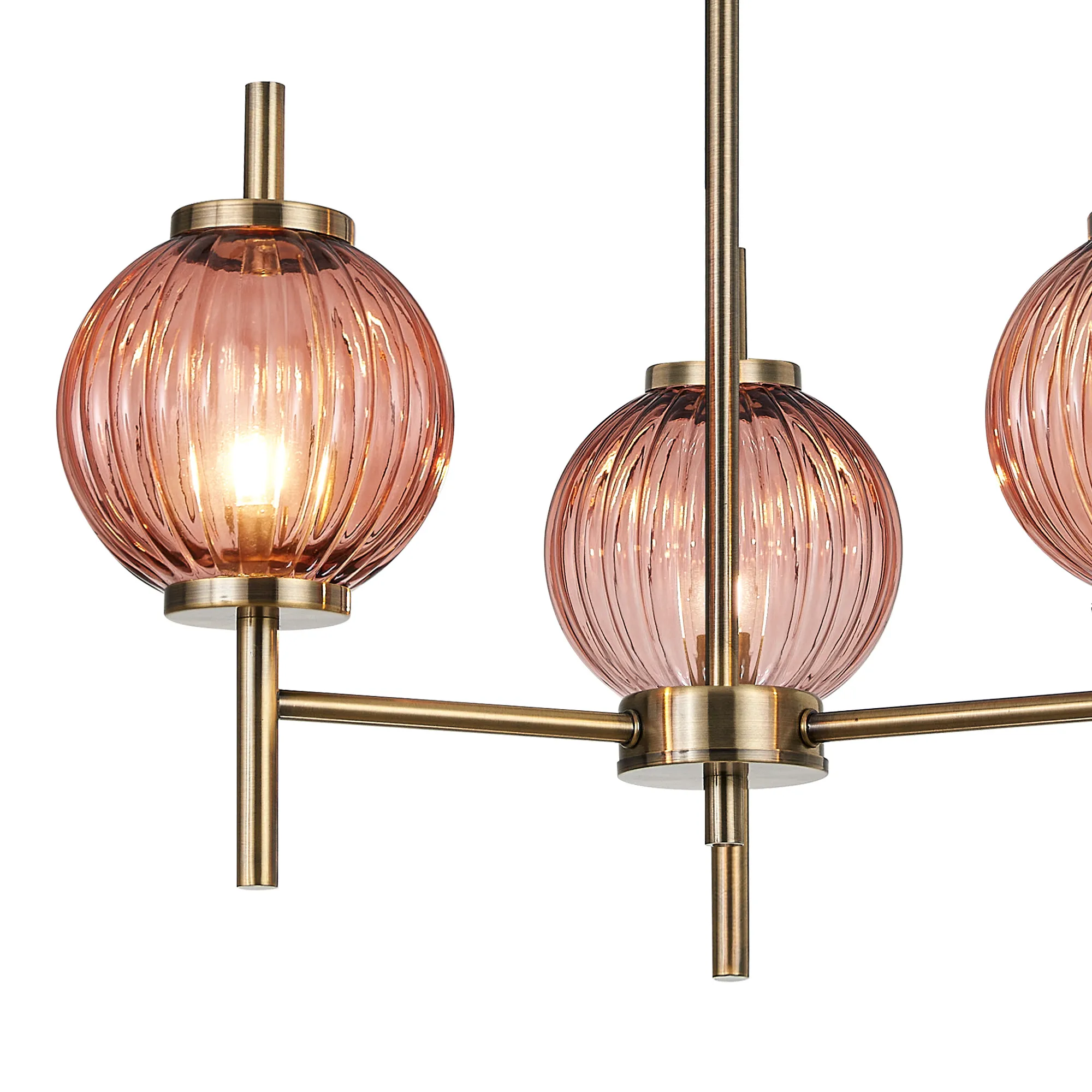 The pendant, table and floor lamp featured in the Leigh range host a range of colour combinations with their globe glass; colourful and playful with Blue, Pink and Green or subtle and sleek with Smoke and Amber. These glass pieces, encircling the G9 lamp holders, have a ridged moulding enhancing the luminous sheen given off their coloured tint. The glass fixes to the slim tubular stem, finished in antique brass, in such a way that imitates beads being threaded along string. This peculiar composition can be partnered with one of the two wall lamps available with either a smoked or amber glass to tie in with the pendant, table and floor lamp.