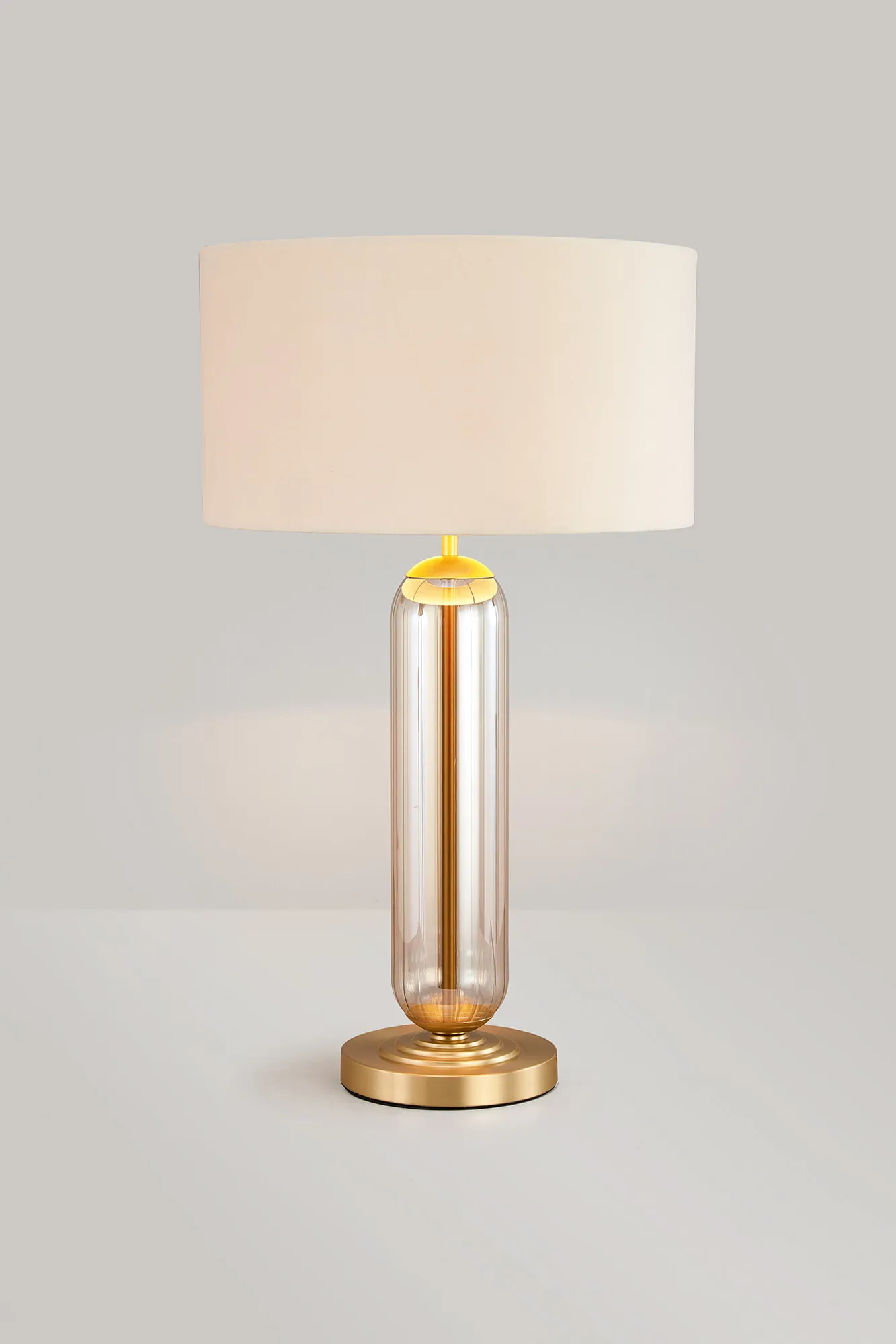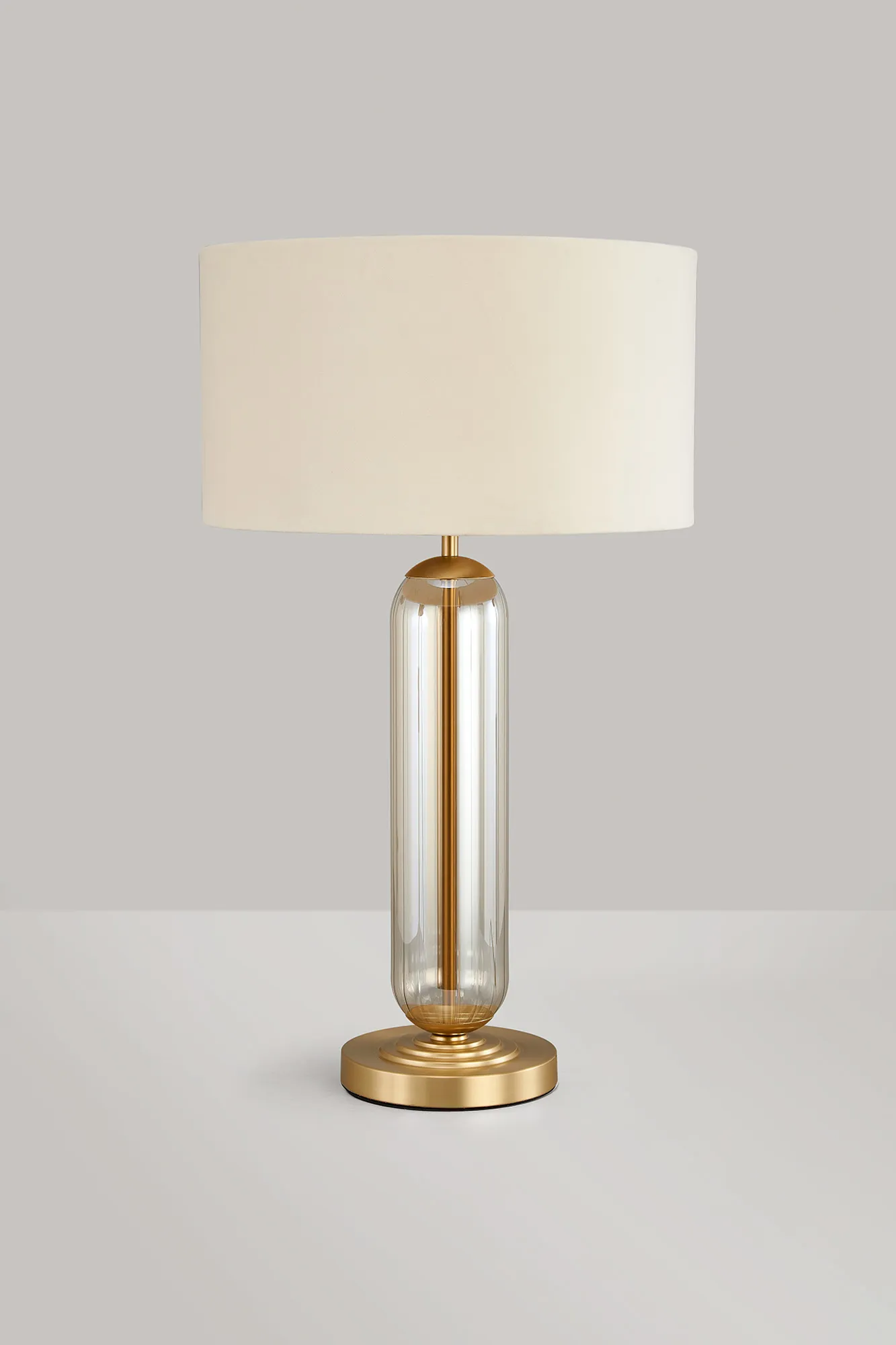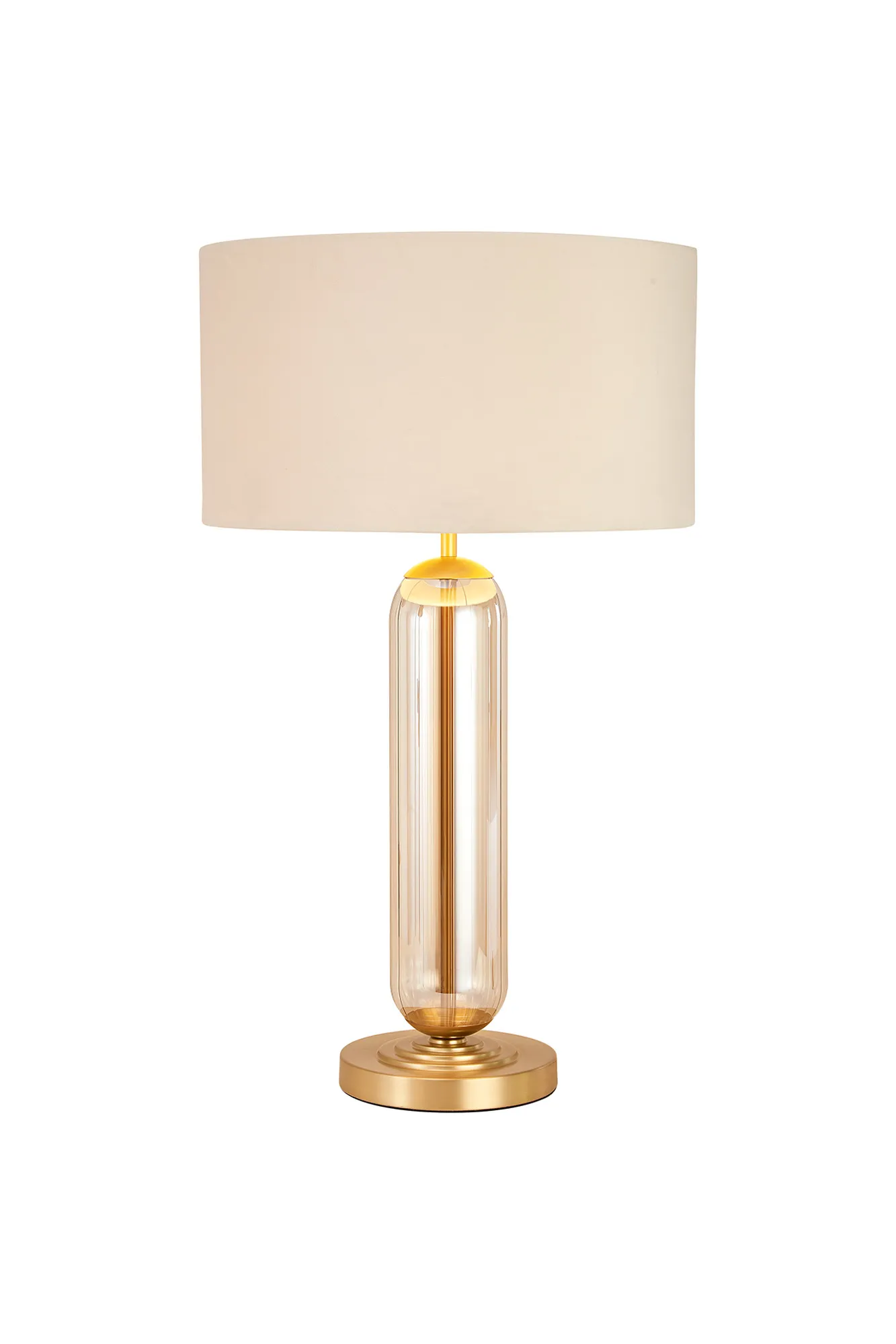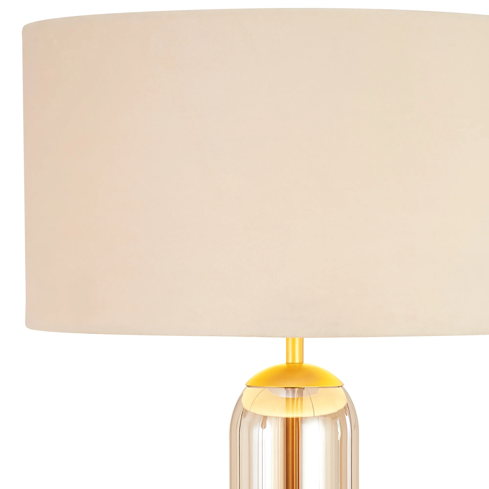 Thompson Tubular Table Lamp, 1 Light E27, Satin Gold/Cognac Glass/Aubergine 40cm Velvet Shade