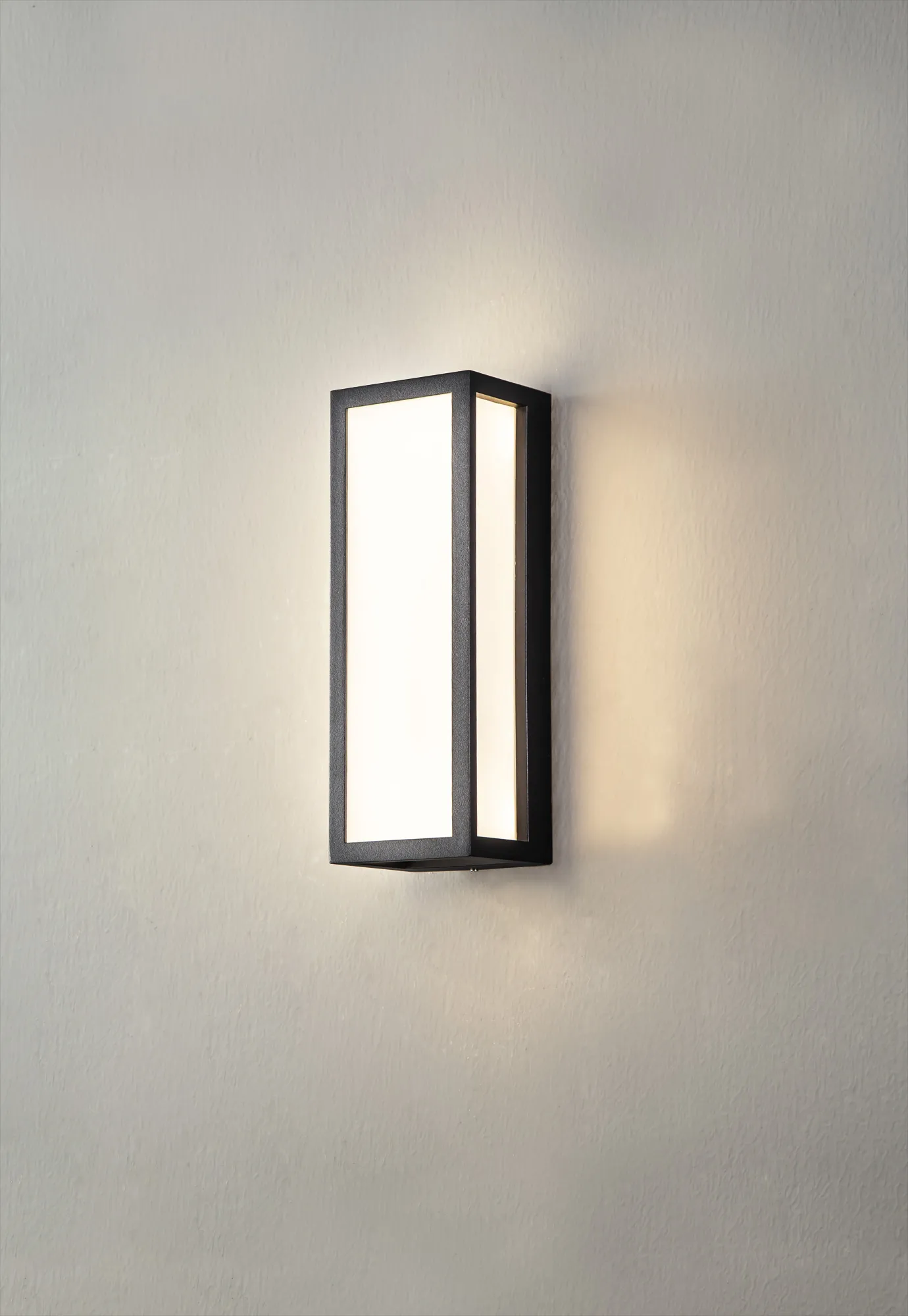 Each IP65 rated wall lamp in the Winkler range have a similar outer structure. The display casing concept sees a clear glass box housing the E27 lamp holders which is framed within an anthracite metal outline. Aswell as the one and two light E27 wall lights Winkler also includes and LED version with frosted diffuser to conceal the high quality integral LEDs.