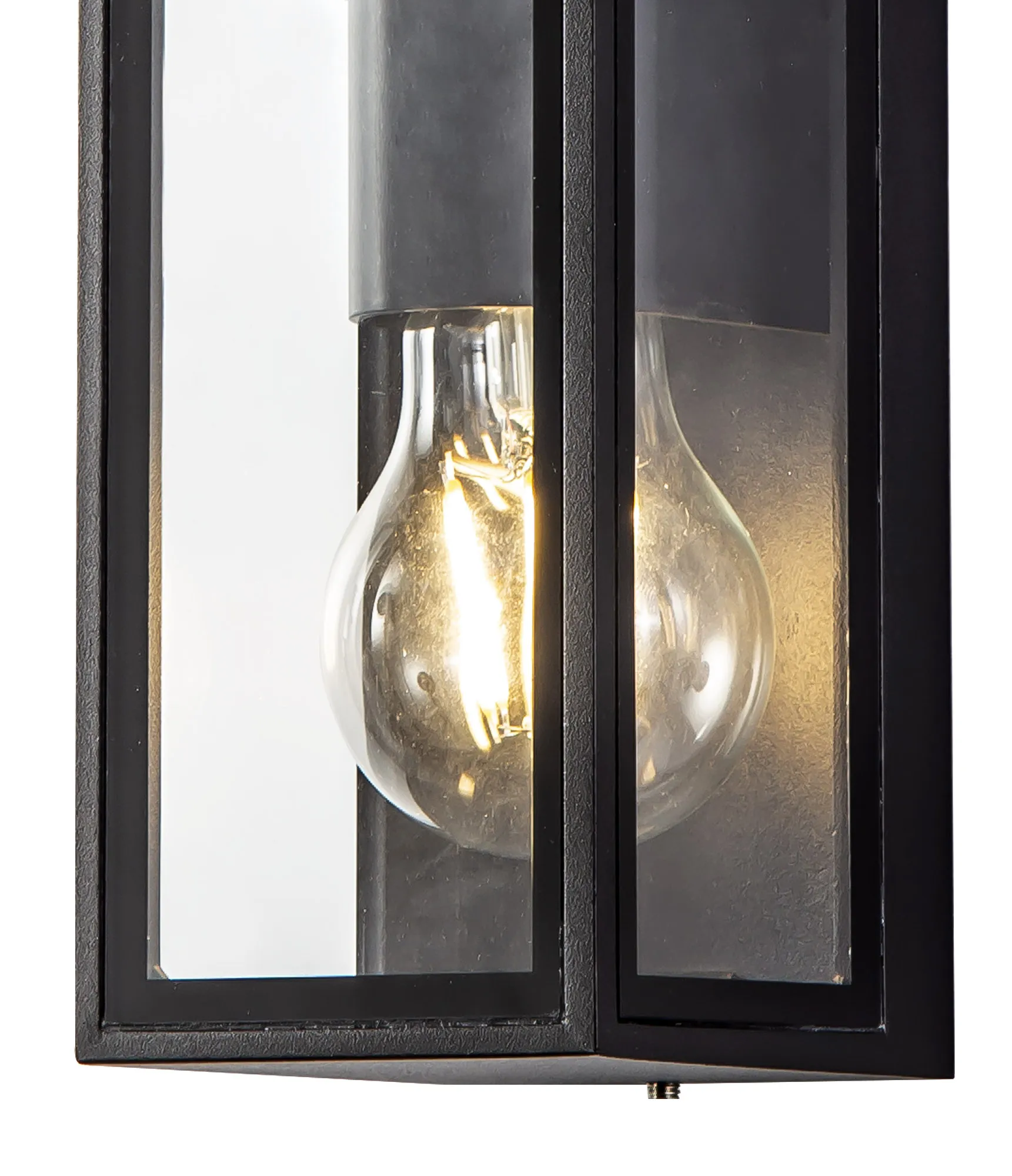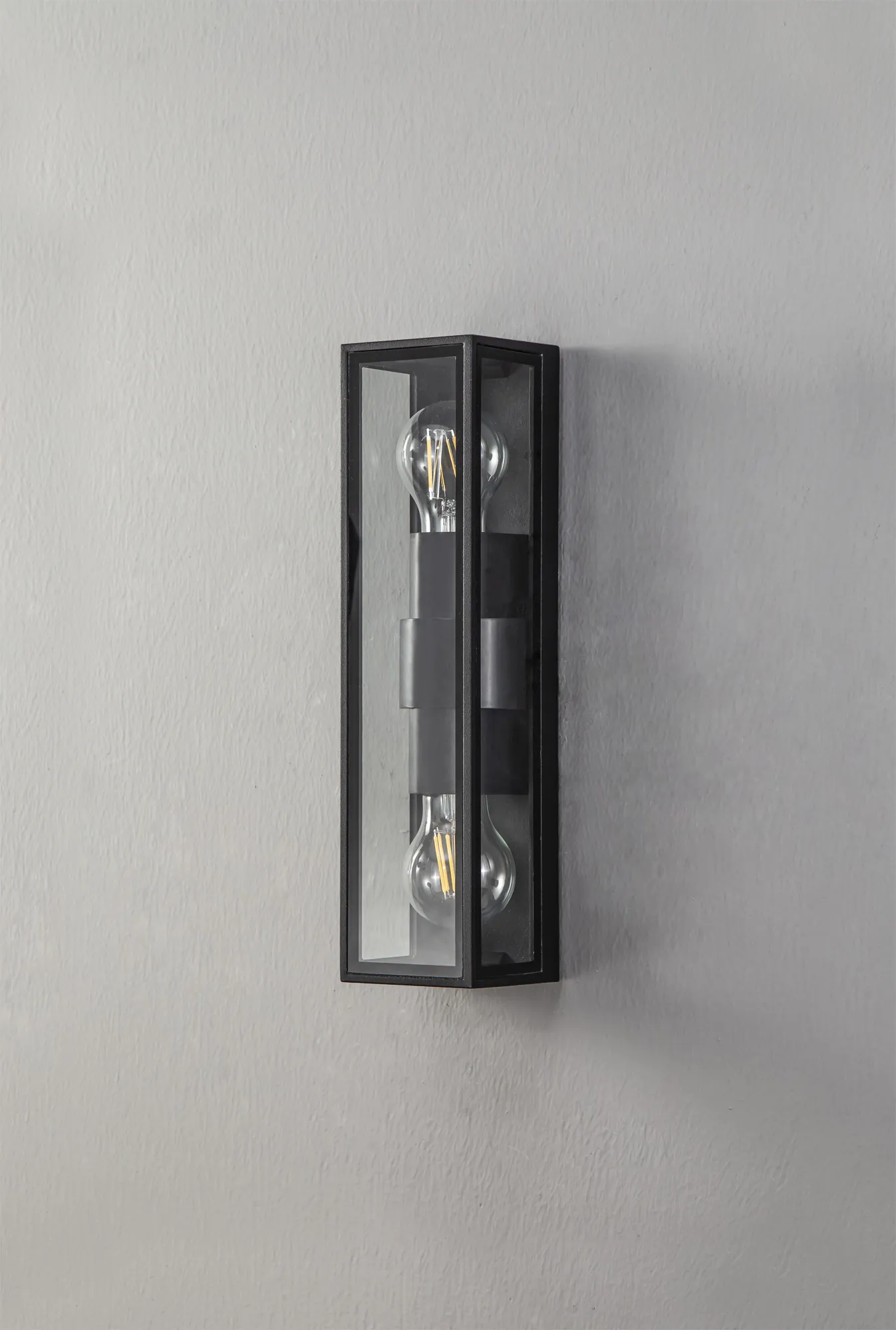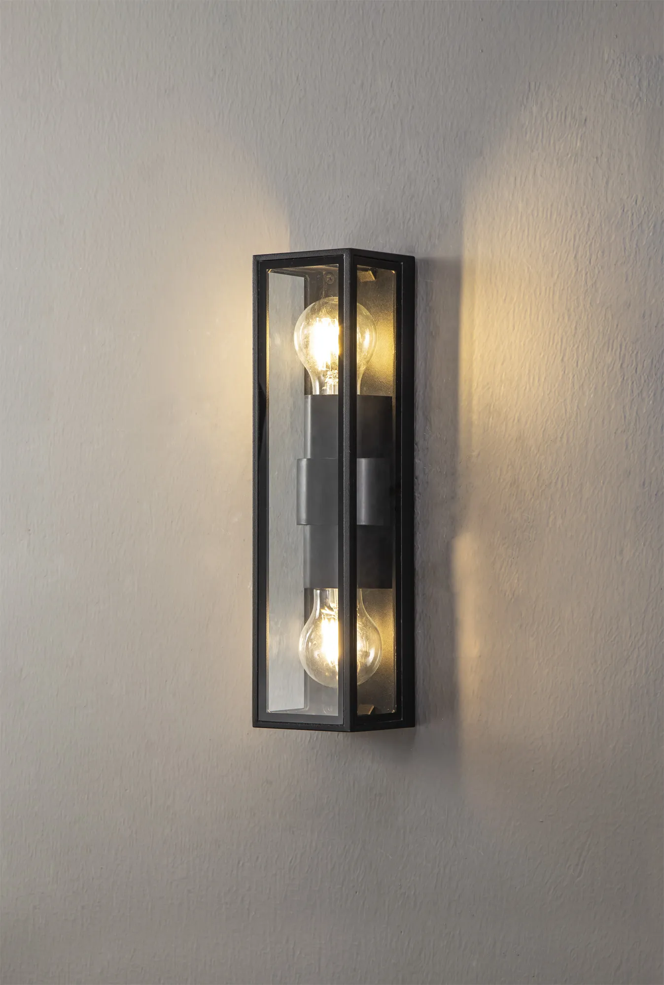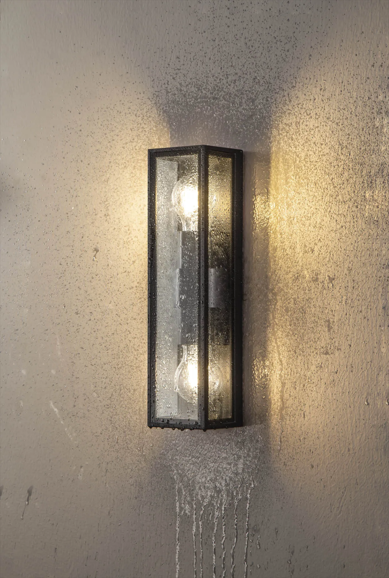 Each IP65 rated wall lamp in the Winkler range have a similar outer structure. The display casing concept sees a clear glass box housing the E27 lamp holders which is framed within an anthracite metal outline. Aswell as the one and two light E27 wall lights Winkler also includes and LED version with frosted diffuser to conceal the high quality integral LEDs.