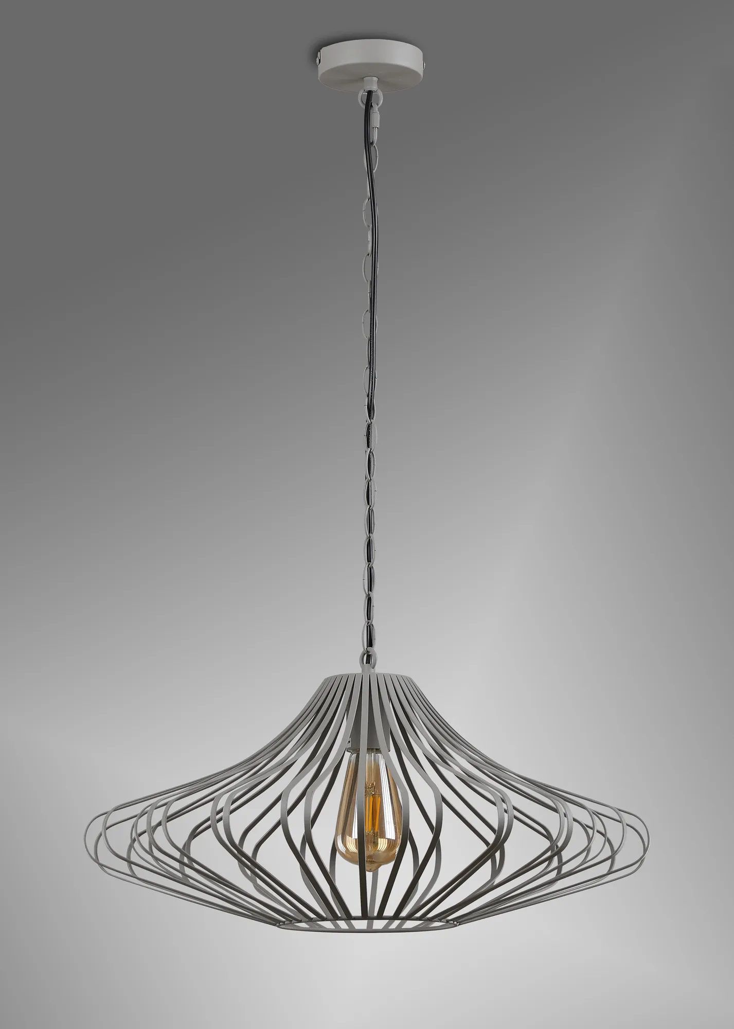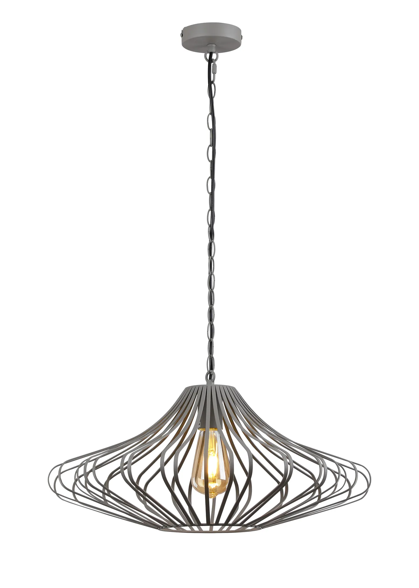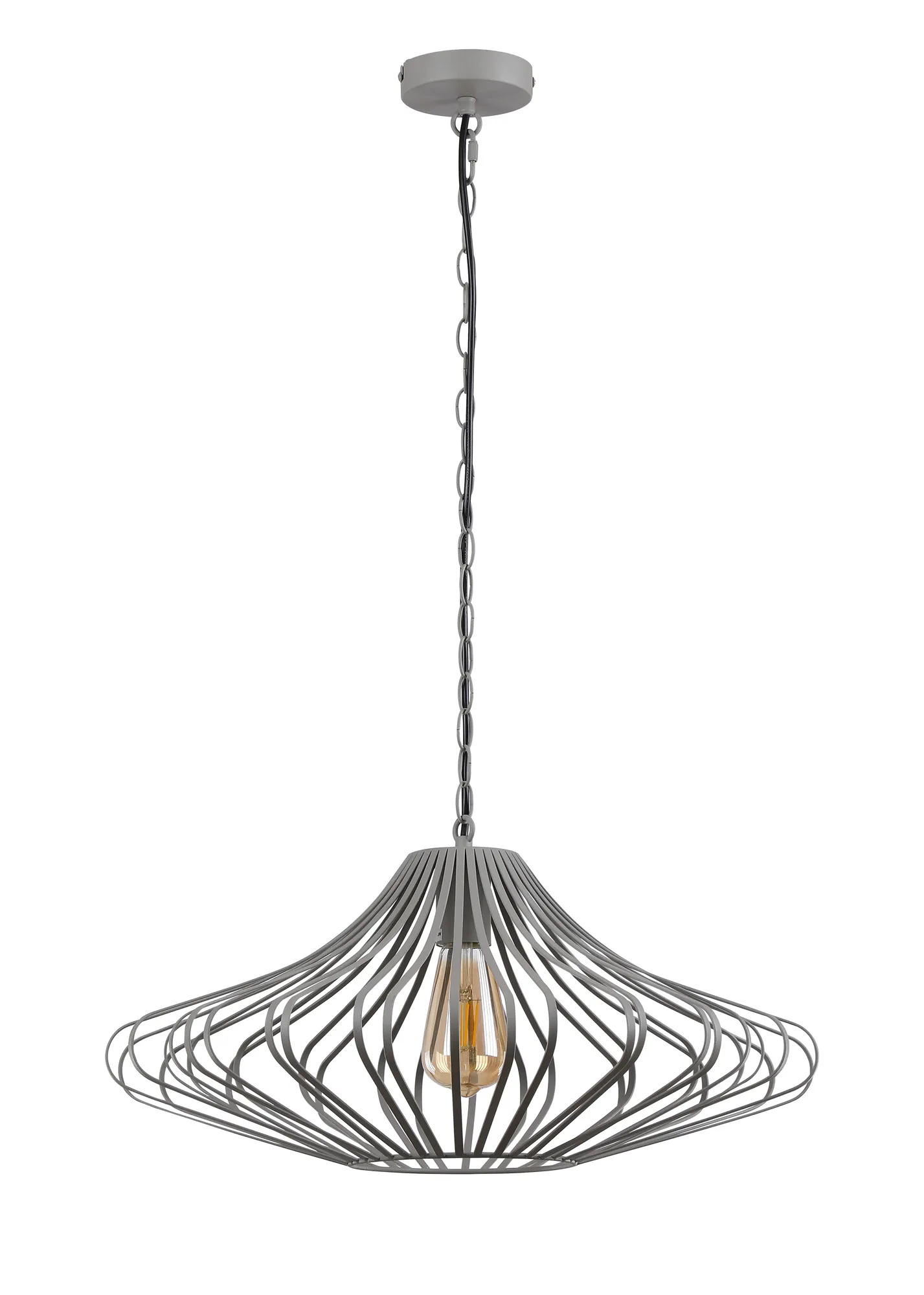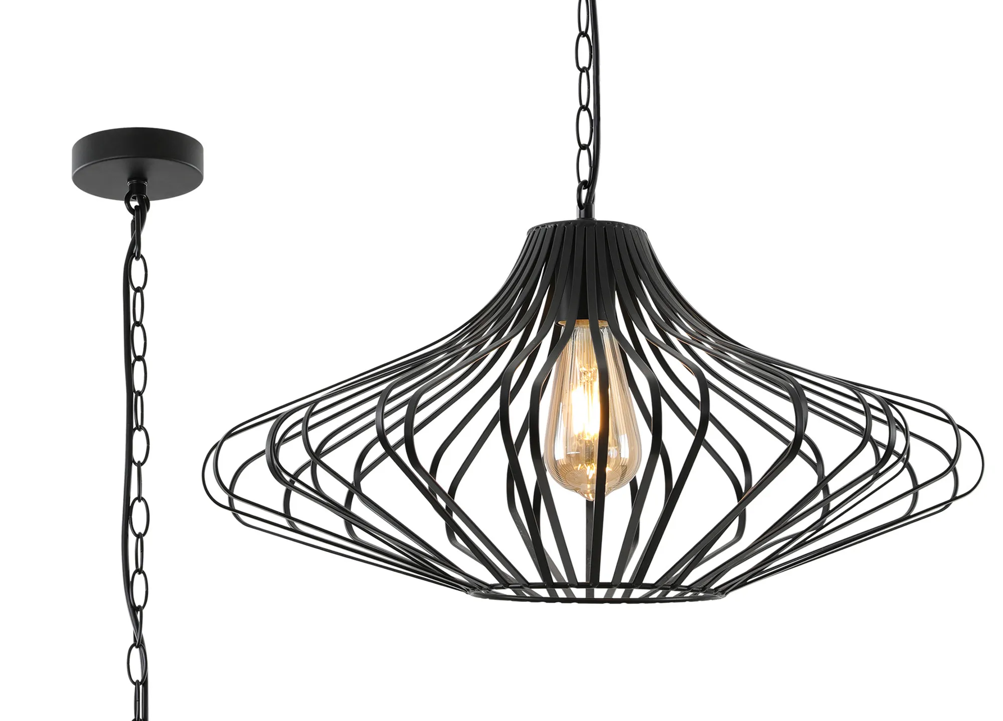 This E27 pendant has a distinctive design that will insert a modern atmosphere in any setting. The wire like frame is manipulated and bent into narrow curves, fanned into a 3D shape around the lamp holder. Open sections around the wire structure provide an optimum dispersal of illumination. The matt black finish enhances the unique appeal of this singular fixture.