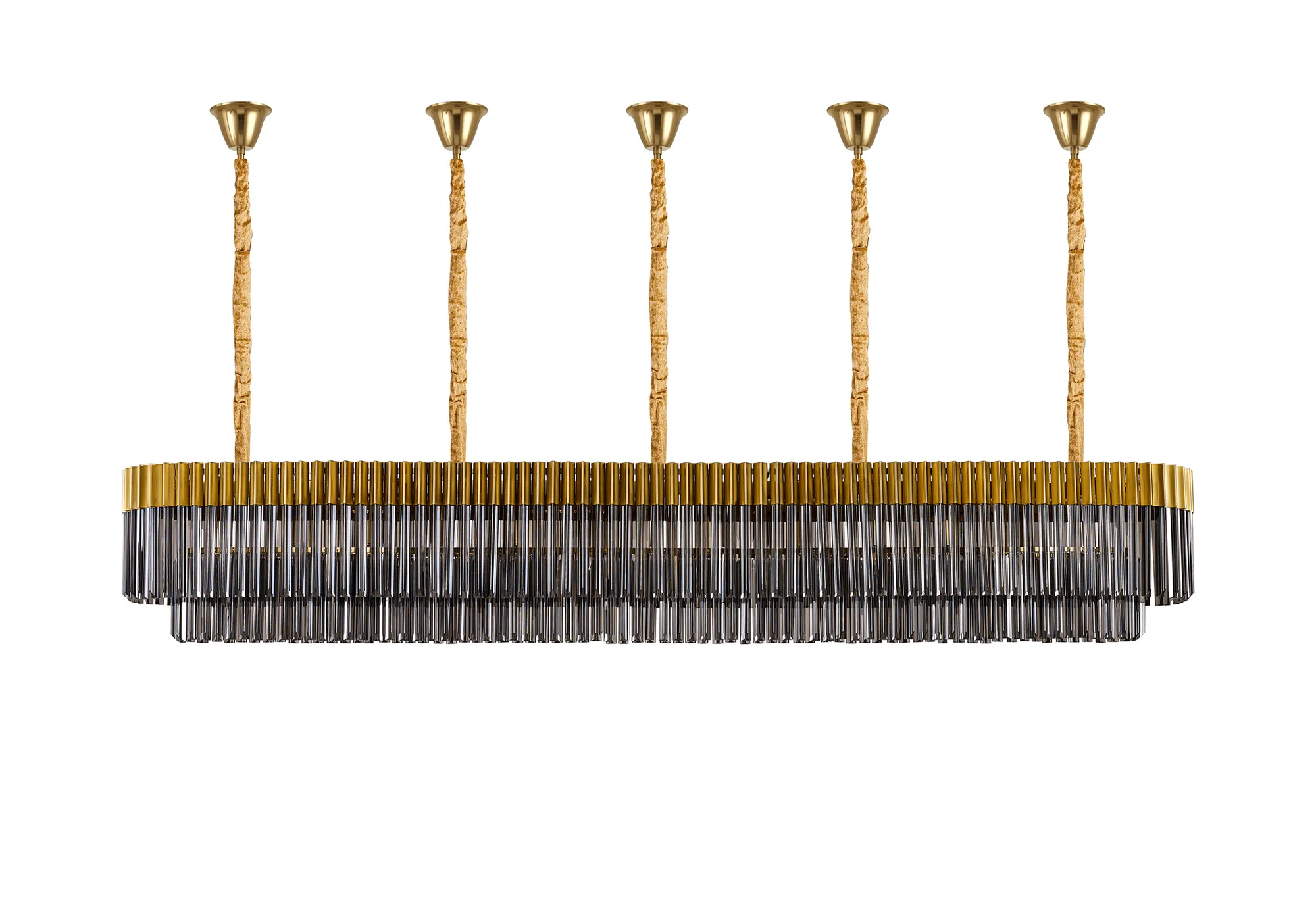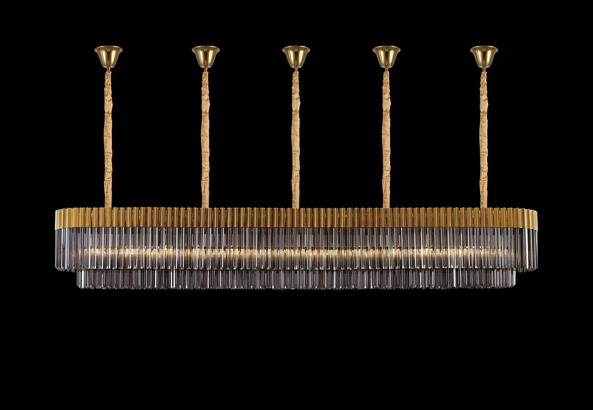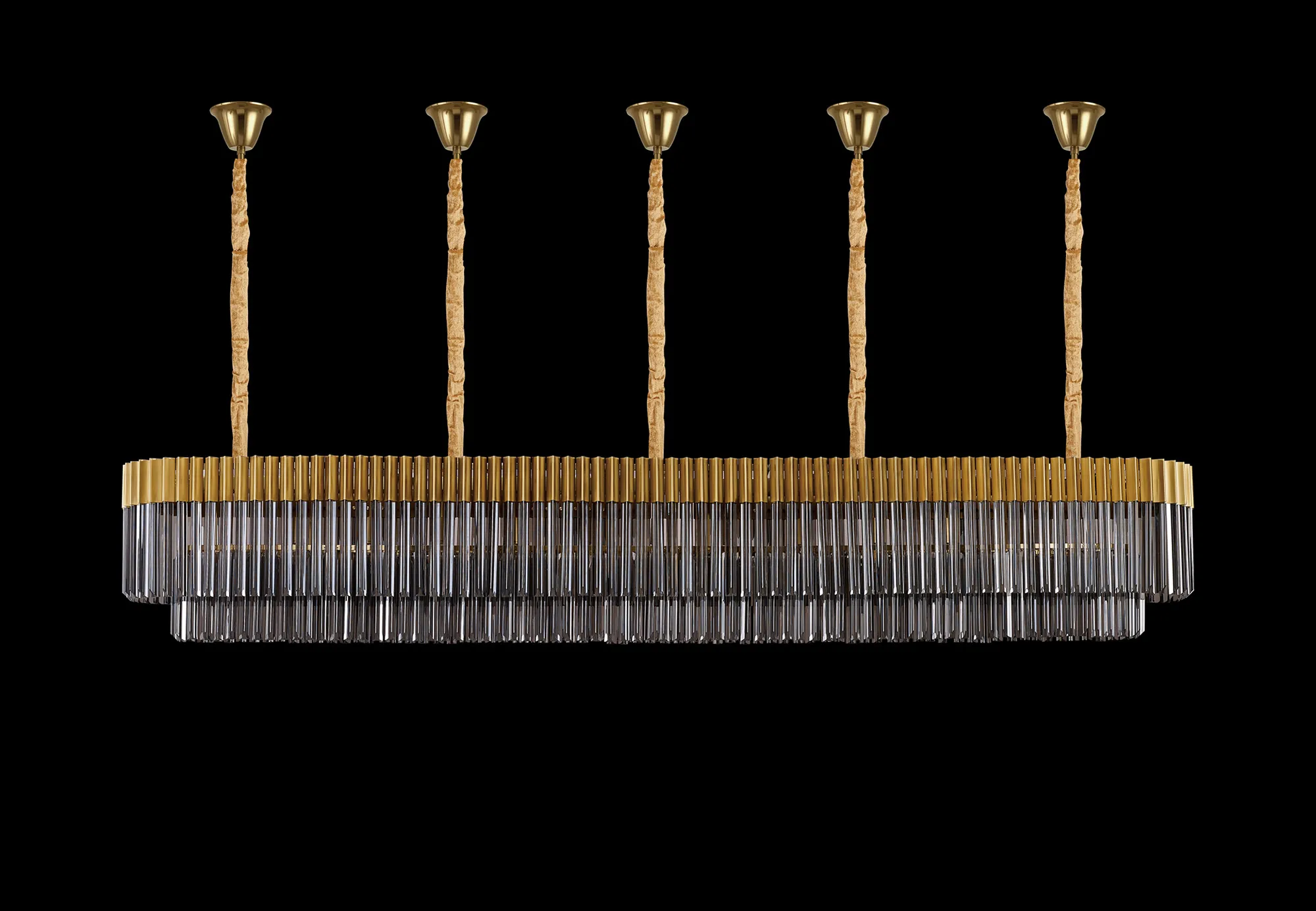 Barrytown 225 x 40cm Linear Pendant With Bell Cup, 12 Light E14, Brass/Smoked Sculpted Glass