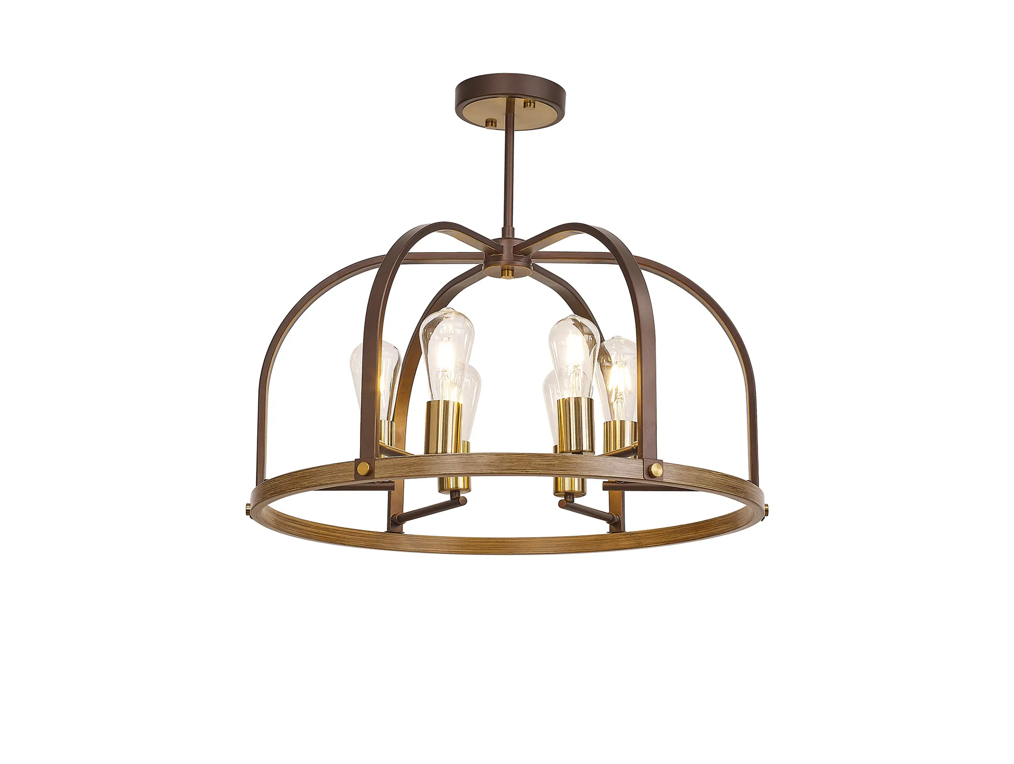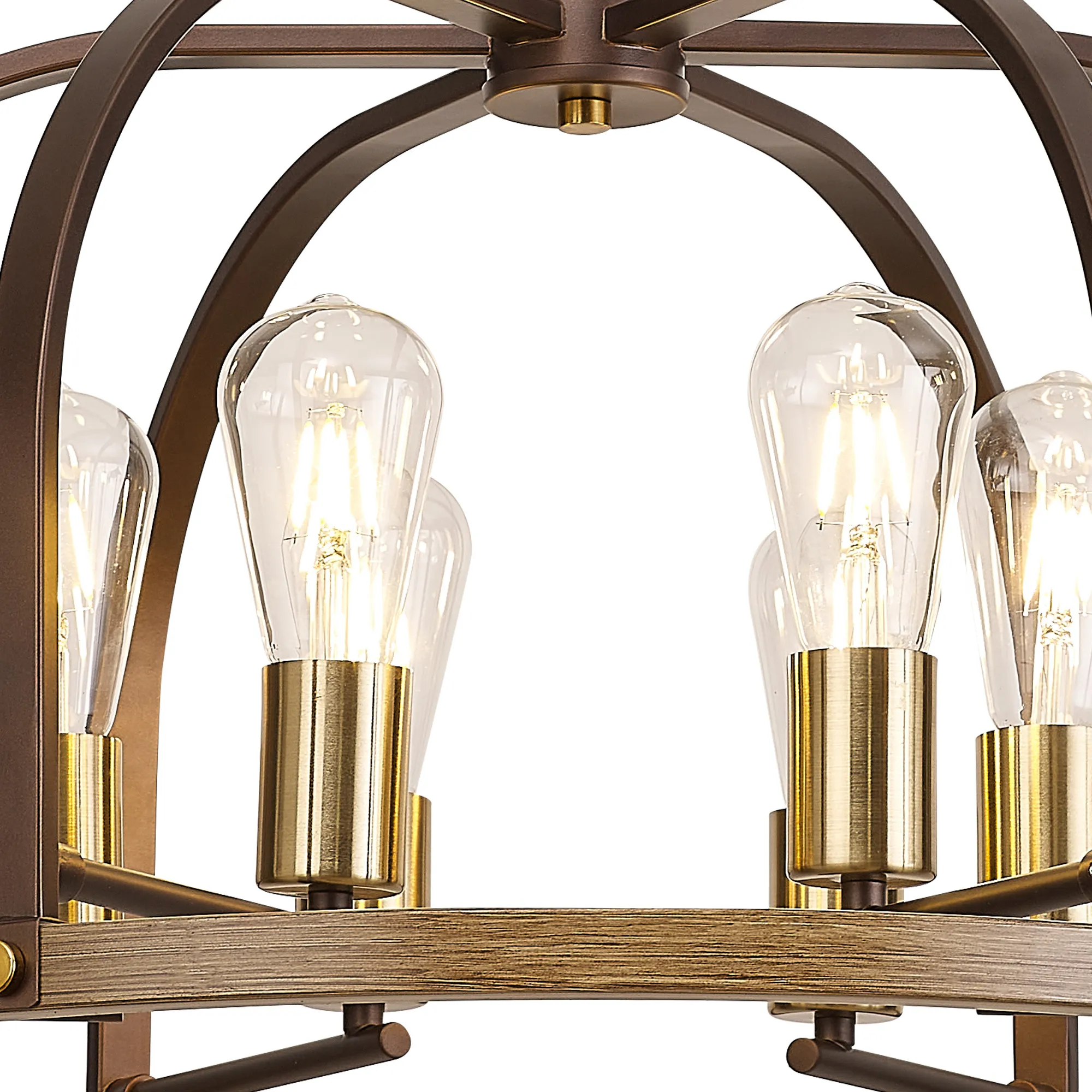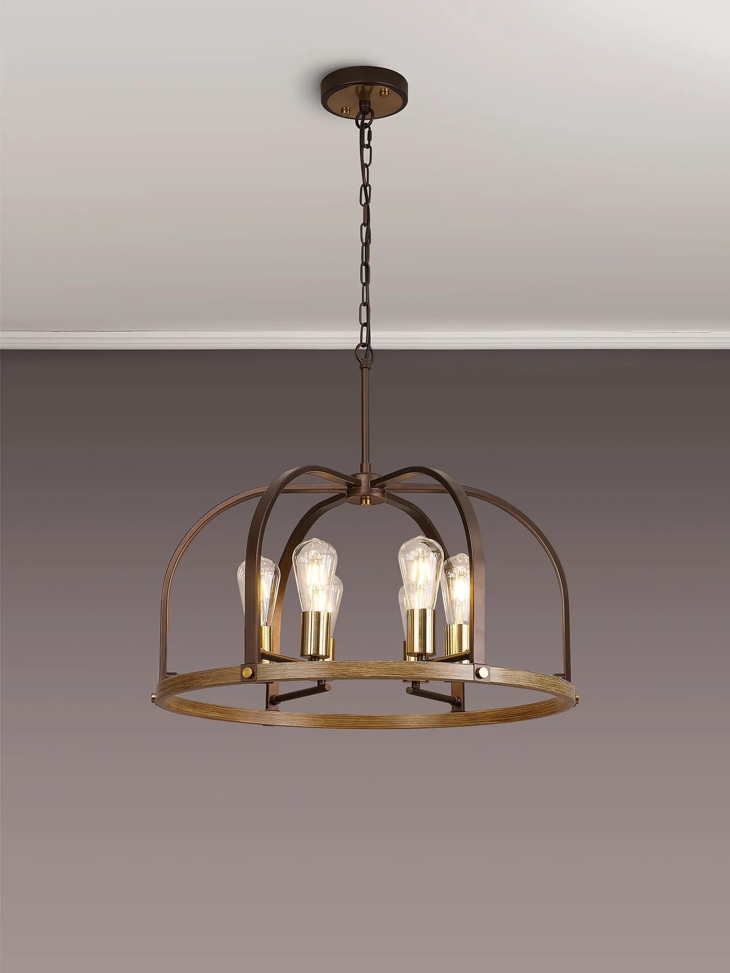 Kenora is an artistically attractive range created by combining multiple colours and material effects. A fully comprehensive collection, the dome outline of each light is formed from brown oxide and naturally grained wood, emulating a traditional source of light. The addition of the antique brass components add a touch of high-end elegance to the more natural tones of the framework which supports the E27 lamp holders. Kenora is now also available in a pewter finish with polished nickel.